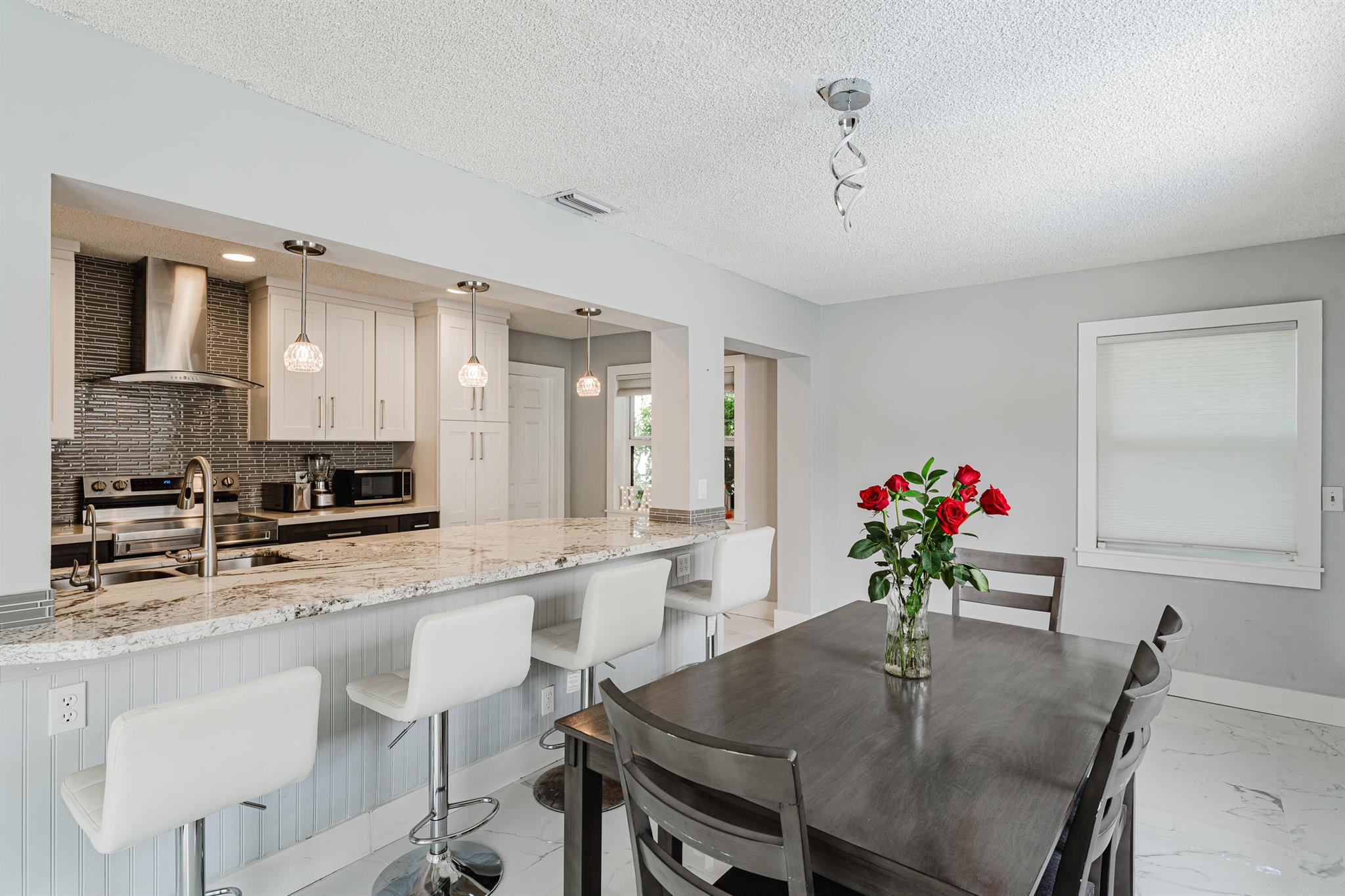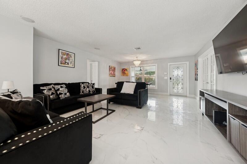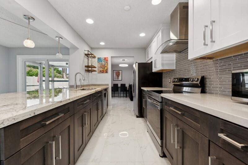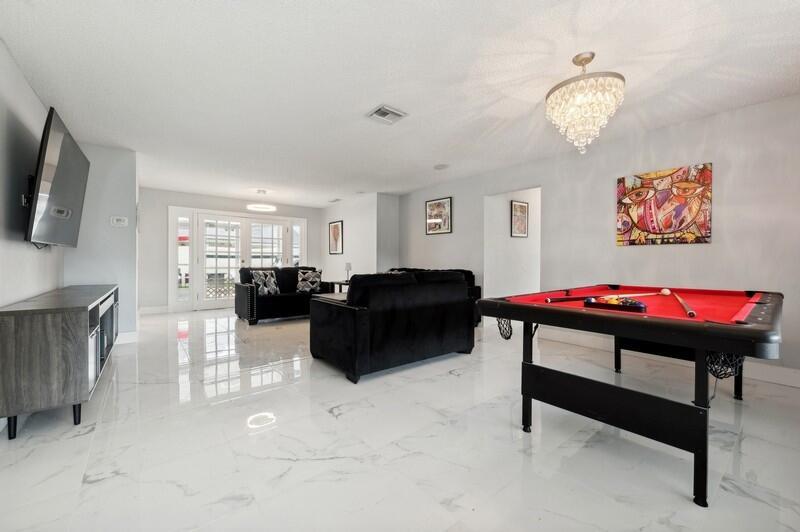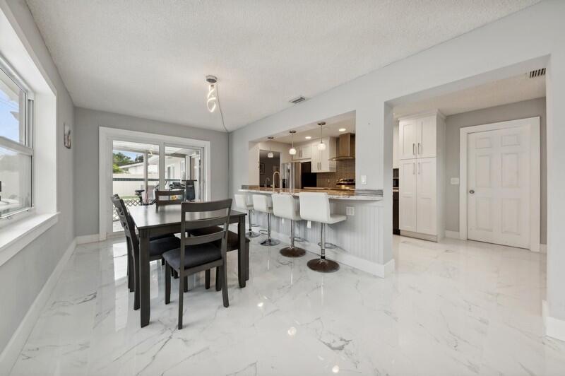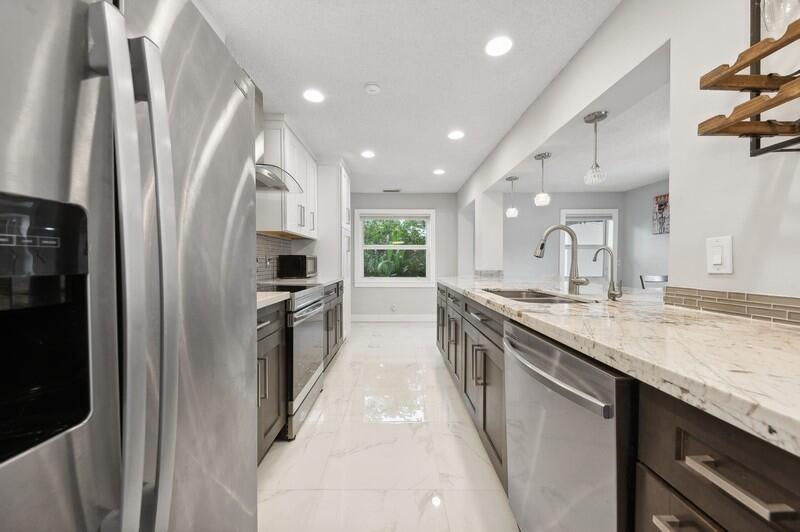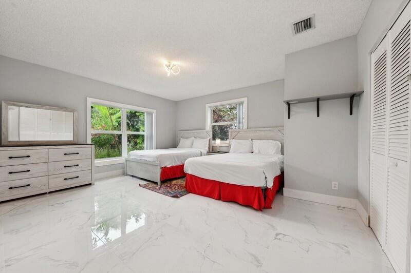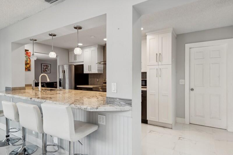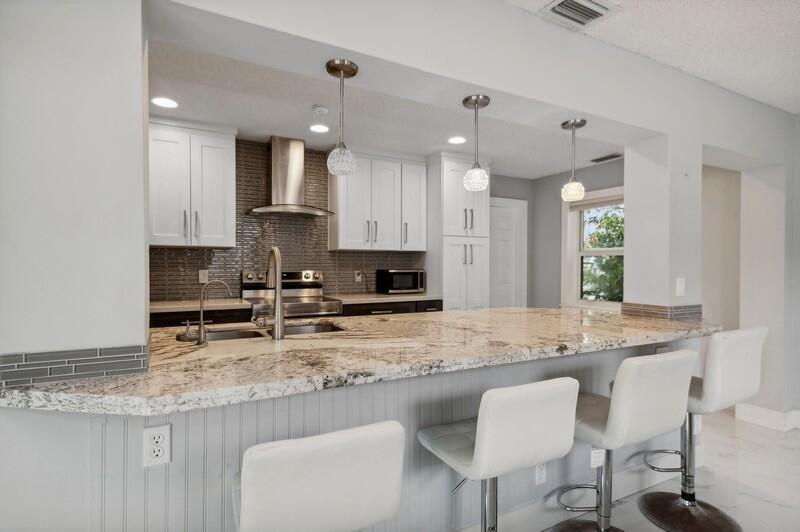 This stunningly remodeled 3br/2ba East Delray home truly has it all. As you enter, you are immediately struck by the natural light, the bright and open layout, and the stunning renovation. Newly laid designer tile and upgraded lighting run throughout the split floorpan home. The open eat-in kitchen chef’s kitchen boasts custom shaker soft-close cabinets, gorgeous granite countertops, and new appliances. The oversized master suite includes a walk-in closet, a completely remodeled bathroom, and impact glass sliding doors leading out to the backyard oasis. The spacious guest rooms enjoy walk-in closets and bountiful natural light. The stunning secondary bathroom includes beautiful marble-like tile throughout. Sliding glass or French doors offer entry to the backyard from the master, living,