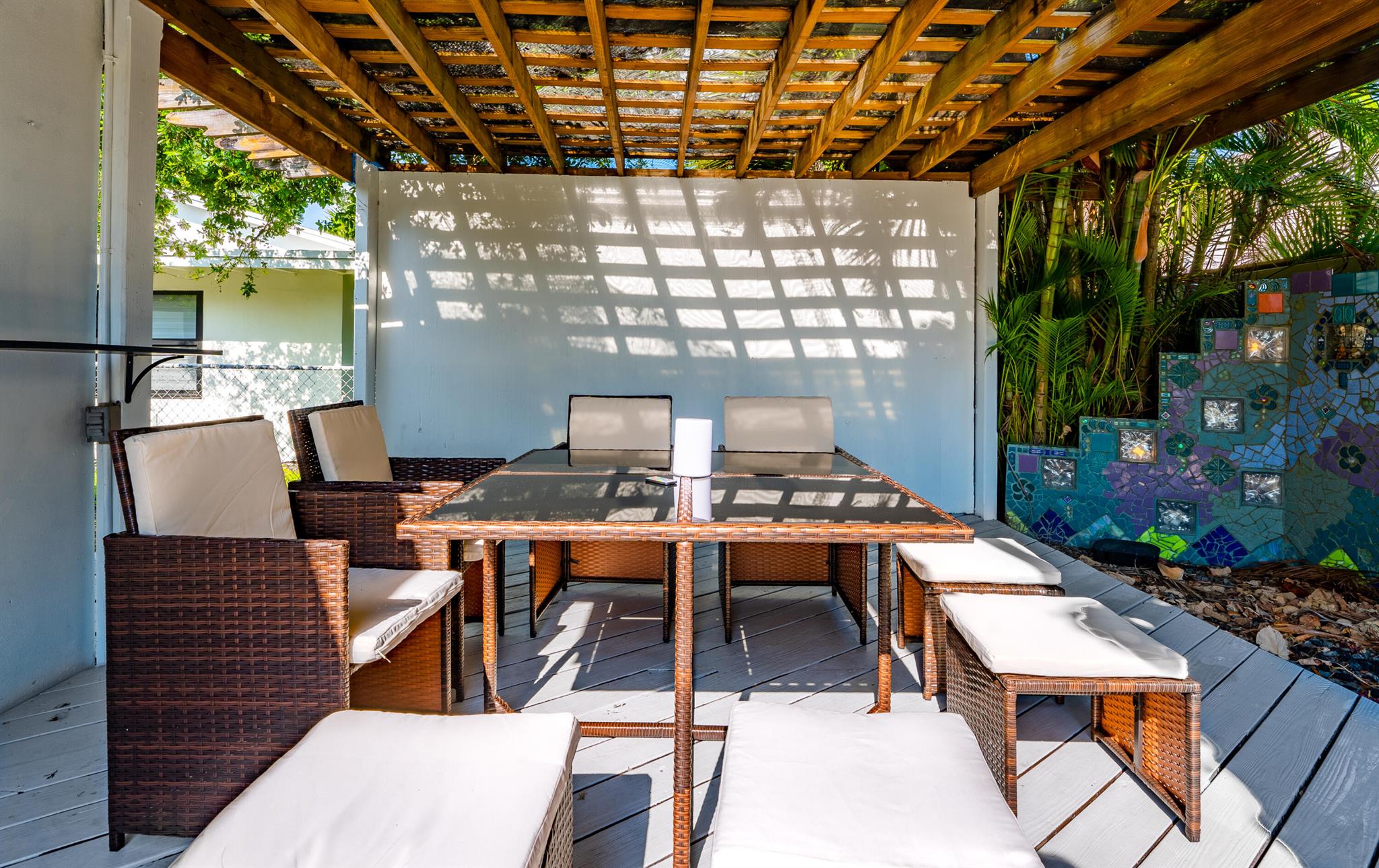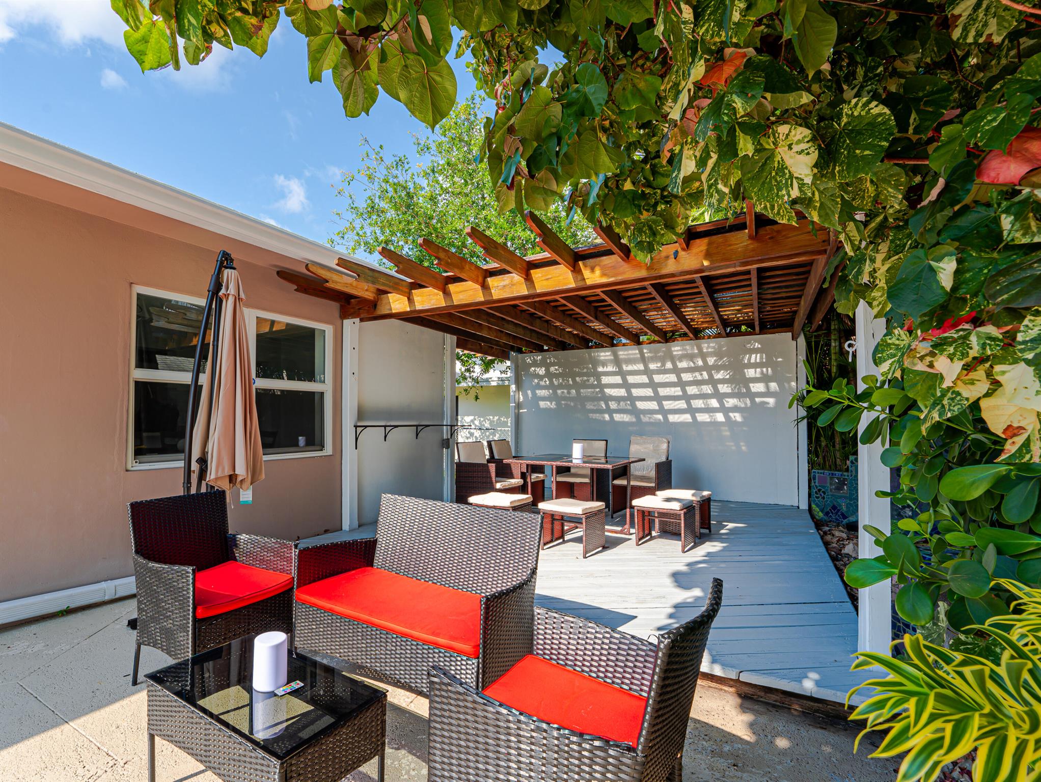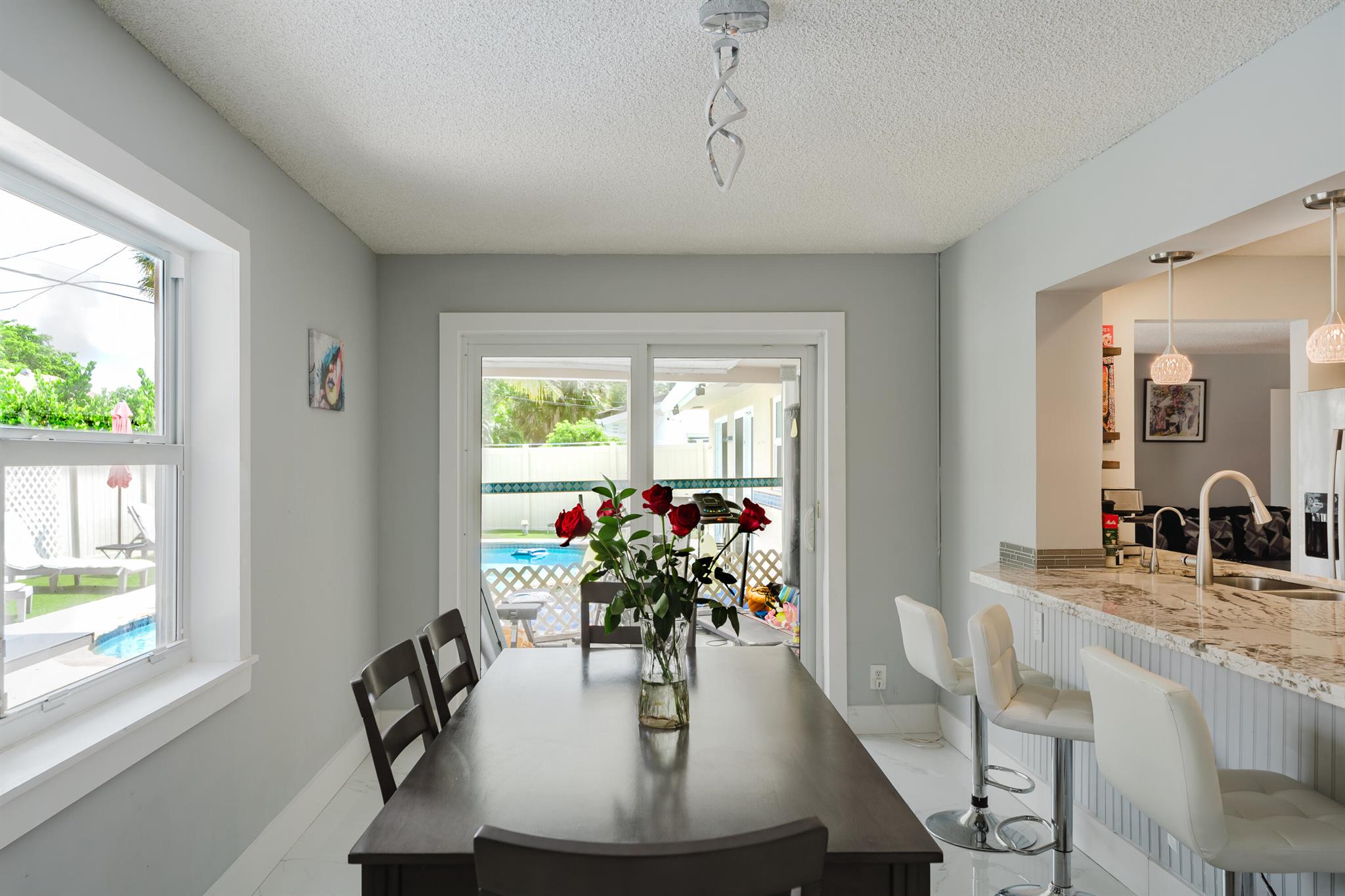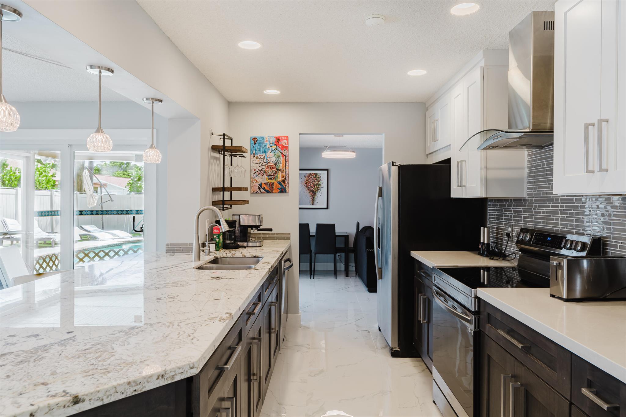 This stunningly remodeled 3br/2ba East Delray home truly has it all. As you enter, you are immediately struck by the natural light, the bright and open layout, and the stunning renovation. Newly laid designer tile and upgraded lighting run throughout the split floorpan home. The open eat-in kitchen chef’s kitchen boasts custom shaker soft-close cabinets, gorgeous granite countertops, and new appliances. The oversized master suite includes a walk-in closet, a completely remodeled bathroom, and impact glass sliding doors leading out to the backyard oasis. The spacious guest rooms enjoy walk-in closets and bountiful natural light. The stunning secondary bathroom includes beautiful marble-like tile throughout. Sliding glass or French doors offer entry to the backyard from the master, living,