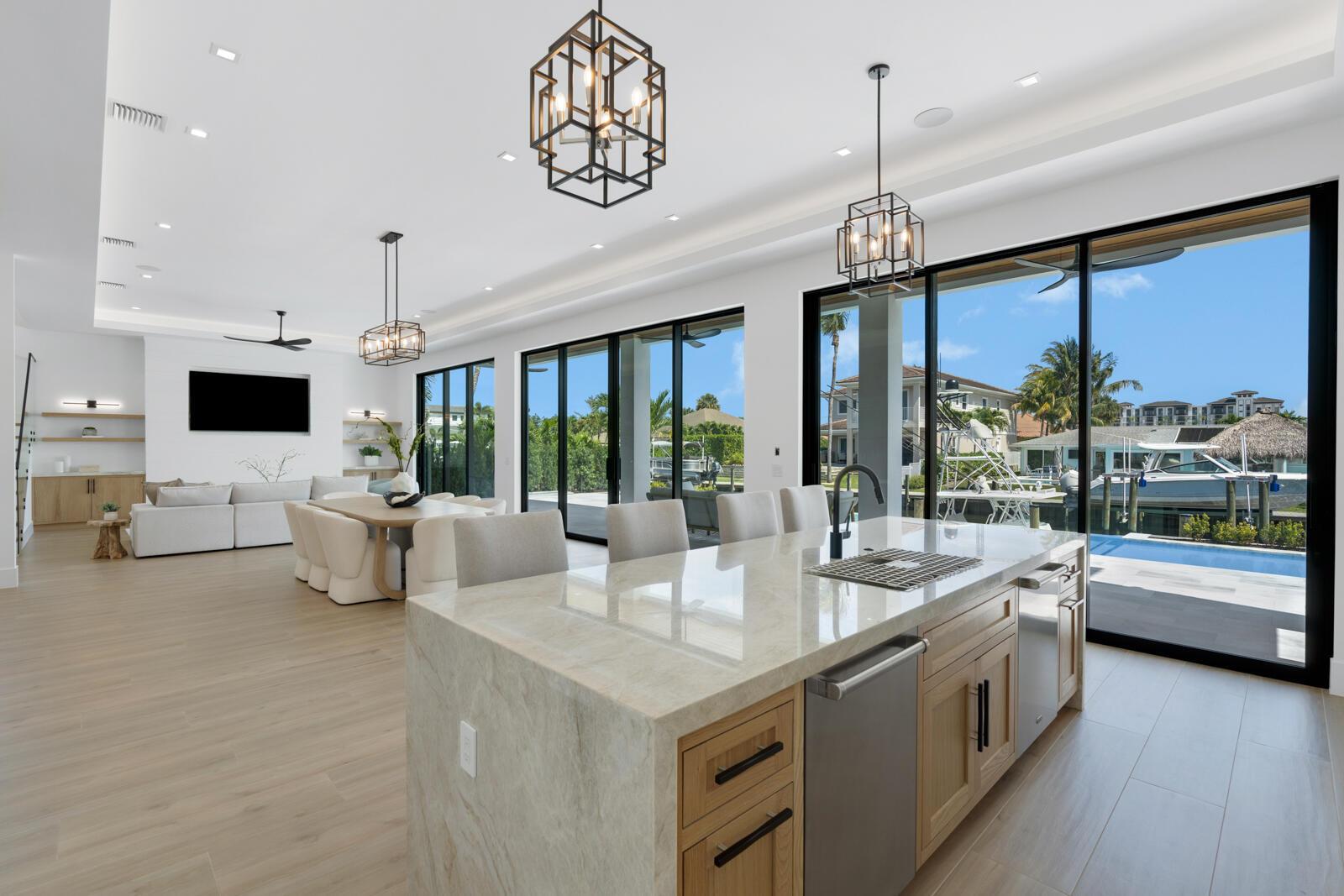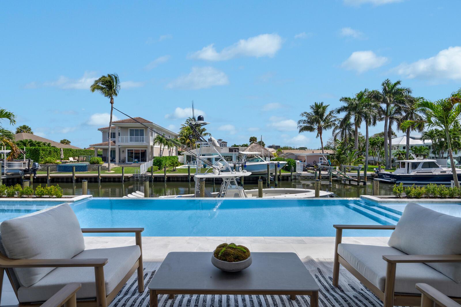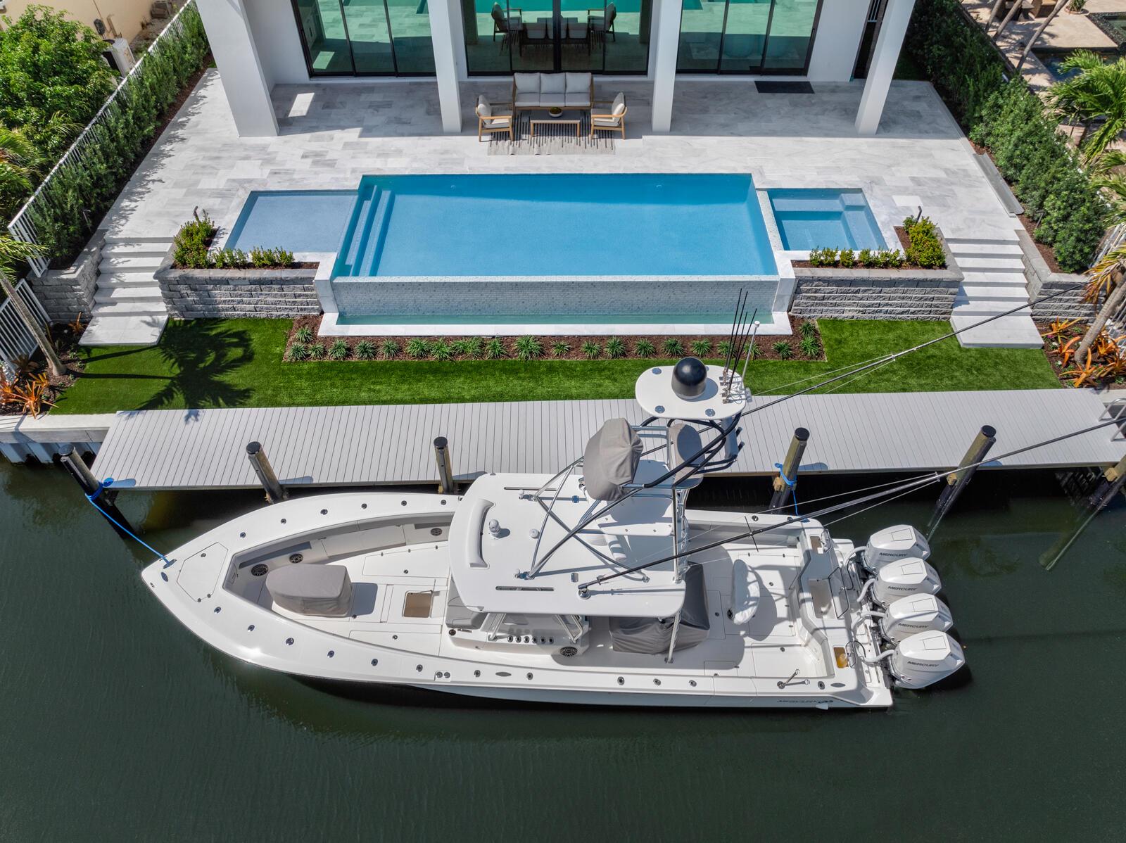 Waterfront New Construction! 5BR, plus office, and a Bonus Room that could function as a Game/Media Room or Gym, 4.1 BA, 3.5CG CBS home built with the finest and most Luxurious finishes. 75′ of water frontage on a deep wide water canal with a brand new seawall and 65′ composite dock. Ocean access with no fixed bridges and less than 150 yards to the main Intracoastal. Abundant living space including great room, family room, and large bonus room upstairs. Heated Saltwater Infinity pool/spa, marble paver decking with 2 gas fire bowls. A gourmet kitchen that offers a Wolf 48” 6 burner sealed Gas stainless steel cooktop with griddle and Wolf double convection oven, Best 48” chimney style hood, See Supplement..