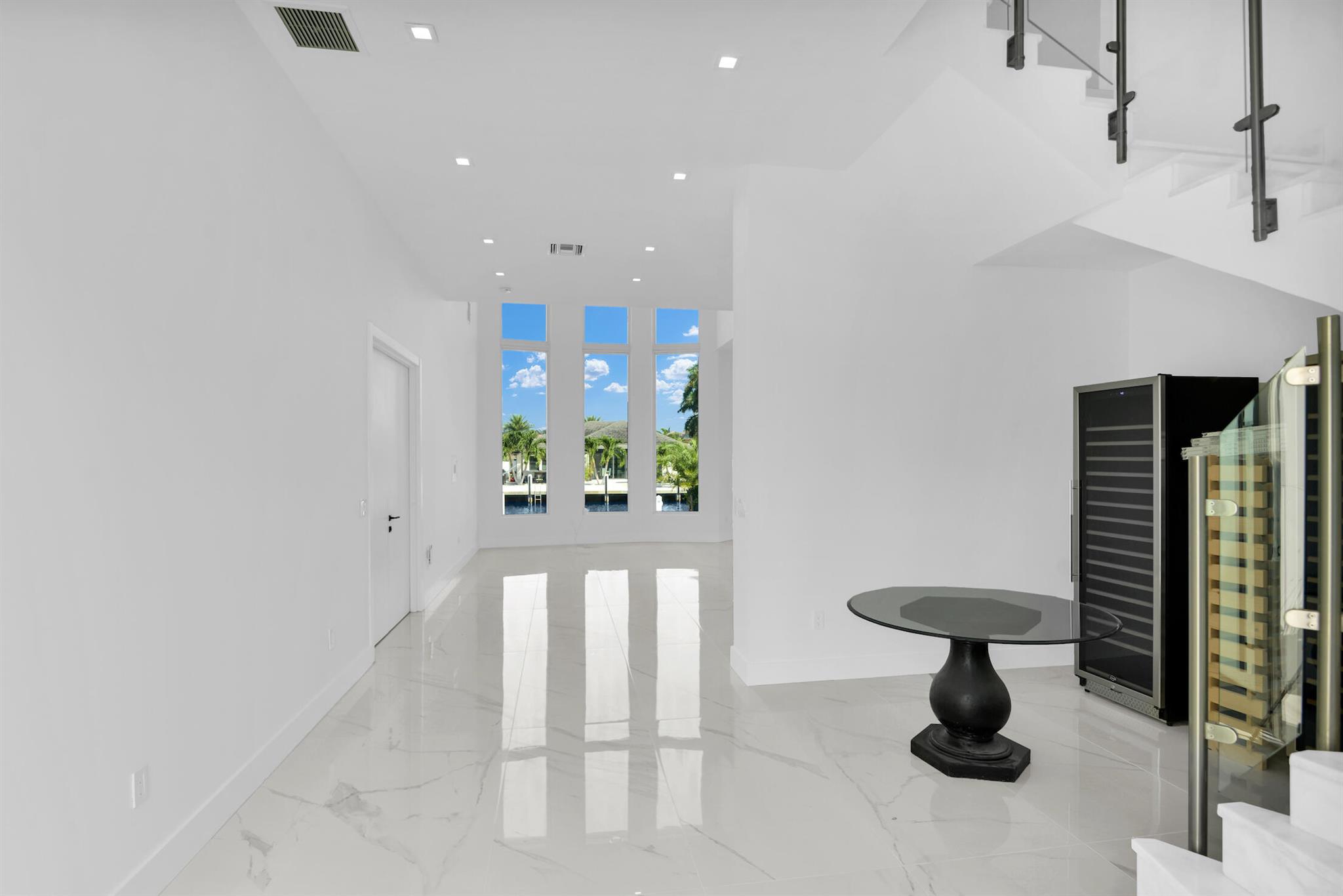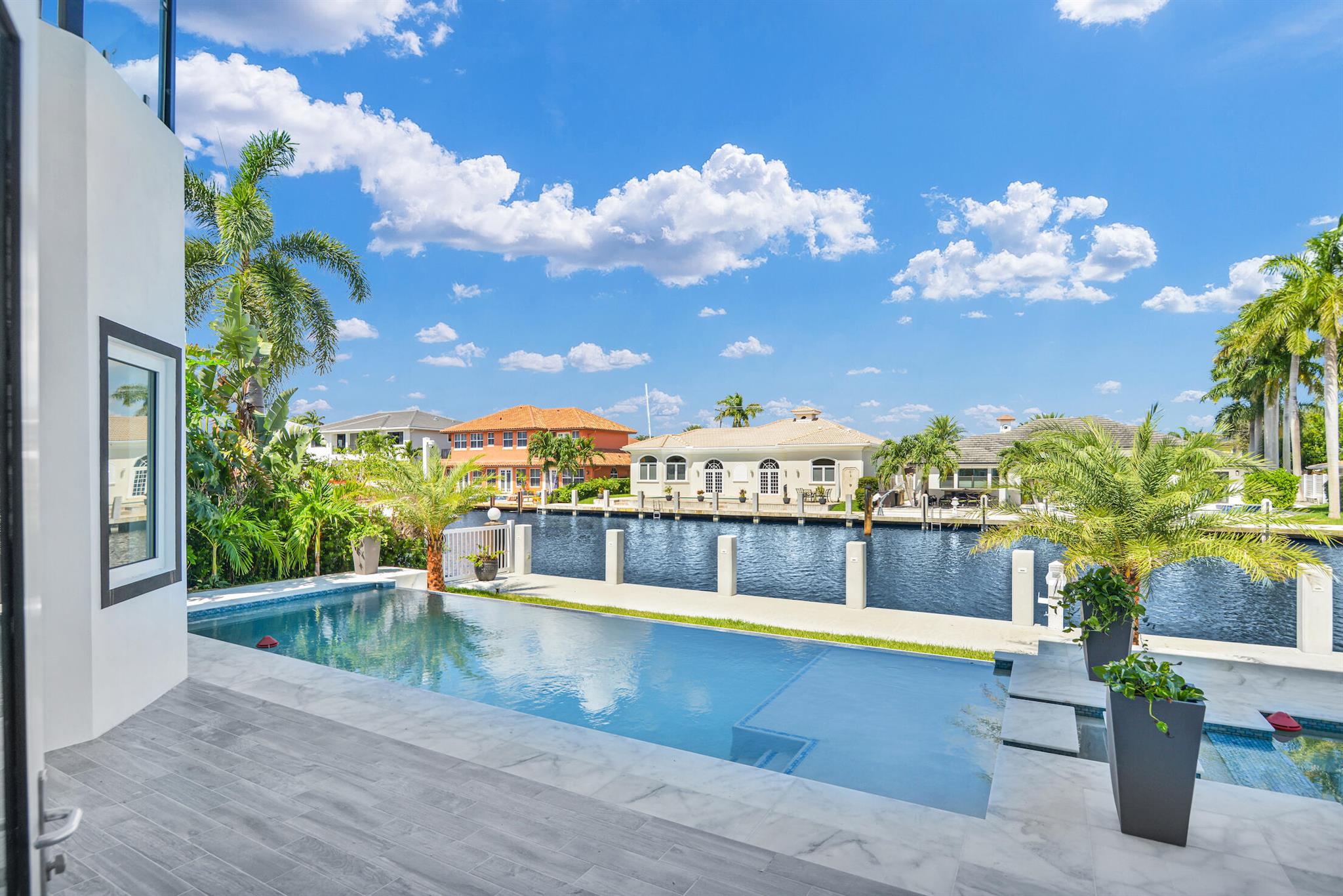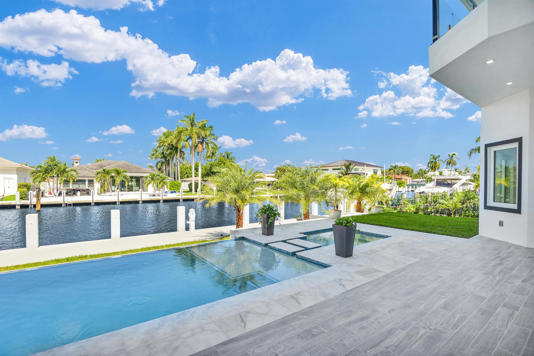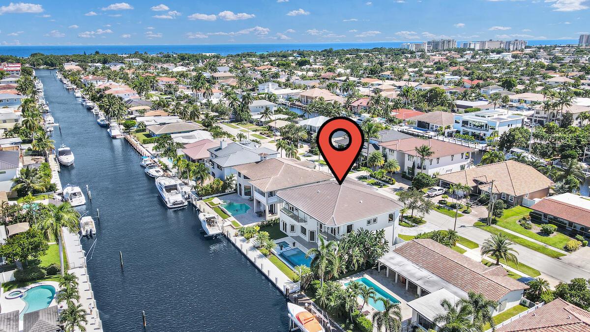 Imagine a luxurious new construction home in the sought-after coastal community of Lighthouse Point, Florida. This stunning waterfront property boasts direct access to a deep-water canal, with no fixed bridges blocking the route to the open ocean–a dream for boaters. The home showcases modern coastal architecture, characterized by clean lines, large windows, and an open-concept floor plan that maximizes natural light and water views. Upon entering, you’re greeted by high ceilings, polished marble, and a spacious living area with seamless indoor-outdoor flow. Expansive glass doors open to a covered terrace, a sparkling infinity pool, and a private dock, equipped to accommodate a large yacht.