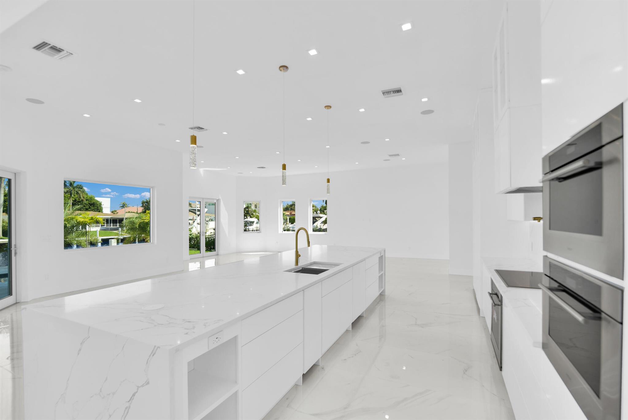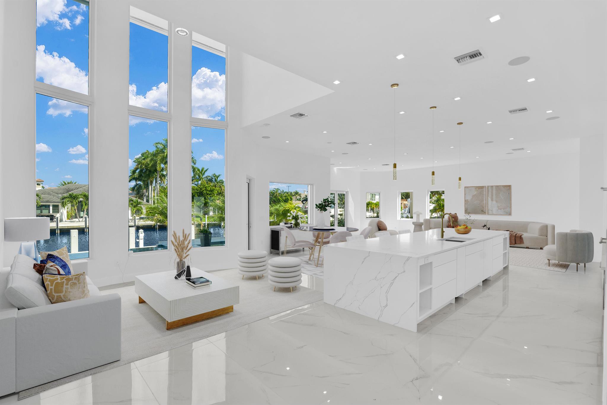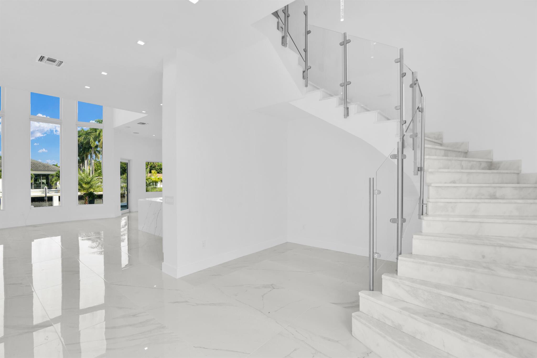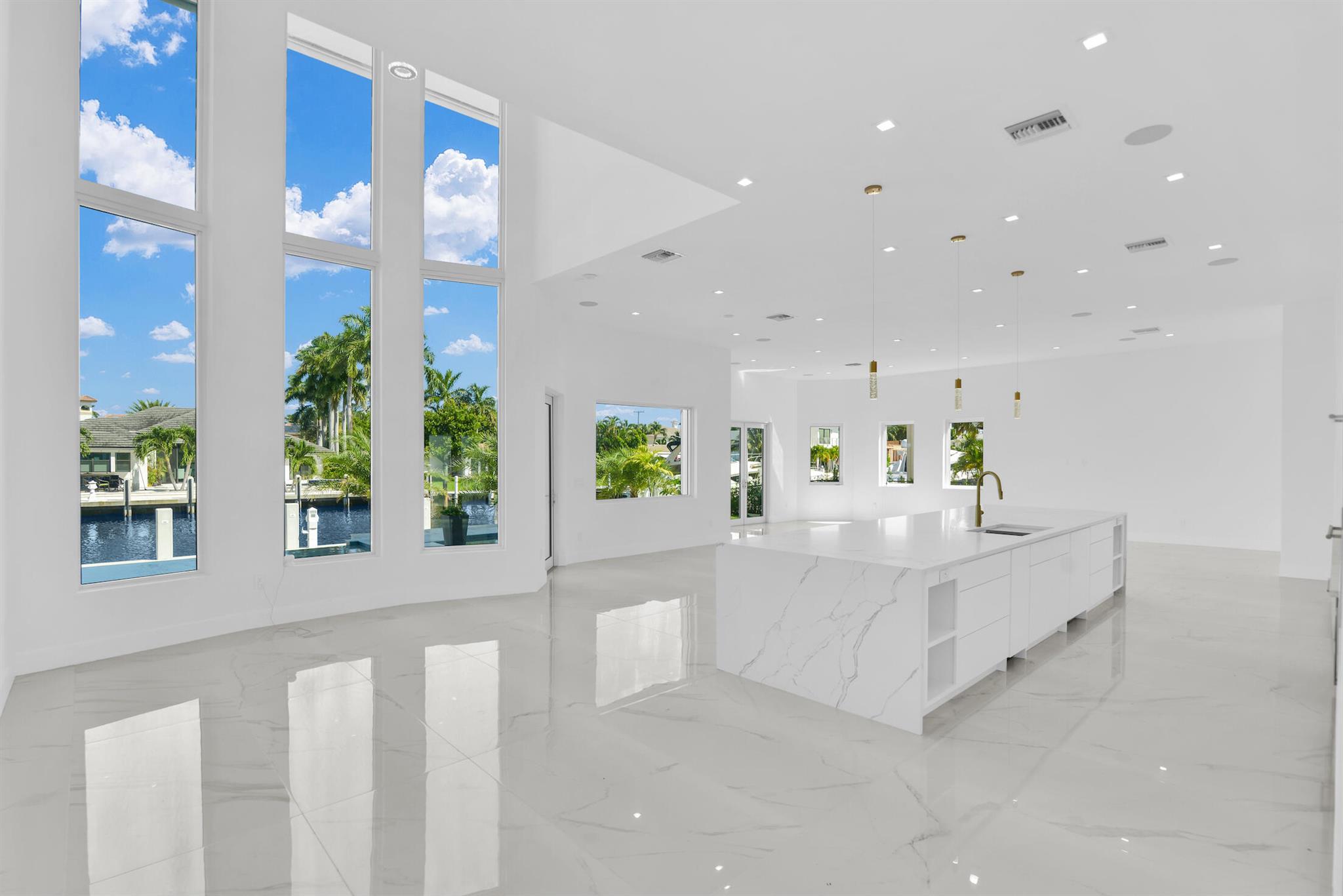 Imagine a luxurious new construction home in the sought-after coastal community of Lighthouse Point, Florida. This stunning waterfront property boasts direct access to a deep-water canal, with no fixed bridges blocking the route to the open ocean–a dream for boaters. The home showcases modern coastal architecture, characterized by clean lines, large windows, and an open-concept floor plan that maximizes natural light and water views. Upon entering, you’re greeted by high ceilings, polished marble, and a spacious living area with seamless indoor-outdoor flow. Expansive glass doors open to a covered terrace, a sparkling infinity pool, and a private dock, equipped to accommodate a large yacht.