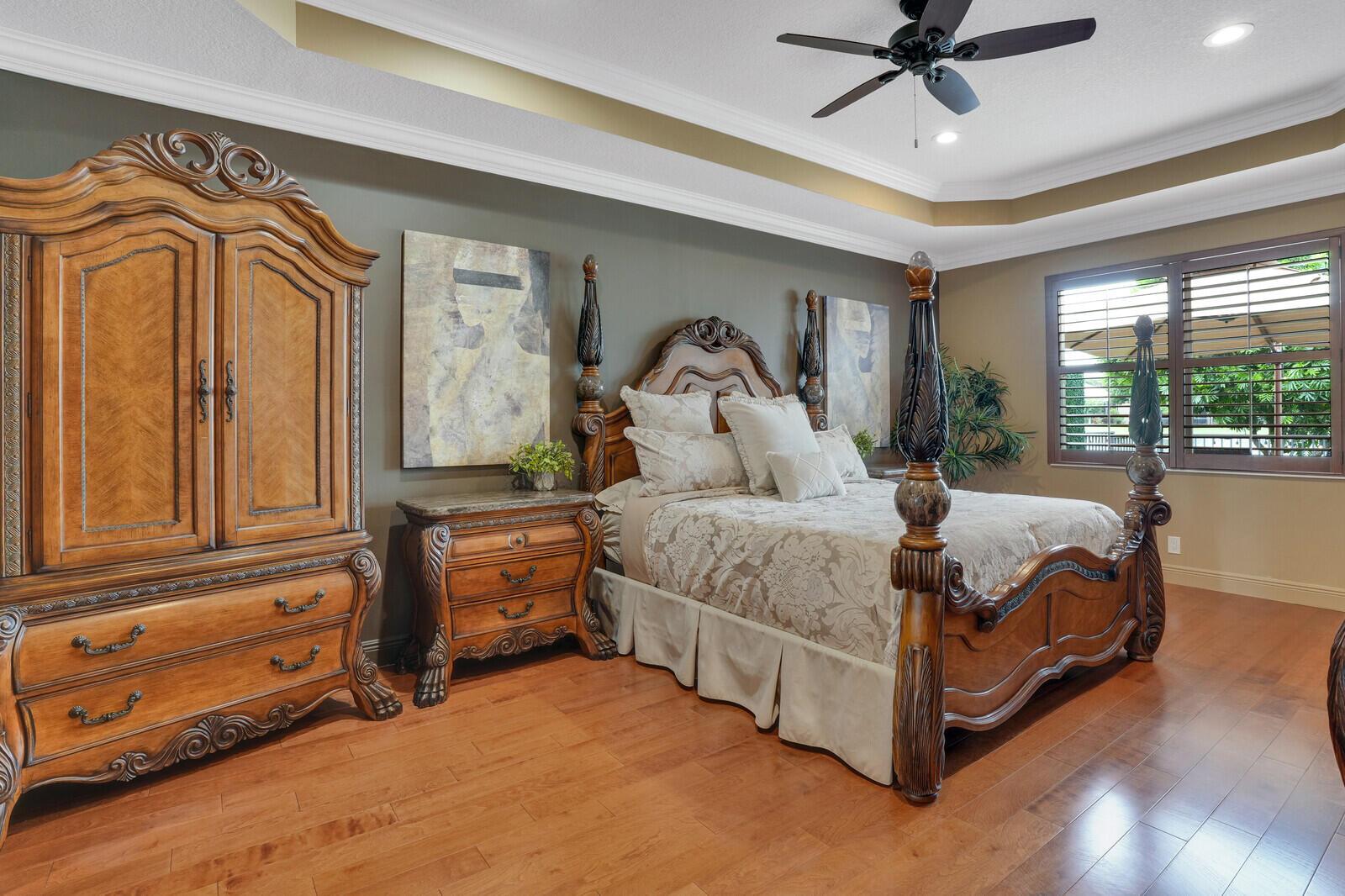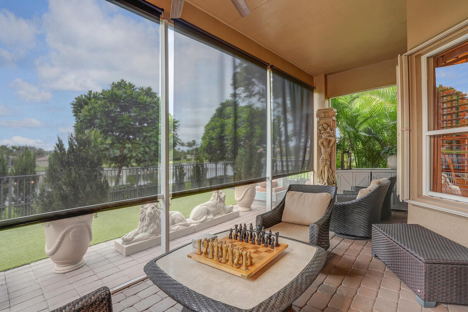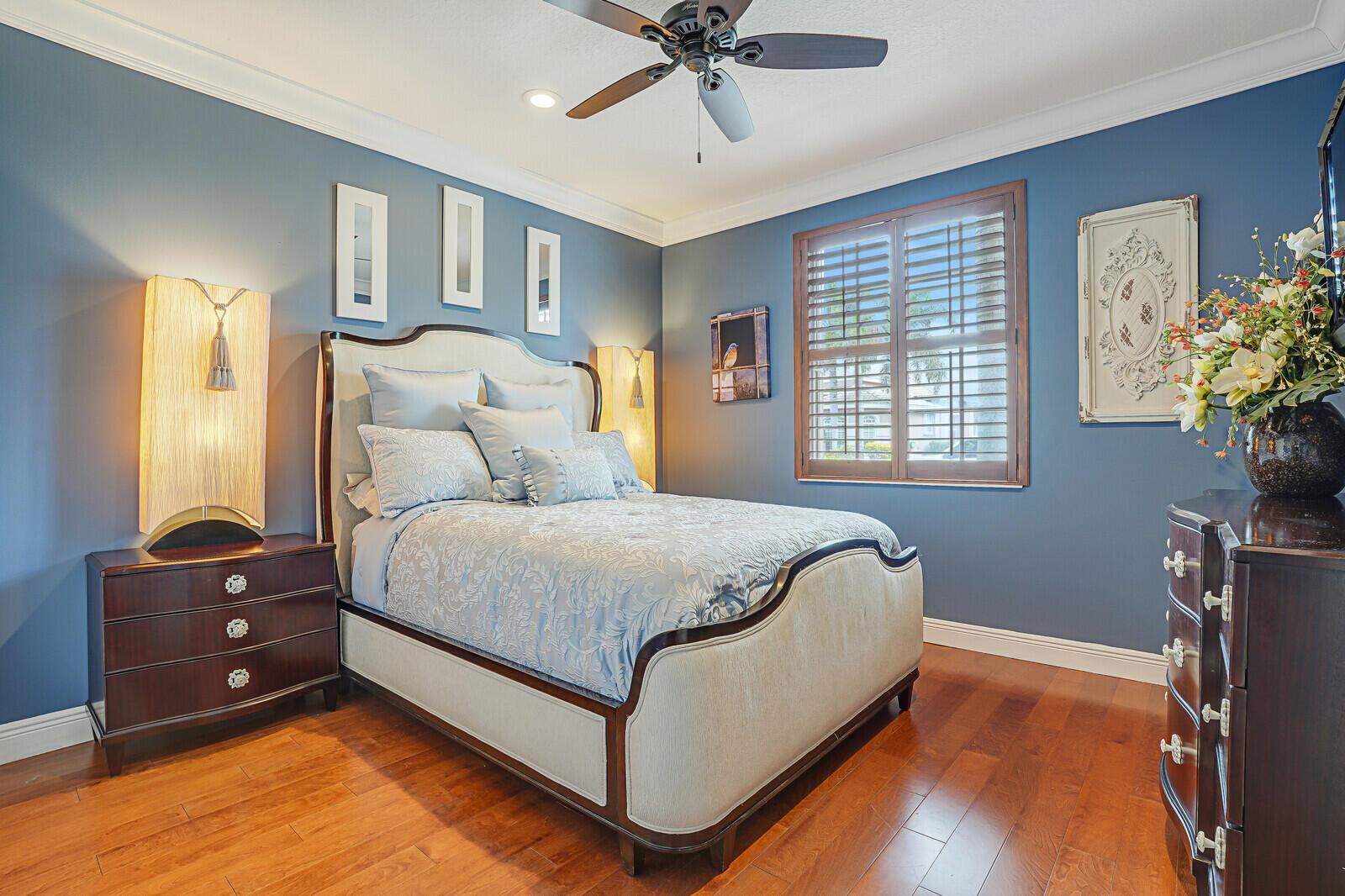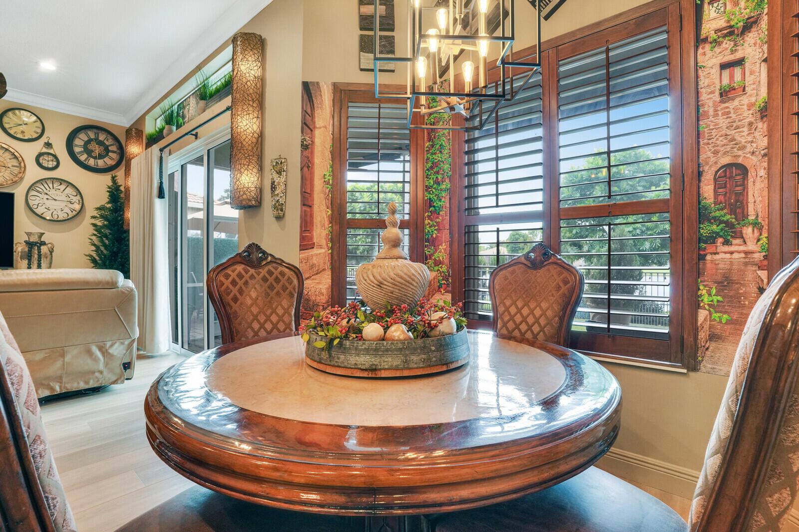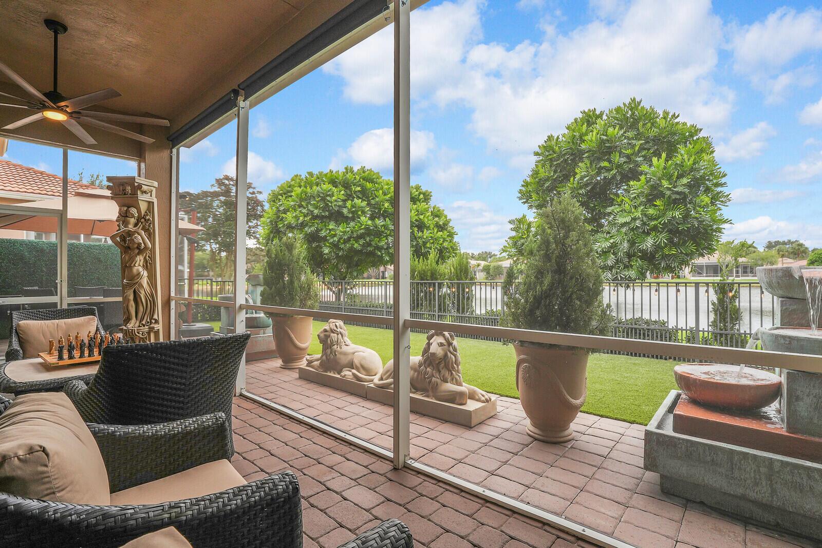 Welcome home to this desirable Modena model on a beautiful lakefront lot in the gated community of Villaggio. This upgraded home boasts elegant wood flooring throughout, accented by crown molding, large baseboards, and extra hi-hat lighting. The gorgeous kitchen is a chef’s dream, offering ample cabinet space, a large island, upgraded stainless steel appliances, granite countertops and backsplash, and an undermount sink. The bathrooms are tastefully appointed with upgraded hardware, granite countertops, tile to the ceiling with decorative listellos, and framed mirrors. Plantation shutters provide stylish window treatments throughout. Step outside and enjoy the sunsets in your expansive screened patio, leading to a private oasis with a cozy seating area and a fenced yard with a turf lawn.