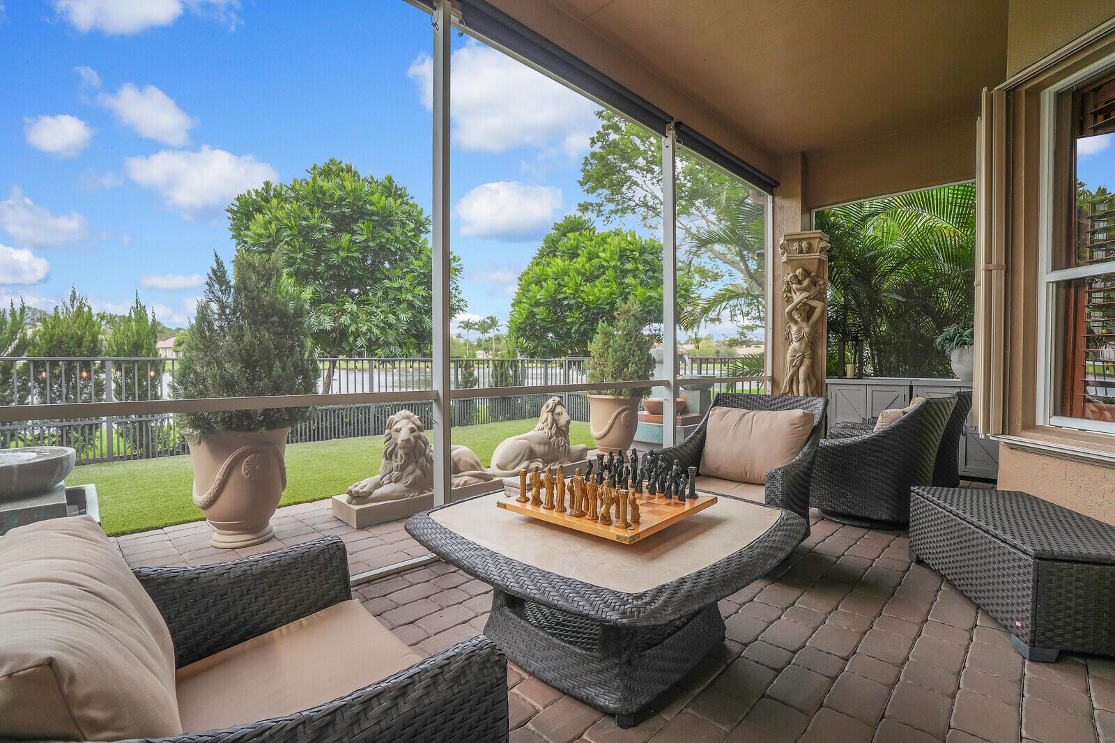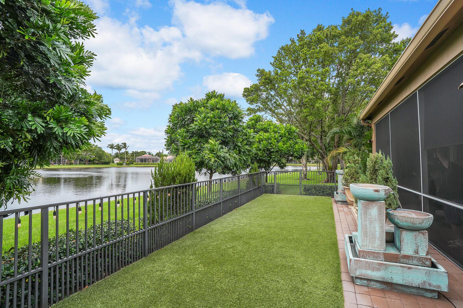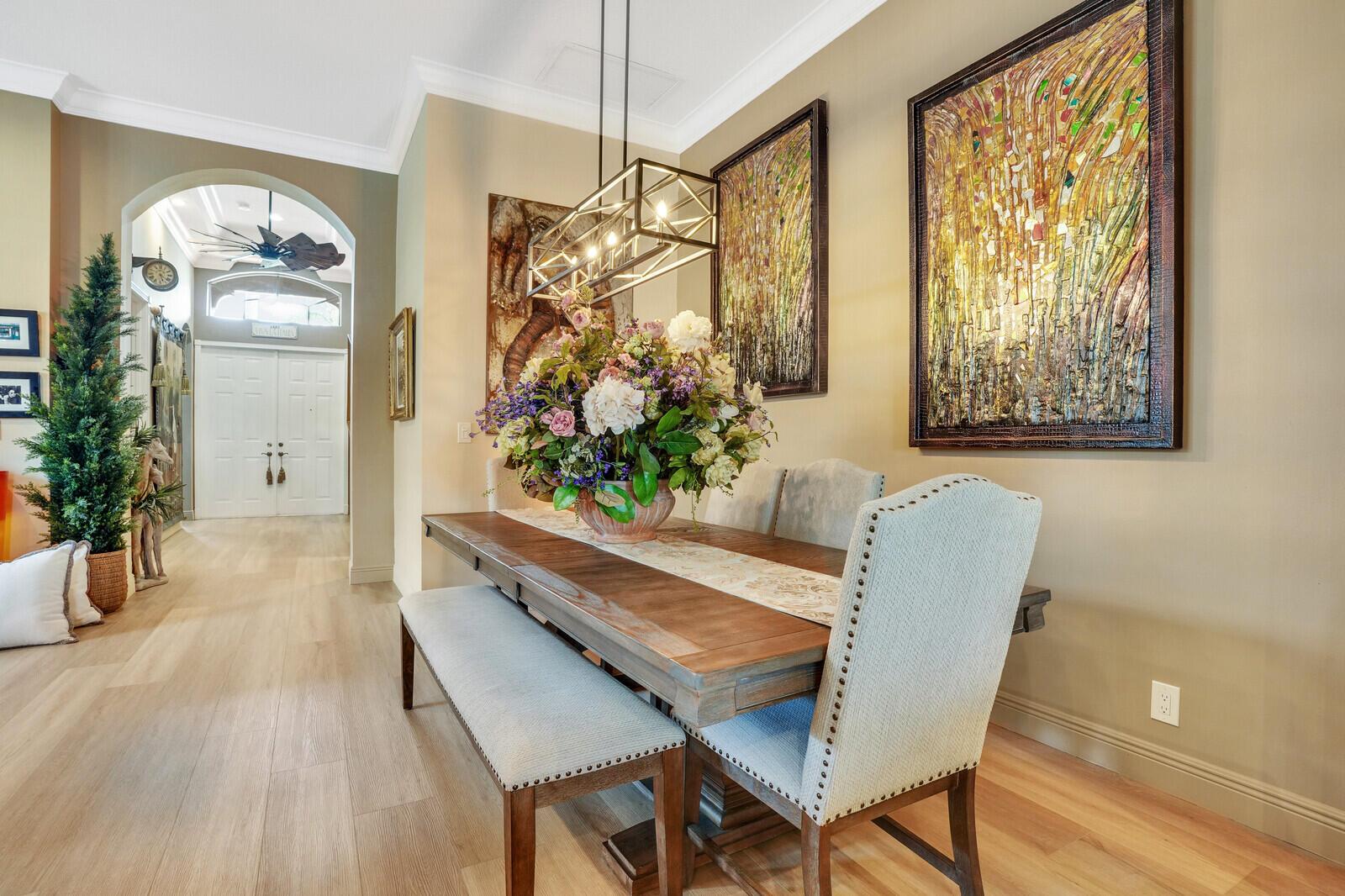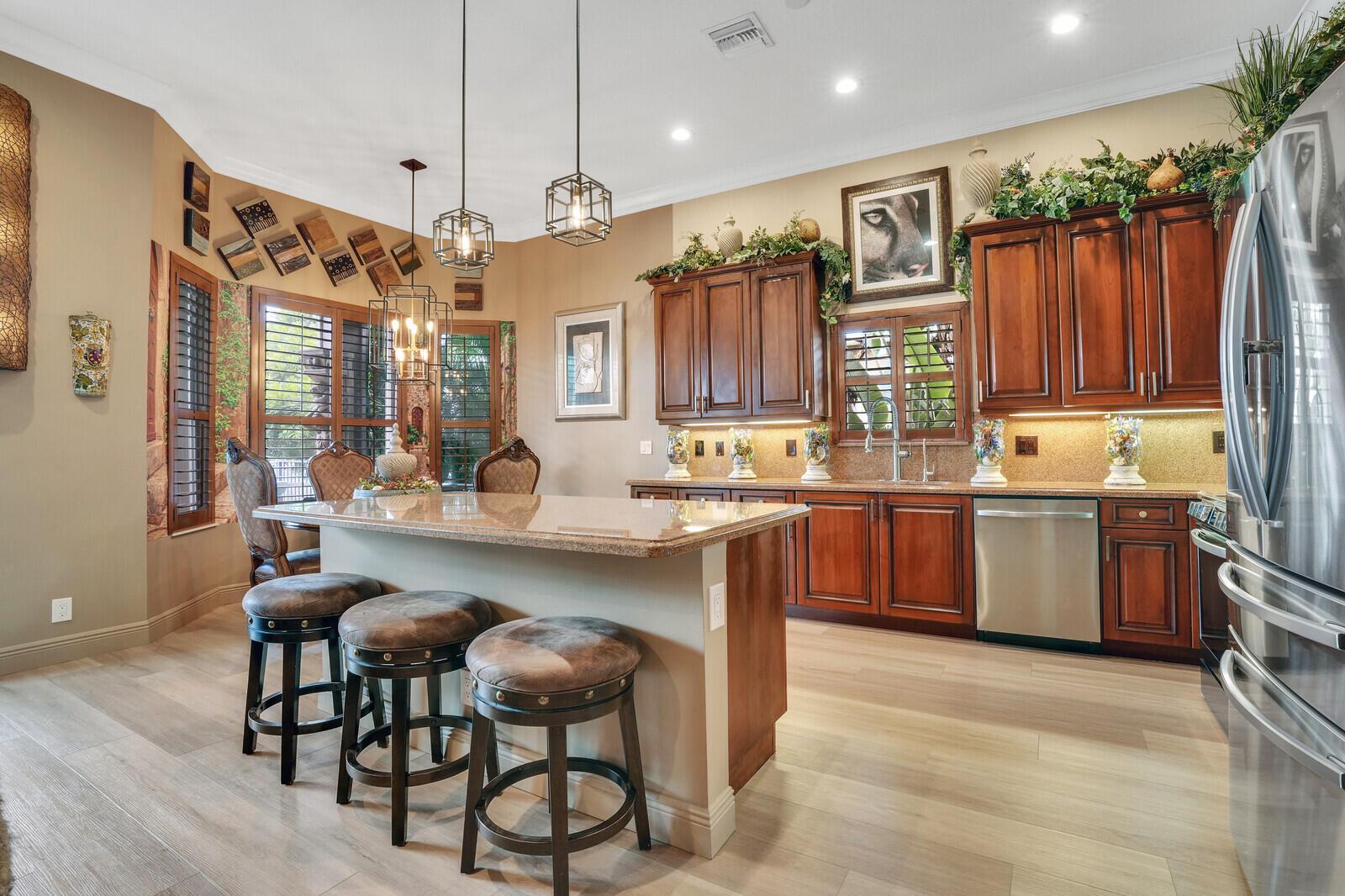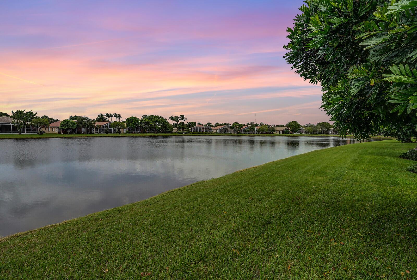 Welcome home to this desirable Modena model on a beautiful lakefront lot in the gated community of Villaggio. This upgraded home boasts elegant wood flooring throughout, accented by crown molding, large baseboards, and extra hi-hat lighting. The gorgeous kitchen is a chef’s dream, offering ample cabinet space, a large island, upgraded stainless steel appliances, granite countertops and backsplash, and an undermount sink. The bathrooms are tastefully appointed with upgraded hardware, granite countertops, tile to the ceiling with decorative listellos, and framed mirrors. Plantation shutters provide stylish window treatments throughout. Step outside and enjoy the sunsets in your expansive screened patio, leading to a private oasis with a cozy seating area and a fenced yard with a turf lawn.