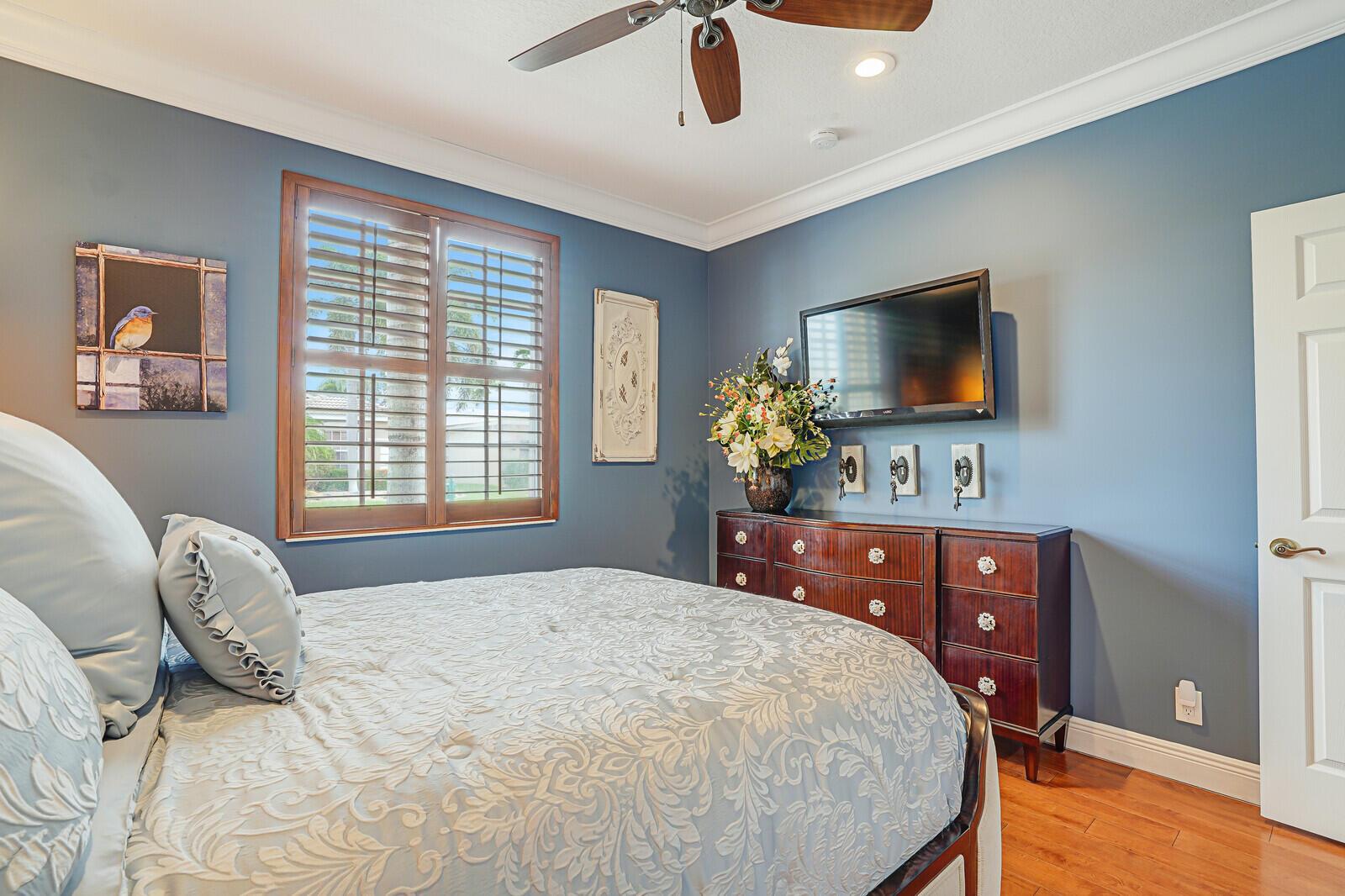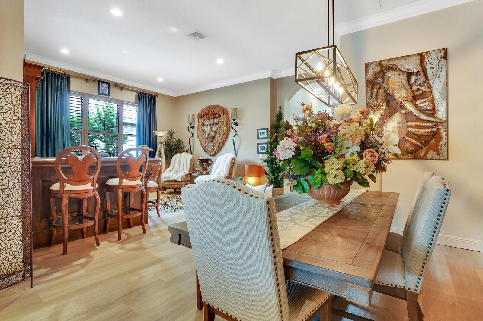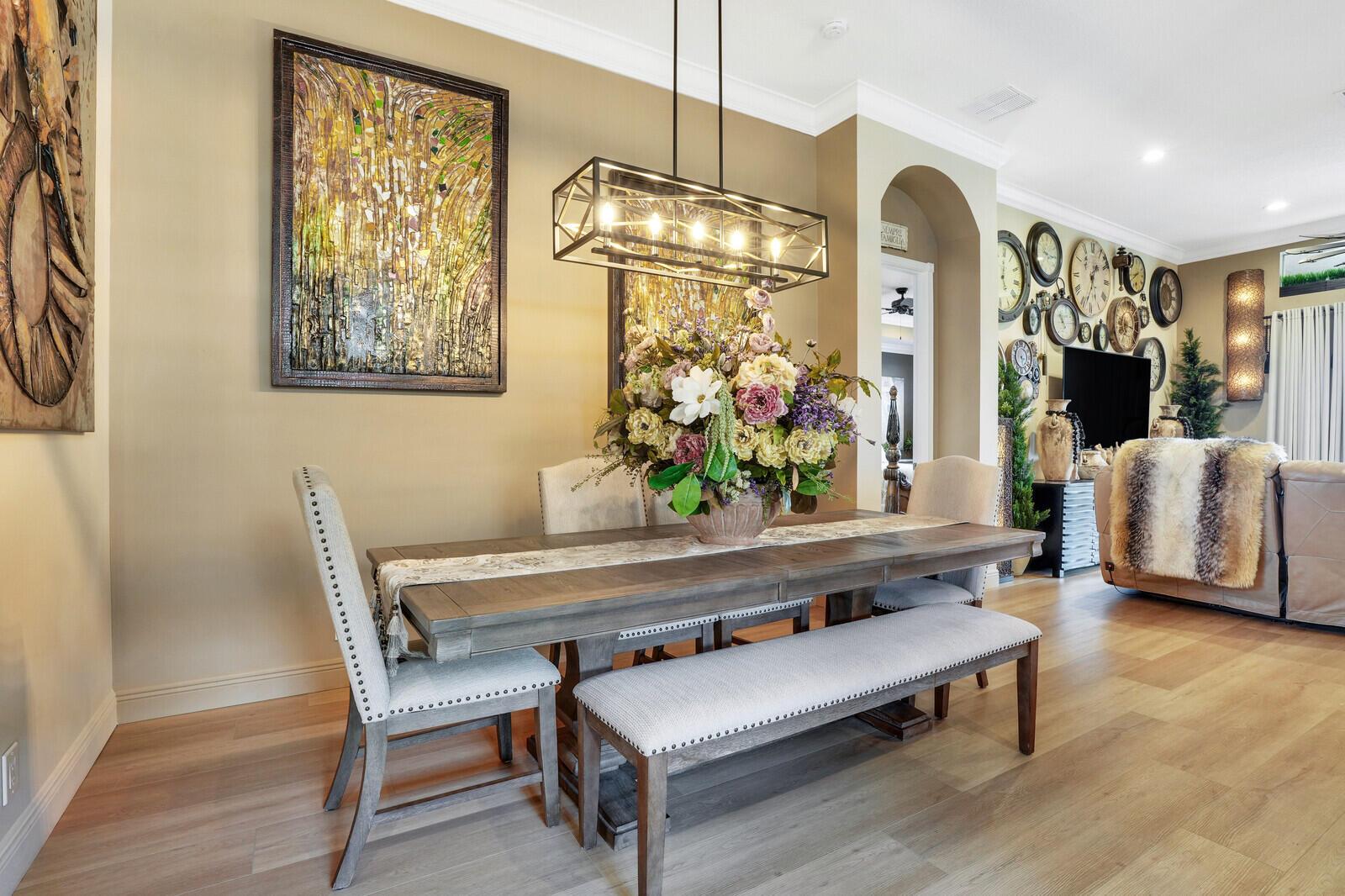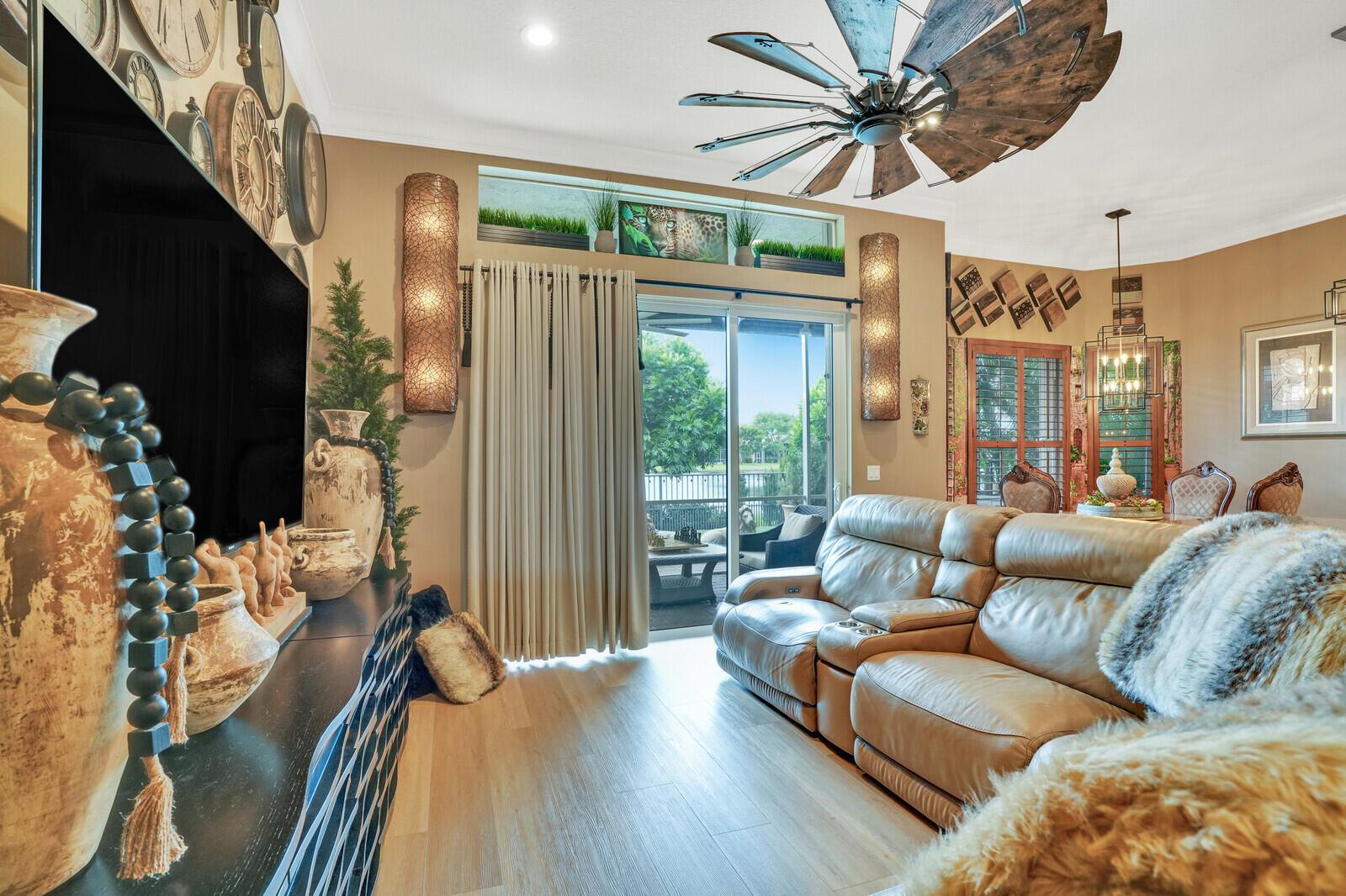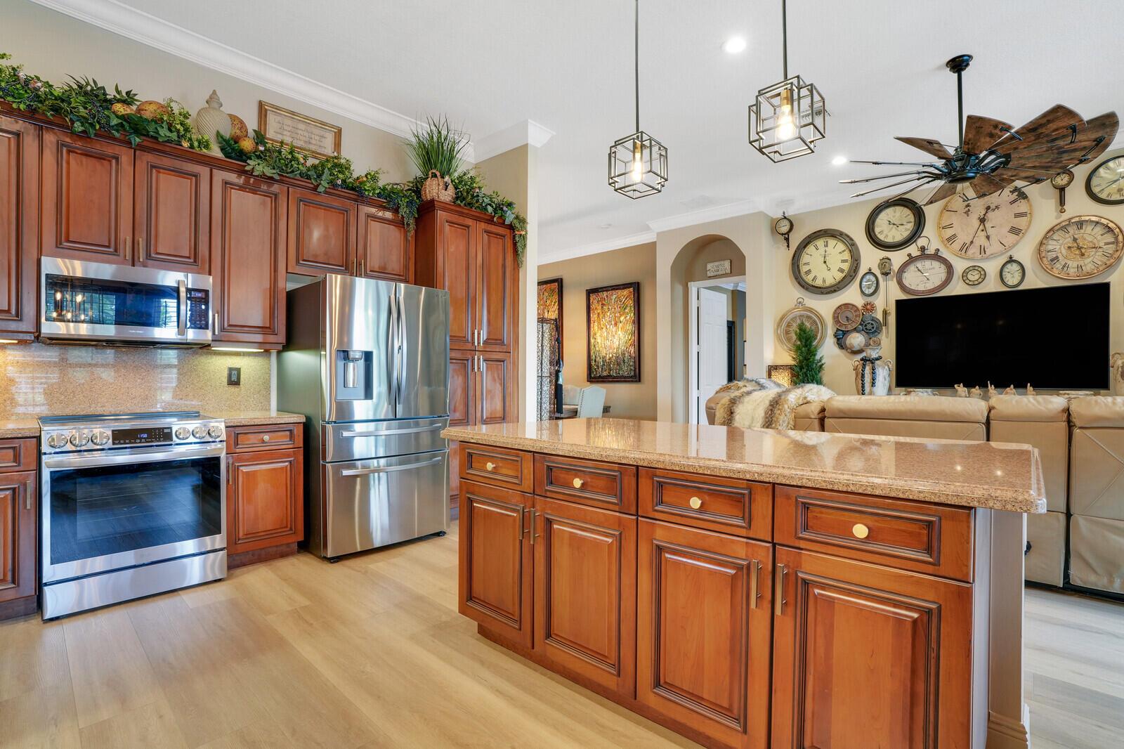 Welcome home to this desirable Modena model on a beautiful lakefront lot in the gated community of Villaggio. This upgraded home boasts elegant wood flooring throughout, accented by crown molding, large baseboards, and extra hi-hat lighting. The gorgeous kitchen is a chef’s dream, offering ample cabinet space, a large island, upgraded stainless steel appliances, granite countertops and backsplash, and an undermount sink. The bathrooms are tastefully appointed with upgraded hardware, granite countertops, tile to the ceiling with decorative listellos, and framed mirrors. Plantation shutters provide stylish window treatments throughout. Step outside and enjoy the sunsets in your expansive screened patio, leading to a private oasis with a cozy seating area and a fenced yard with a turf lawn.