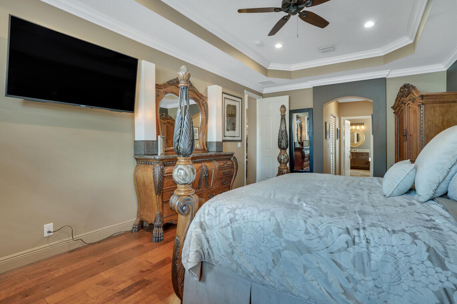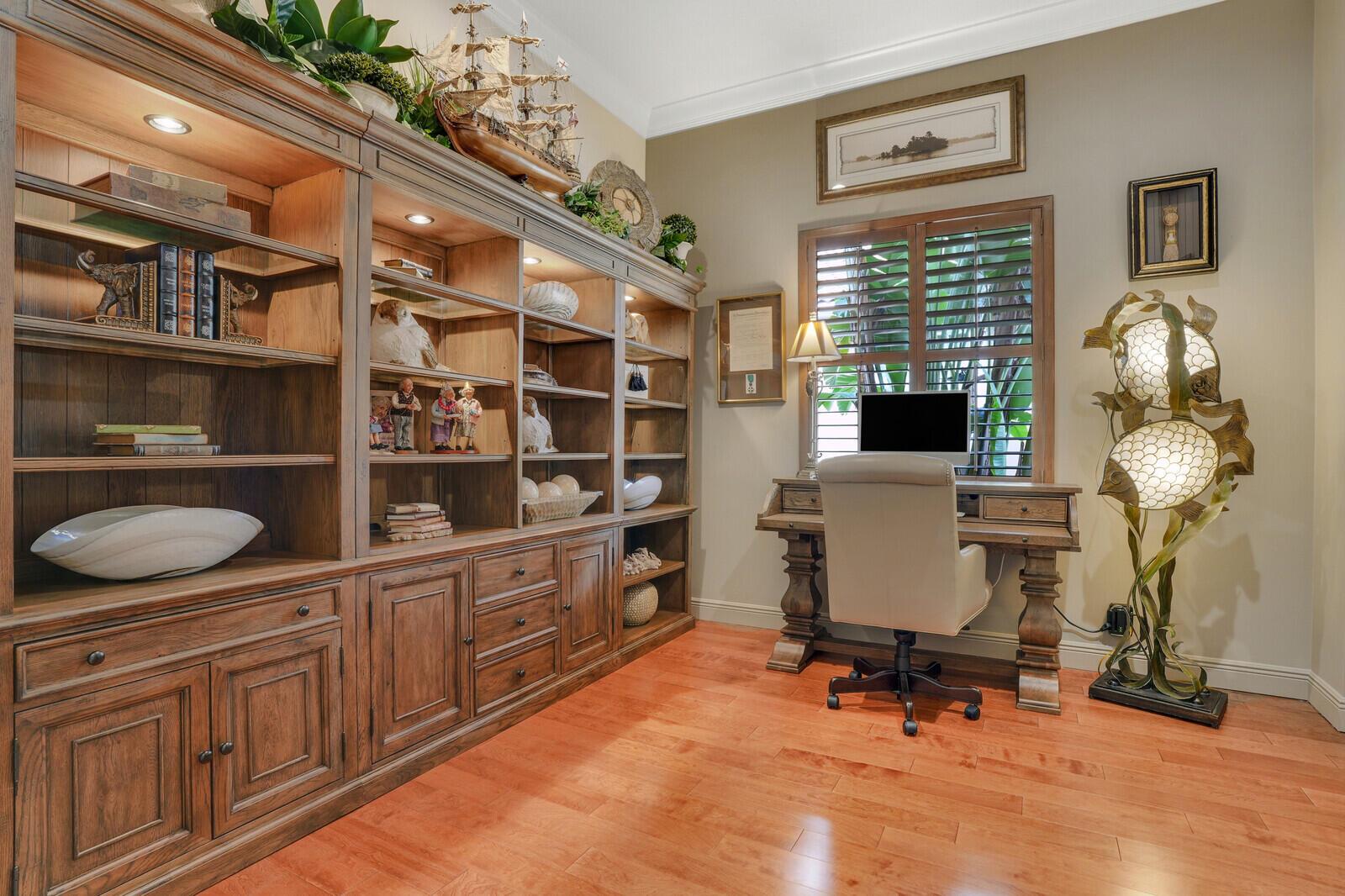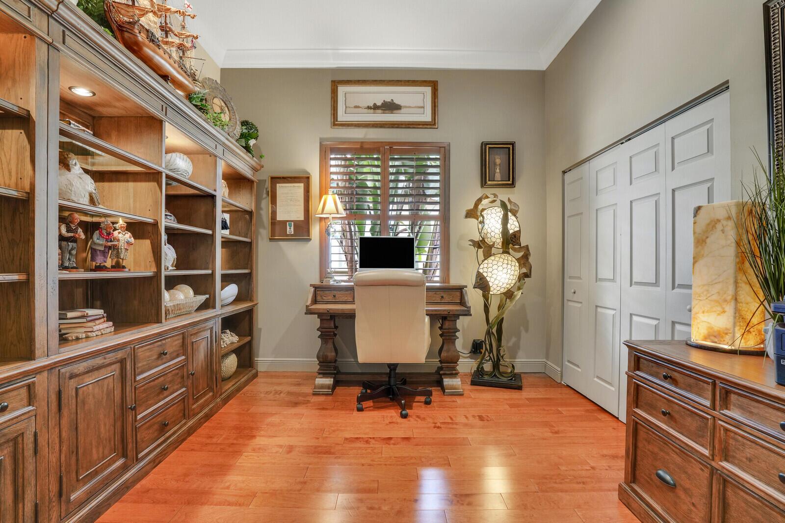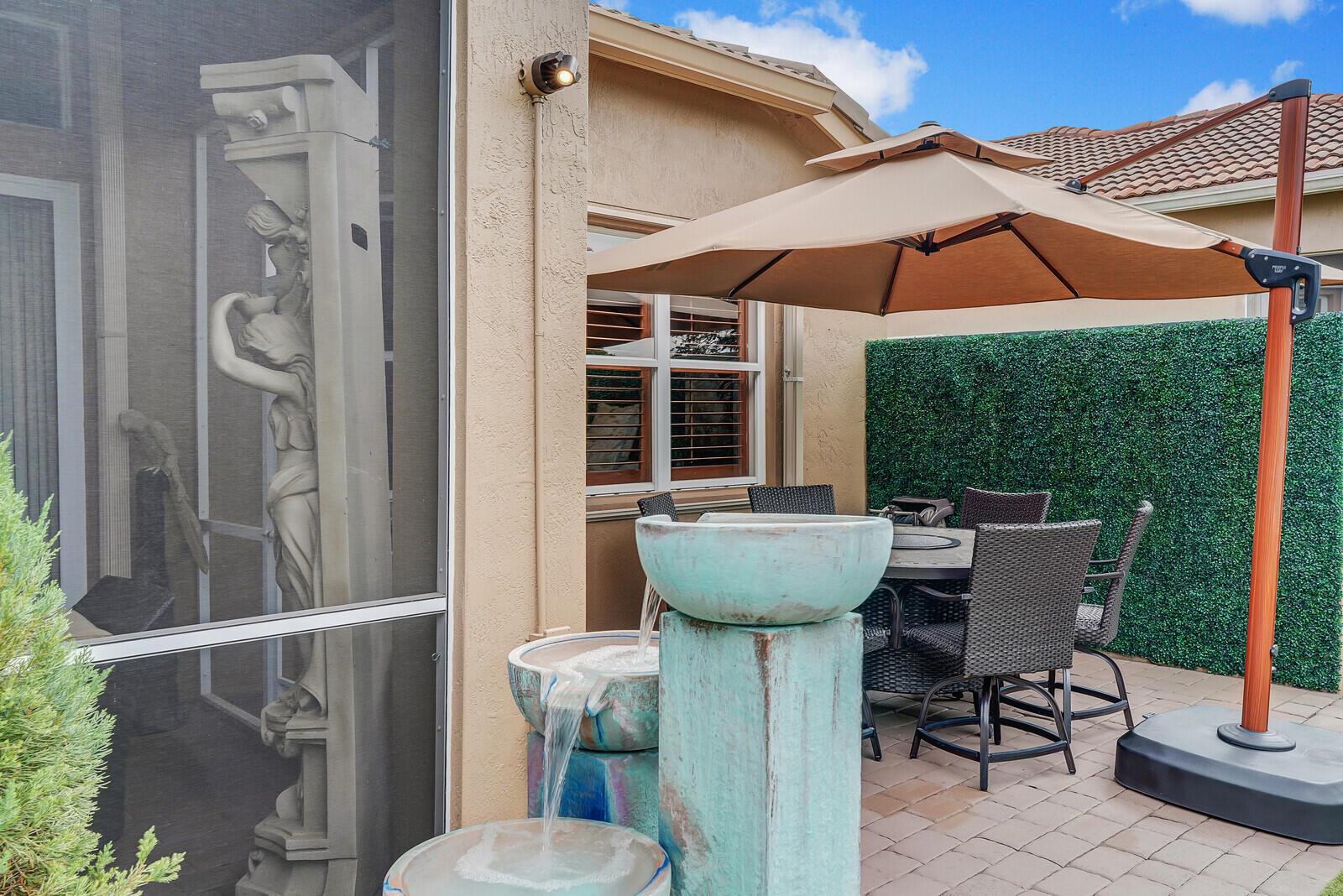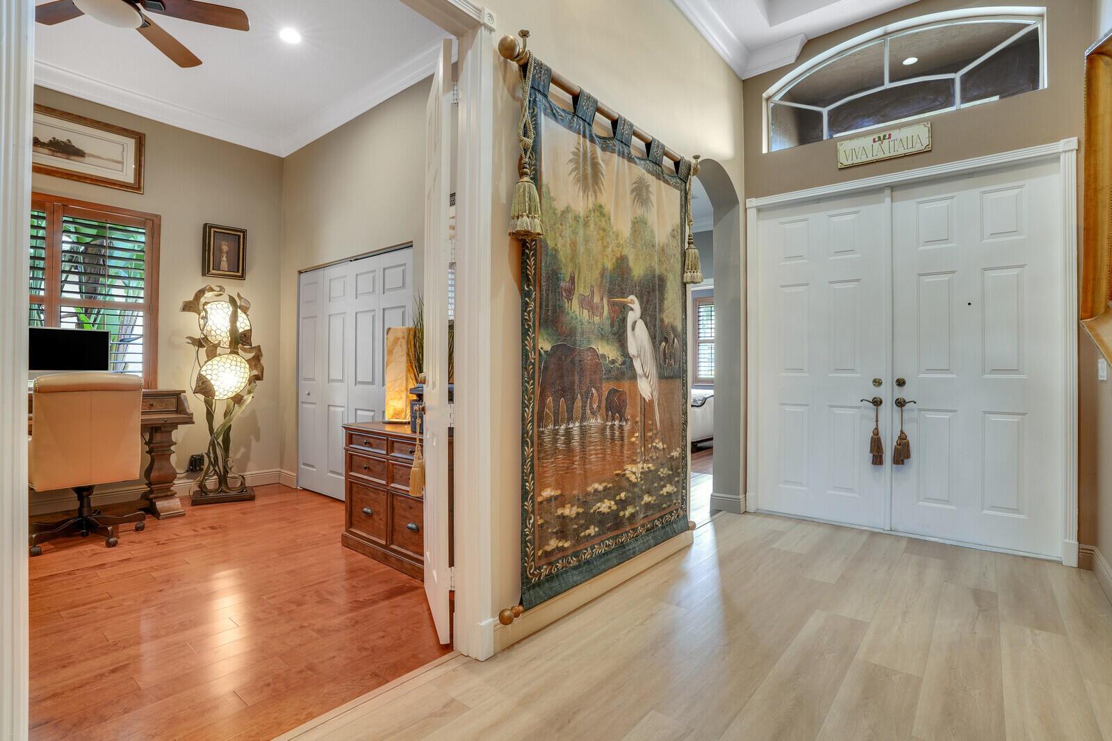 Welcome home to this desirable Modena model on a beautiful lakefront lot in the gated community of Villaggio. This upgraded home boasts elegant wood flooring throughout, accented by crown molding, large baseboards, and extra hi-hat lighting. The gorgeous kitchen is a chef’s dream, offering ample cabinet space, a large island, upgraded stainless steel appliances, granite countertops and backsplash, and an undermount sink. The bathrooms are tastefully appointed with upgraded hardware, granite countertops, tile to the ceiling with decorative listellos, and framed mirrors. Plantation shutters provide stylish window treatments throughout. Step outside and enjoy the sunsets in your expansive screened patio, leading to a private oasis with a cozy seating area and a fenced yard with a turf lawn.