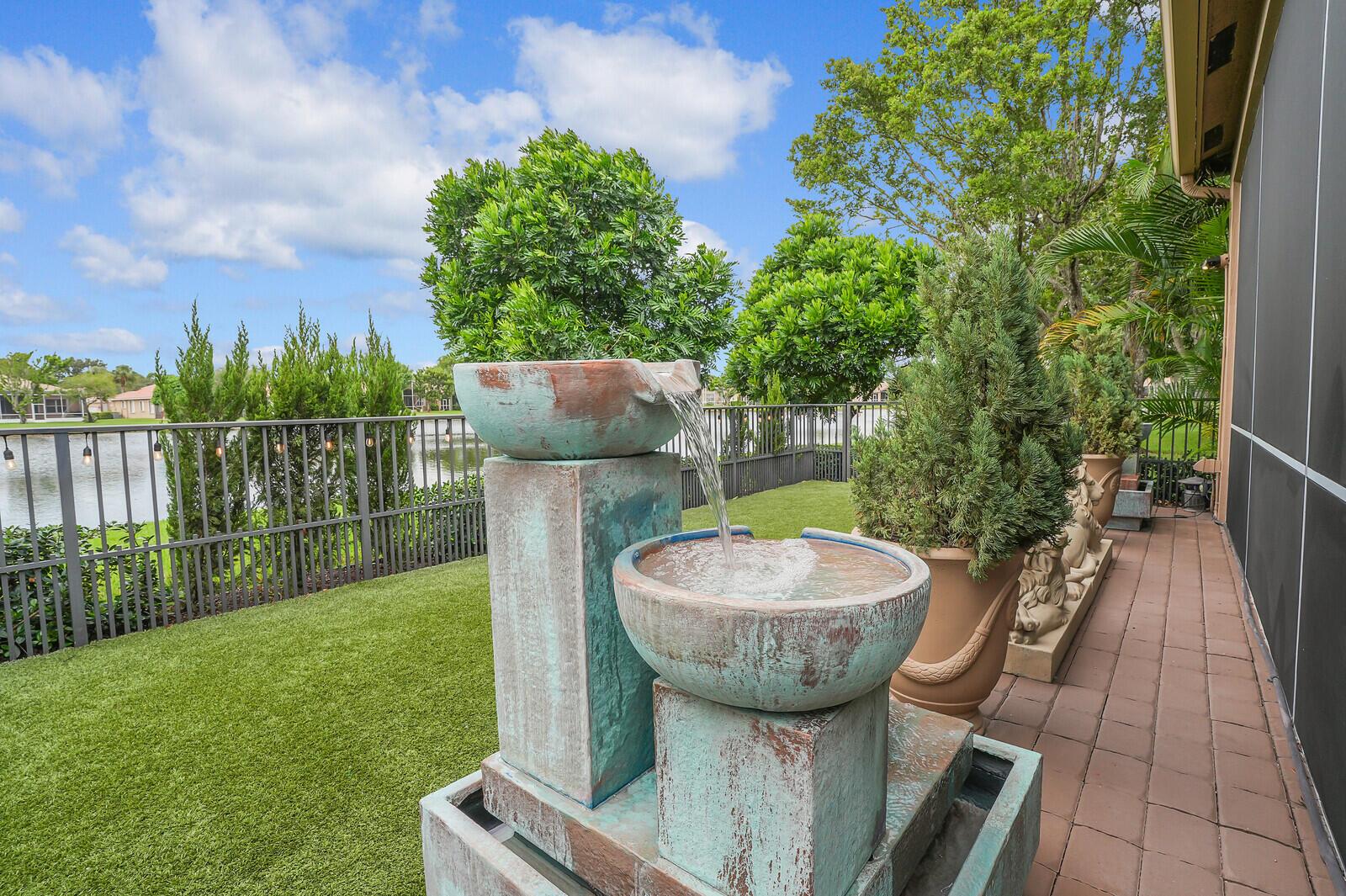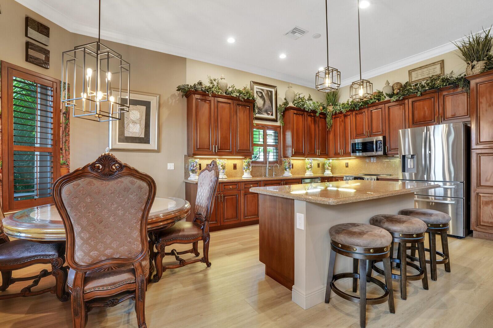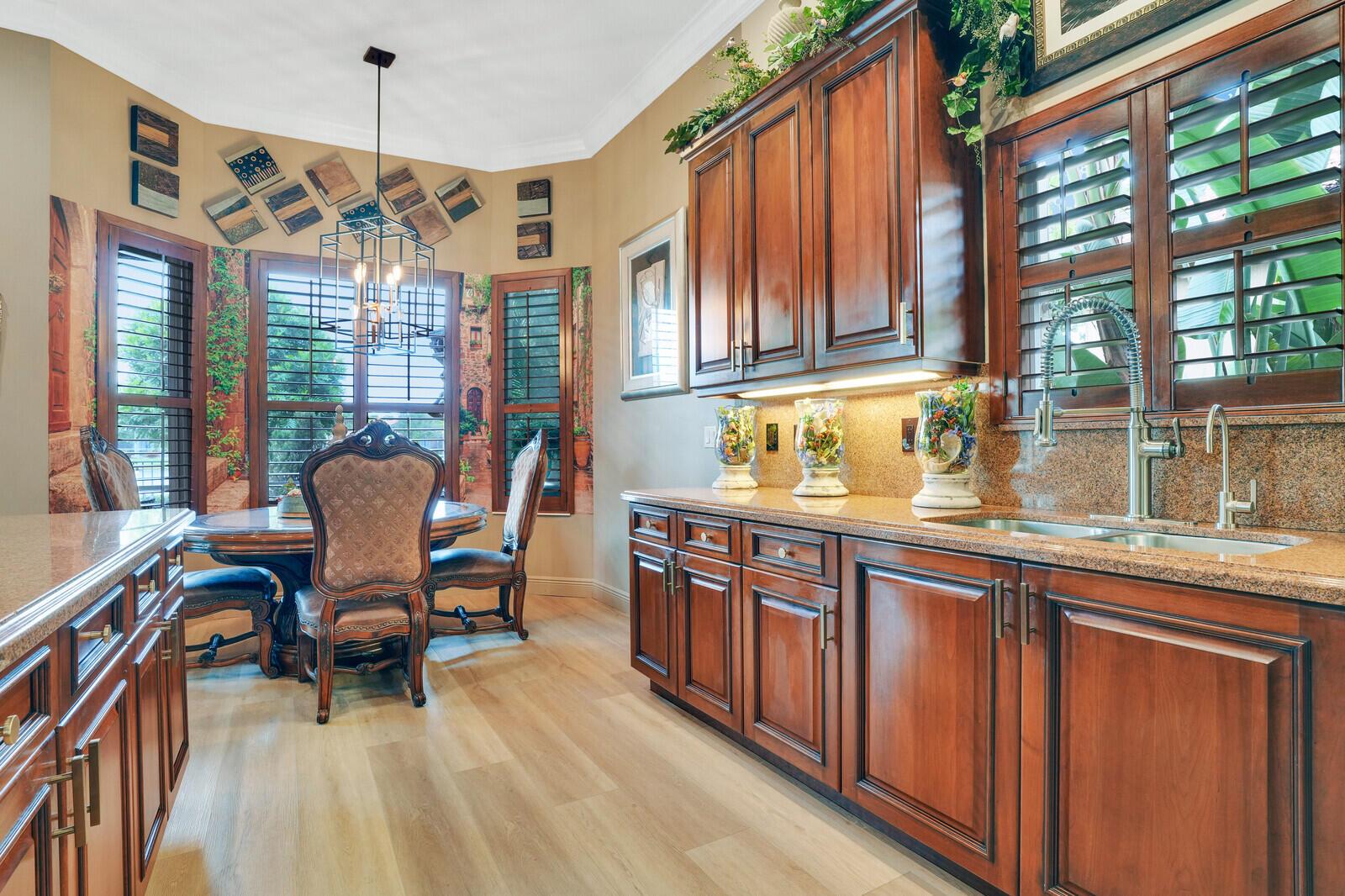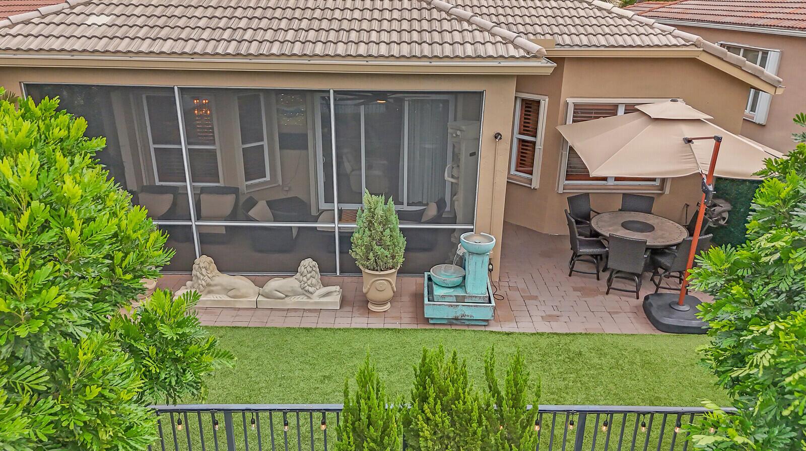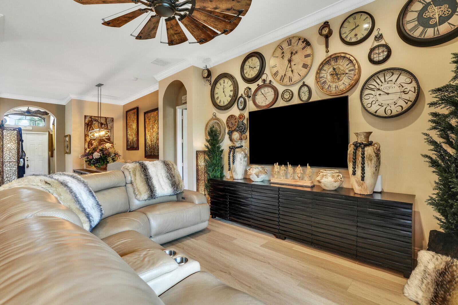 Welcome home to this desirable Modena model on a beautiful lakefront lot in the gated community of Villaggio. This upgraded home boasts elegant wood flooring throughout, accented by crown molding, large baseboards, and extra hi-hat lighting. The gorgeous kitchen is a chef’s dream, offering ample cabinet space, a large island, upgraded stainless steel appliances, granite countertops and backsplash, and an undermount sink. The bathrooms are tastefully appointed with upgraded hardware, granite countertops, tile to the ceiling with decorative listellos, and framed mirrors. Plantation shutters provide stylish window treatments throughout. Step outside and enjoy the sunsets in your expansive screened patio, leading to a private oasis with a cozy seating area and a fenced yard with a turf lawn.