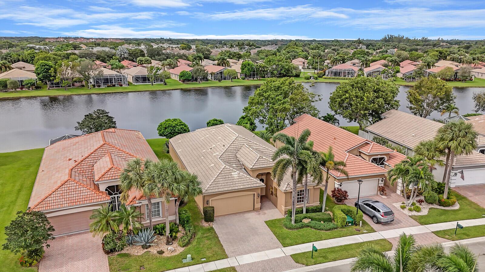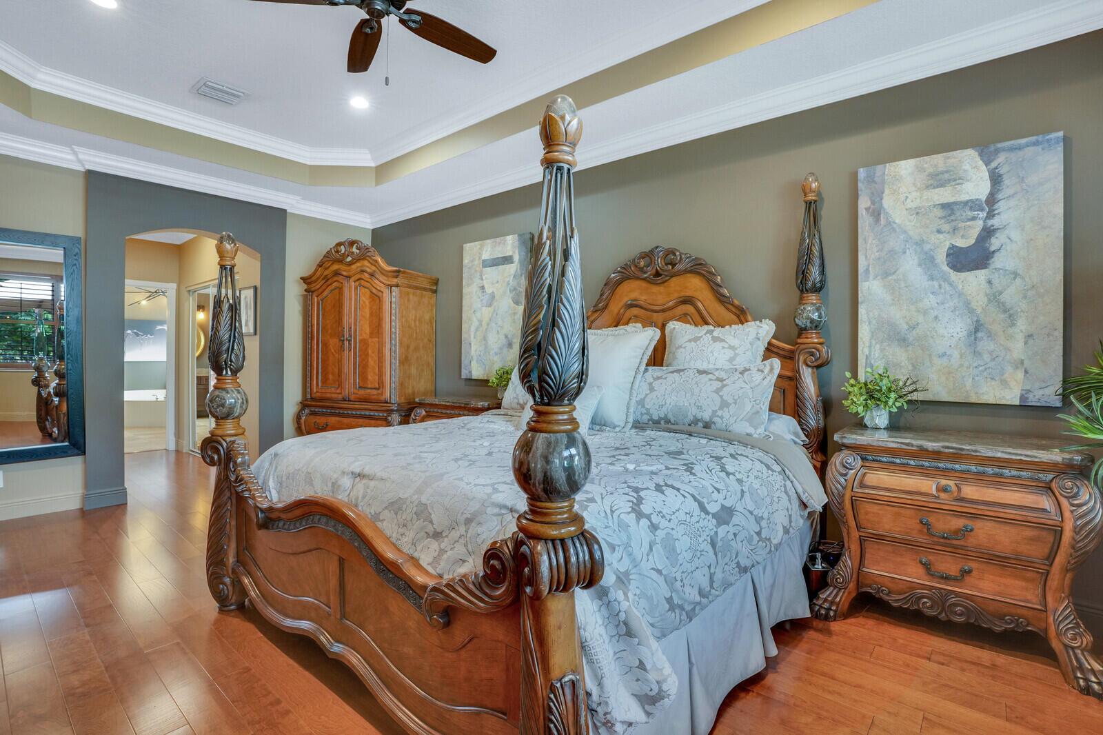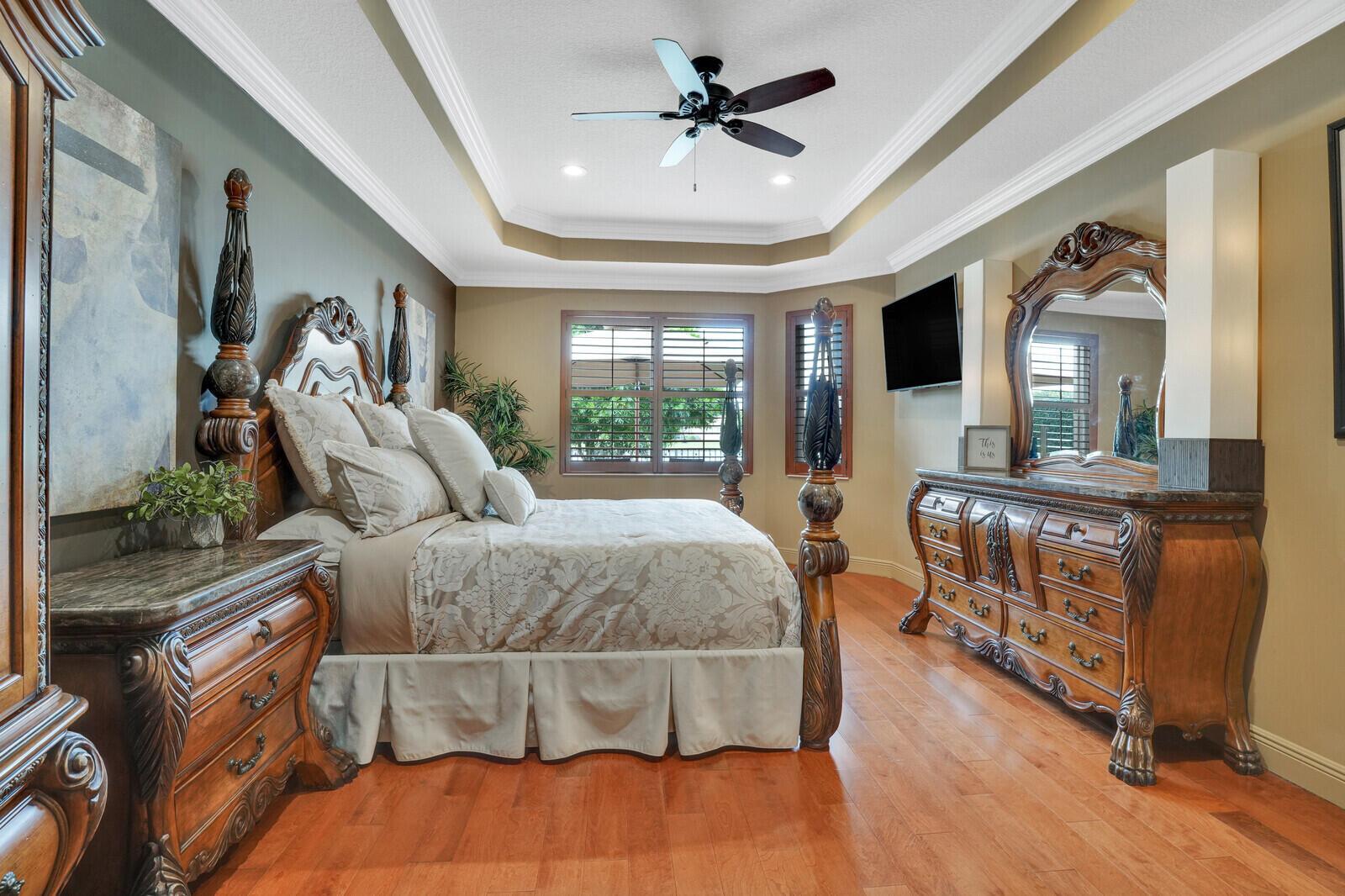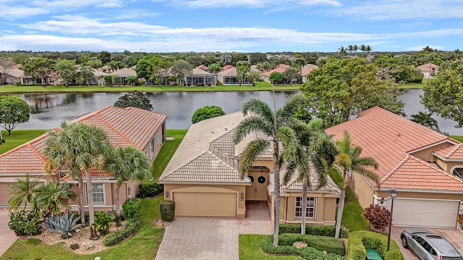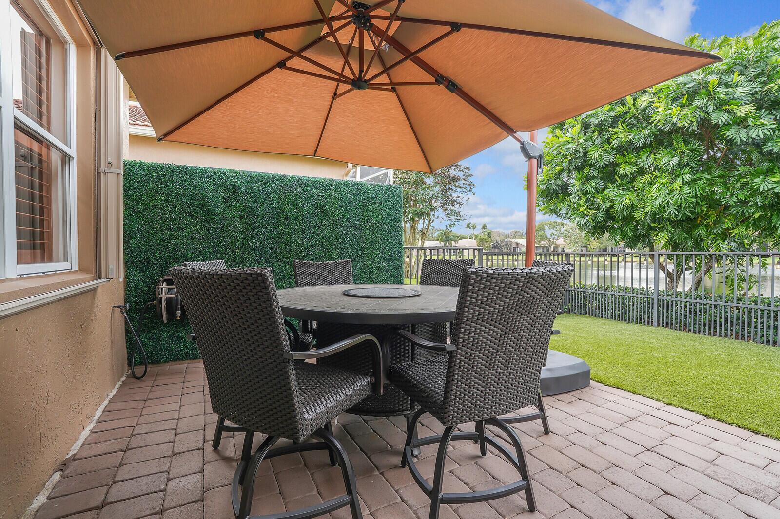 Welcome home to this desirable Modena model on a beautiful lakefront lot in the gated community of Villaggio. This upgraded home boasts elegant wood flooring throughout, accented by crown molding, large baseboards, and extra hi-hat lighting. The gorgeous kitchen is a chef’s dream, offering ample cabinet space, a large island, upgraded stainless steel appliances, granite countertops and backsplash, and an undermount sink. The bathrooms are tastefully appointed with upgraded hardware, granite countertops, tile to the ceiling with decorative listellos, and framed mirrors. Plantation shutters provide stylish window treatments throughout. Step outside and enjoy the sunsets in your expansive screened patio, leading to a private oasis with a cozy seating area and a fenced yard with a turf lawn.