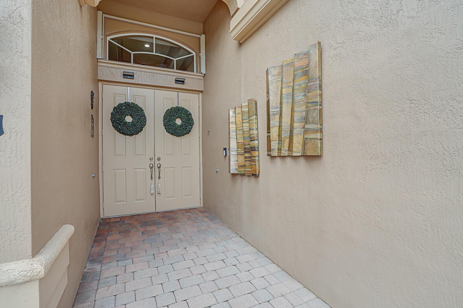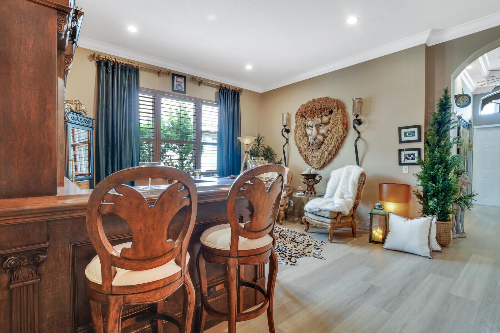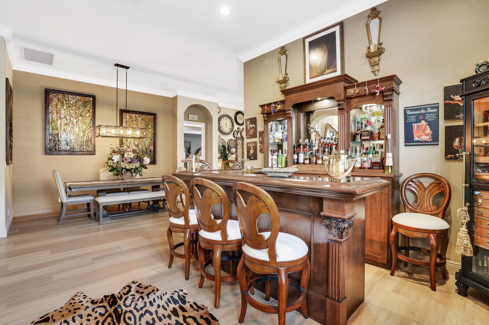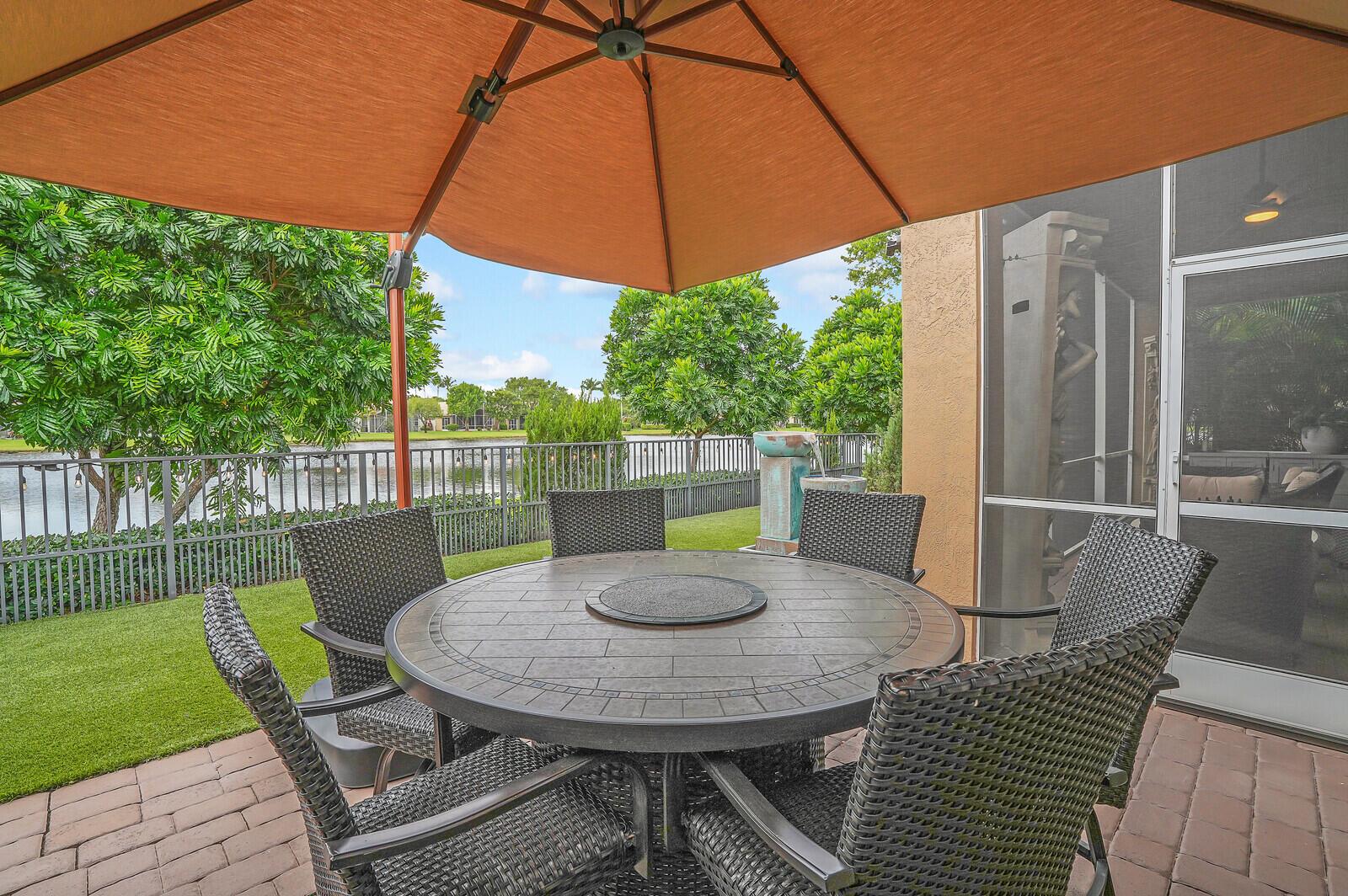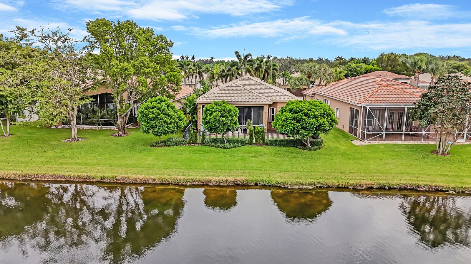 Welcome home to this desirable Modena model on a beautiful lakefront lot in the gated community of Villaggio. This upgraded home boasts elegant wood flooring throughout, accented by crown molding, large baseboards, and extra hi-hat lighting. The gorgeous kitchen is a chef’s dream, offering ample cabinet space, a large island, upgraded stainless steel appliances, granite countertops and backsplash, and an undermount sink. The bathrooms are tastefully appointed with upgraded hardware, granite countertops, tile to the ceiling with decorative listellos, and framed mirrors. Plantation shutters provide stylish window treatments throughout. Step outside and enjoy the sunsets in your expansive screened patio, leading to a private oasis with a cozy seating area and a fenced yard with a turf lawn.