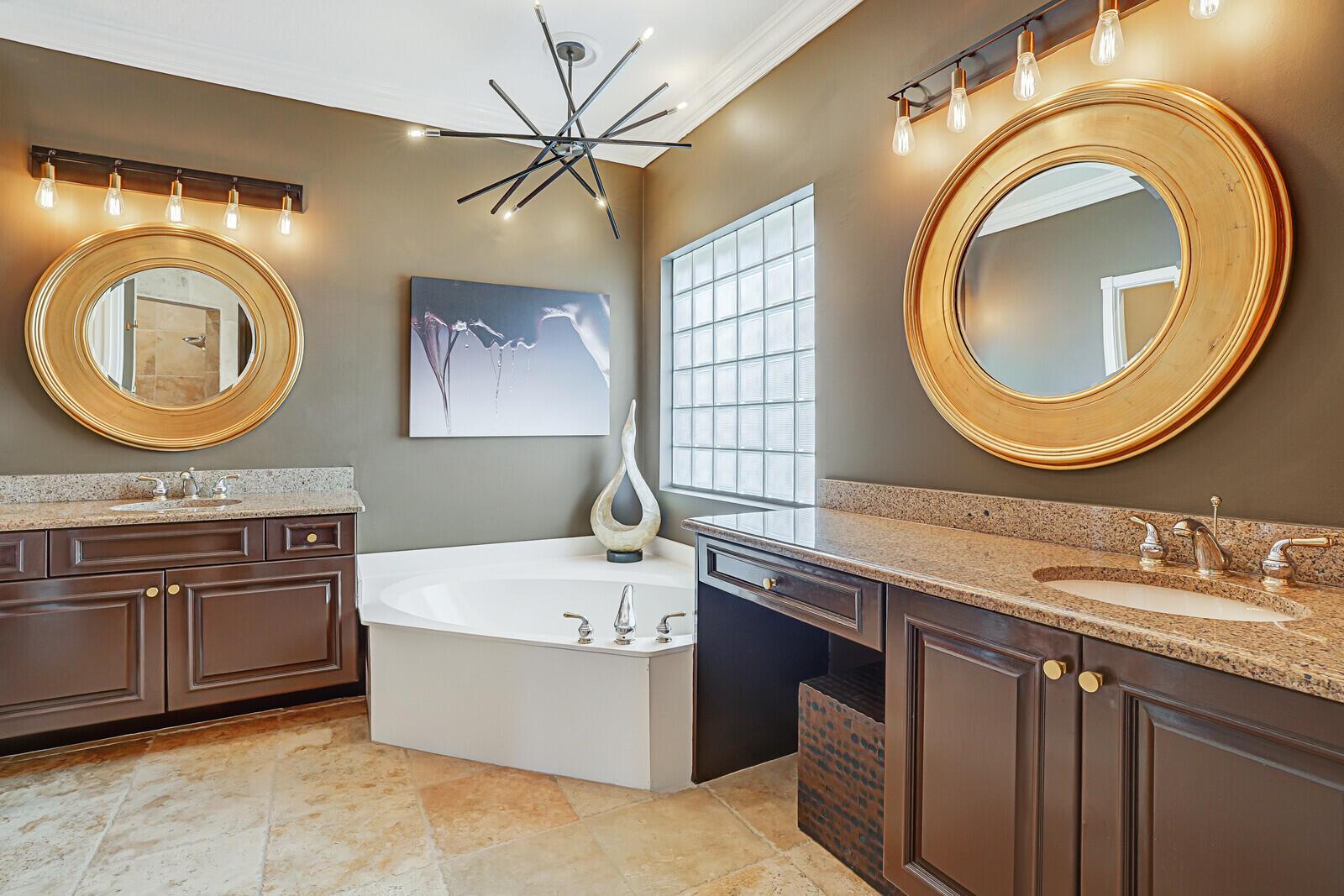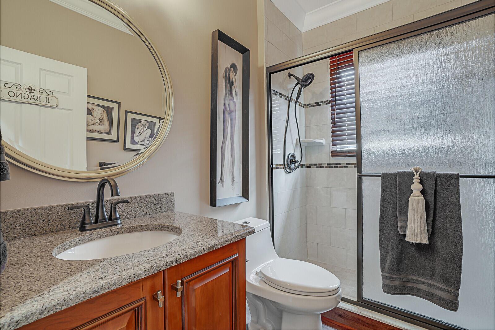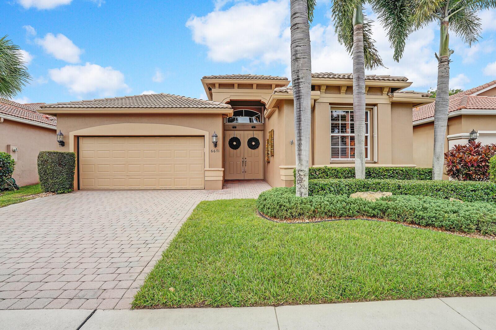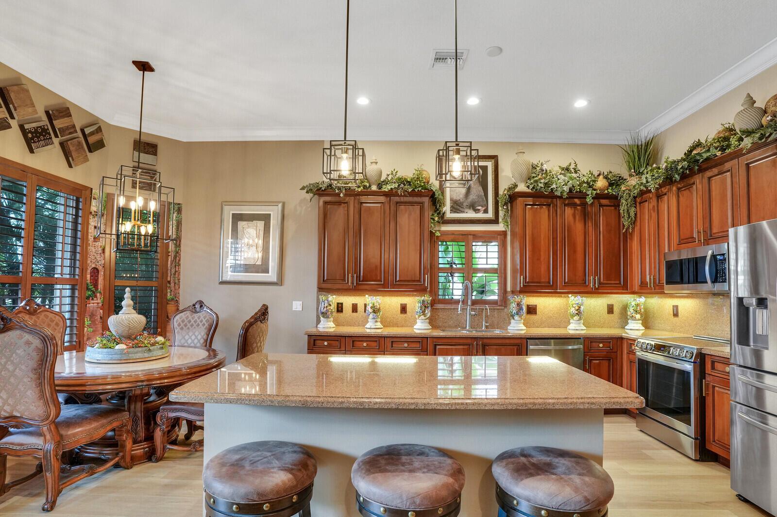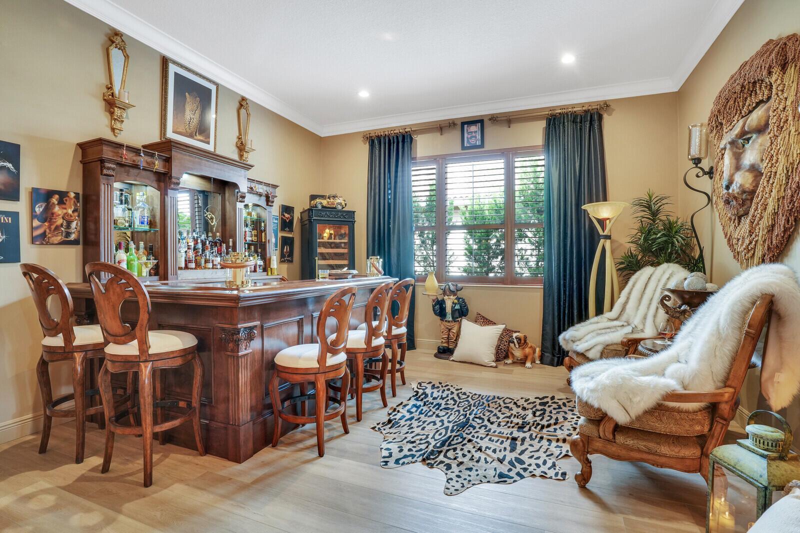 Welcome home to this desirable Modena model on a beautiful lakefront lot in the gated community of Villaggio. This upgraded home boasts elegant wood flooring throughout, accented by crown molding, large baseboards, and extra hi-hat lighting. The gorgeous kitchen is a chef’s dream, offering ample cabinet space, a large island, upgraded stainless steel appliances, granite countertops and backsplash, and an undermount sink. The bathrooms are tastefully appointed with upgraded hardware, granite countertops, tile to the ceiling with decorative listellos, and framed mirrors. Plantation shutters provide stylish window treatments throughout. Step outside and enjoy the sunsets in your expansive screened patio, leading to a private oasis with a cozy seating area and a fenced yard with a turf lawn.