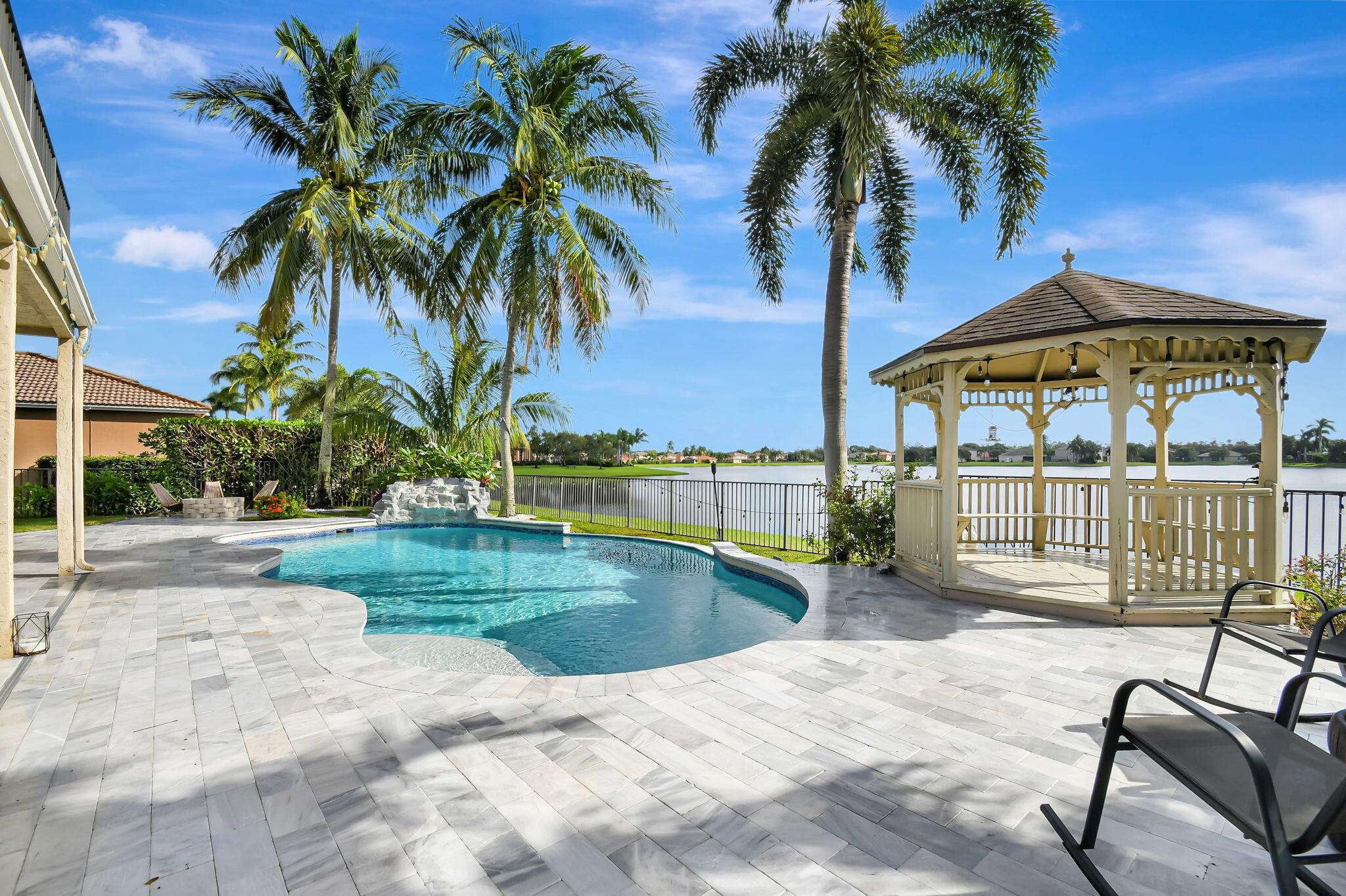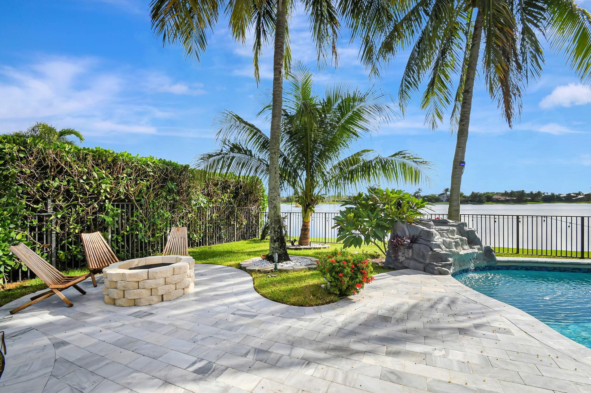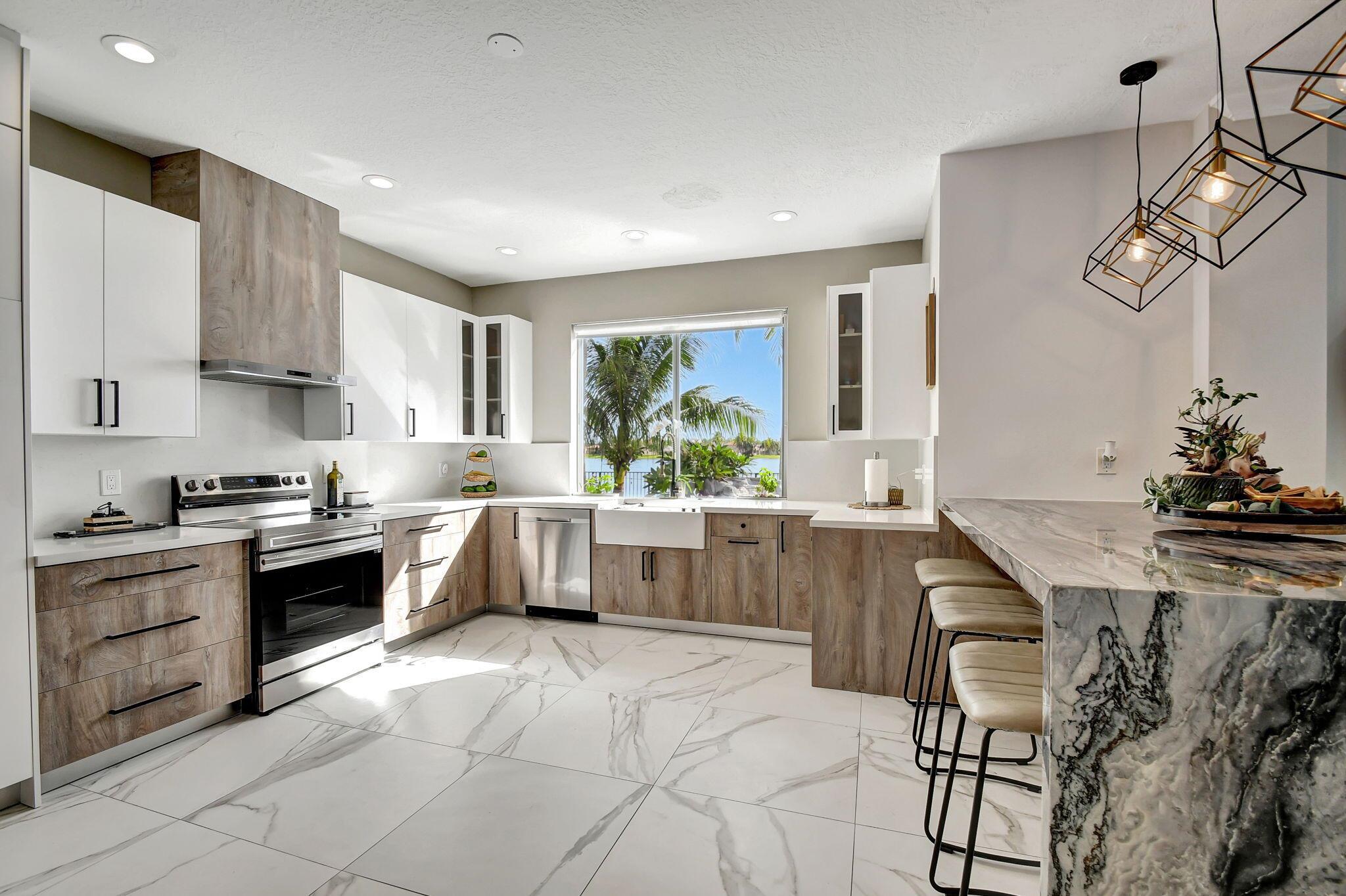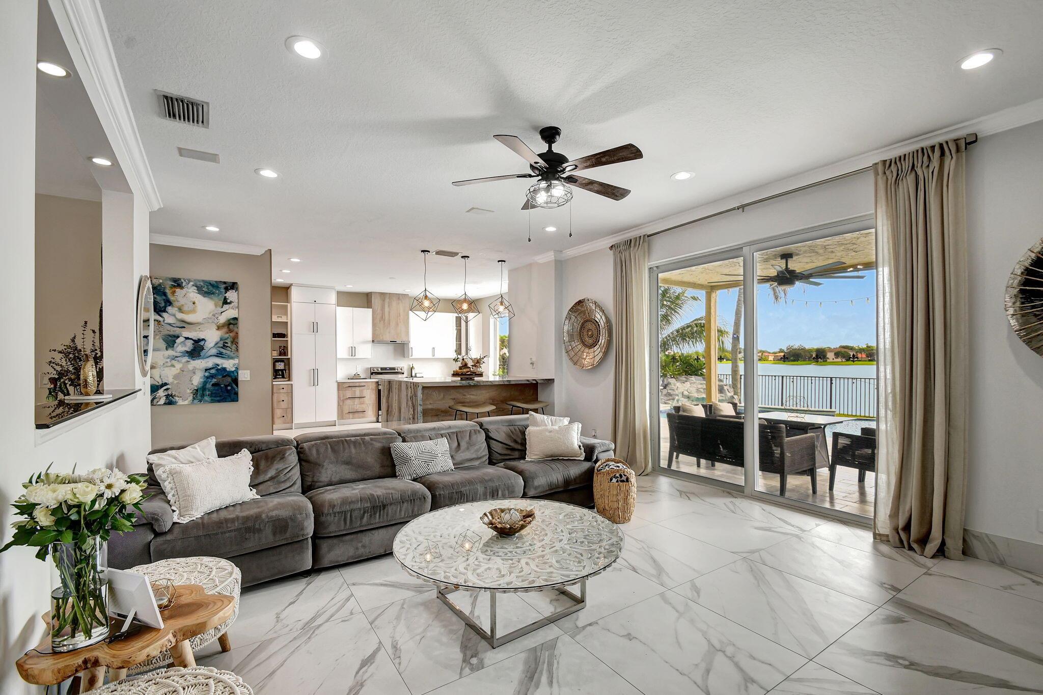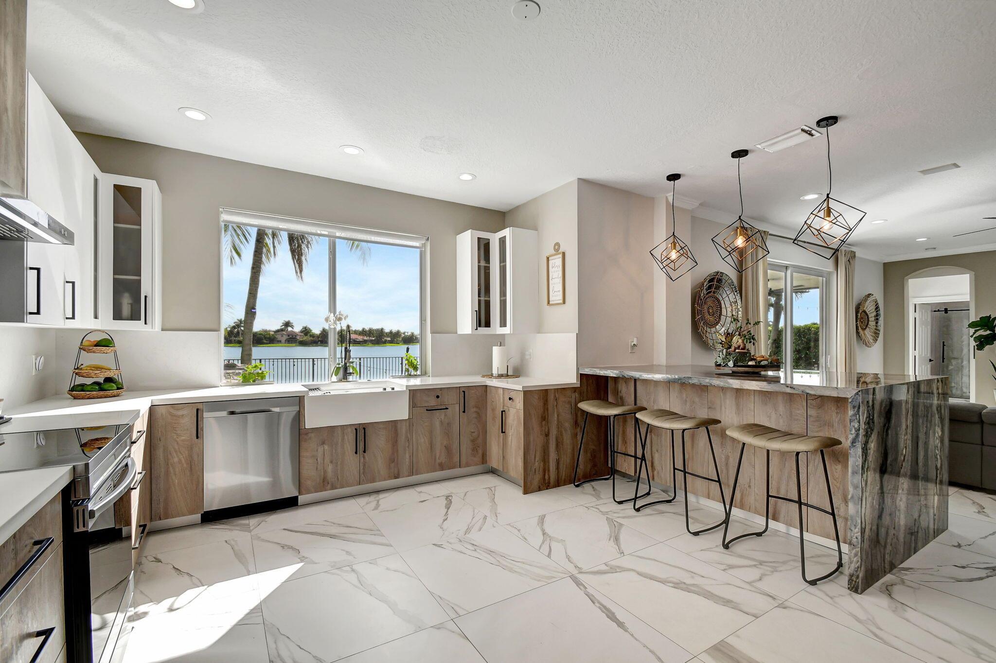 Fabulous renovated former model home (4/3/3)on an enormous lake with a heated pool and a fenced yard. Exceeding $300,000, the upgrades include marble porcelain floors throughout downstairs and wood look tile upstairs, full impact glass, 2 new a/c’s, 2 remodeled bathrooms, new pool tile, pool heater and stone waterfall. Also recently, the pool decking was transformed with marble and a firepit was added, the kitchen was totally renovated, and even the garage was resurfaced with an epoxy flake finish. The totally remodeled gourmet kitchen has new contemporary cabinets with pullouts, white quartz counter, grey marble eat-in counter, new Samsung stainless steel appliances, farmhouse sink overlooking the pool and lake, and a large walk-in pantry. A bedroom and a full cabana bath are on the