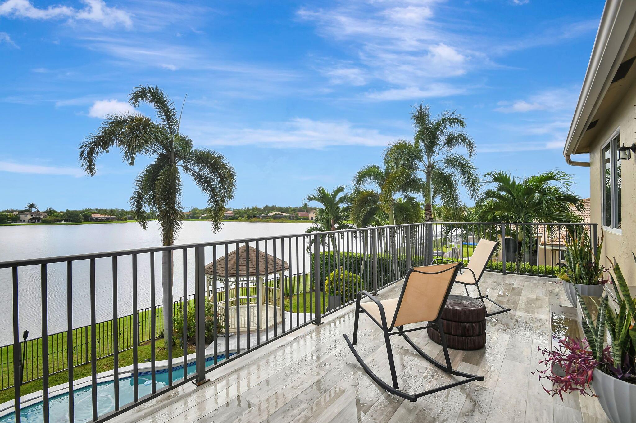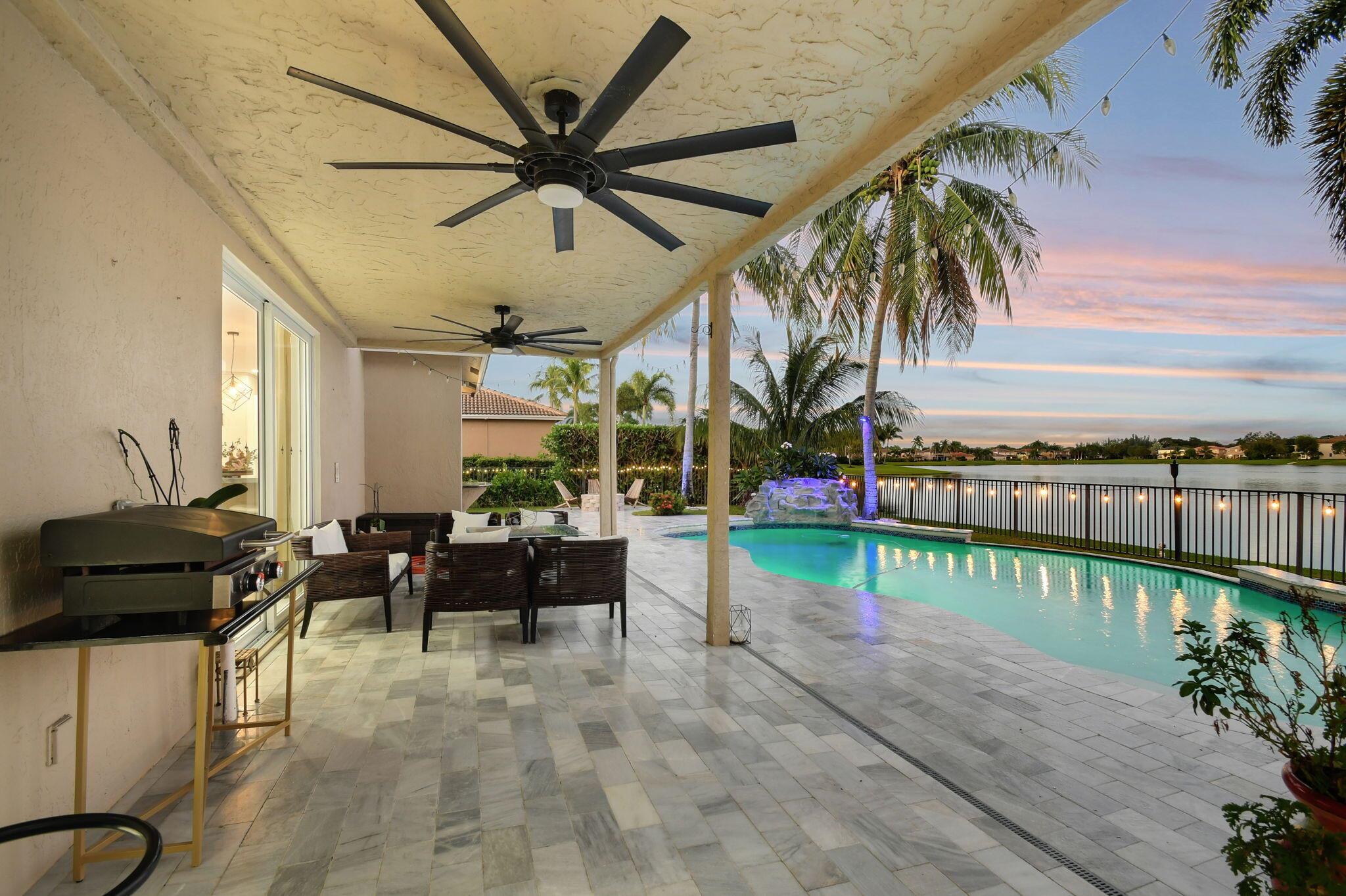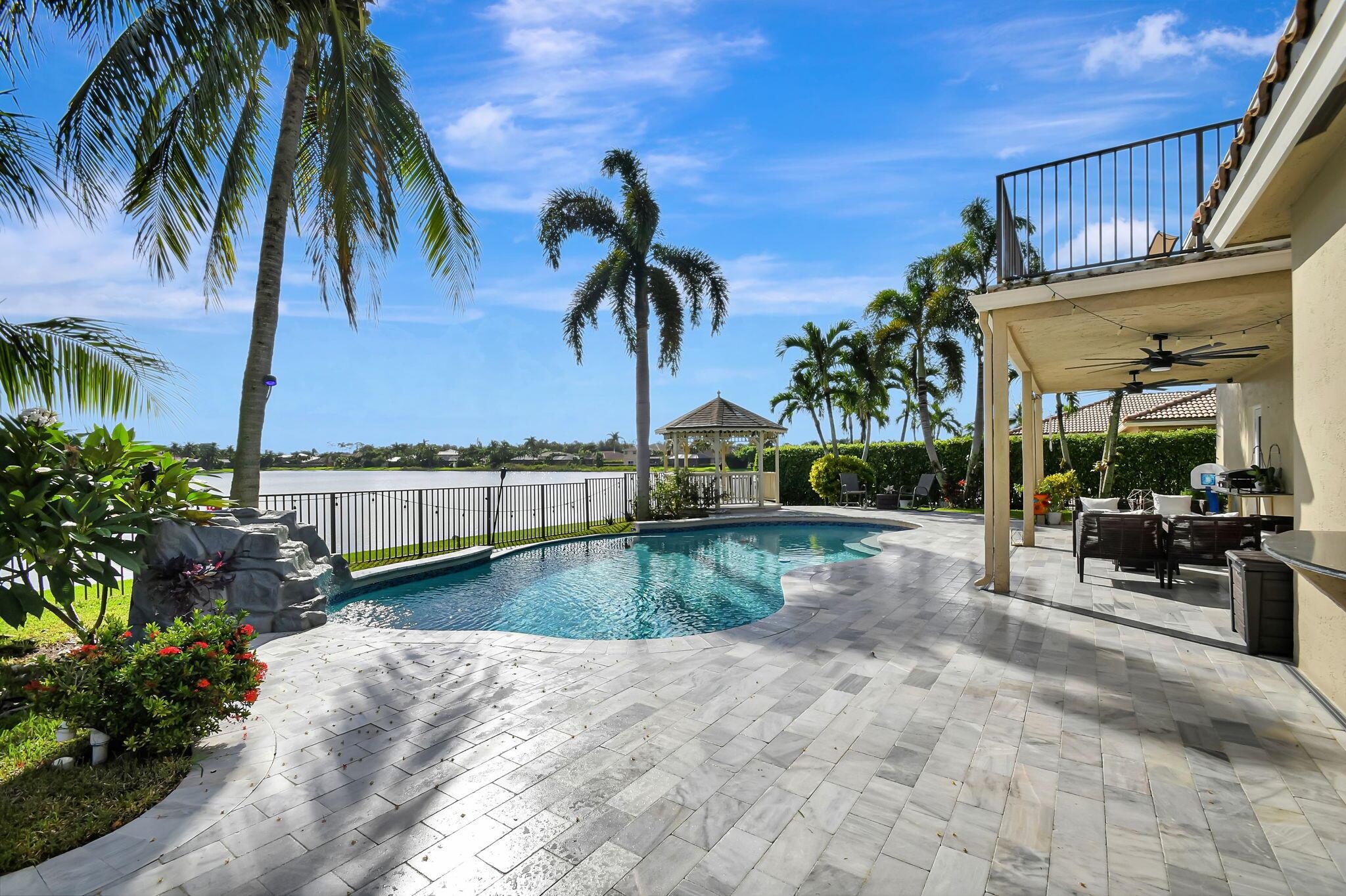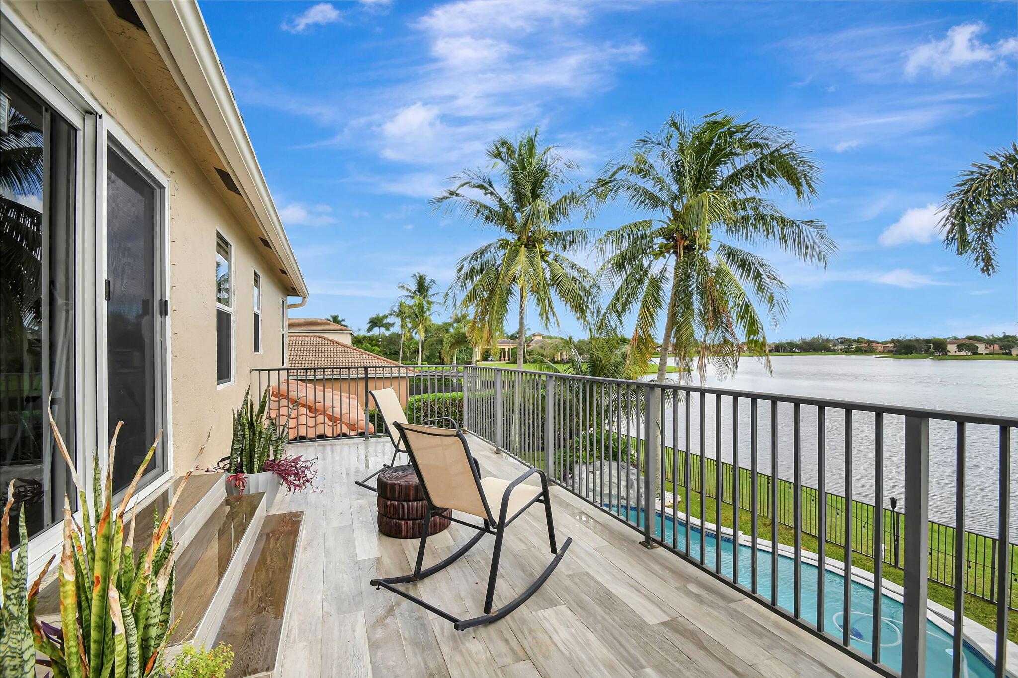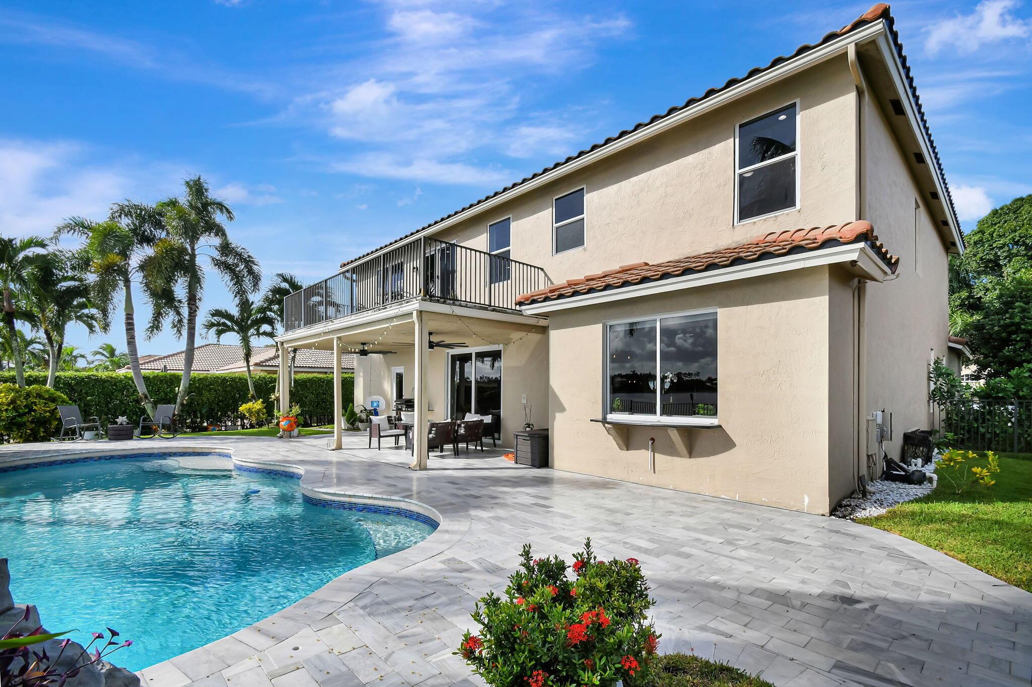 Fabulous renovated former model home (4/3/3)on an enormous lake with a heated pool and a fenced yard. Exceeding $300,000, the upgrades include marble porcelain floors throughout downstairs and wood look tile upstairs, full impact glass, 2 new a/c’s, 2 remodeled bathrooms, new pool tile, pool heater and stone waterfall. Also recently, the pool decking was transformed with marble and a firepit was added, the kitchen was totally renovated, and even the garage was resurfaced with an epoxy flake finish. The totally remodeled gourmet kitchen has new contemporary cabinets with pullouts, white quartz counter, grey marble eat-in counter, new Samsung stainless steel appliances, farmhouse sink overlooking the pool and lake, and a large walk-in pantry. A bedroom and a full cabana bath are on the