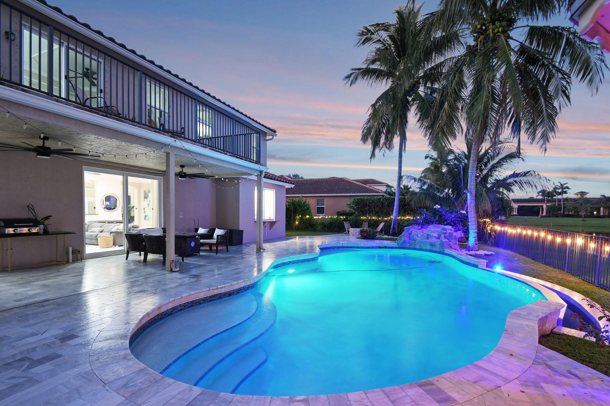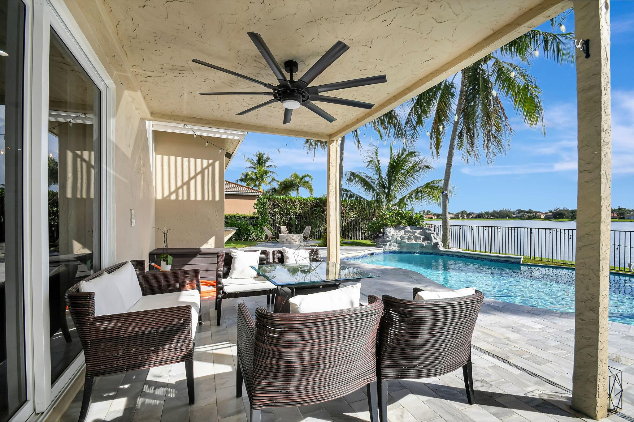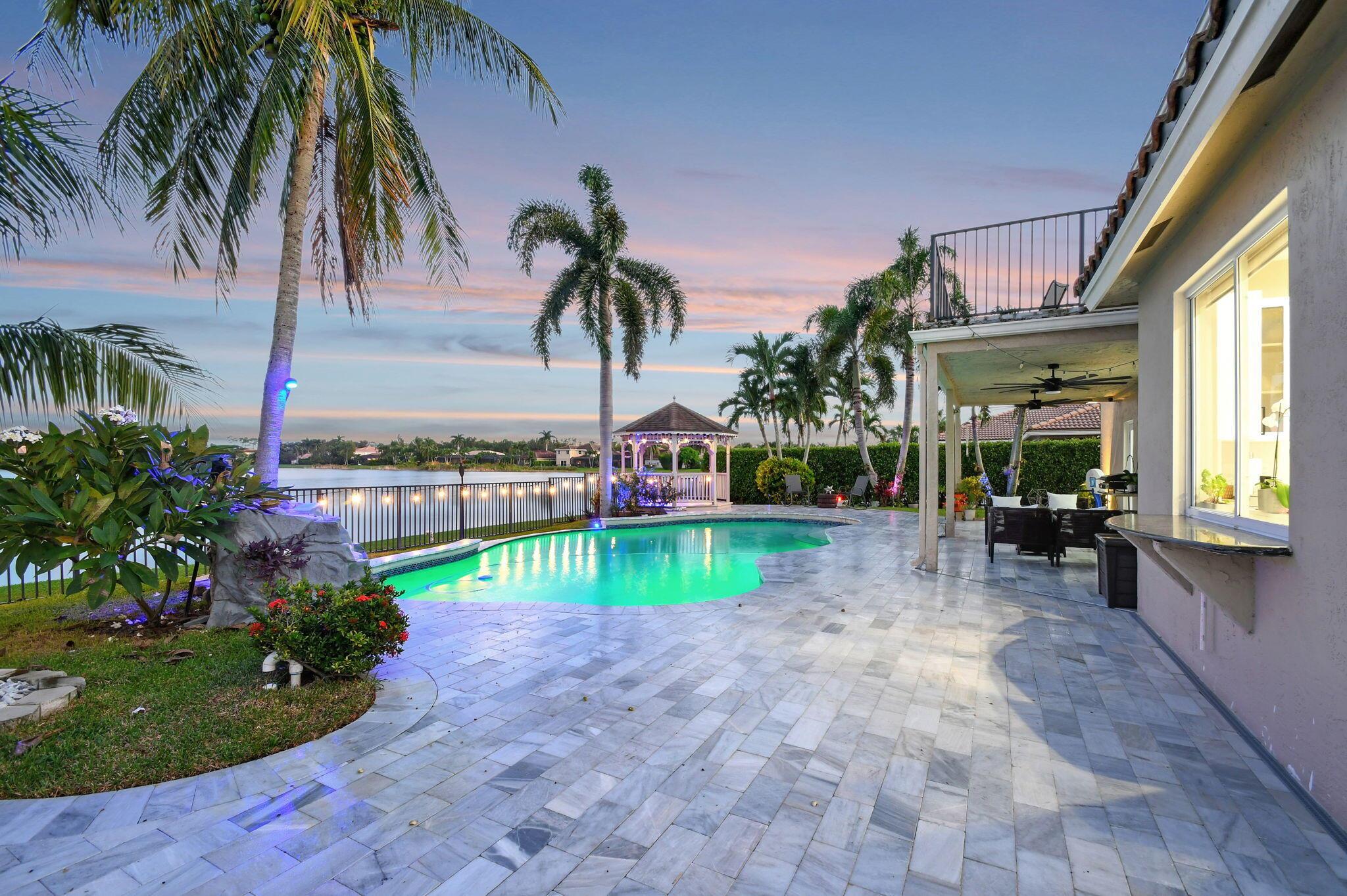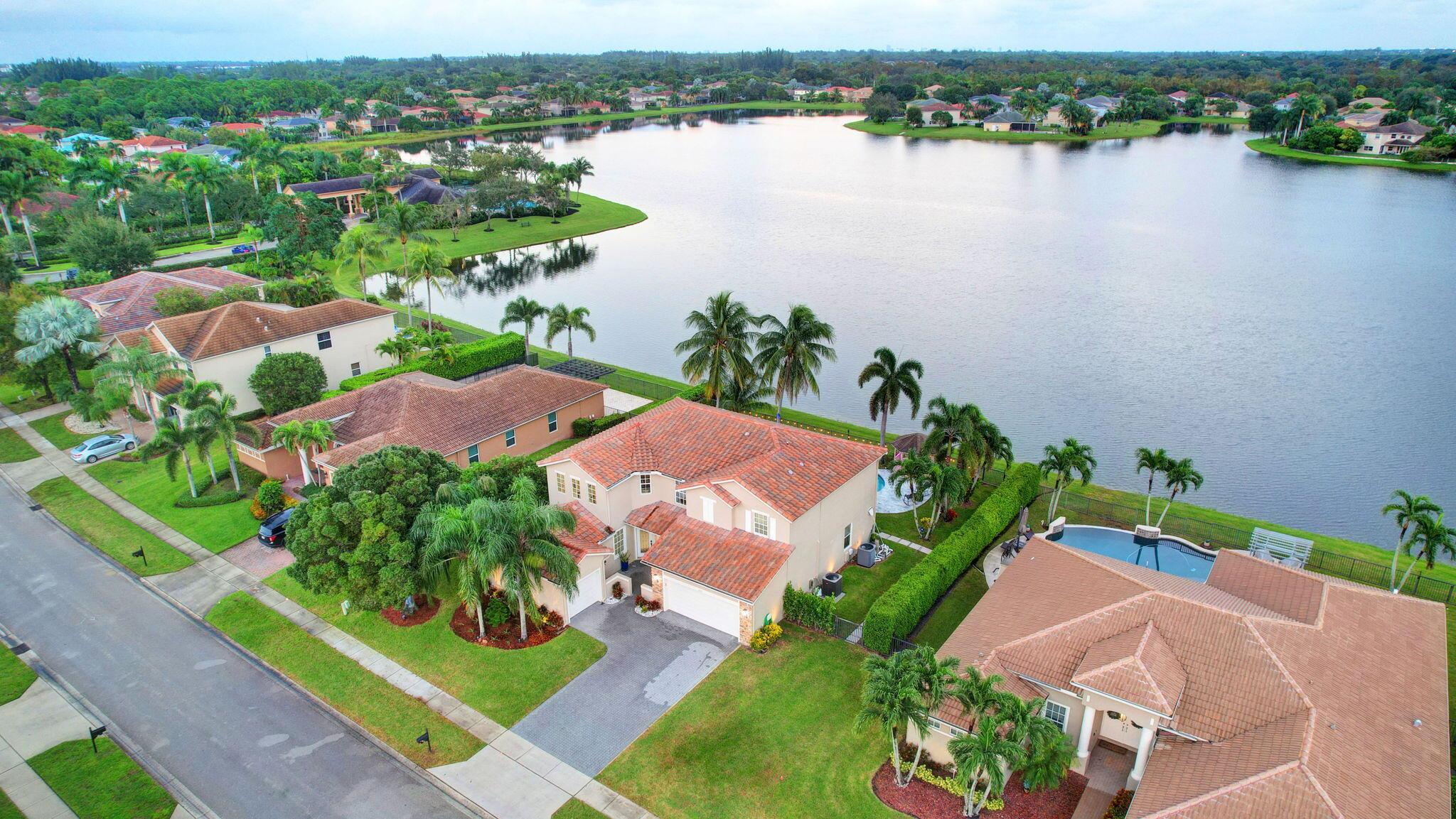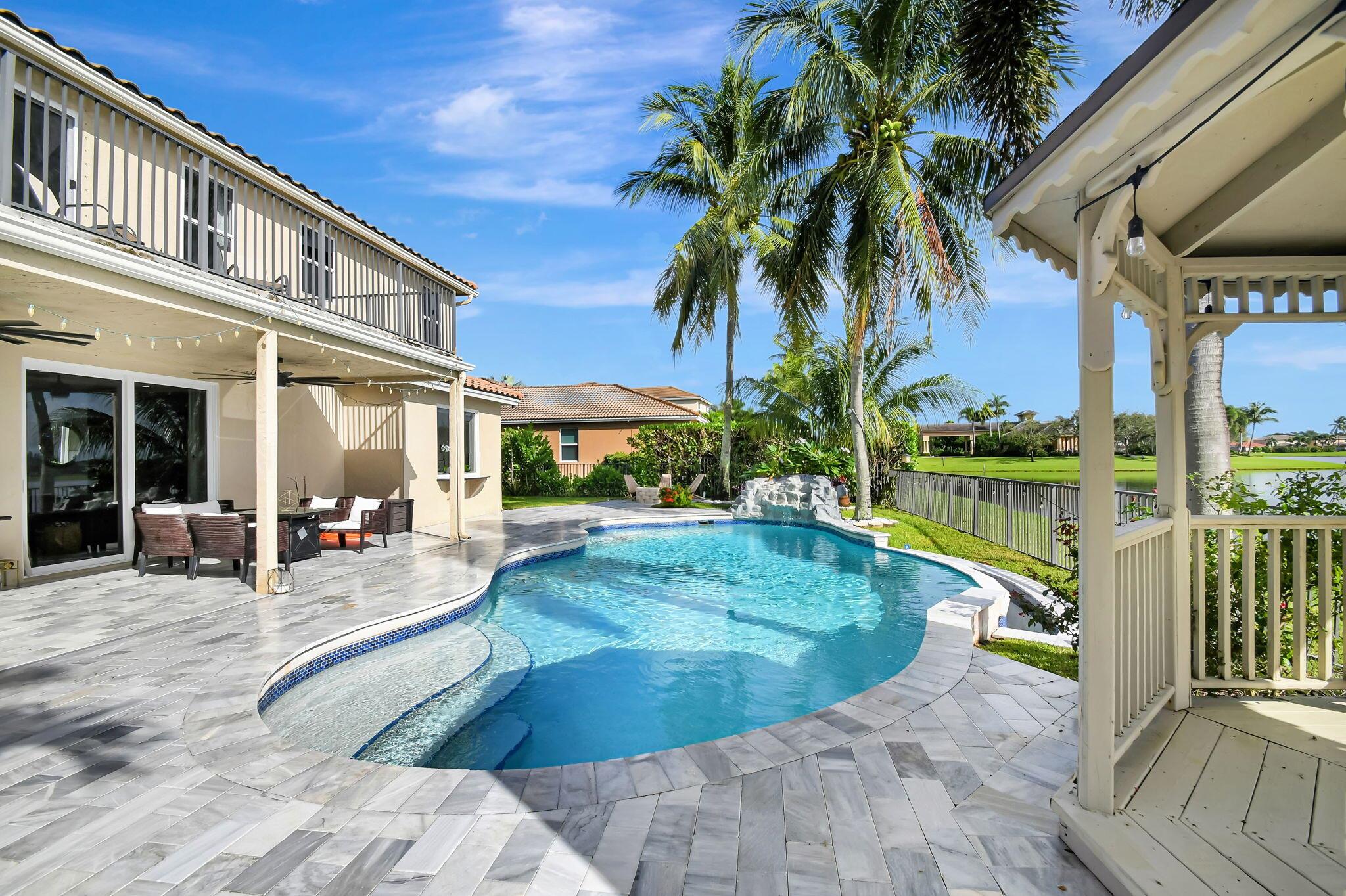 Fabulous renovated former model home (4/3/3)on an enormous lake with a heated pool and a fenced yard. Exceeding $300,000, the upgrades include marble porcelain floors throughout downstairs and wood look tile upstairs, full impact glass, 2 new a/c’s, 2 remodeled bathrooms, new pool tile, pool heater and stone waterfall. Also recently, the pool decking was transformed with marble and a firepit was added, the kitchen was totally renovated, and even the garage was resurfaced with an epoxy flake finish. The totally remodeled gourmet kitchen has new contemporary cabinets with pullouts, white quartz counter, grey marble eat-in counter, new Samsung stainless steel appliances, farmhouse sink overlooking the pool and lake, and a large walk-in pantry. A bedroom and a full cabana bath are on the