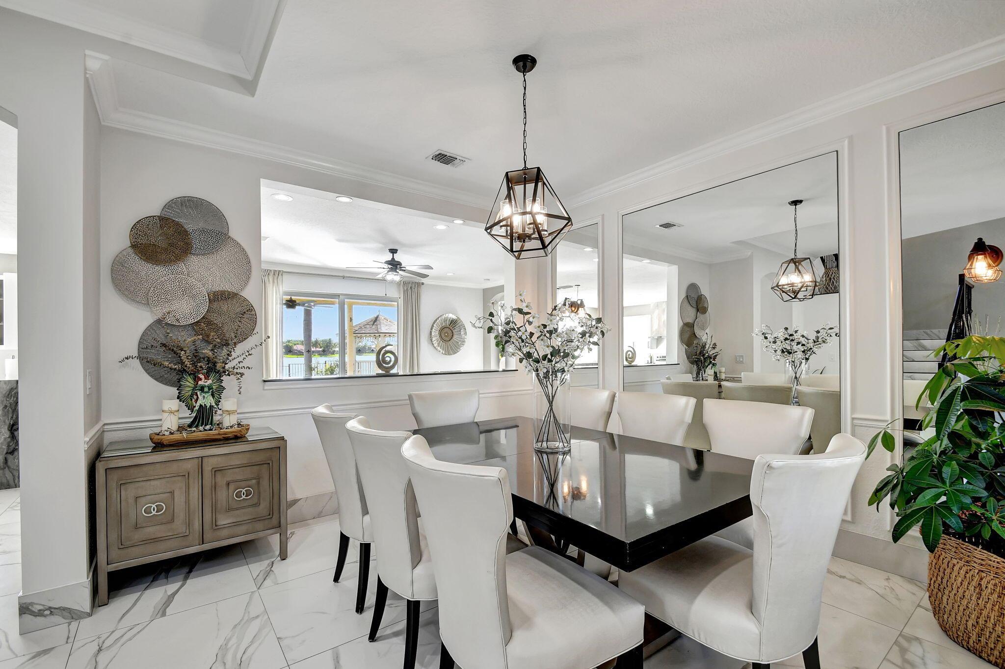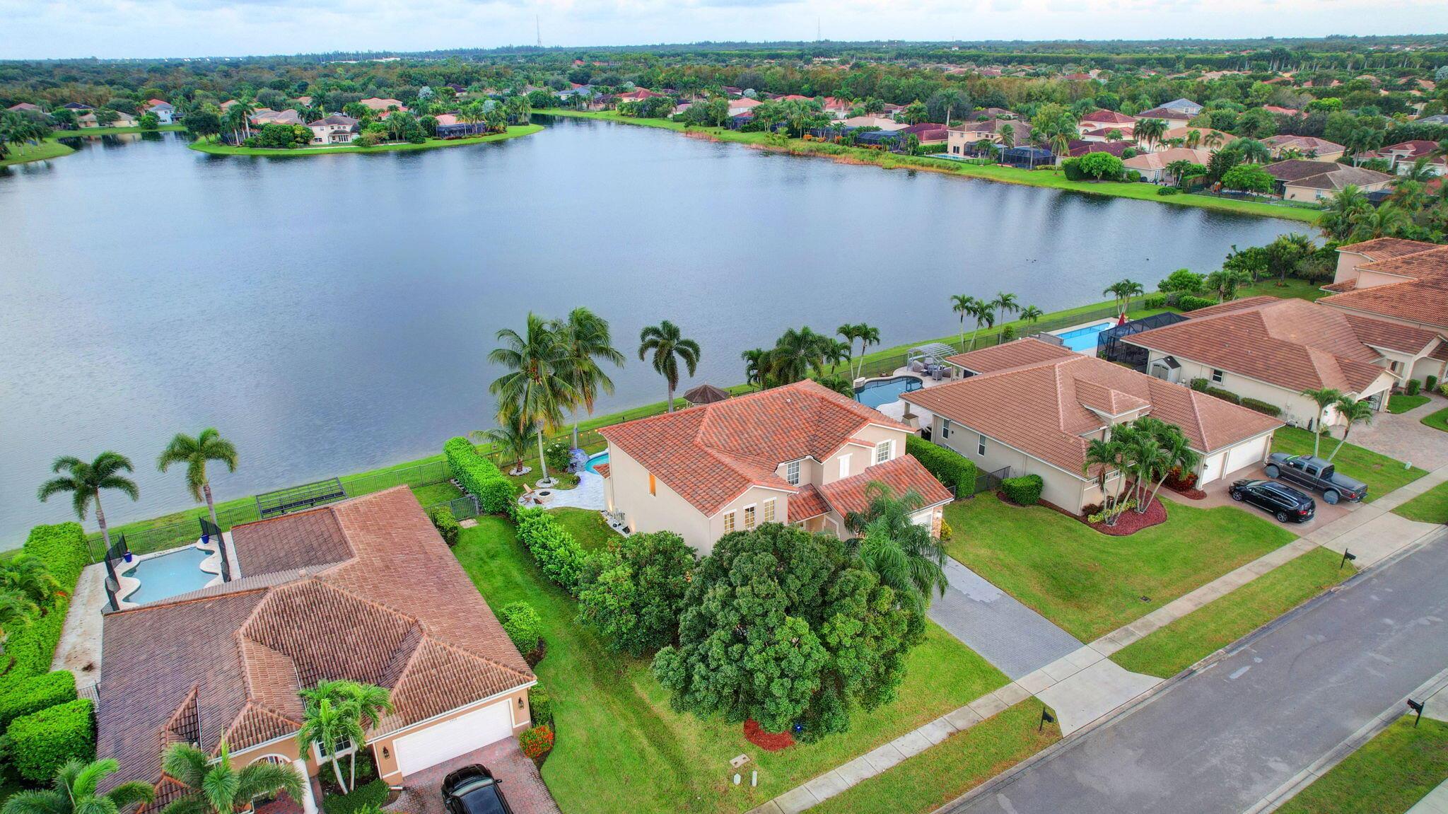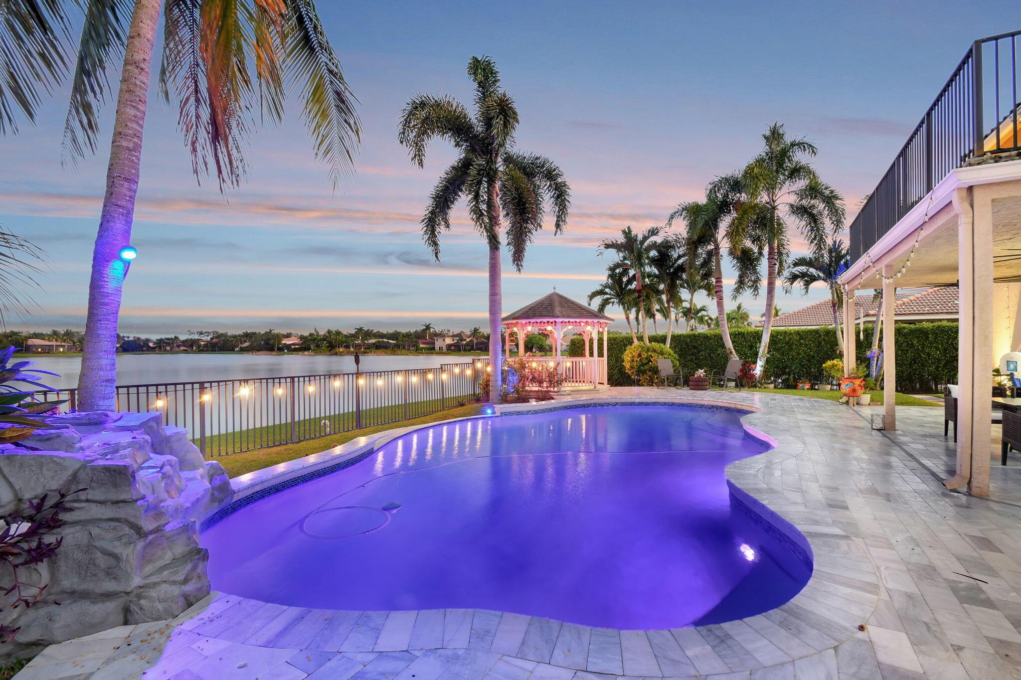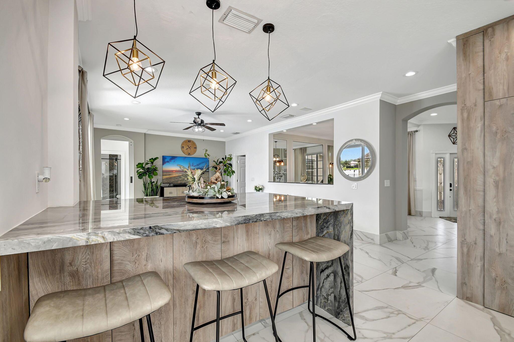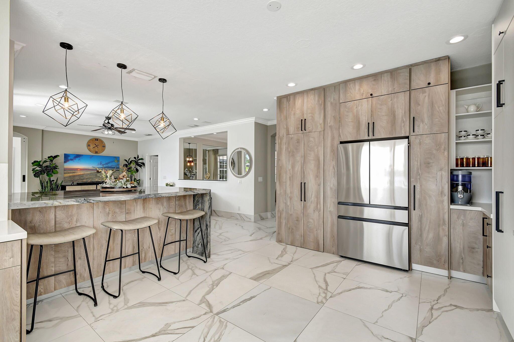 Fabulous renovated former model home (4/3/3)on an enormous lake with a heated pool and a fenced yard. Exceeding $300,000, the upgrades include marble porcelain floors throughout downstairs and wood look tile upstairs, full impact glass, 2 new a/c’s, 2 remodeled bathrooms, new pool tile, pool heater and stone waterfall. Also recently, the pool decking was transformed with marble and a firepit was added, the kitchen was totally renovated, and even the garage was resurfaced with an epoxy flake finish. The totally remodeled gourmet kitchen has new contemporary cabinets with pullouts, white quartz counter, grey marble eat-in counter, new Samsung stainless steel appliances, farmhouse sink overlooking the pool and lake, and a large walk-in pantry. A bedroom and a full cabana bath are on the