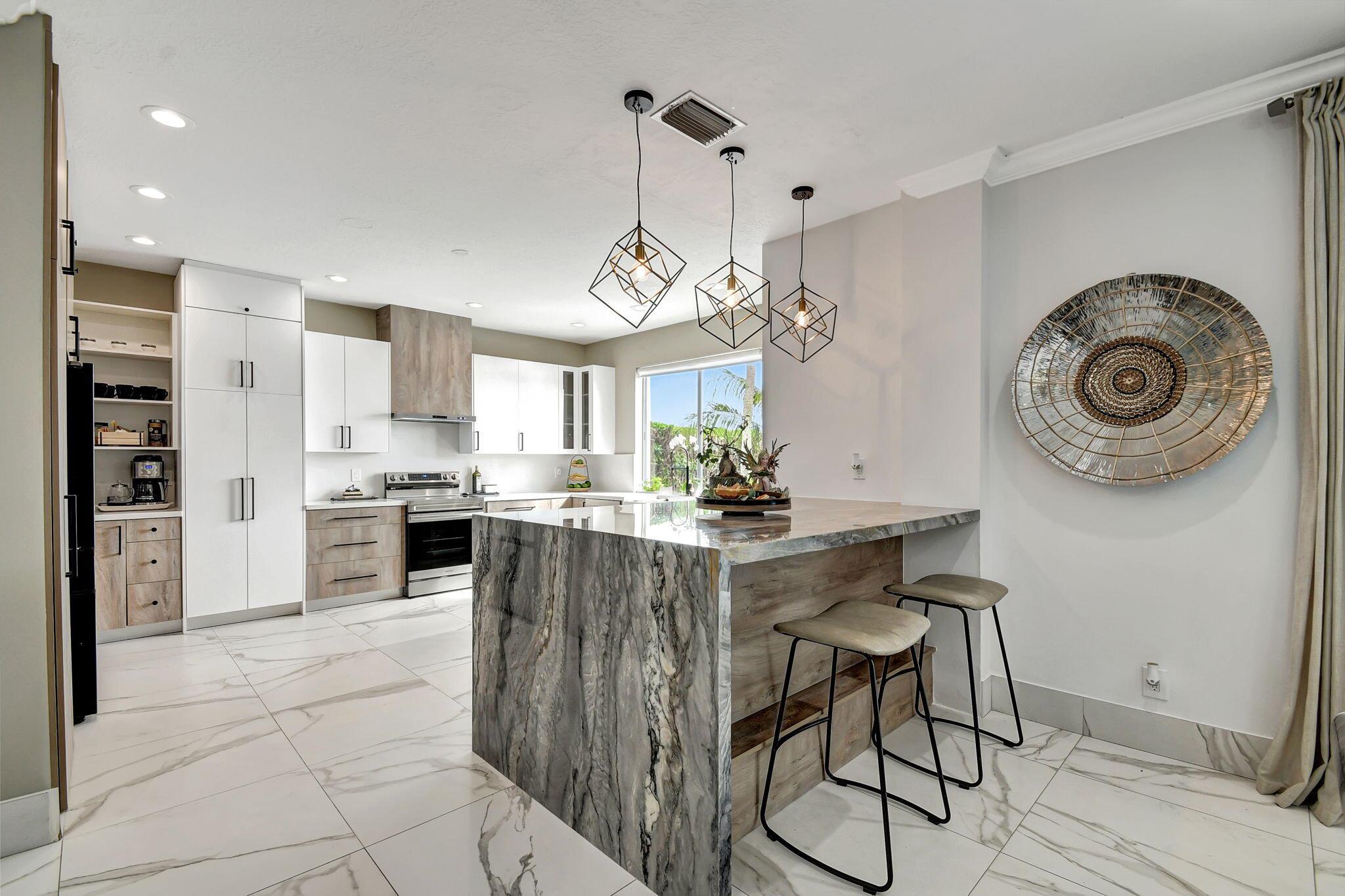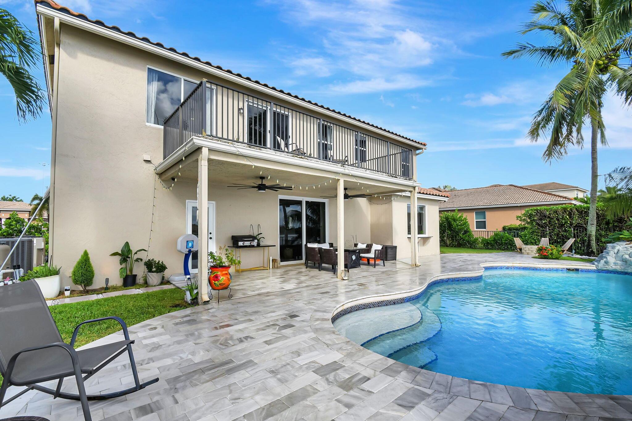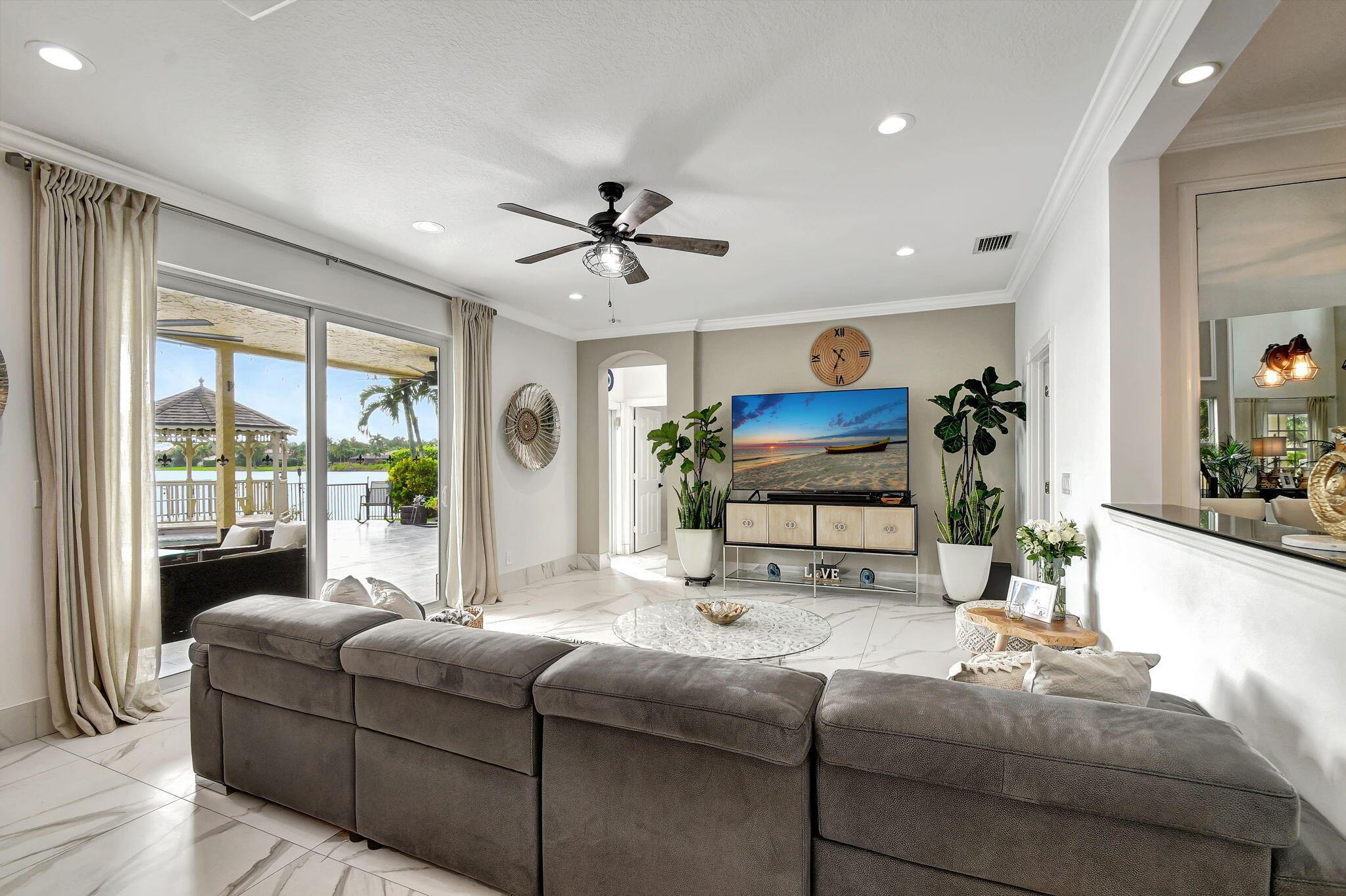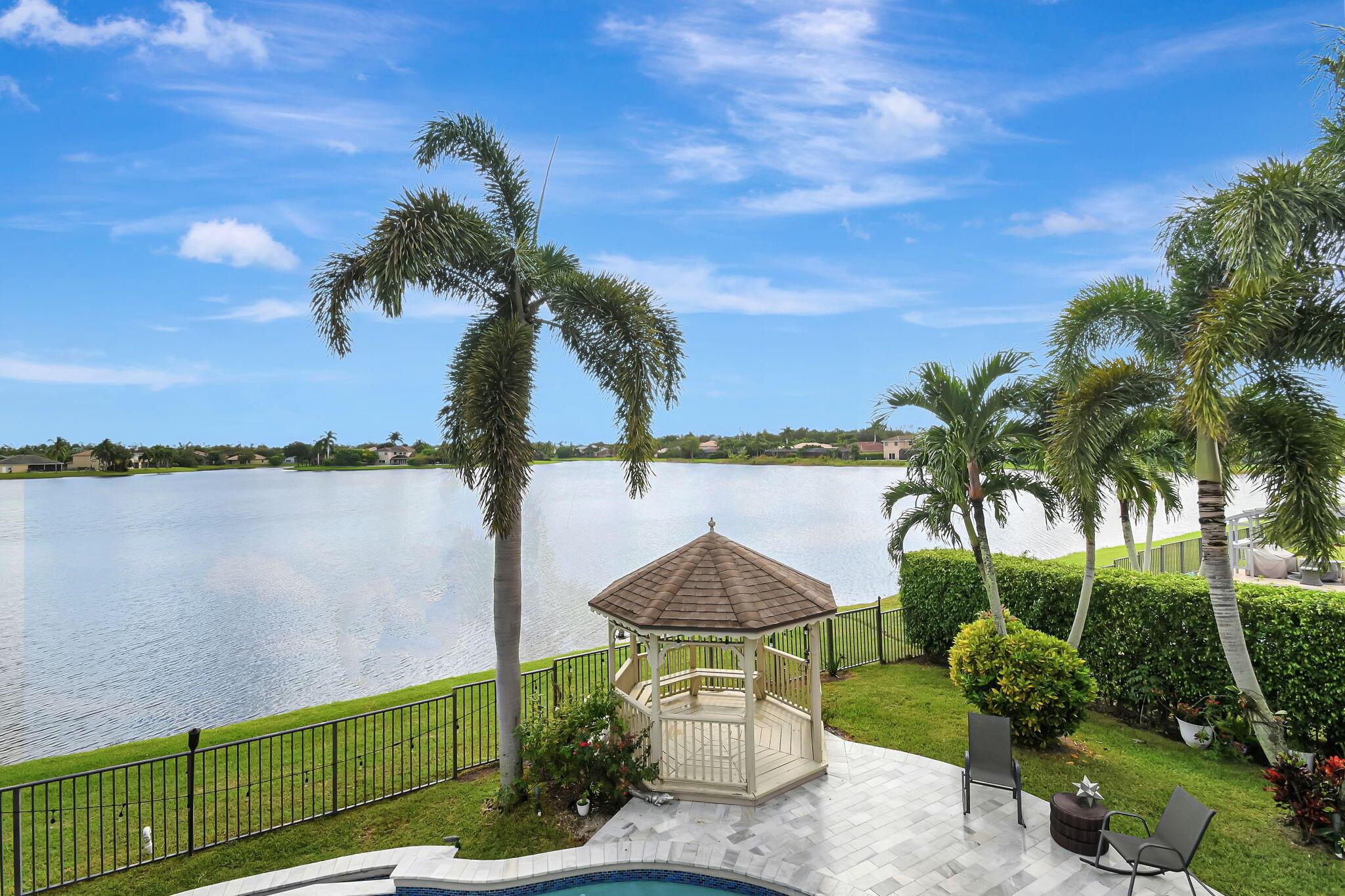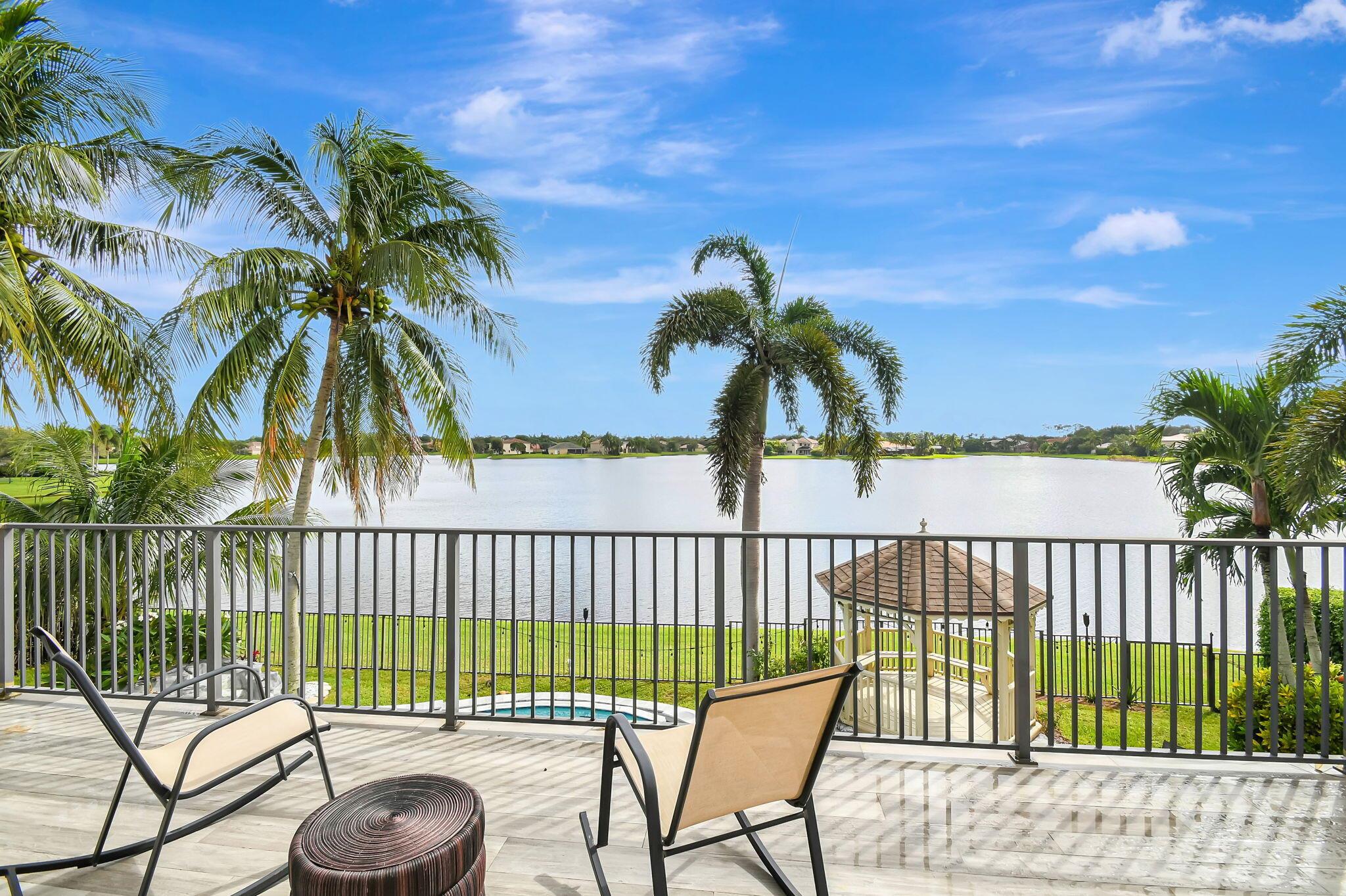Fabulous renovated former model home (4/3/3)on an enormous lake with a heated pool and a fenced yard. Exceeding $300,000, the upgrades include marble porcelain floors throughout downstairs and wood look tile upstairs, full impact glass, 2 new a/c’s, 2 remodeled bathrooms, new pool tile, pool heater and stone waterfall. Also recently, the pool decking was transformed with marble and a firepit was added, the kitchen was totally renovated, and even the garage was resurfaced with an epoxy flake finish. The totally remodeled gourmet kitchen has new contemporary cabinets with pullouts, white quartz counter, grey marble eat-in counter, new Samsung stainless steel appliances, farmhouse sink overlooking the pool and lake, and a large walk-in pantry. A bedroom and a full cabana bath are on the