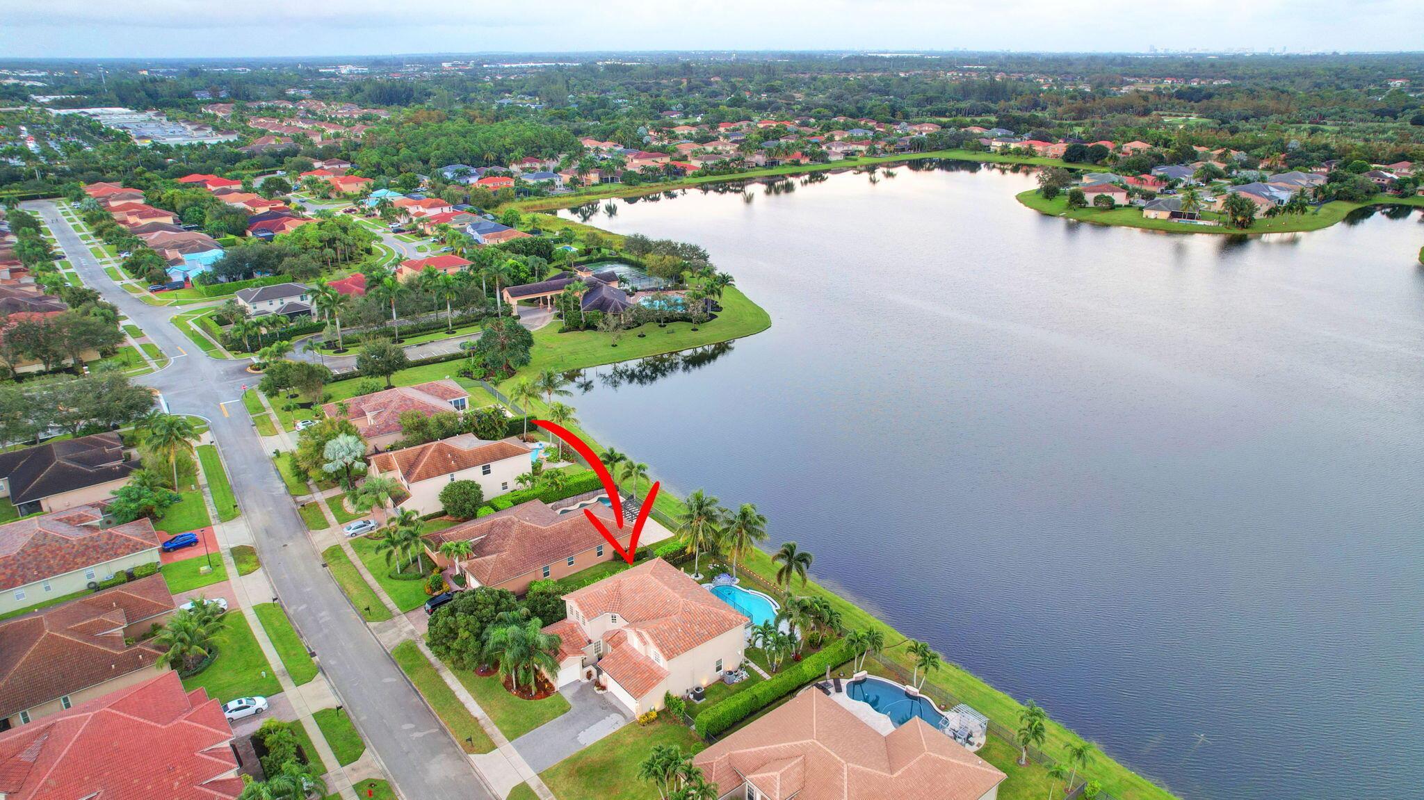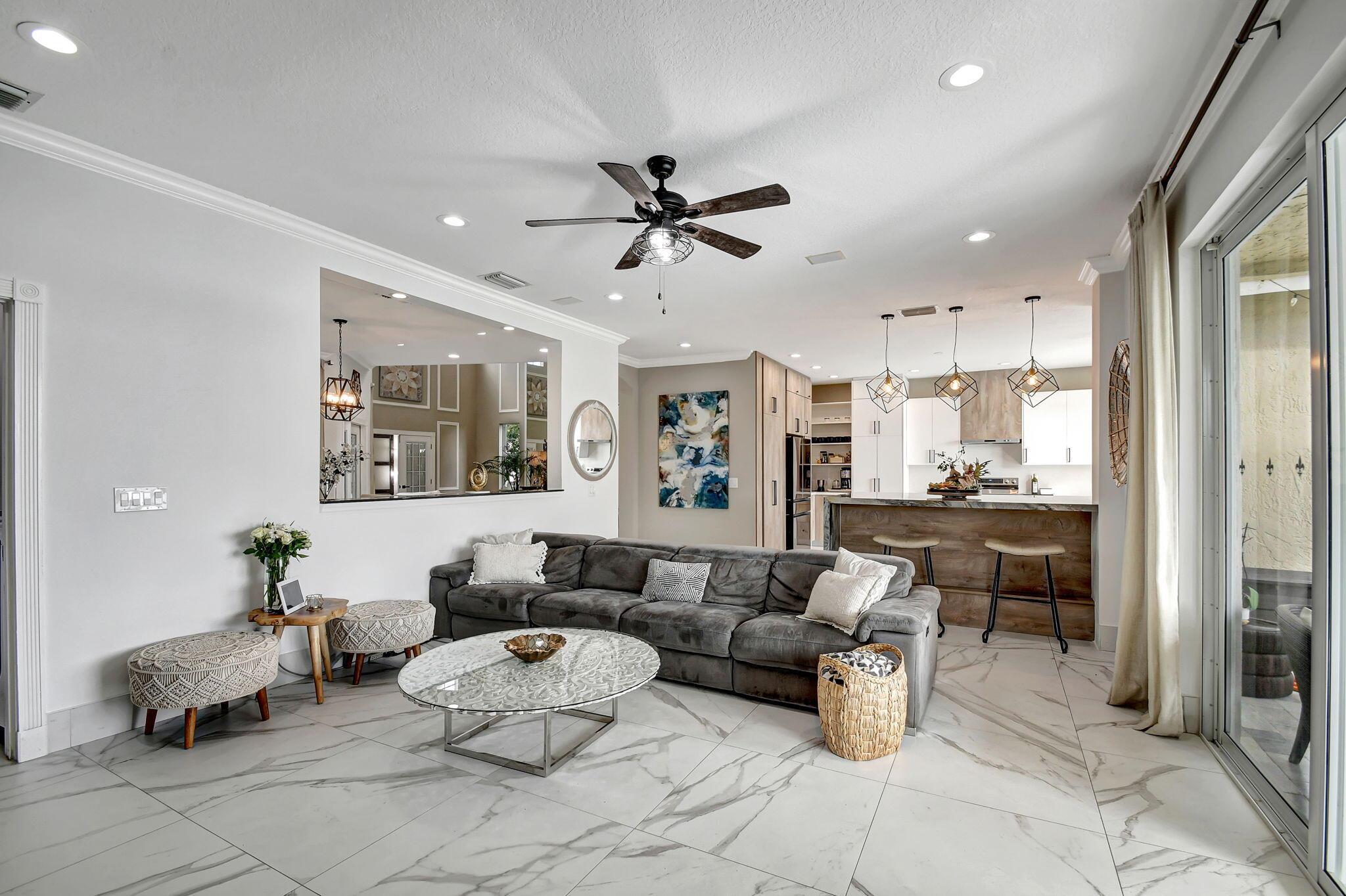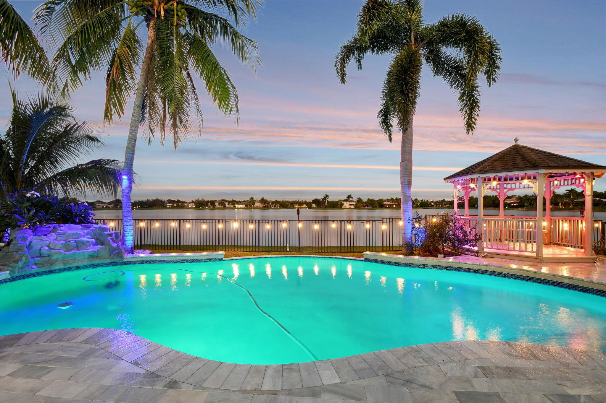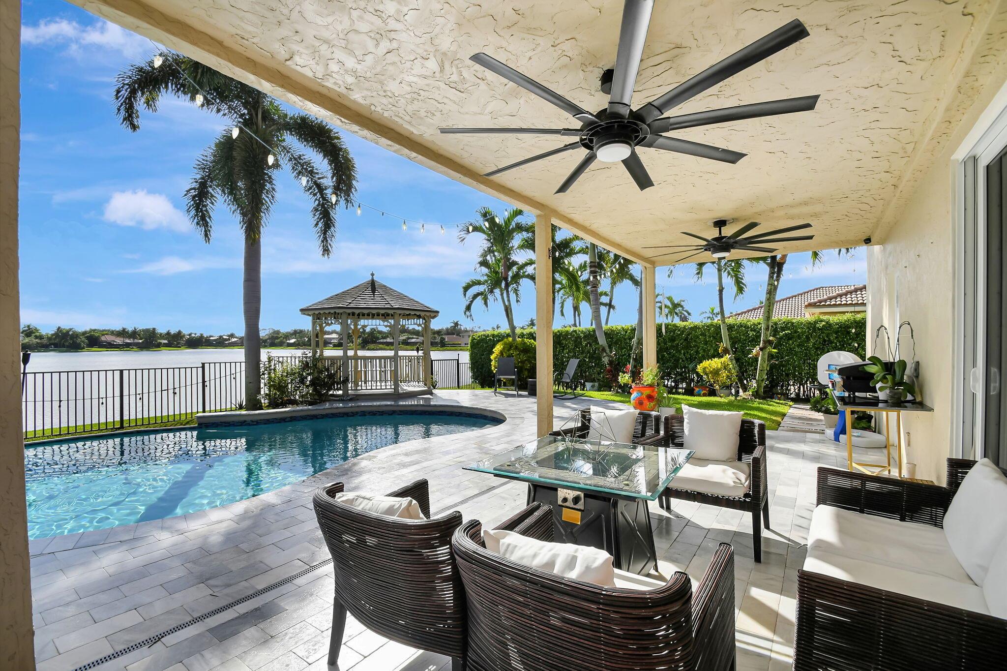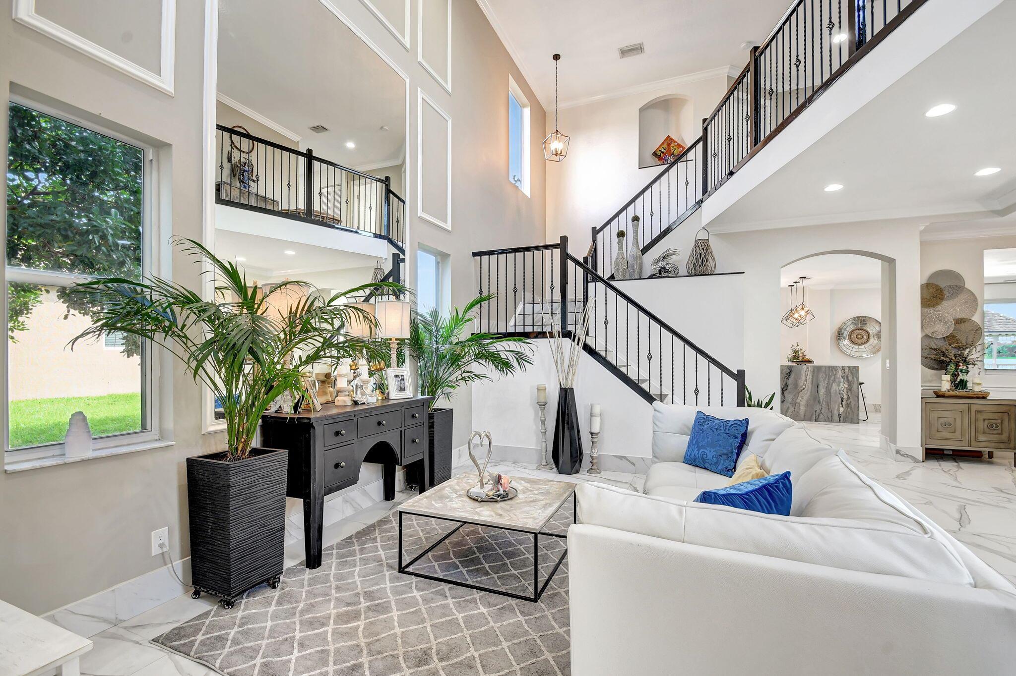 Fabulous renovated former model home (4/3/3)on an enormous lake with a heated pool and a fenced yard. Exceeding $300,000, the upgrades include marble porcelain floors throughout downstairs and wood look tile upstairs, full impact glass, 2 new a/c’s, 2 remodeled bathrooms, new pool tile, pool heater and stone waterfall. Also recently, the pool decking was transformed with marble and a firepit was added, the kitchen was totally renovated, and even the garage was resurfaced with an epoxy flake finish. The totally remodeled gourmet kitchen has new contemporary cabinets with pullouts, white quartz counter, grey marble eat-in counter, new Samsung stainless steel appliances, farmhouse sink overlooking the pool and lake, and a large walk-in pantry. A bedroom and a full cabana bath are on the