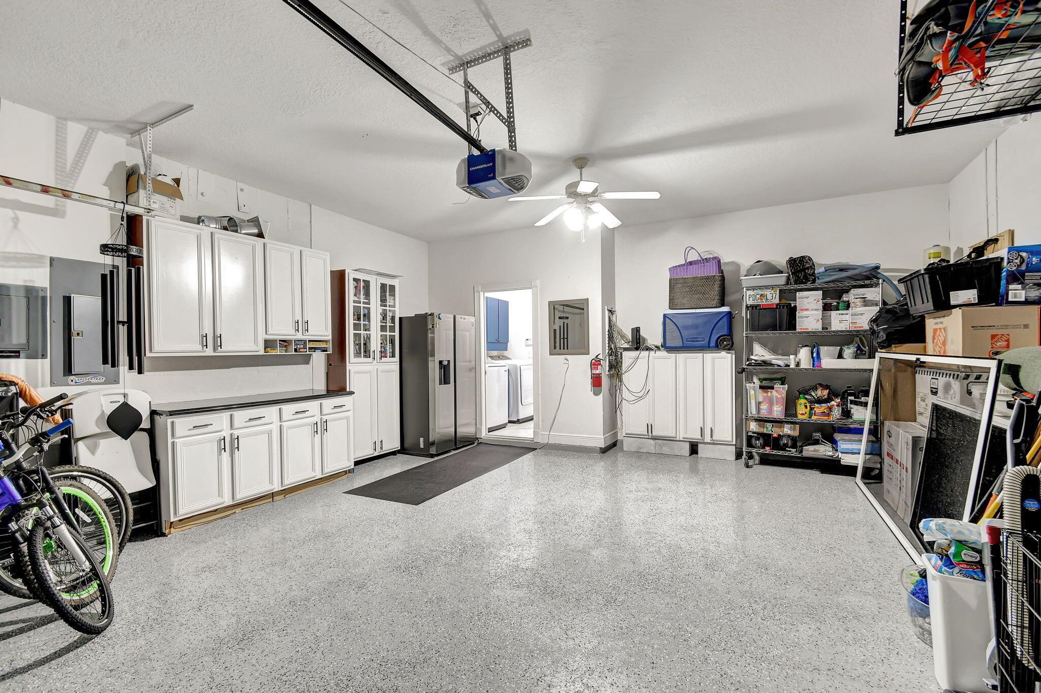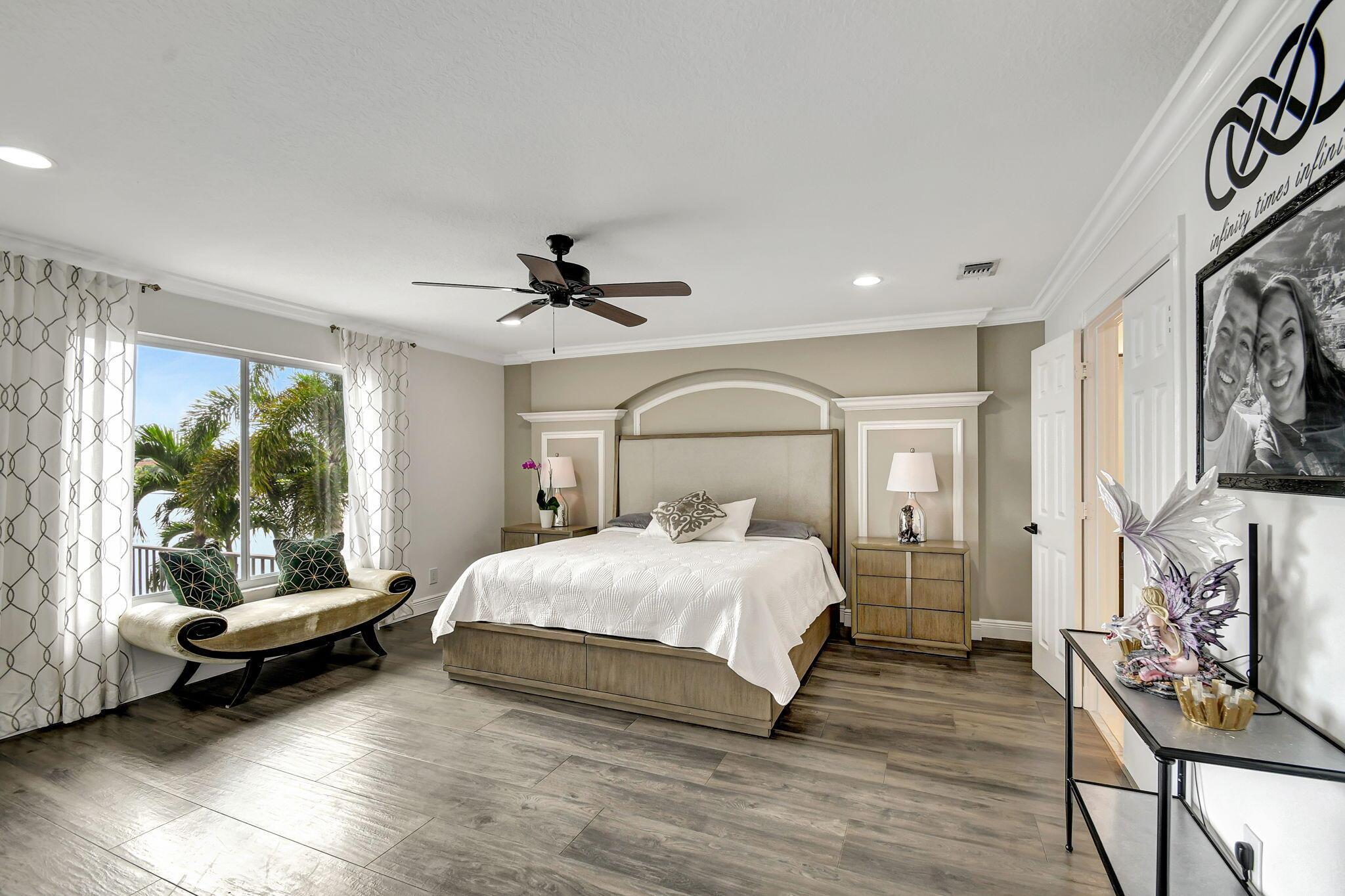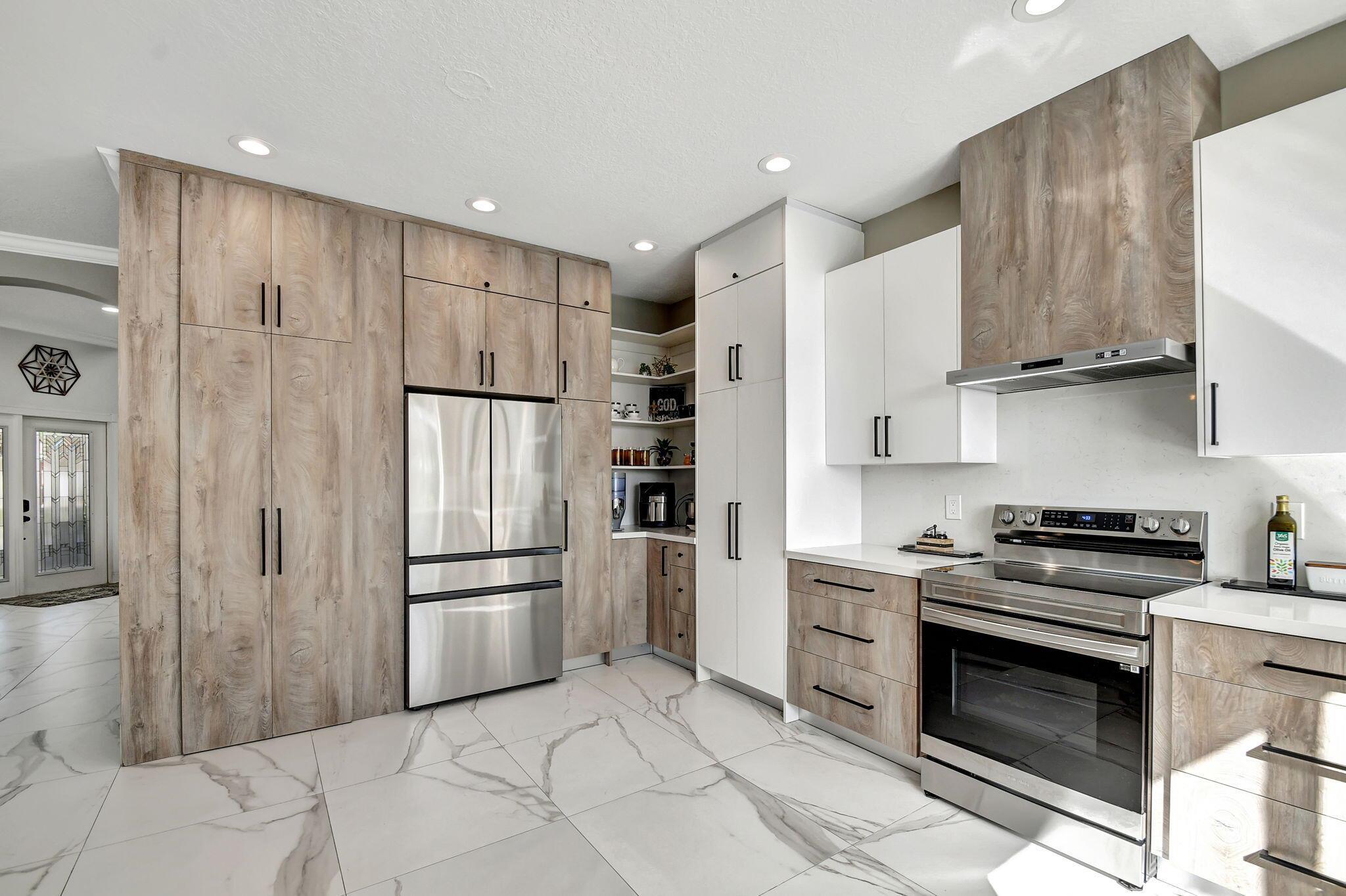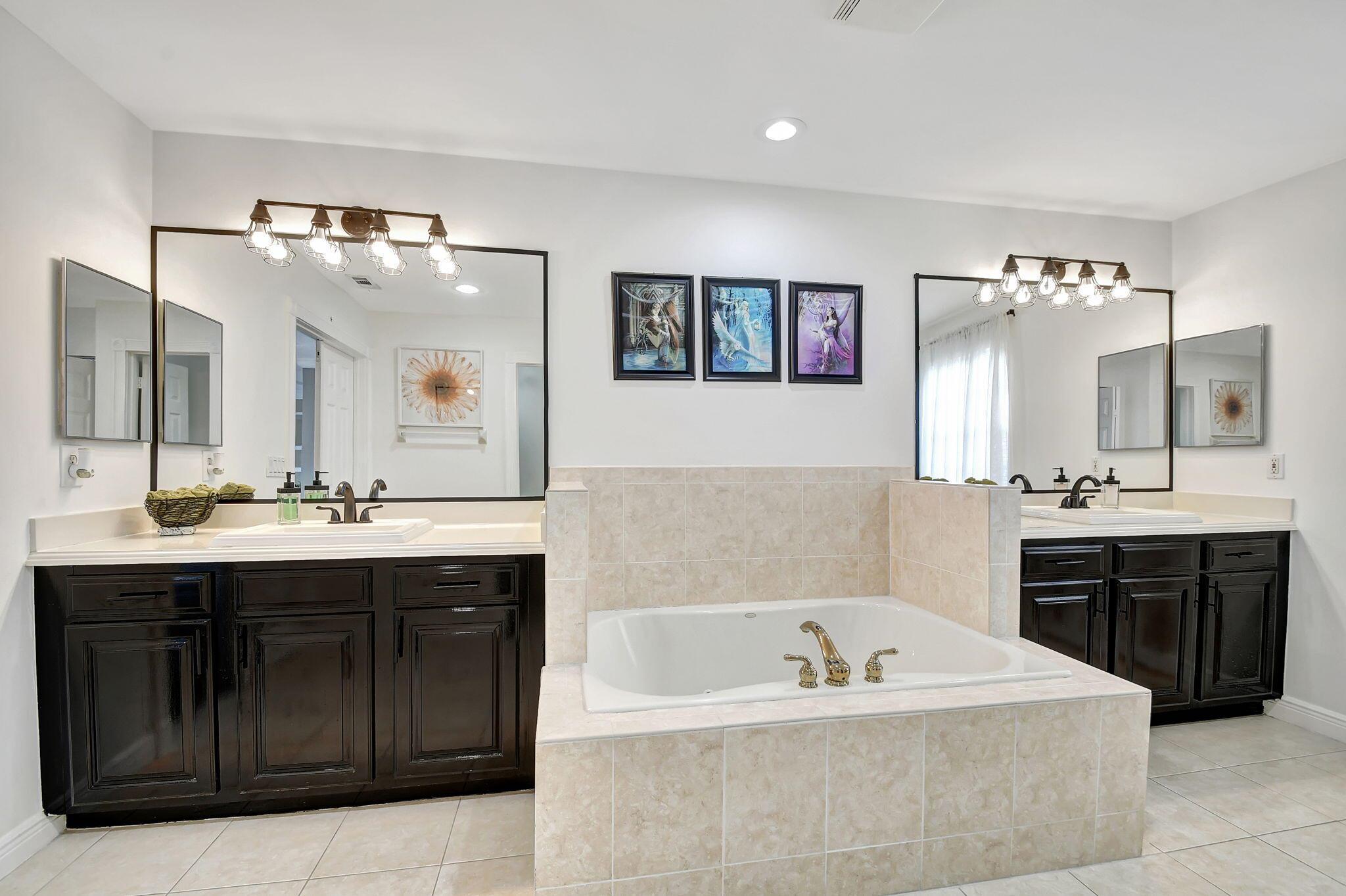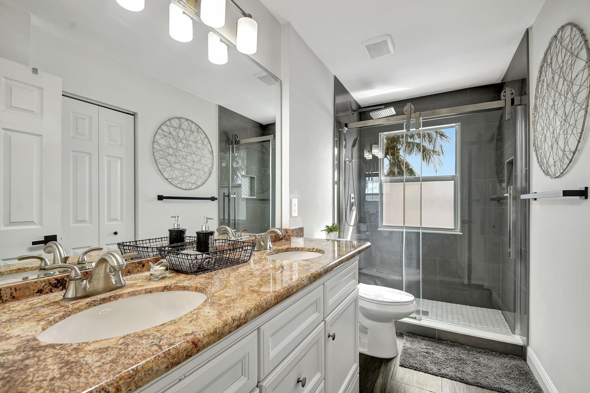 Fabulous renovated former model home (4/3/3)on an enormous lake with a heated pool and a fenced yard. Exceeding $300,000, the upgrades include marble porcelain floors throughout downstairs and wood look tile upstairs, full impact glass, 2 new a/c’s, 2 remodeled bathrooms, new pool tile, pool heater and stone waterfall. Also recently, the pool decking was transformed with marble and a firepit was added, the kitchen was totally renovated, and even the garage was resurfaced with an epoxy flake finish. The totally remodeled gourmet kitchen has new contemporary cabinets with pullouts, white quartz counter, grey marble eat-in counter, new Samsung stainless steel appliances, farmhouse sink overlooking the pool and lake, and a large walk-in pantry. A bedroom and a full cabana bath are on the