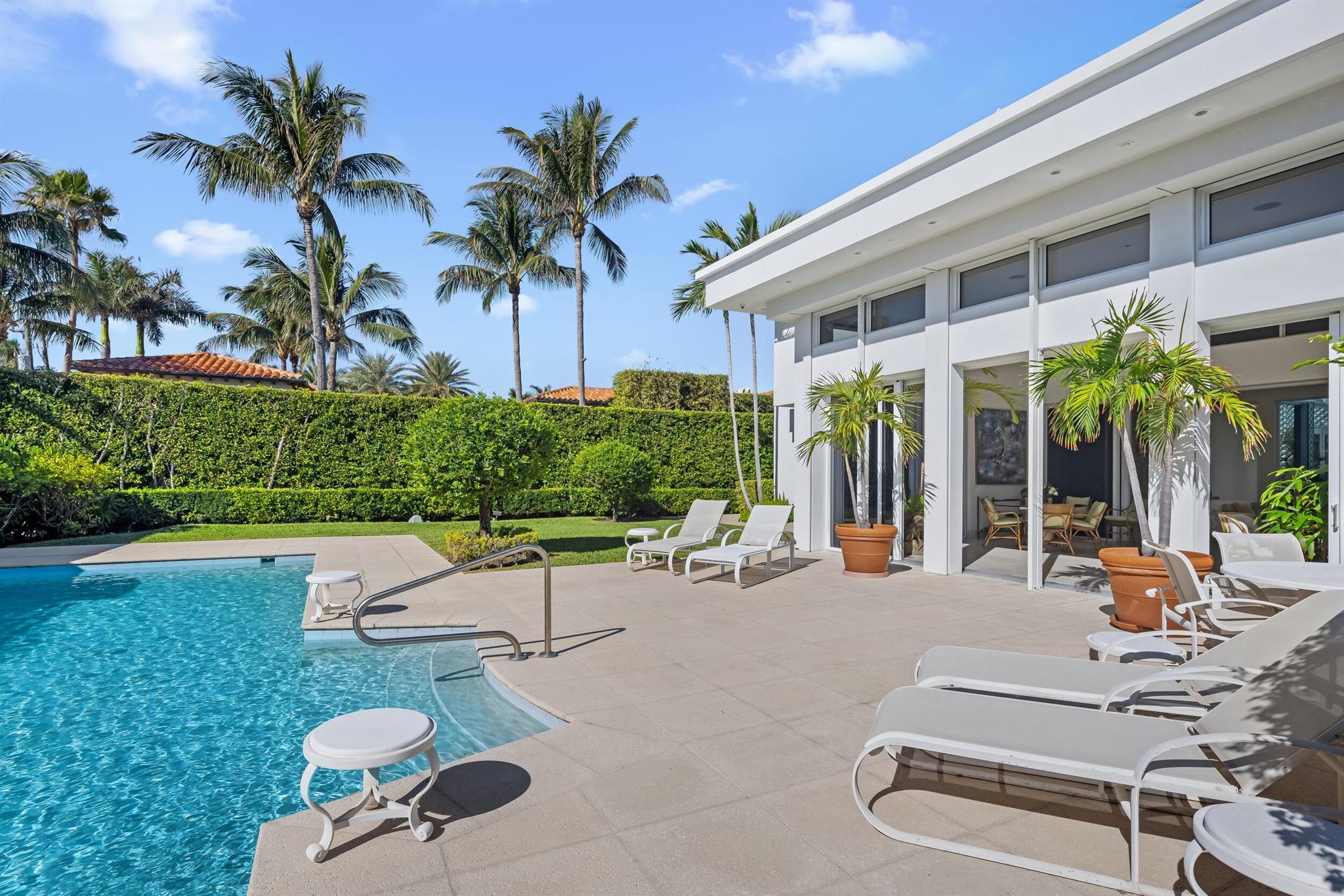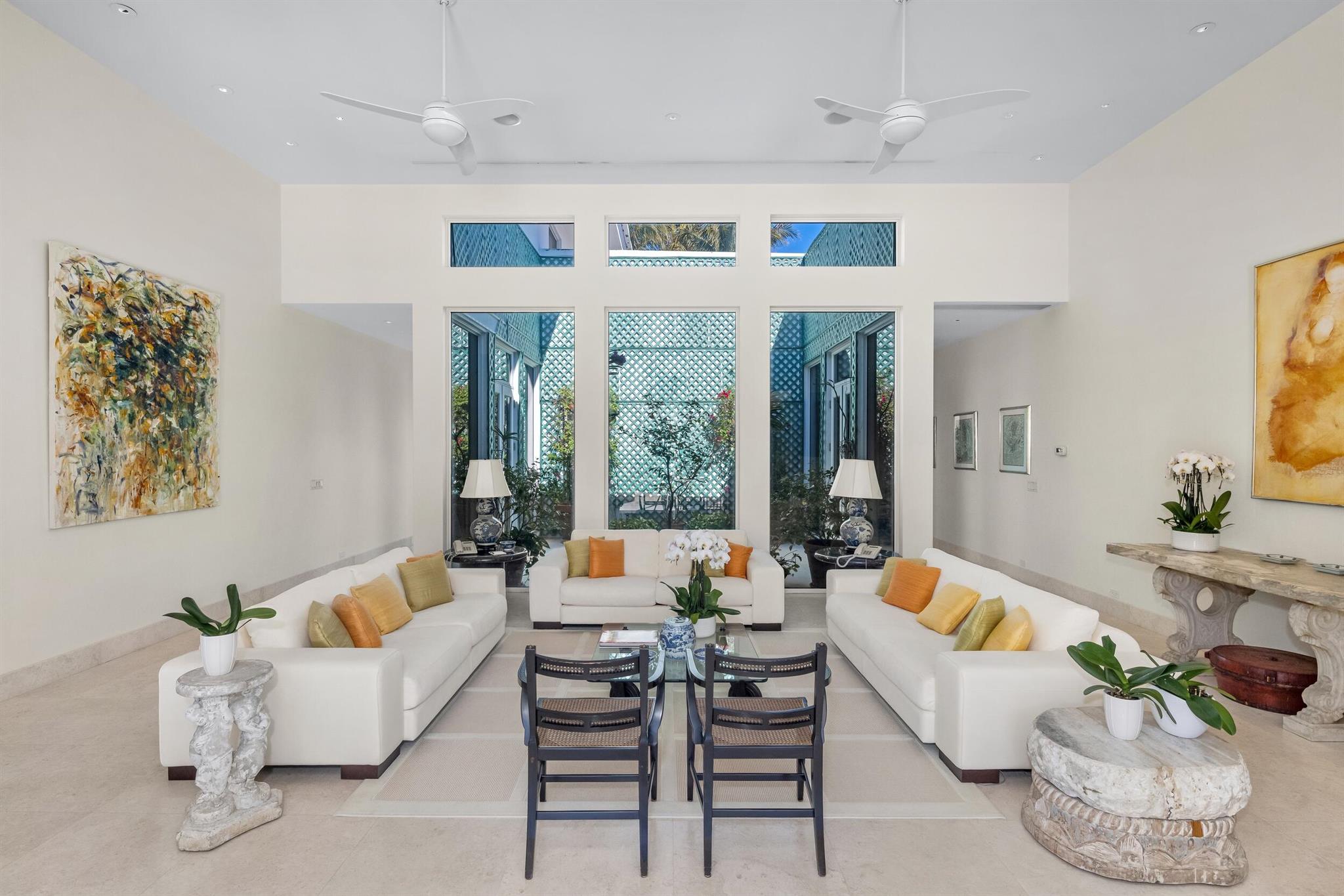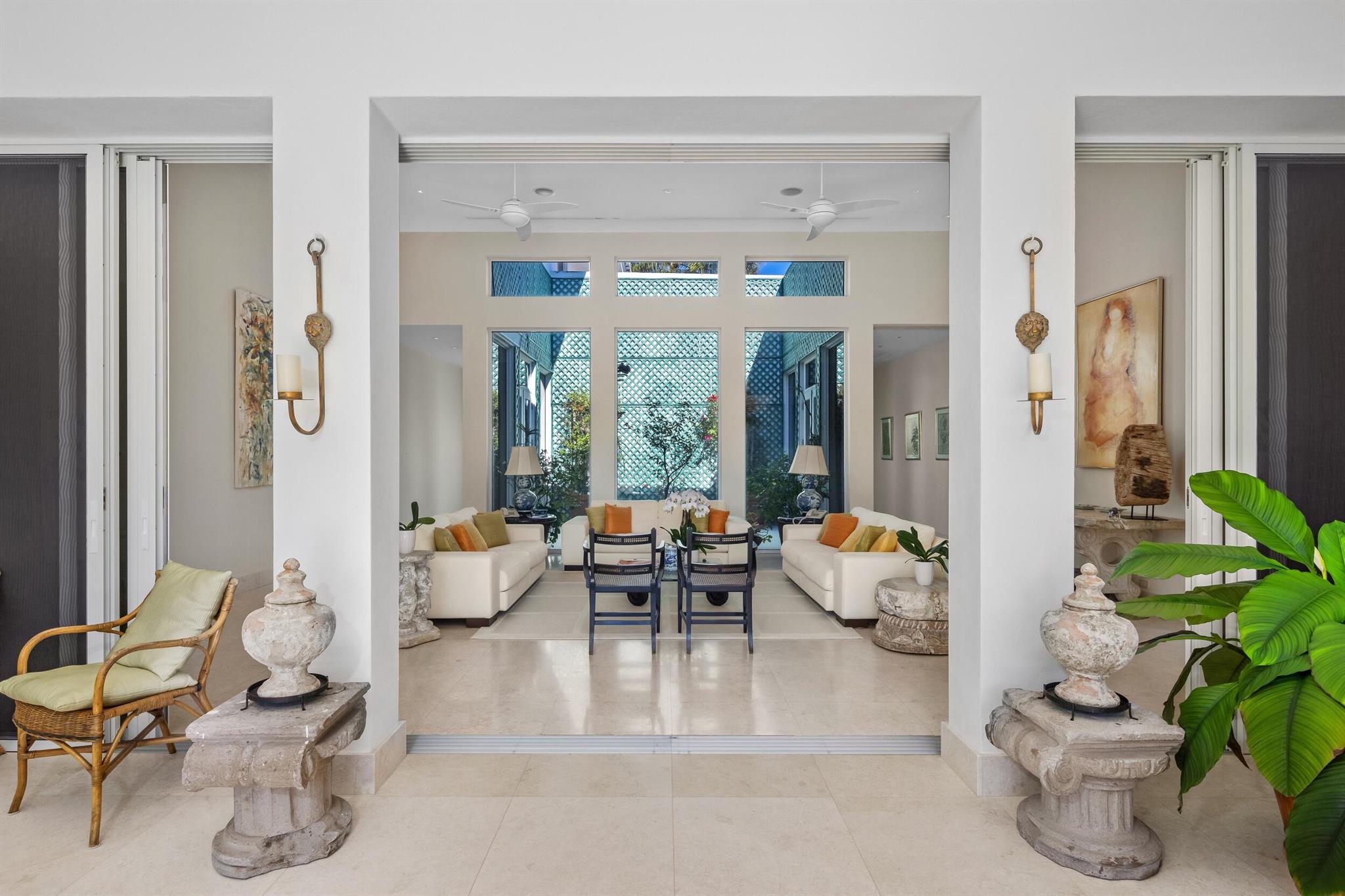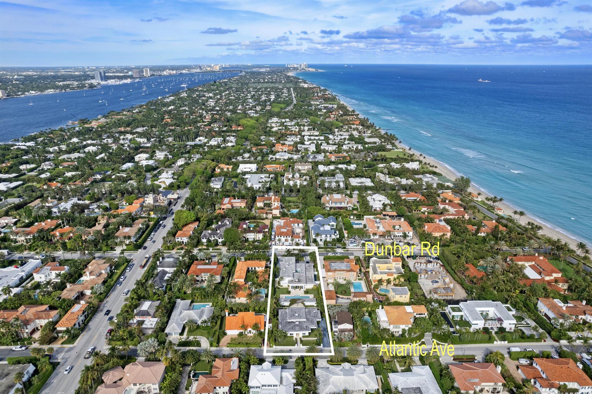 This rare midtown compound at 150 Dunbar Rd. and 151 Atlantic Ave. offers an exceptional opportunity in Palm Beach. Designed by the renowned architect Gene Lawrence, this expansive property spans a 29,600+ SF lot stretching from Dunbar Rd. to Atlantic Ave. With over 11,200 SF of combined living space, the compound includes two fully independent residences, offering 9 total bedrooms, multiple living areas and work spaces, and unmatched privacy and versatility.The primary two-story residence, encompassing 5,732 SF under air, features 5 bedrooms with en suite bathrooms, including a ground-floor primary suite with an office and an upstairs apartment with a lounge and kitchenette. Additional highlights include multiple living spaces, a formal dining room, a well-appointed kitchen