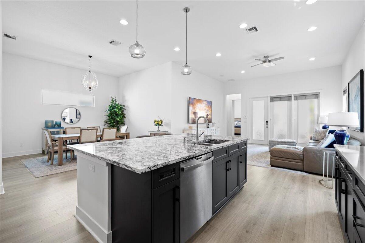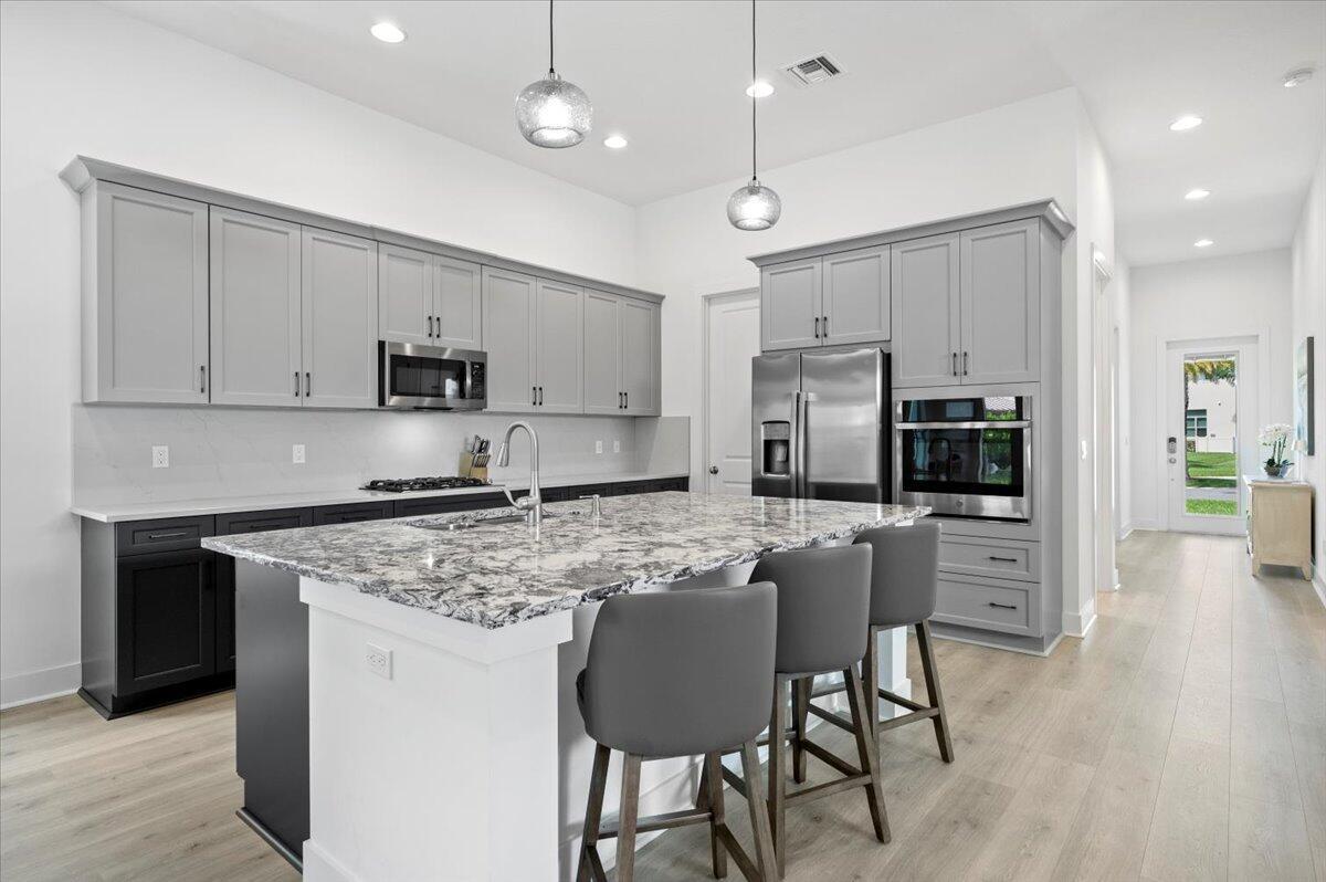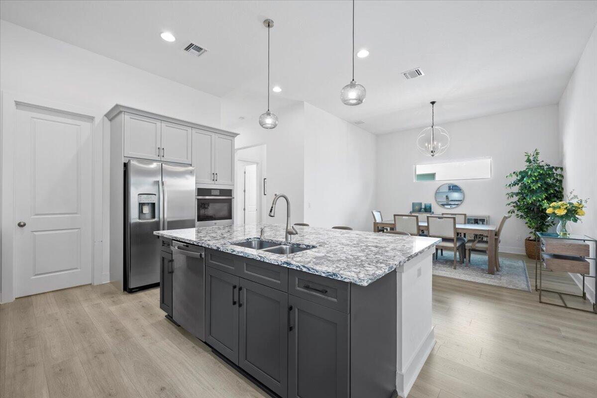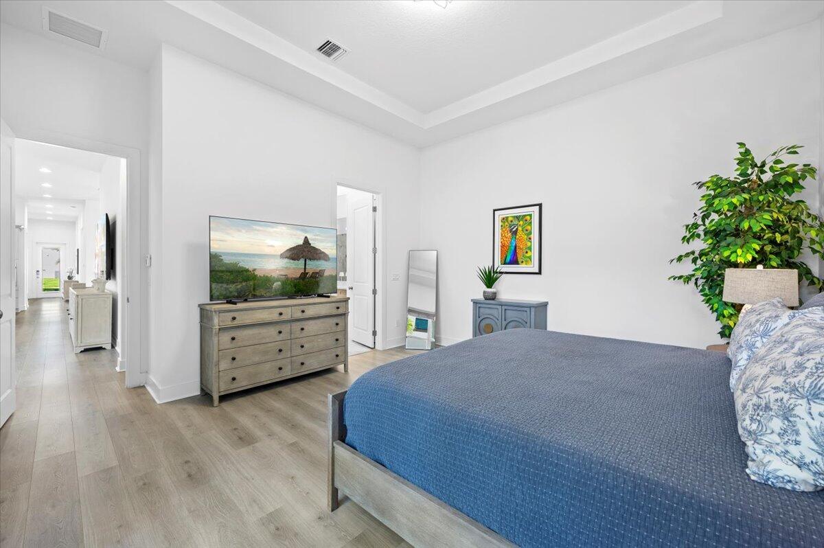 One level living in Alton with this upgraded Island Style home featuring 12 foot ceilings on an oversized premium homesite with double the typical spacing between the neighboring home. Grey Revwood floors throughout with upgraded porcelain tile to the ceiling in the bathrooms. Grey and navy cabinets and the oversized kitchen island are open to the formal dining and living spaces. 2 car garage with an oversized area for storage or a golf cart. The turfed and fenced yard showcase the outdoor space and greatly improves the enjoyment of outdoor relaxing and entertaining. The combination of the rarity of one level homes and the rarity of oversized lots in Alton set this home apart.
