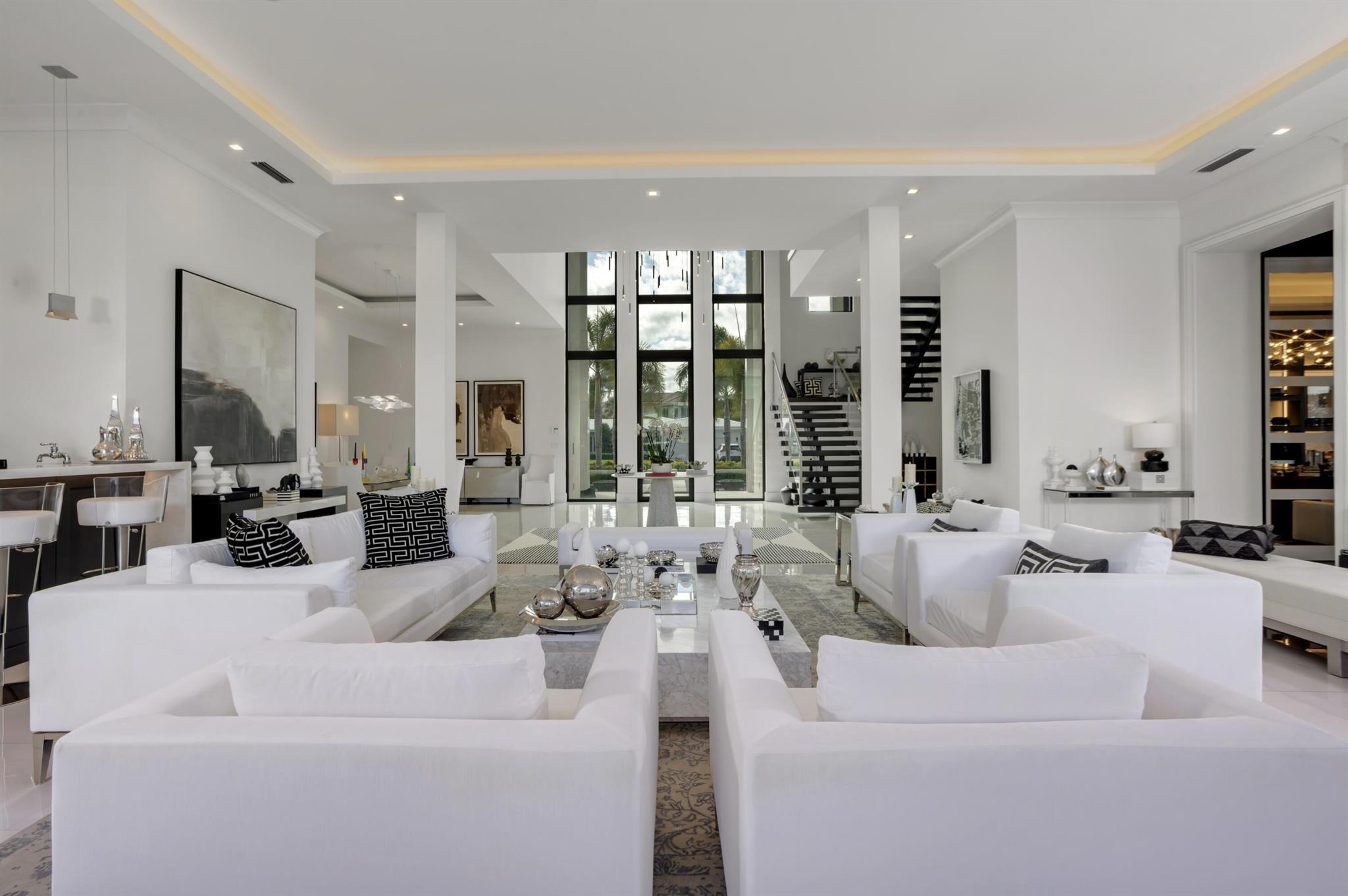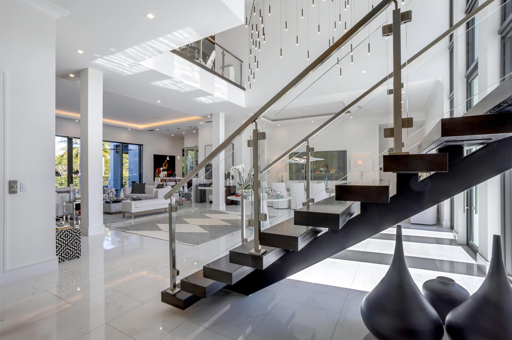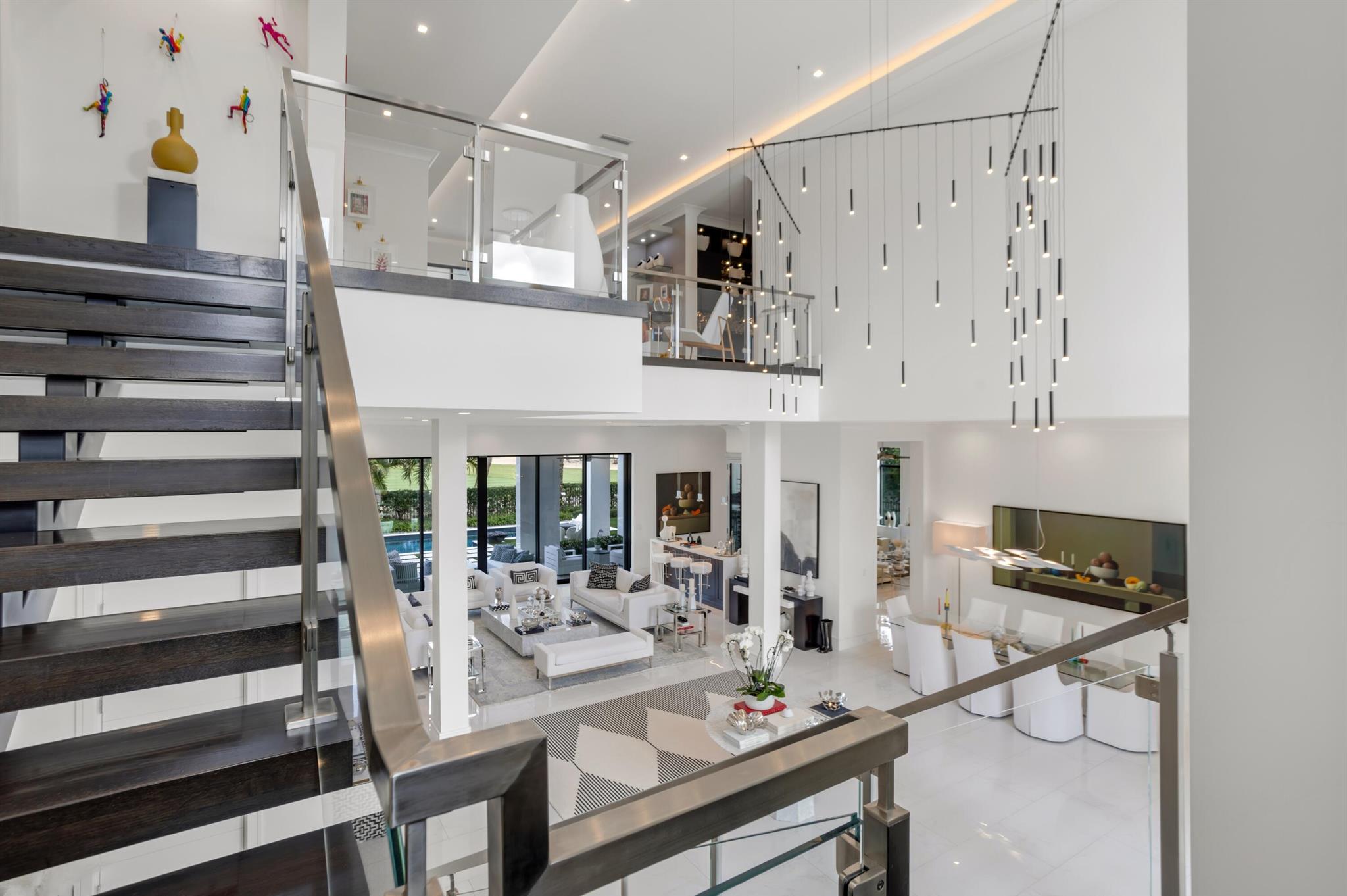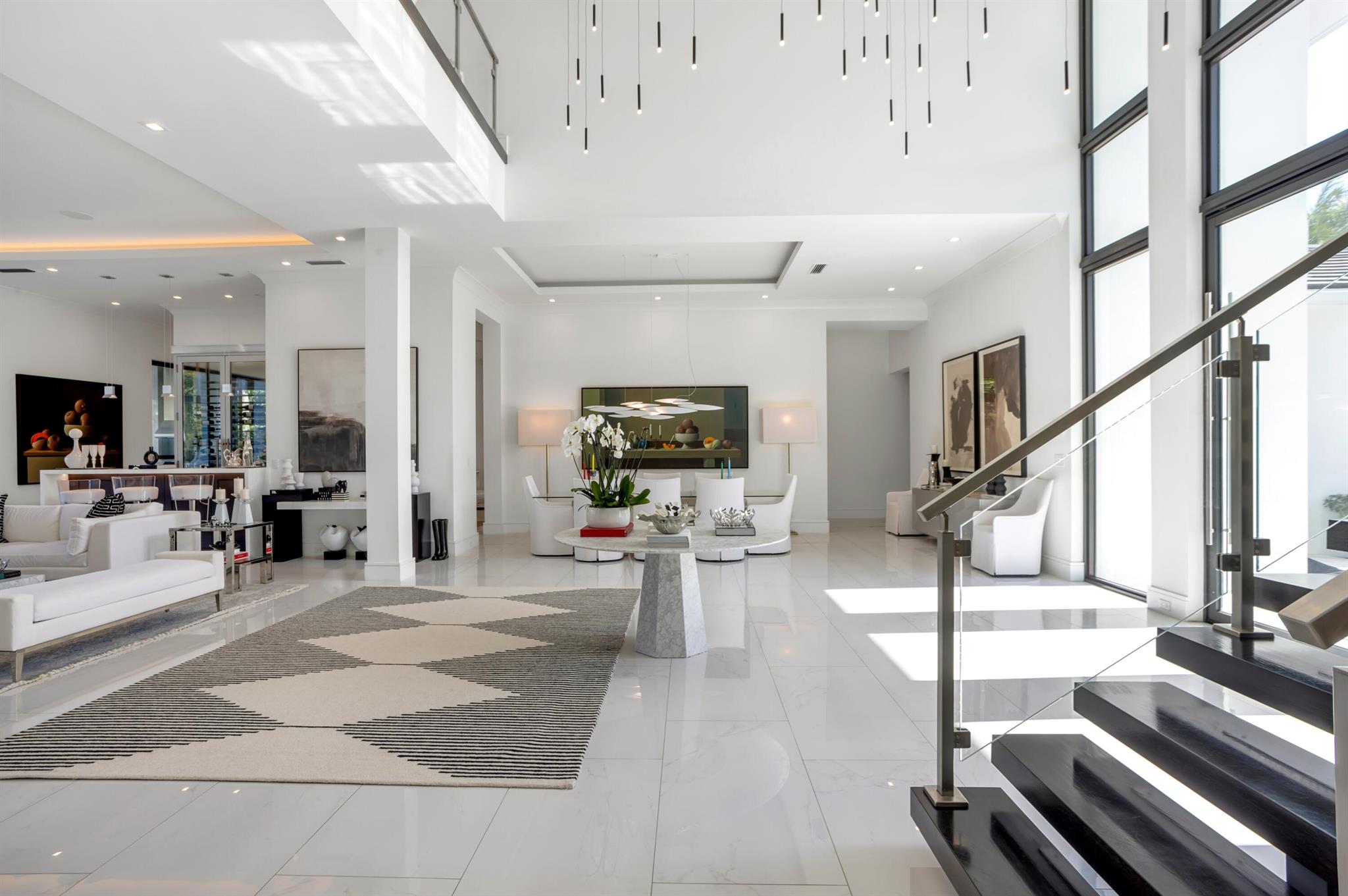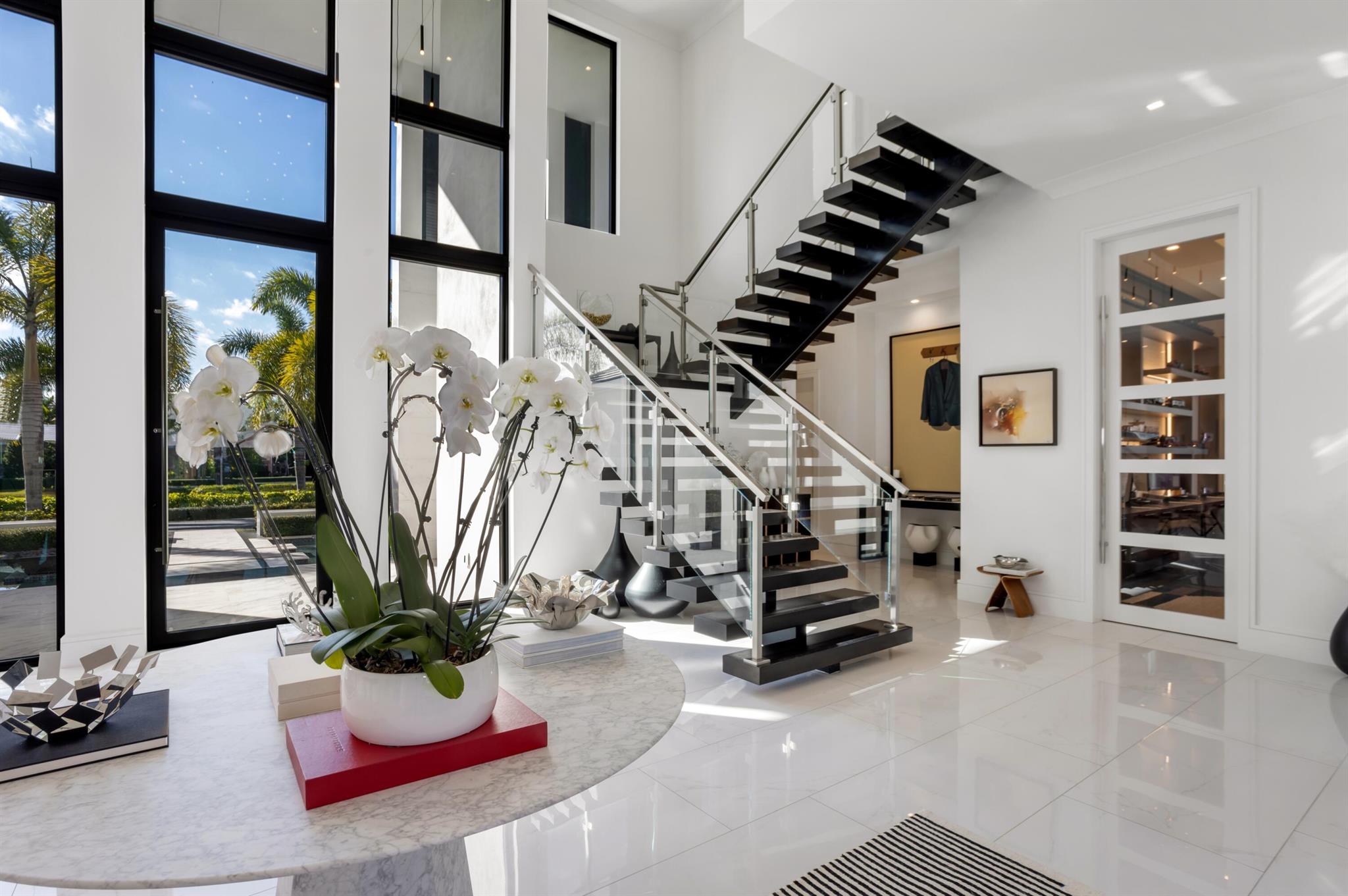 A masterwork of bespoke design, this incredible six-bedroom, 12,228 +/-total-square-foot estate, astutely conceived by Mitch Kunik of Affiniti Architects built in 2021, encapsulates the pinnacle for luxurious living. The spectacular two-story reception hall, with a glass-fronted facade and dramatic floating stairway, welcomes guests into a world of refined elegance. Just beyond the formal dining room, the elegant living room features a 14-foot-high wall of automated sliding glass doors that entirely pocket away, creating a seamless transition to the pool loggia, for an unparalleled indoor-outdoor tropical experience.