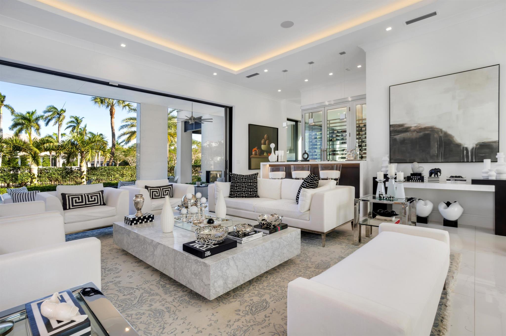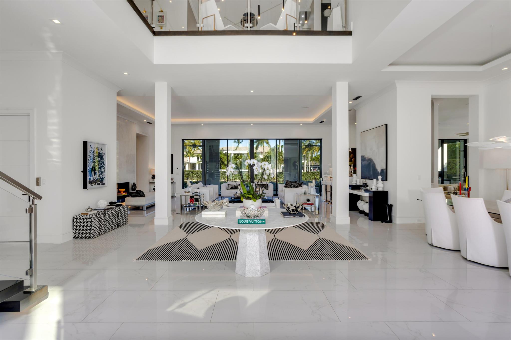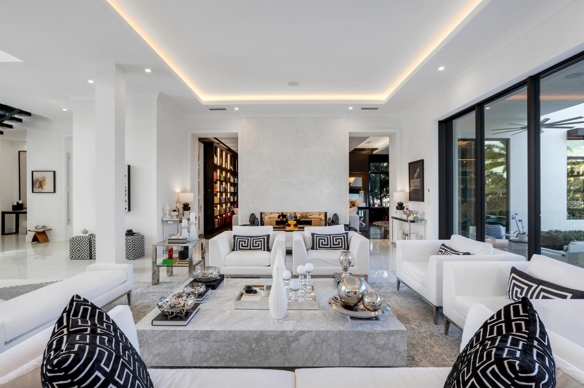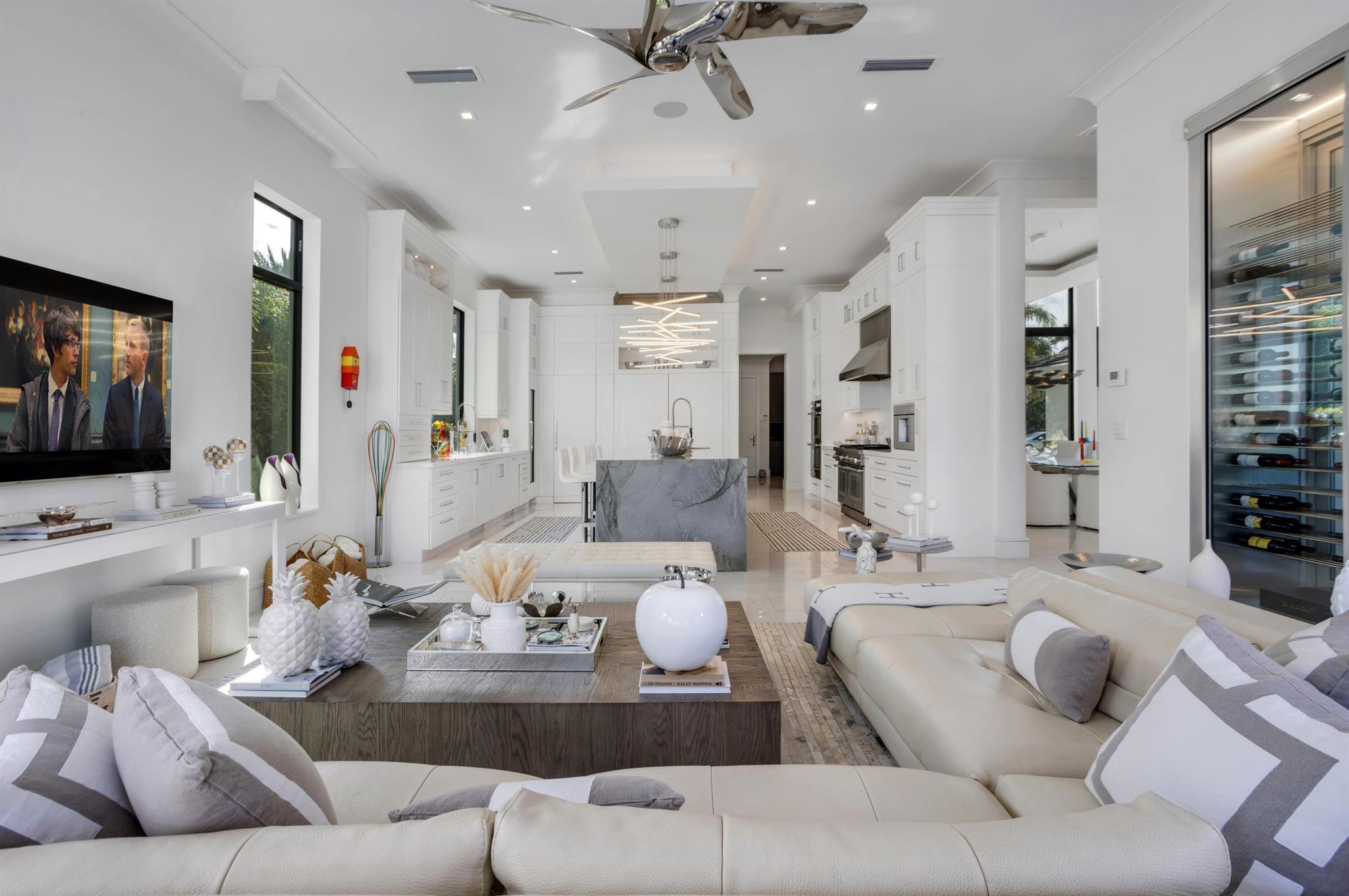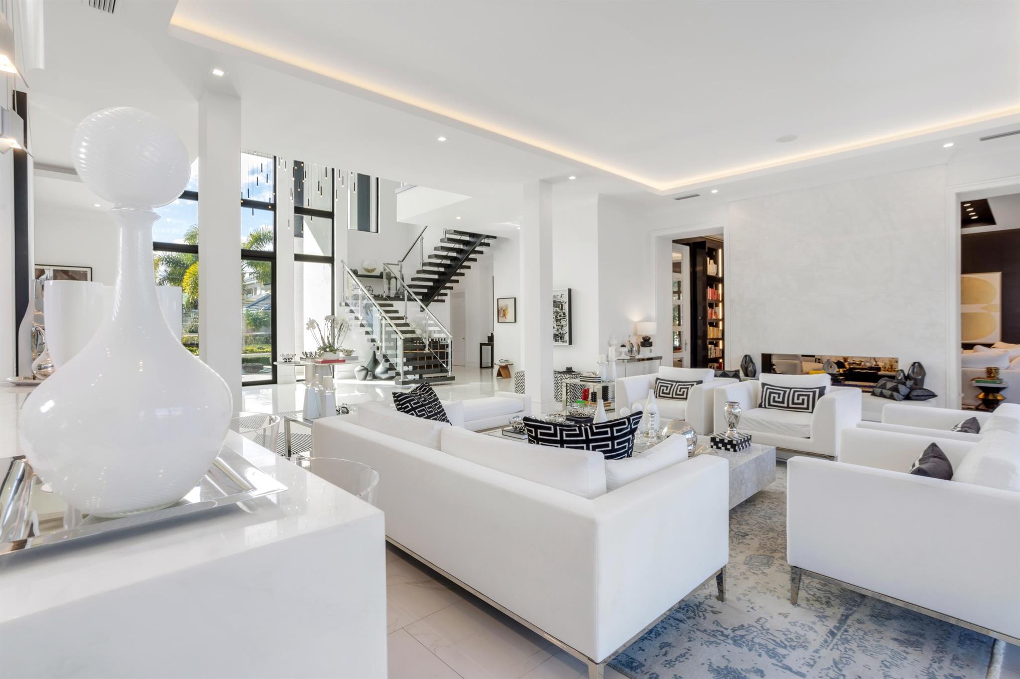 A masterwork of bespoke design, this incredible six-bedroom, 12,228 +/-total-square-foot estate, astutely conceived by Mitch Kunik of Affiniti Architects built in 2021, encapsulates the pinnacle for luxurious living. The spectacular two-story reception hall, with a glass-fronted facade and dramatic floating stairway, welcomes guests into a world of refined elegance. Just beyond the formal dining room, the elegant living room features a 14-foot-high wall of automated sliding glass doors that entirely pocket away, creating a seamless transition to the pool loggia, for an unparalleled indoor-outdoor tropical experience.