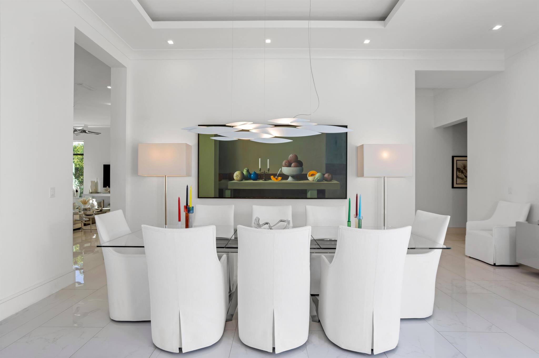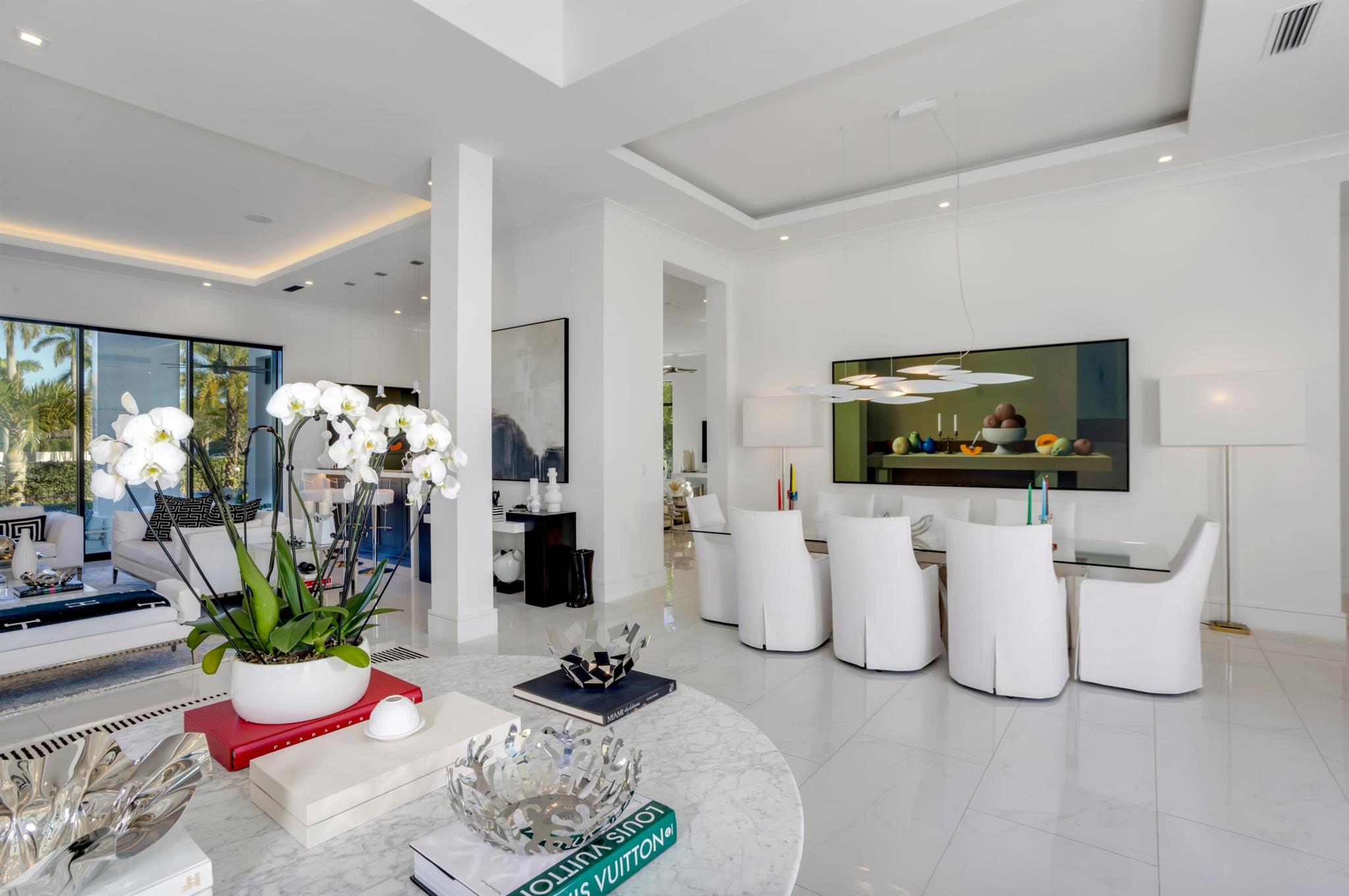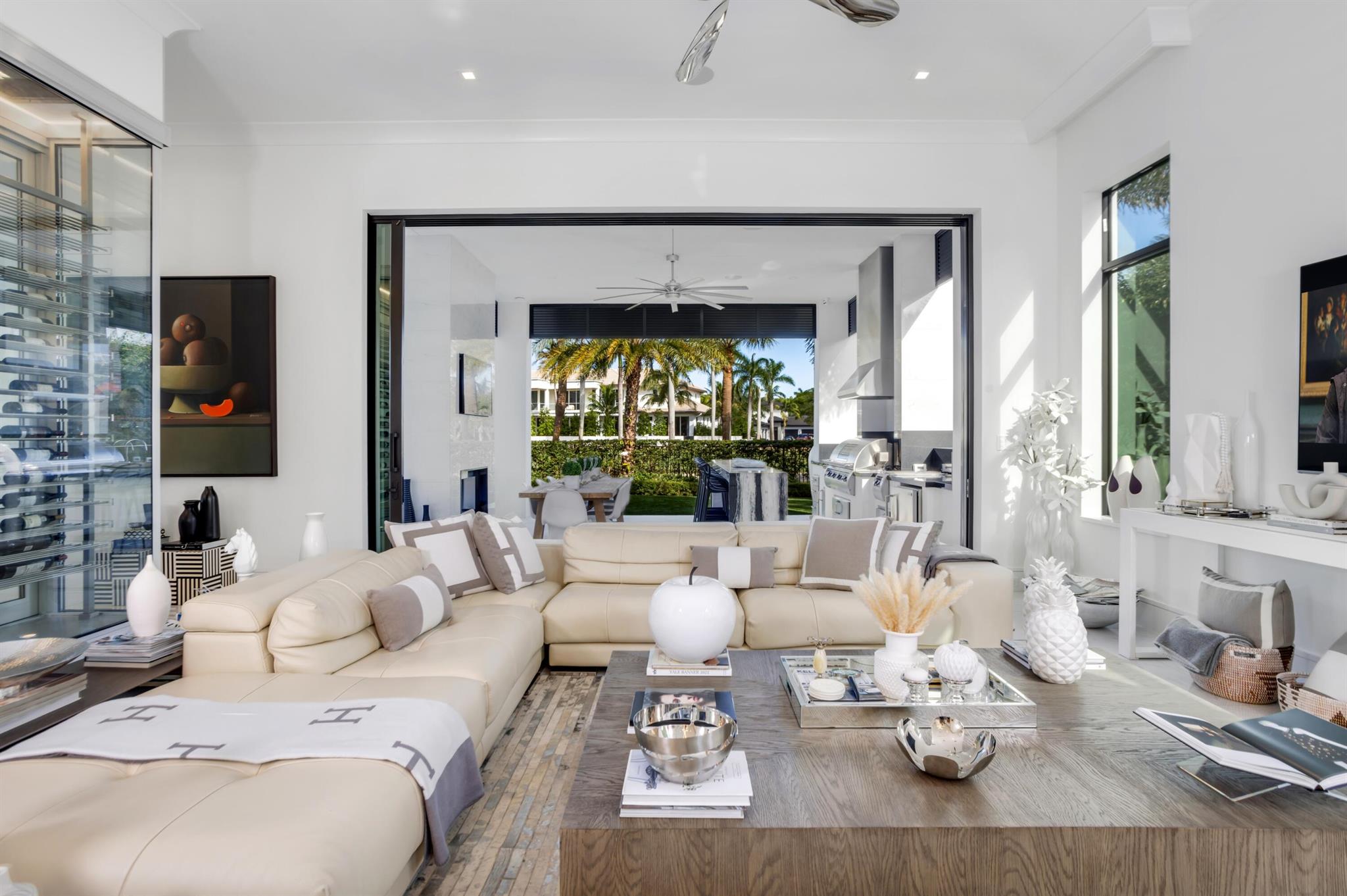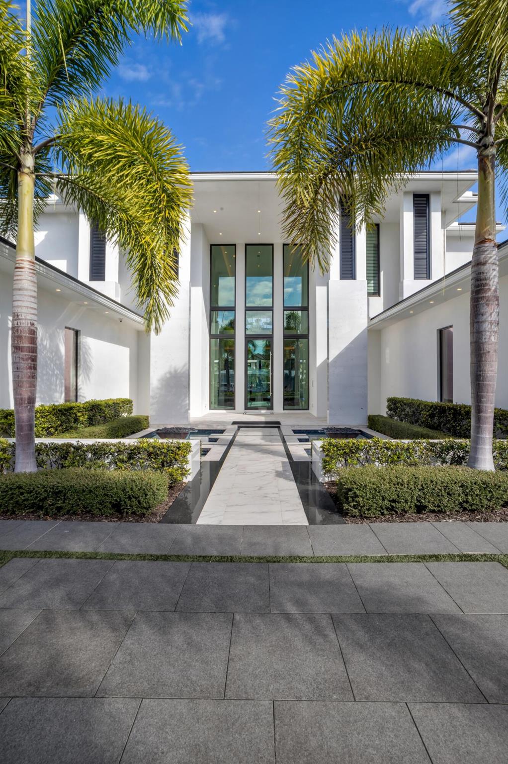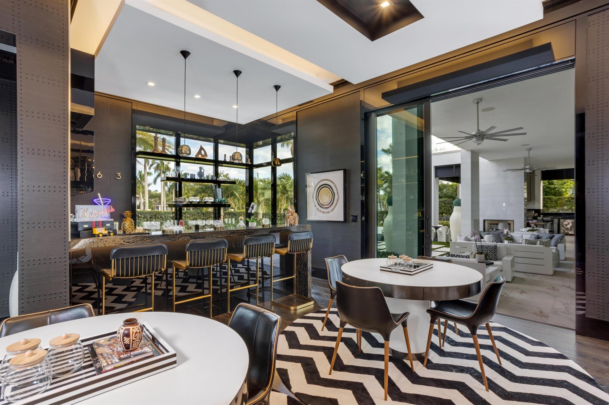 A masterwork of bespoke design, this incredible six-bedroom, 12,228 +/-total-square-foot estate, astutely conceived by Mitch Kunik of Affiniti Architects built in 2021, encapsulates the pinnacle for luxurious living. The spectacular two-story reception hall, with a glass-fronted facade and dramatic floating stairway, welcomes guests into a world of refined elegance. Just beyond the formal dining room, the elegant living room features a 14-foot-high wall of automated sliding glass doors that entirely pocket away, creating a seamless transition to the pool loggia, for an unparalleled indoor-outdoor tropical experience.