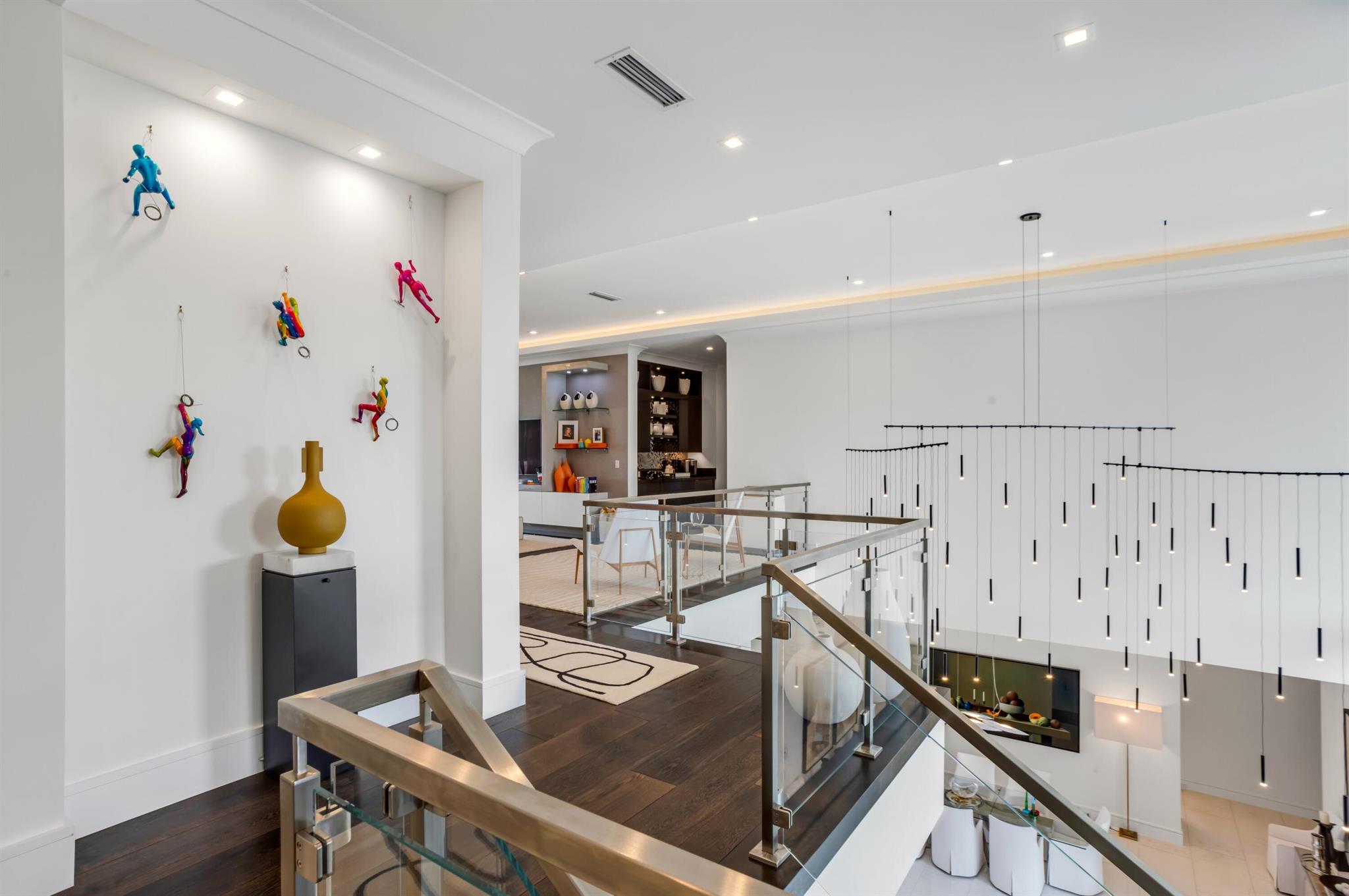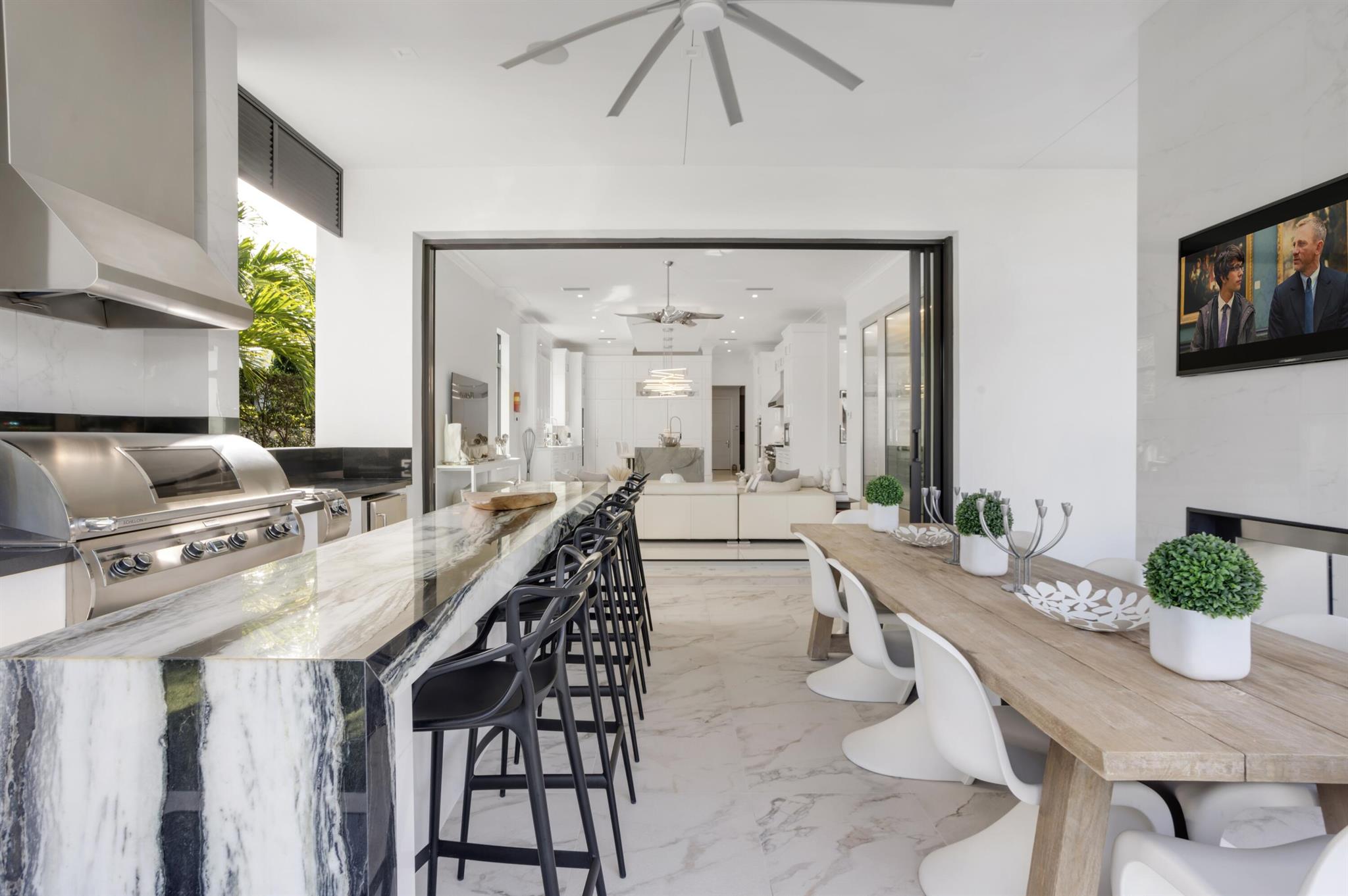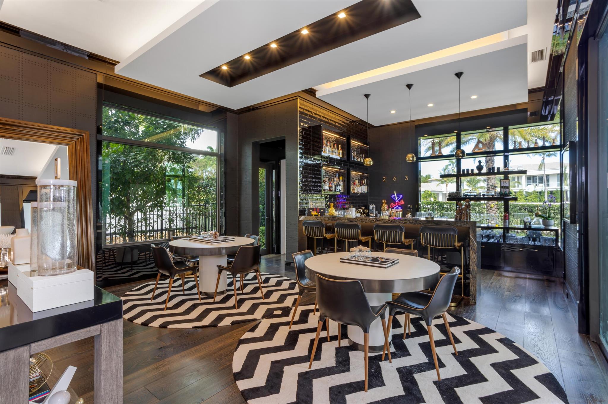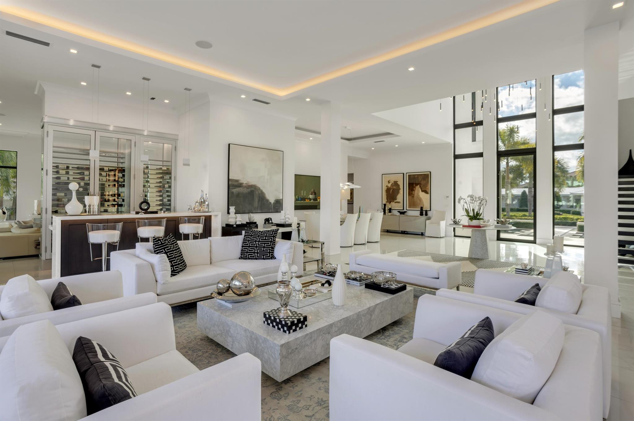 A masterwork of bespoke design, this incredible six-bedroom, 12,228 +/-total-square-foot estate, astutely conceived by Mitch Kunik of Affiniti Architects built in 2021, encapsulates the pinnacle for luxurious living. The spectacular two-story reception hall, with a glass-fronted facade and dramatic floating stairway, welcomes guests into a world of refined elegance. Just beyond the formal dining room, the elegant living room features a 14-foot-high wall of automated sliding glass doors that entirely pocket away, creating a seamless transition to the pool loggia, for an unparalleled indoor-outdoor tropical experience.