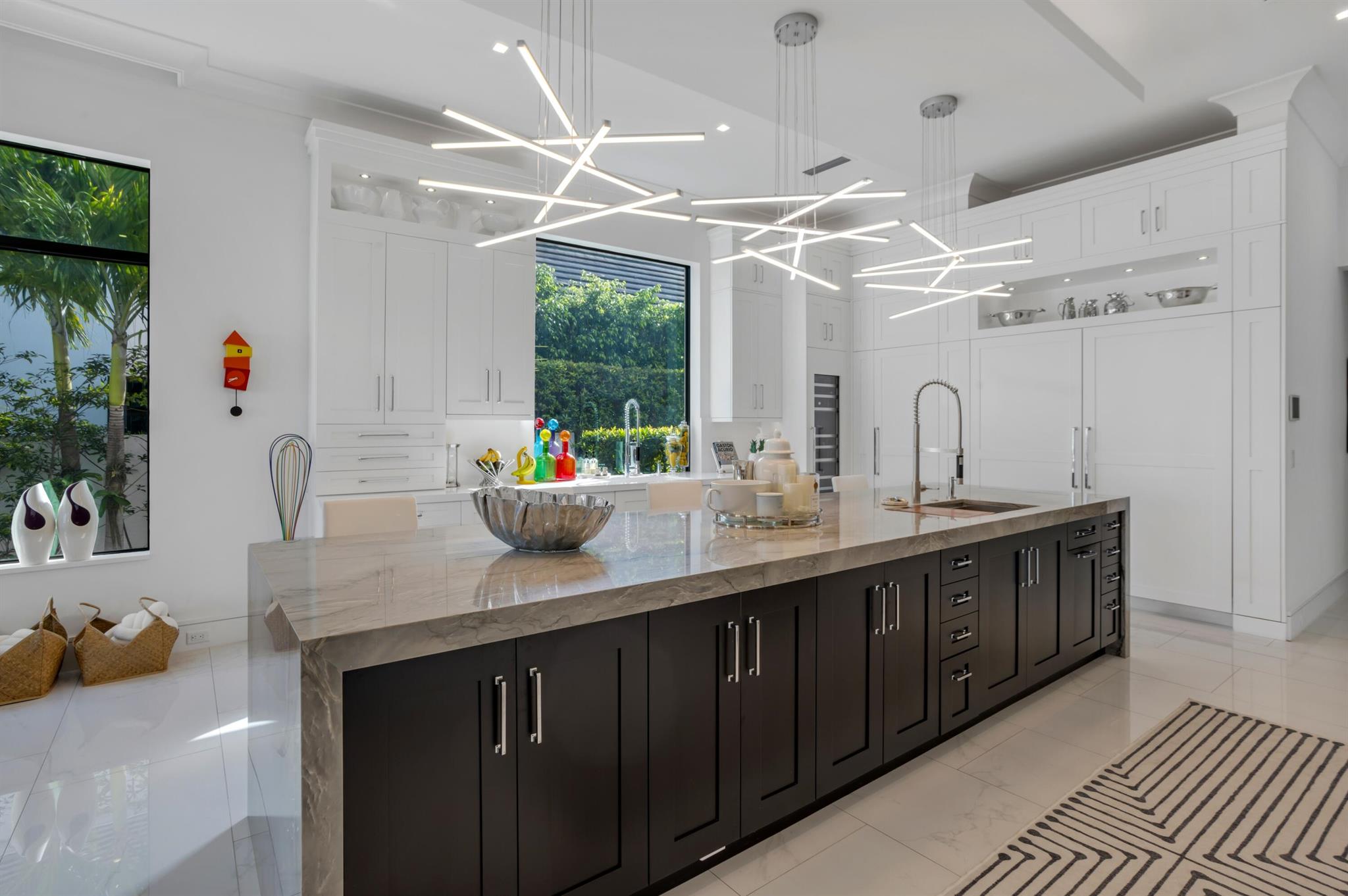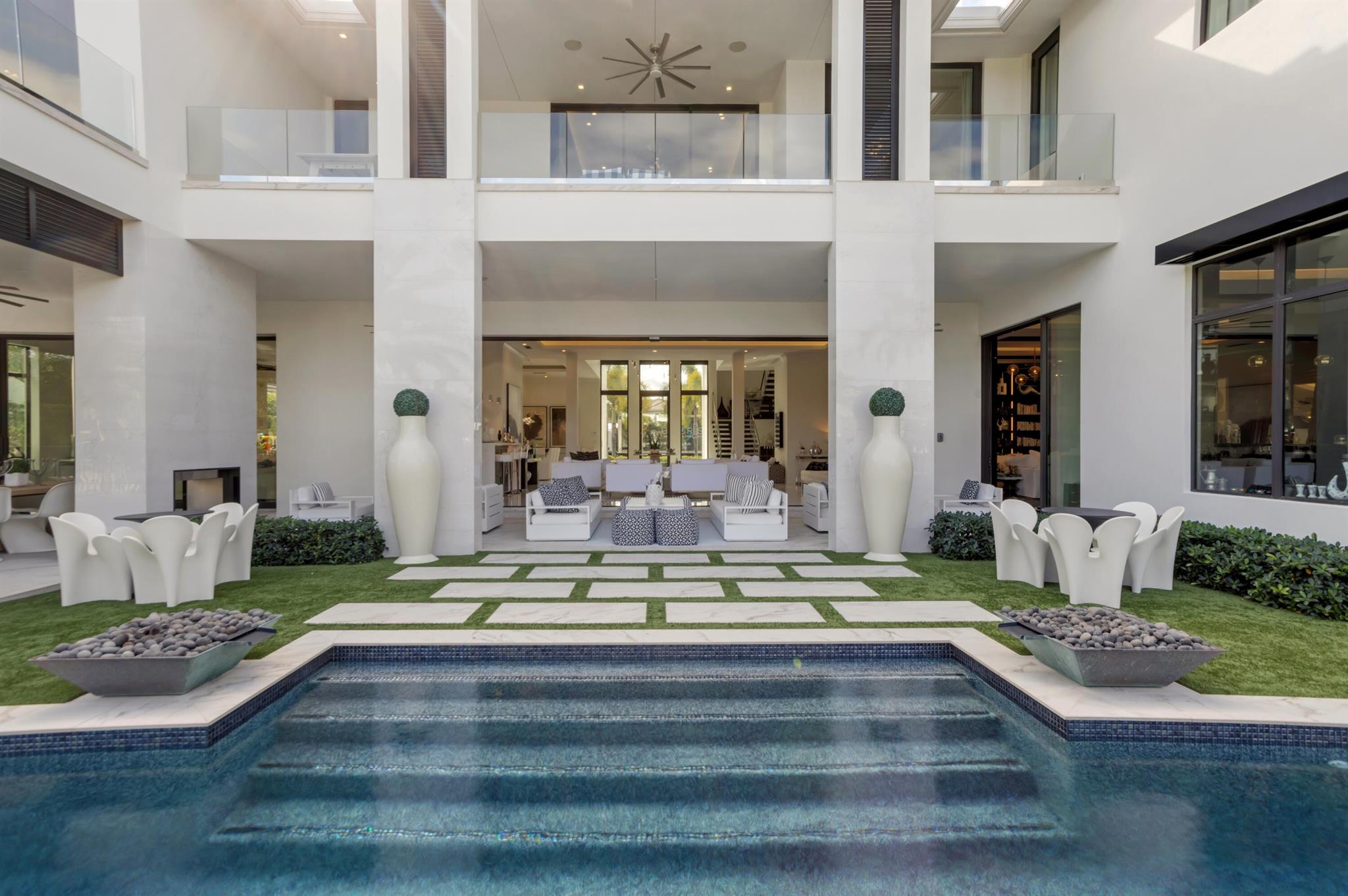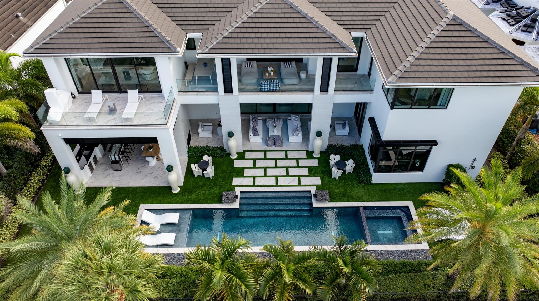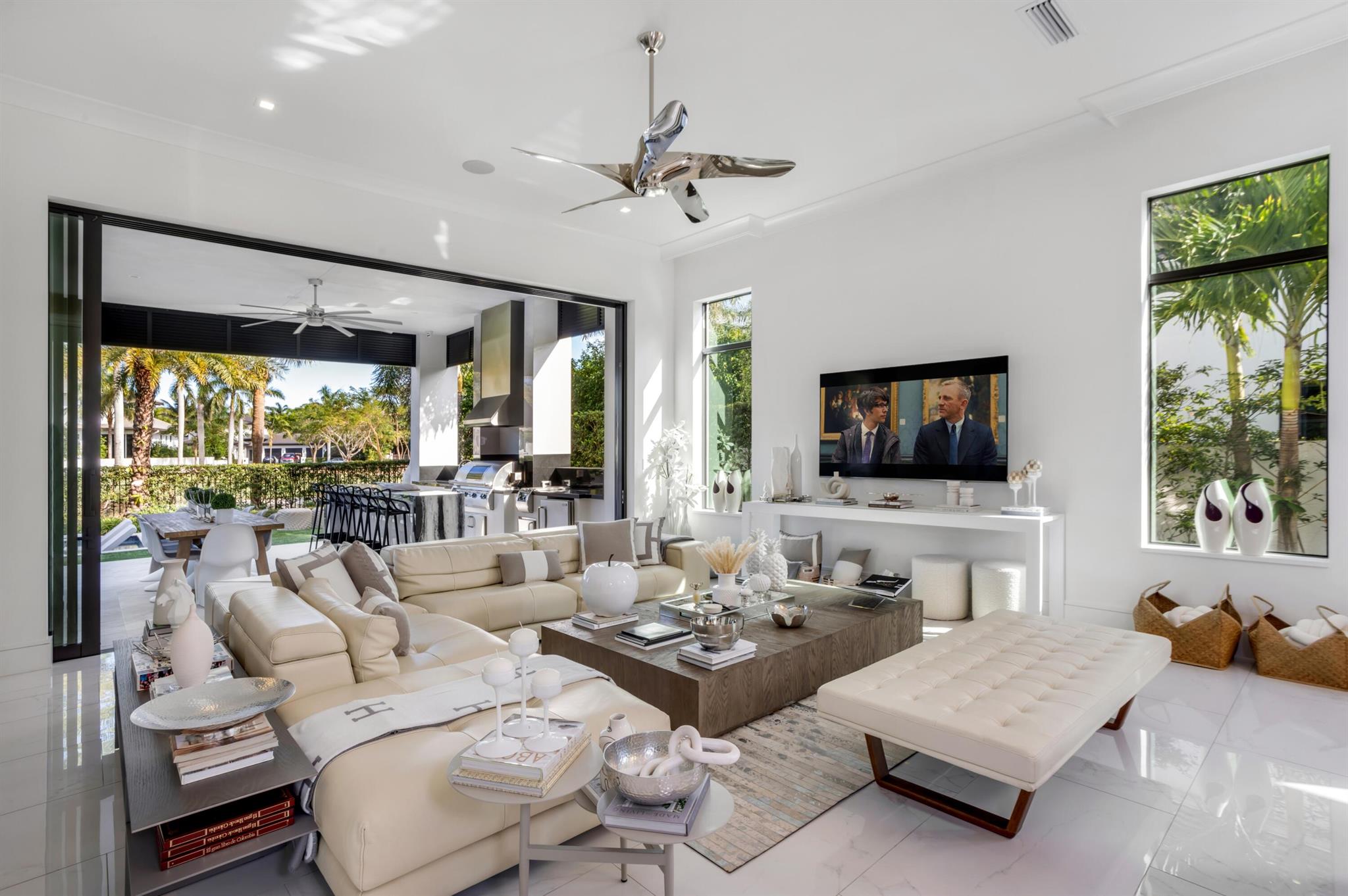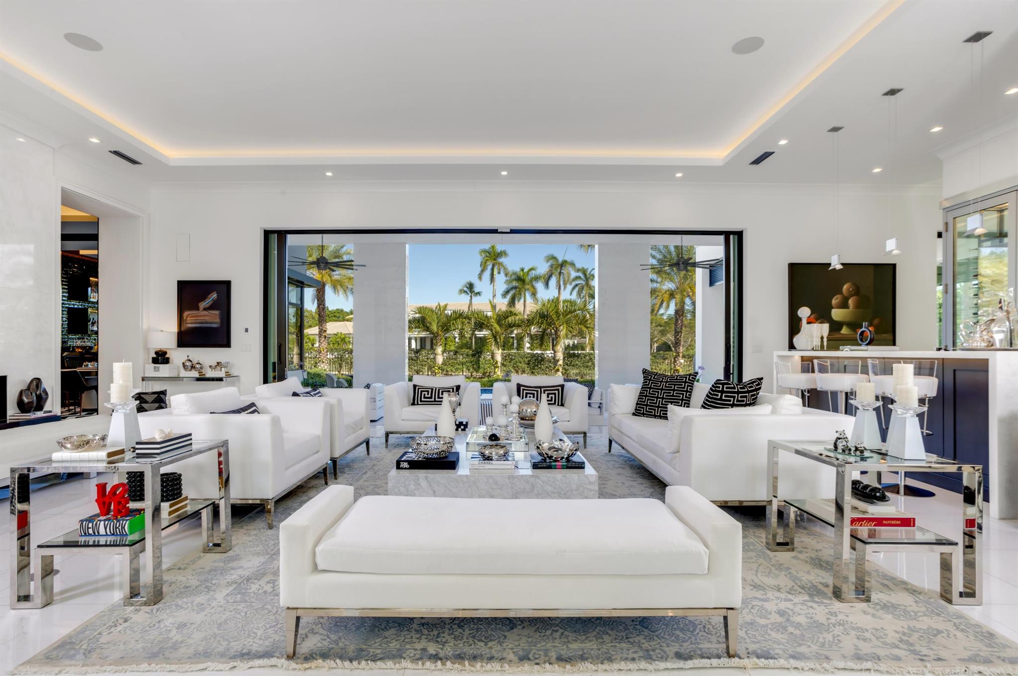 A masterwork of bespoke design, this incredible six-bedroom, 12,228 +/-total-square-foot estate, astutely conceived by Mitch Kunik of Affiniti Architects built in 2021, encapsulates the pinnacle for luxurious living. The spectacular two-story reception hall, with a glass-fronted facade and dramatic floating stairway, welcomes guests into a world of refined elegance. Just beyond the formal dining room, the elegant living room features a 14-foot-high wall of automated sliding glass doors that entirely pocket away, creating a seamless transition to the pool loggia, for an unparalleled indoor-outdoor tropical experience.
