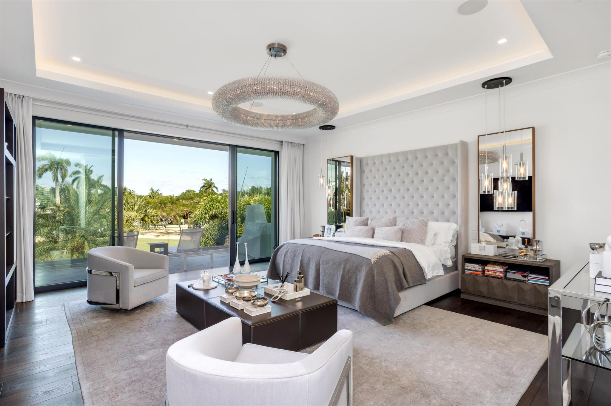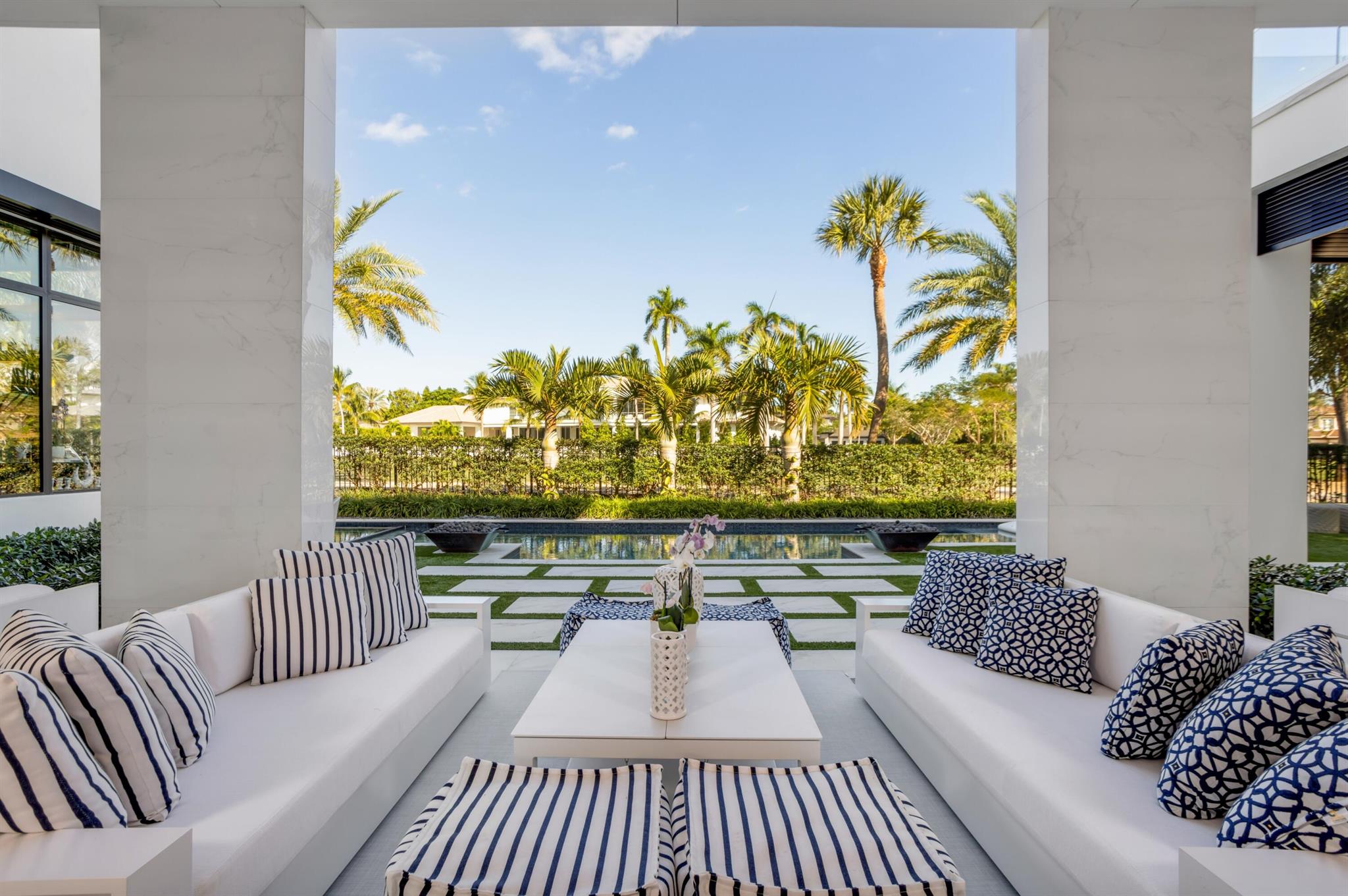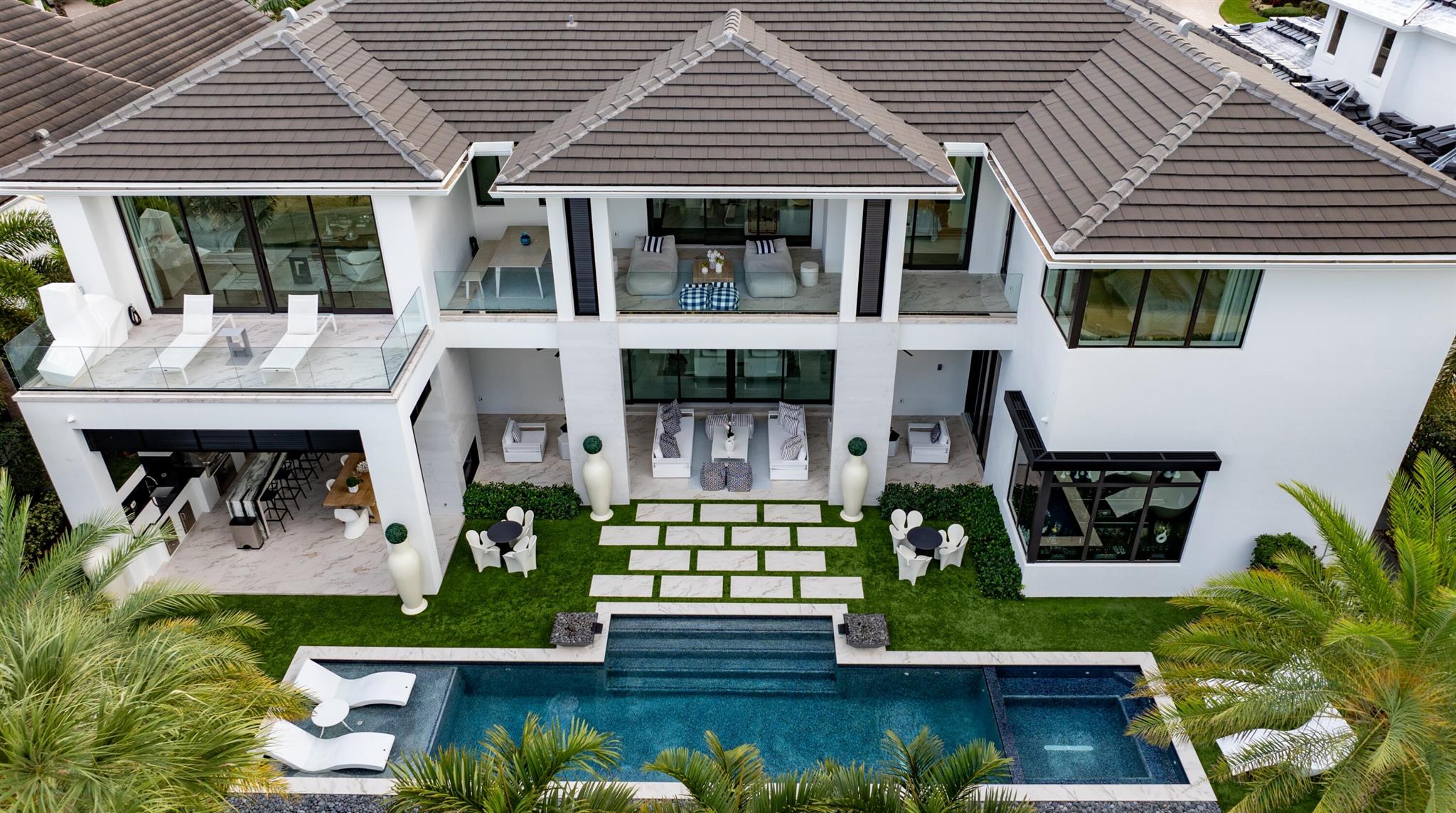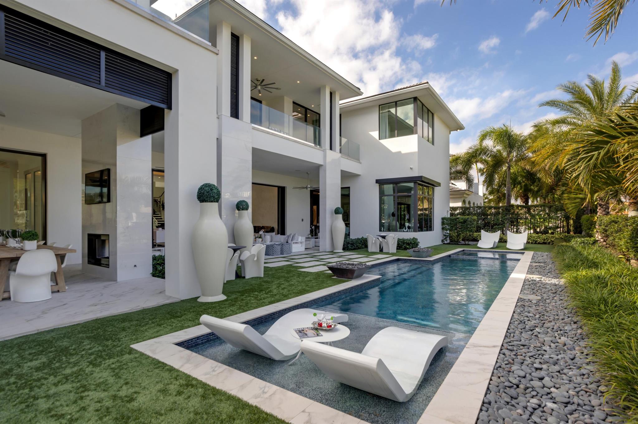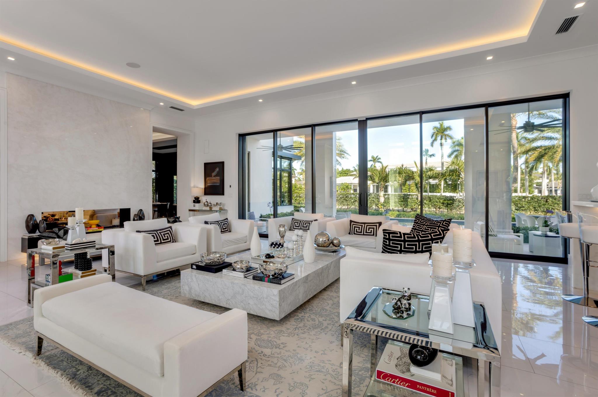 A masterwork of bespoke design, this incredible six-bedroom, 12,228 +/-total-square-foot estate, astutely conceived by Mitch Kunik of Affiniti Architects built in 2021, encapsulates the pinnacle for luxurious living. The spectacular two-story reception hall, with a glass-fronted facade and dramatic floating stairway, welcomes guests into a world of refined elegance. Just beyond the formal dining room, the elegant living room features a 14-foot-high wall of automated sliding glass doors that entirely pocket away, creating a seamless transition to the pool loggia, for an unparalleled indoor-outdoor tropical experience.