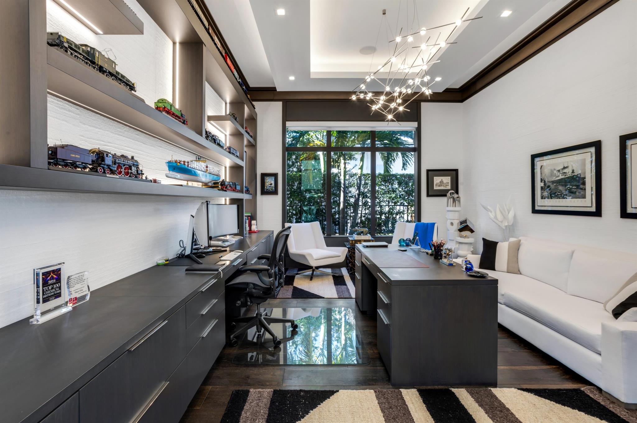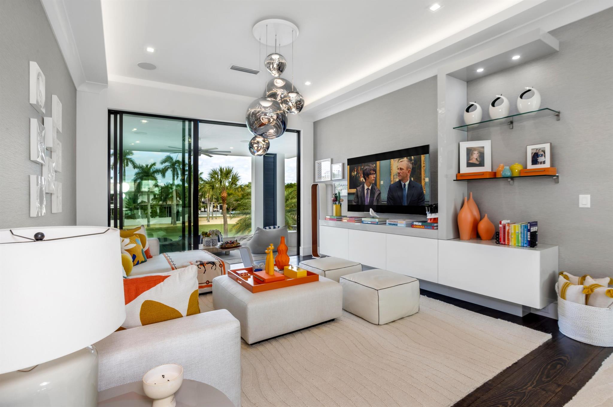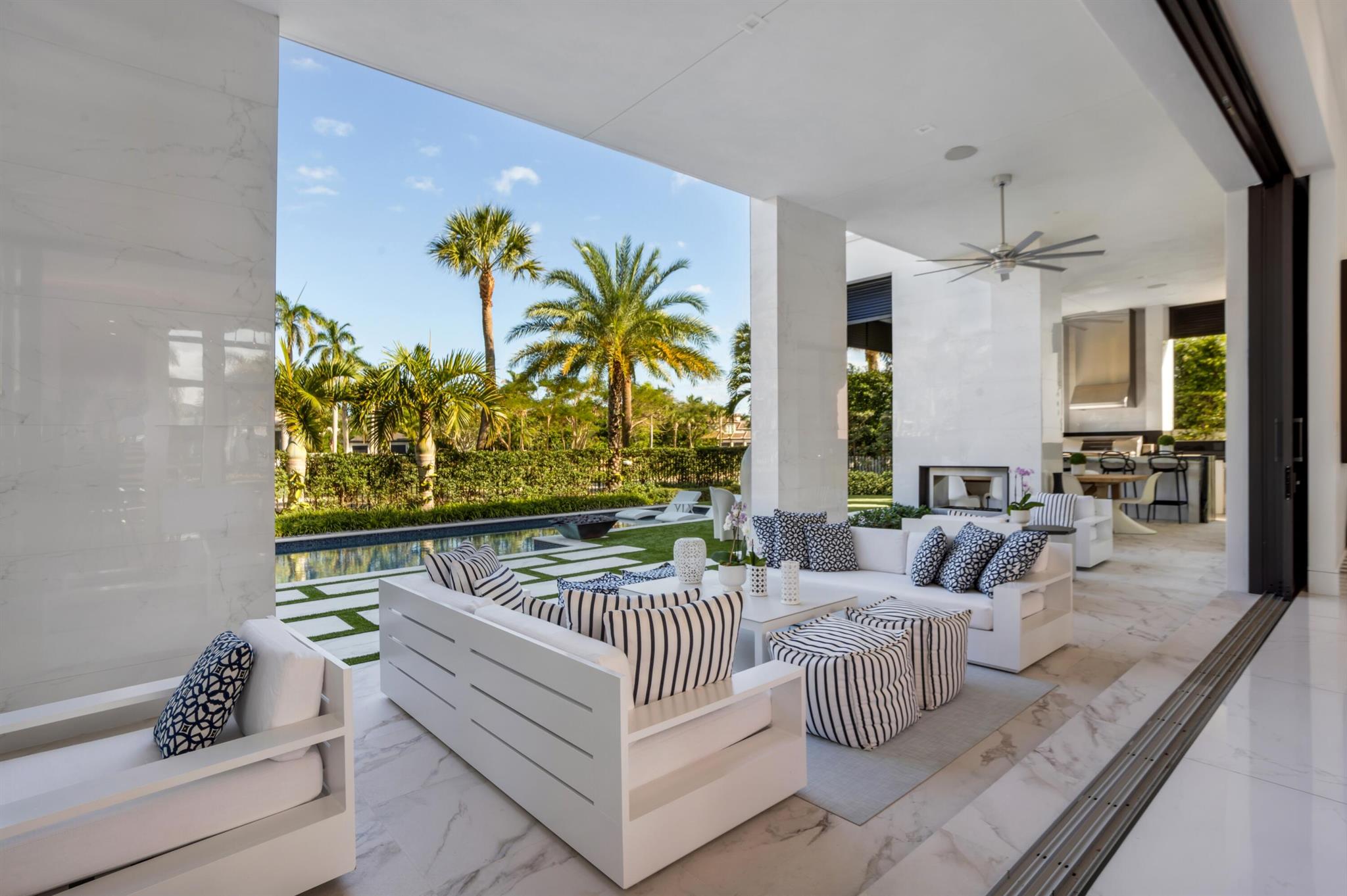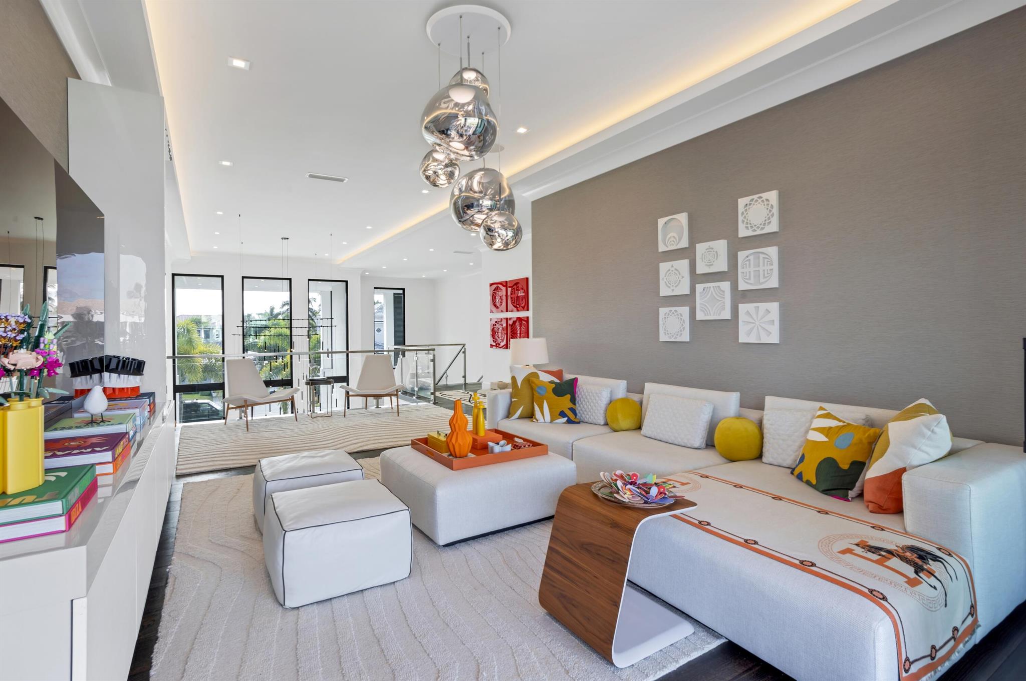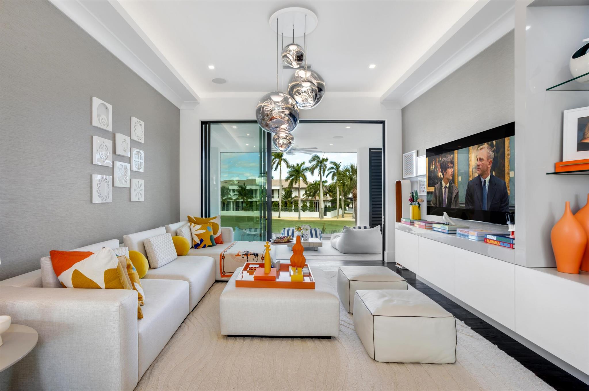 A masterwork of bespoke design, this incredible six-bedroom, 12,228 +/-total-square-foot estate, astutely conceived by Mitch Kunik of Affiniti Architects built in 2021, encapsulates the pinnacle for luxurious living. The spectacular two-story reception hall, with a glass-fronted facade and dramatic floating stairway, welcomes guests into a world of refined elegance. Just beyond the formal dining room, the elegant living room features a 14-foot-high wall of automated sliding glass doors that entirely pocket away, creating a seamless transition to the pool loggia, for an unparalleled indoor-outdoor tropical experience.