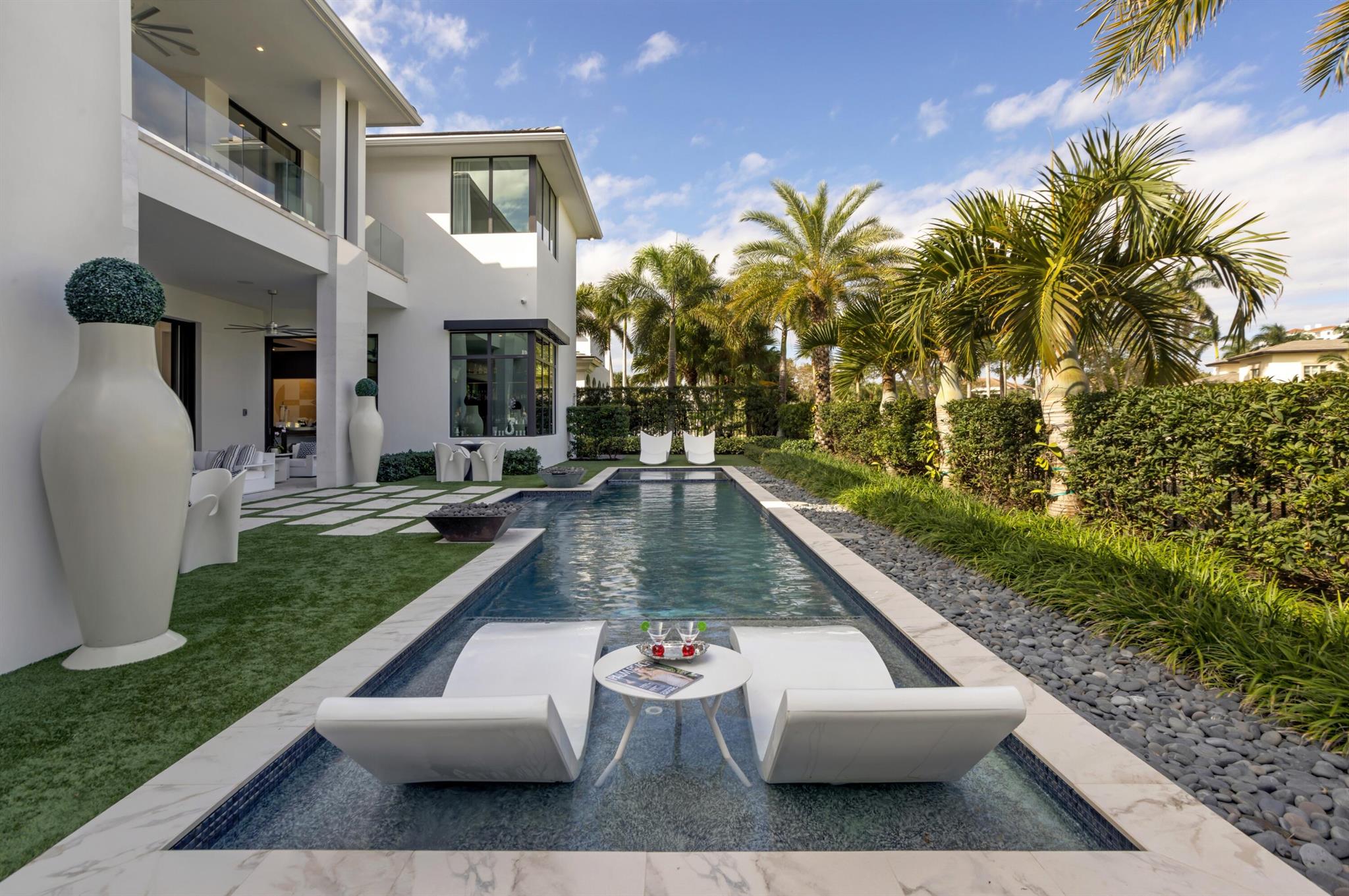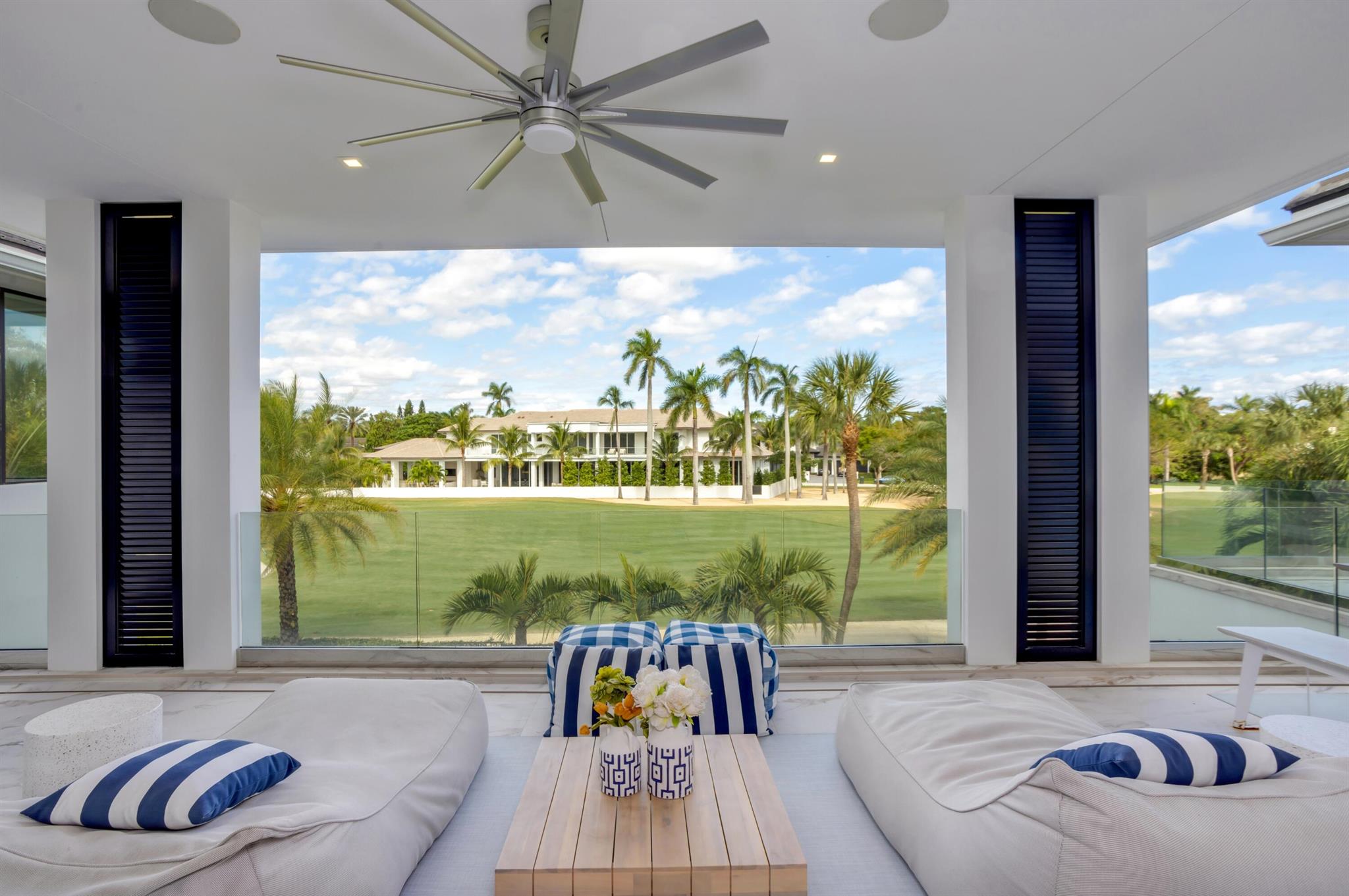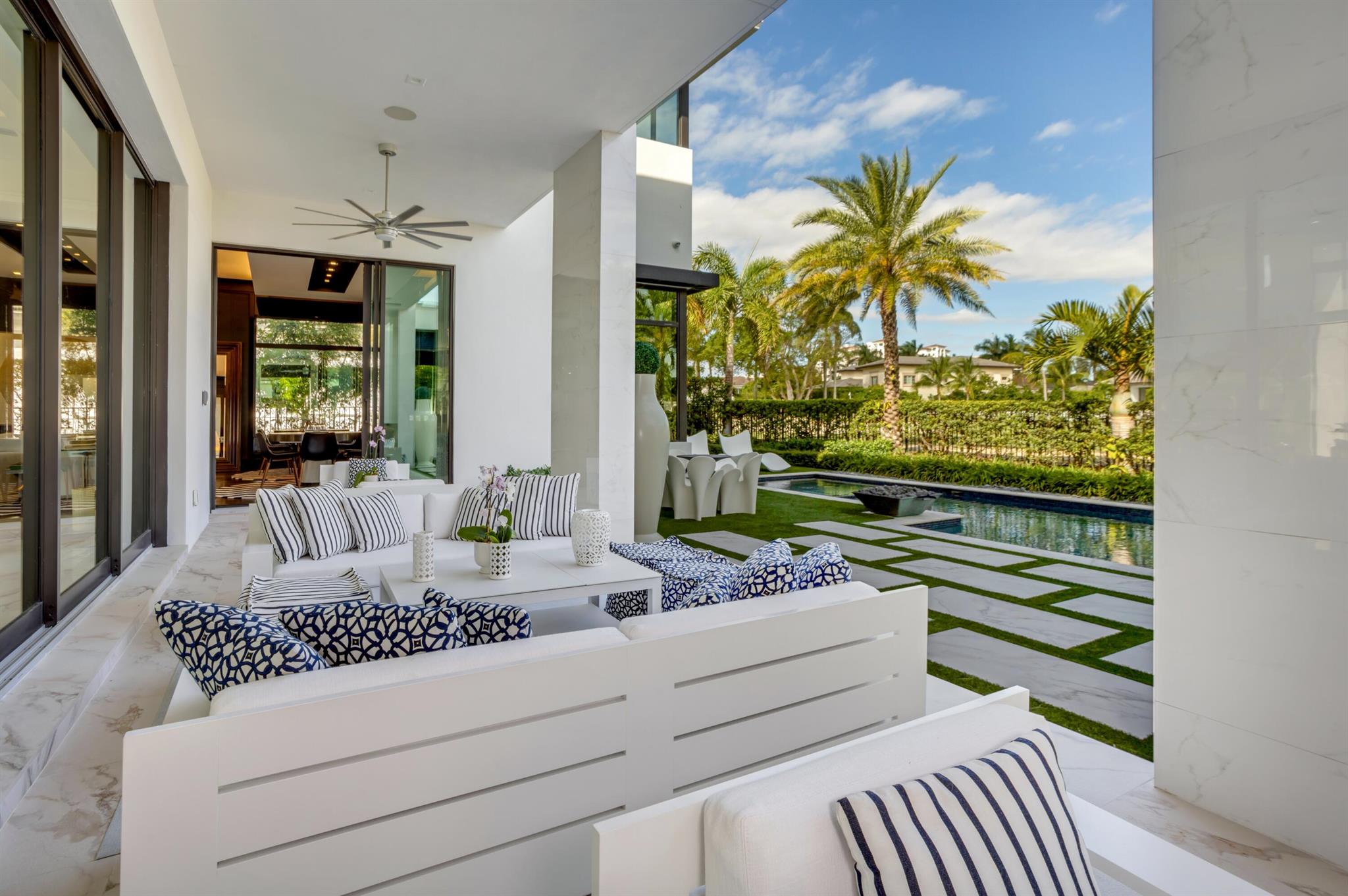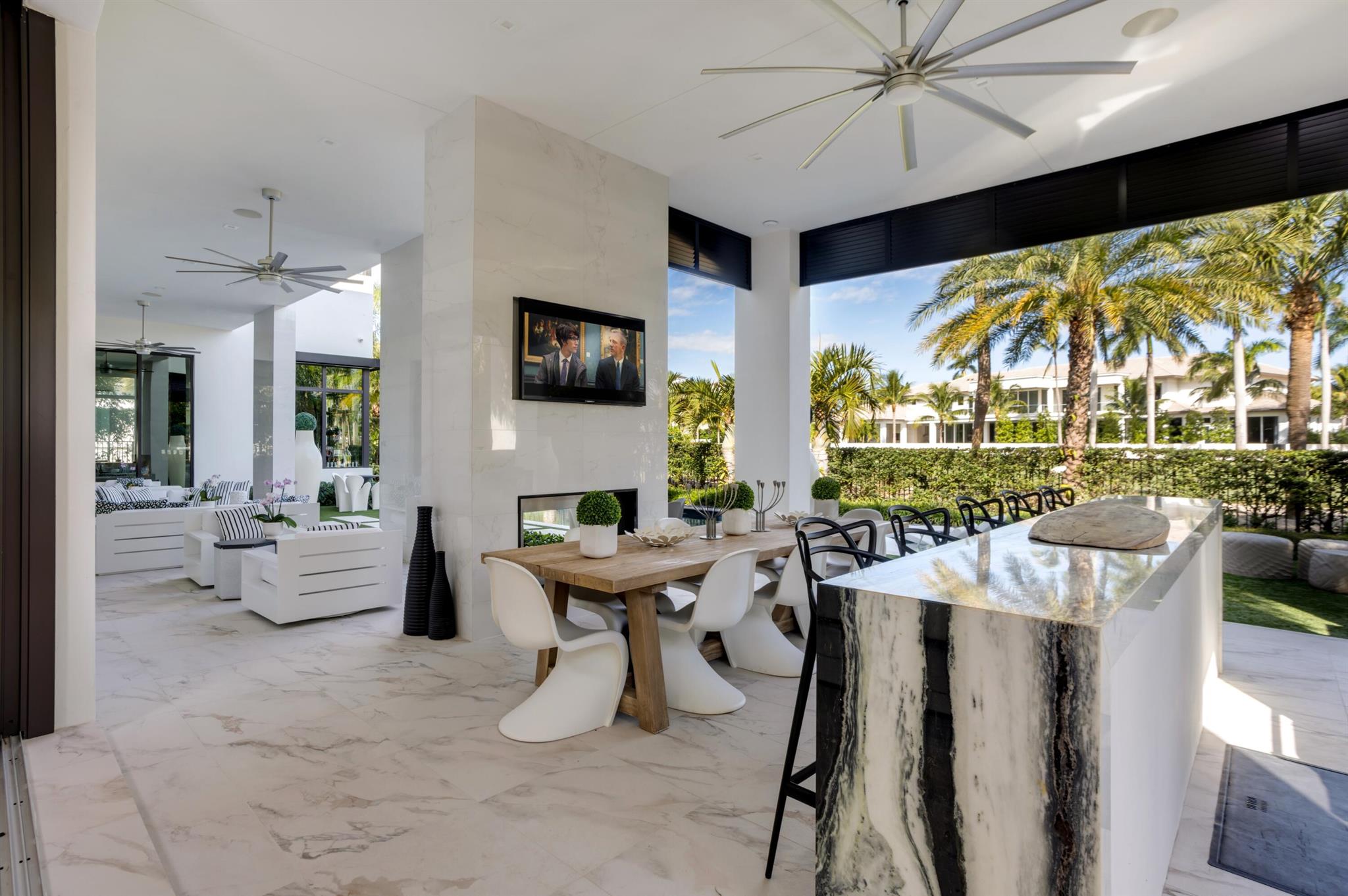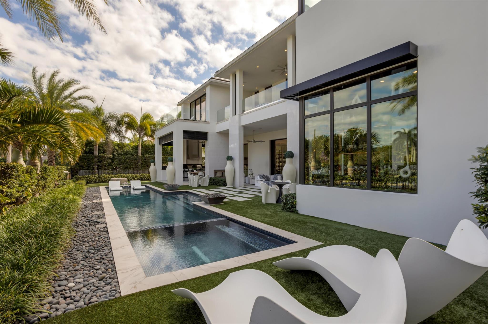 A masterwork of bespoke design, this incredible six-bedroom, 12,228 +/-total-square-foot estate, astutely conceived by Mitch Kunik of Affiniti Architects built in 2021, encapsulates the pinnacle for luxurious living. The spectacular two-story reception hall, with a glass-fronted facade and dramatic floating stairway, welcomes guests into a world of refined elegance. Just beyond the formal dining room, the elegant living room features a 14-foot-high wall of automated sliding glass doors that entirely pocket away, creating a seamless transition to the pool loggia, for an unparalleled indoor-outdoor tropical experience.