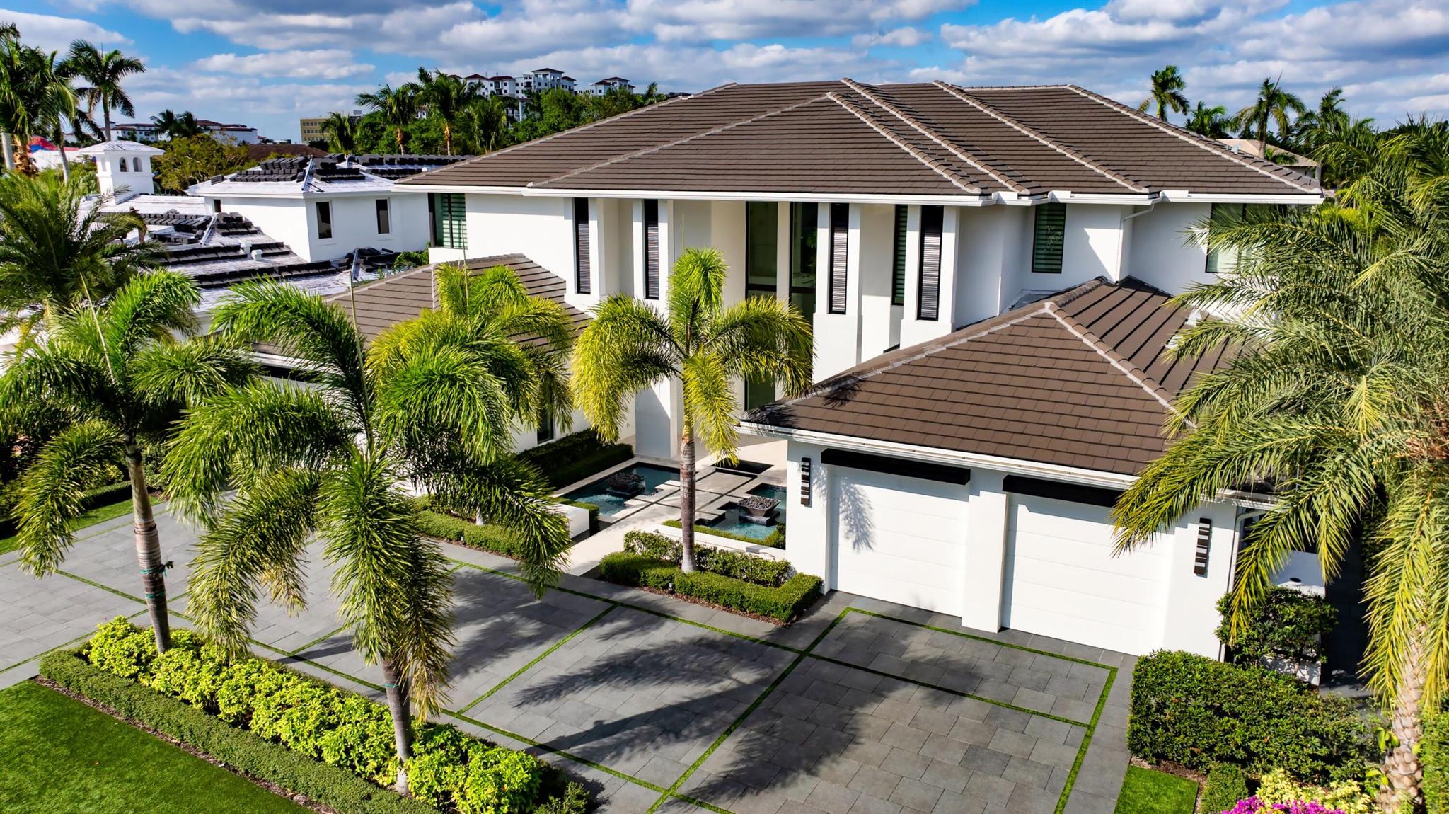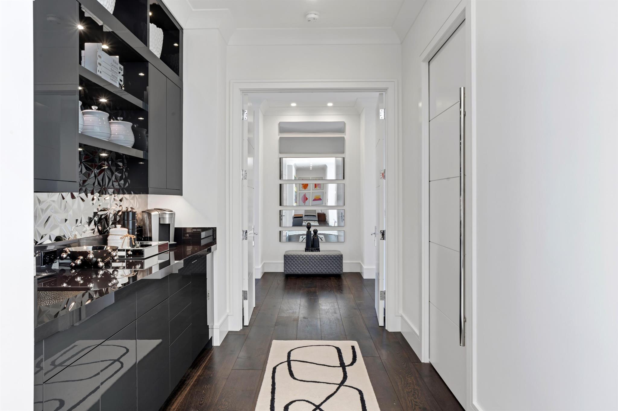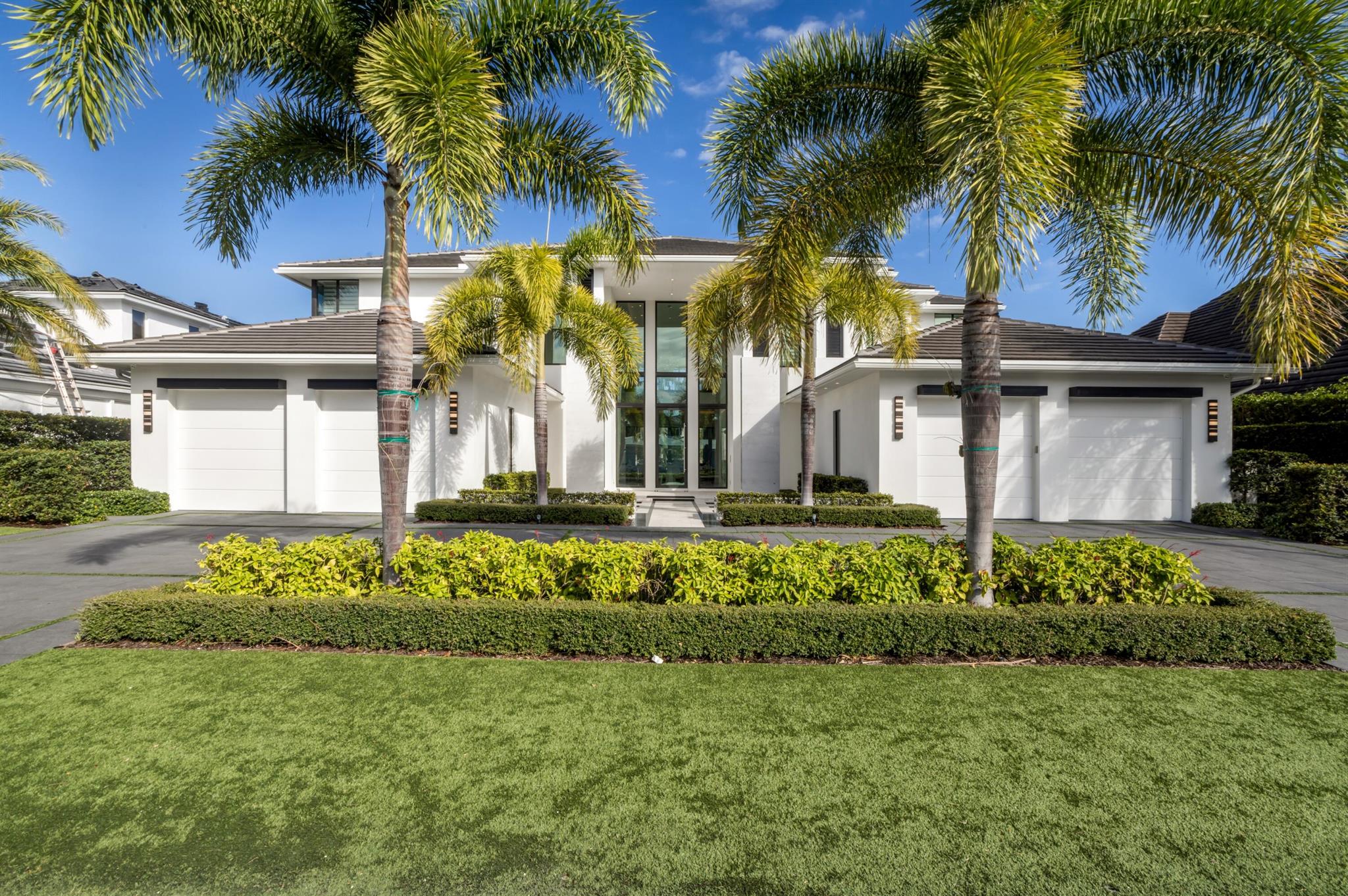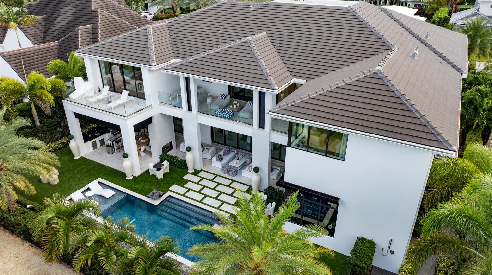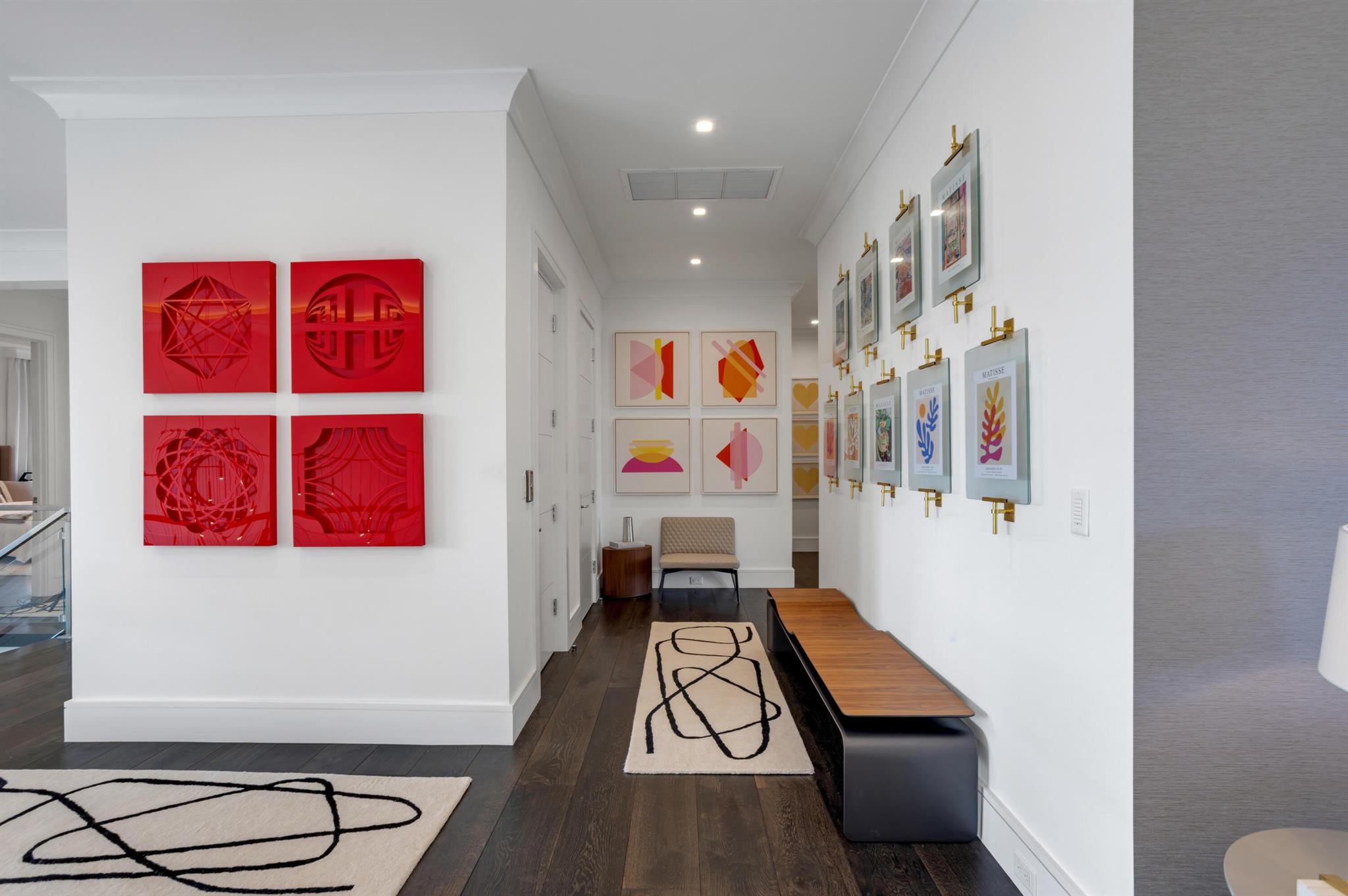 A masterwork of bespoke design, this incredible six-bedroom, 12,228 +/-total-square-foot estate, astutely conceived by Mitch Kunik of Affiniti Architects built in 2021, encapsulates the pinnacle for luxurious living. The spectacular two-story reception hall, with a glass-fronted facade and dramatic floating stairway, welcomes guests into a world of refined elegance. Just beyond the formal dining room, the elegant living room features a 14-foot-high wall of automated sliding glass doors that entirely pocket away, creating a seamless transition to the pool loggia, for an unparalleled indoor-outdoor tropical experience.