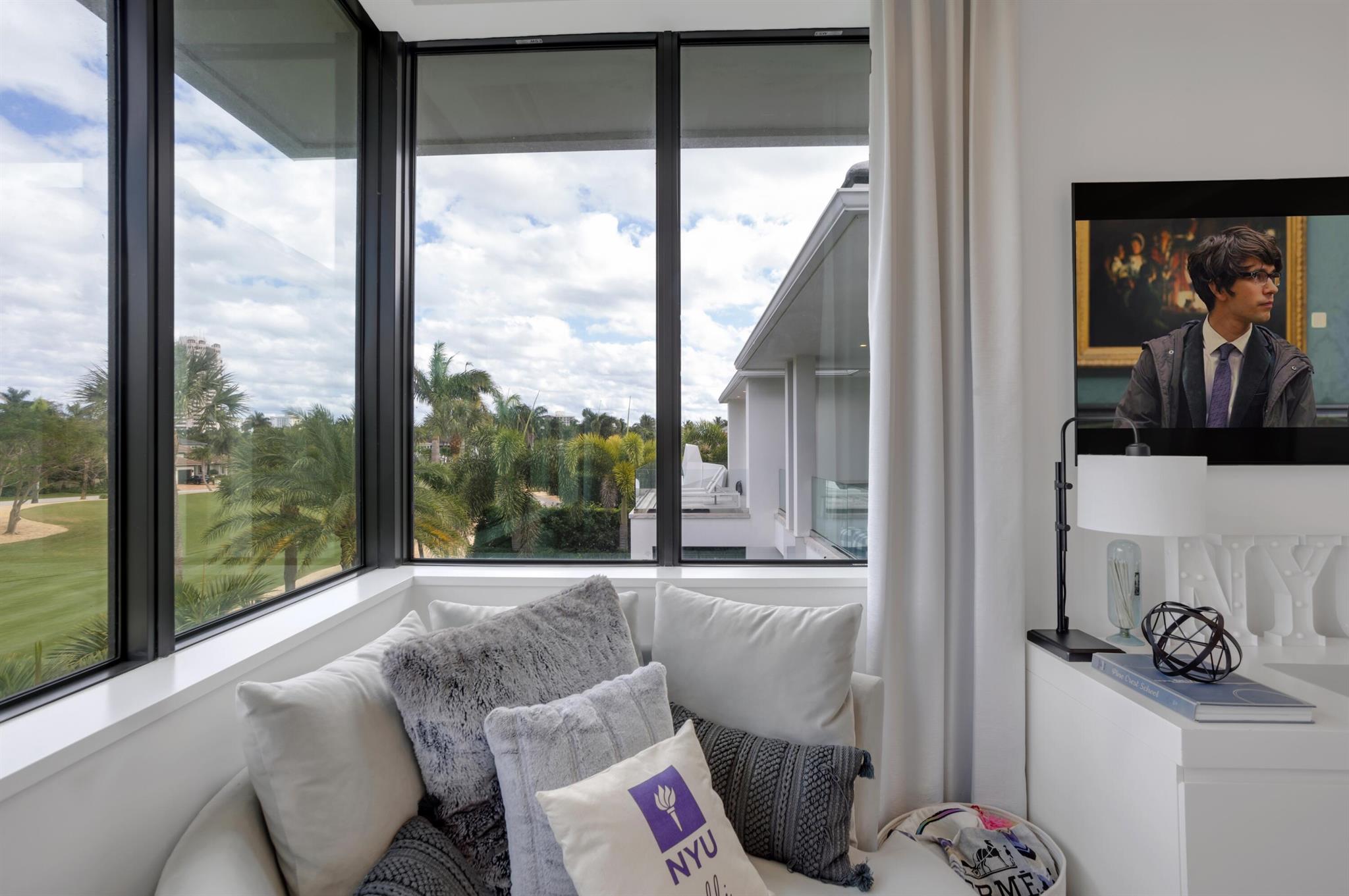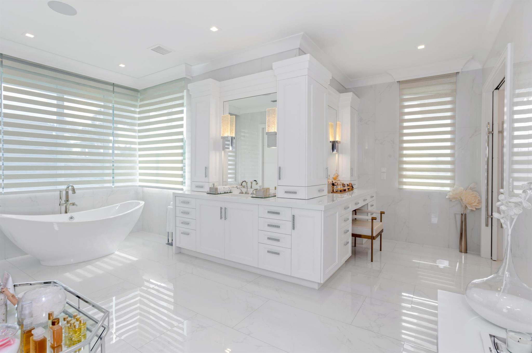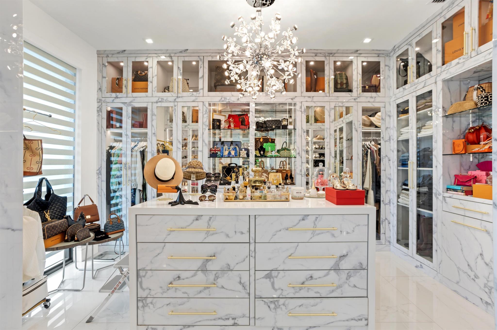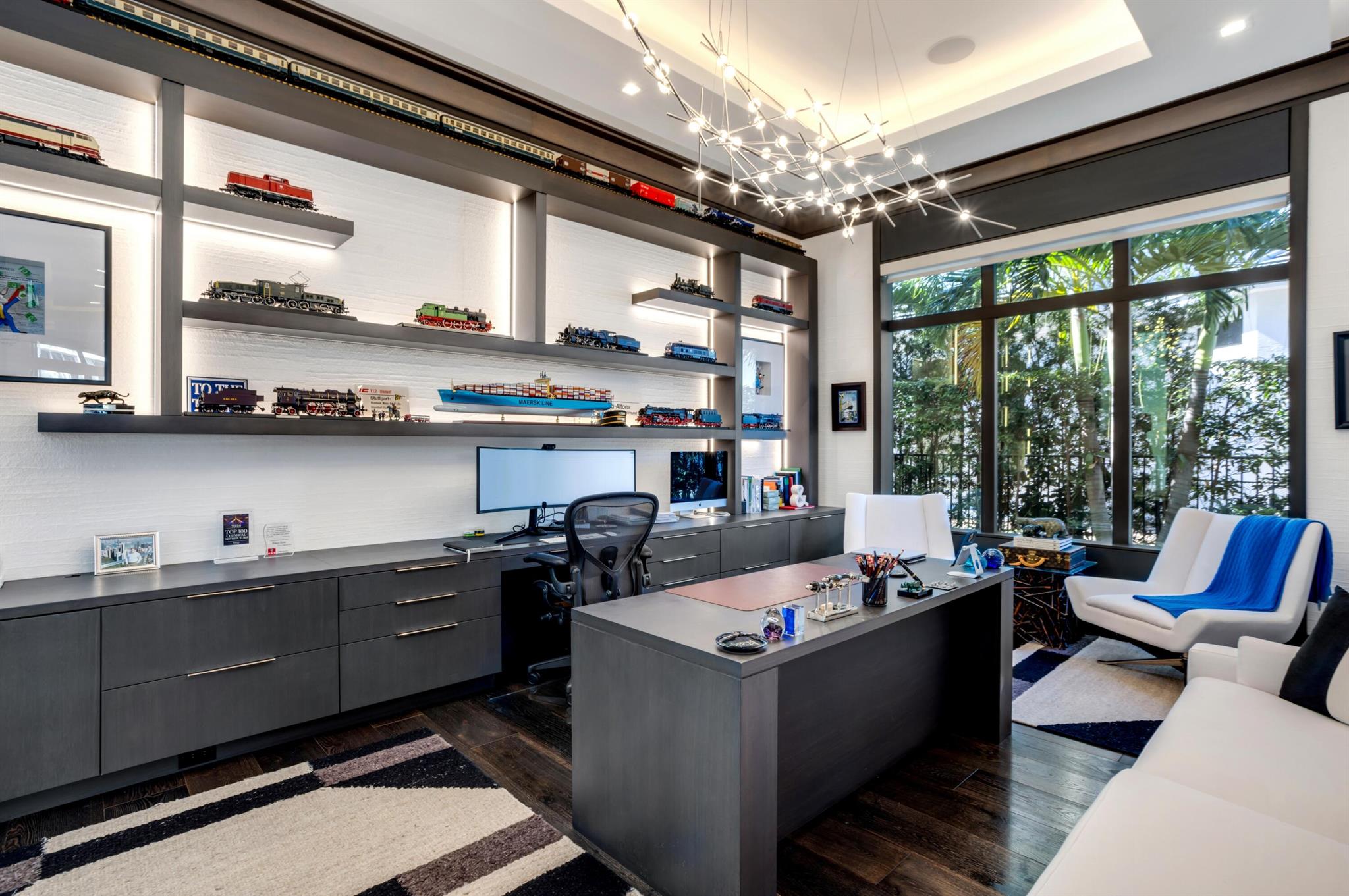 A masterwork of bespoke design, this incredible six-bedroom, 12,228 +/-total-square-foot estate, astutely conceived by Mitch Kunik of Affiniti Architects built in 2021, encapsulates the pinnacle for luxurious living. The spectacular two-story reception hall, with a glass-fronted facade and dramatic floating stairway, welcomes guests into a world of refined elegance. Just beyond the formal dining room, the elegant living room features a 14-foot-high wall of automated sliding glass doors that entirely pocket away, creating a seamless transition to the pool loggia, for an unparalleled indoor-outdoor tropical experience.