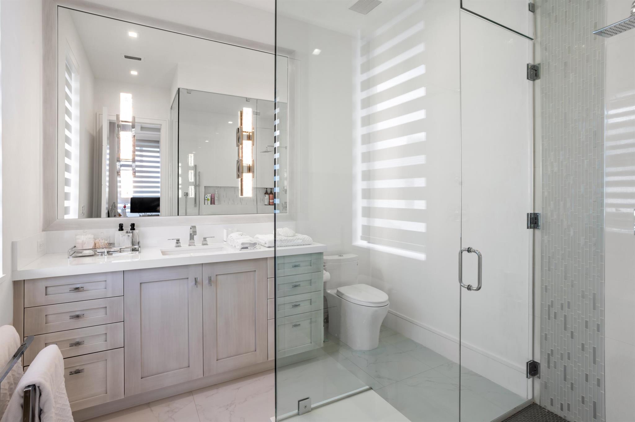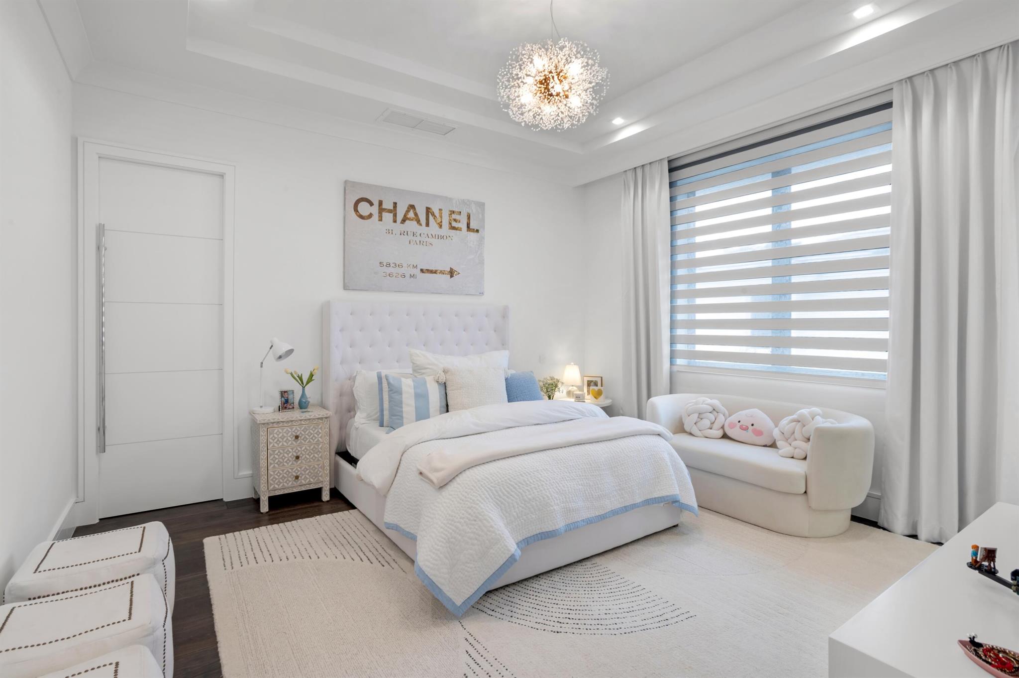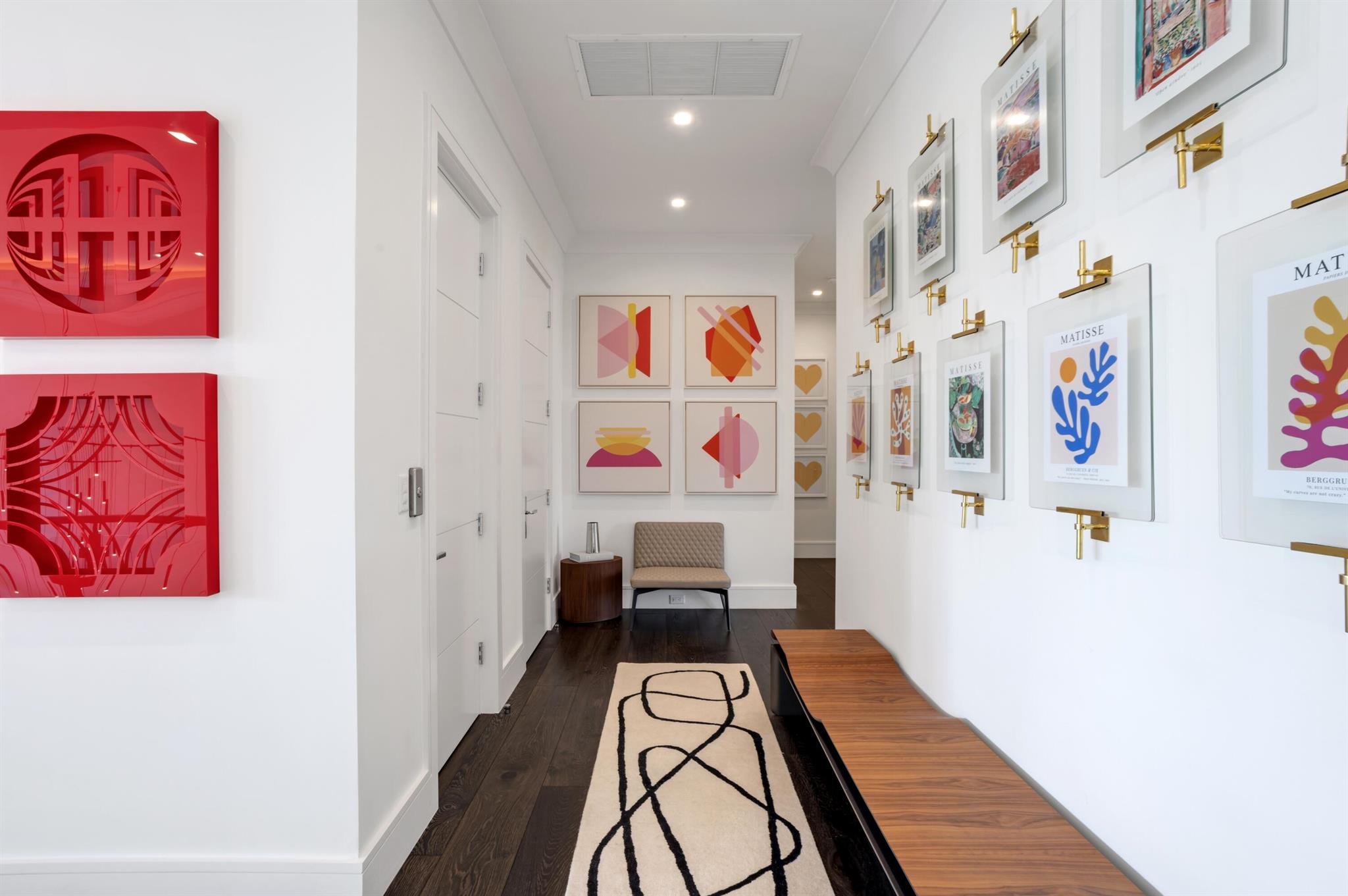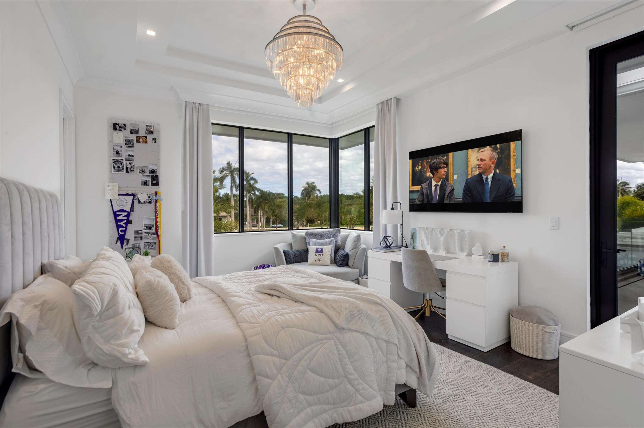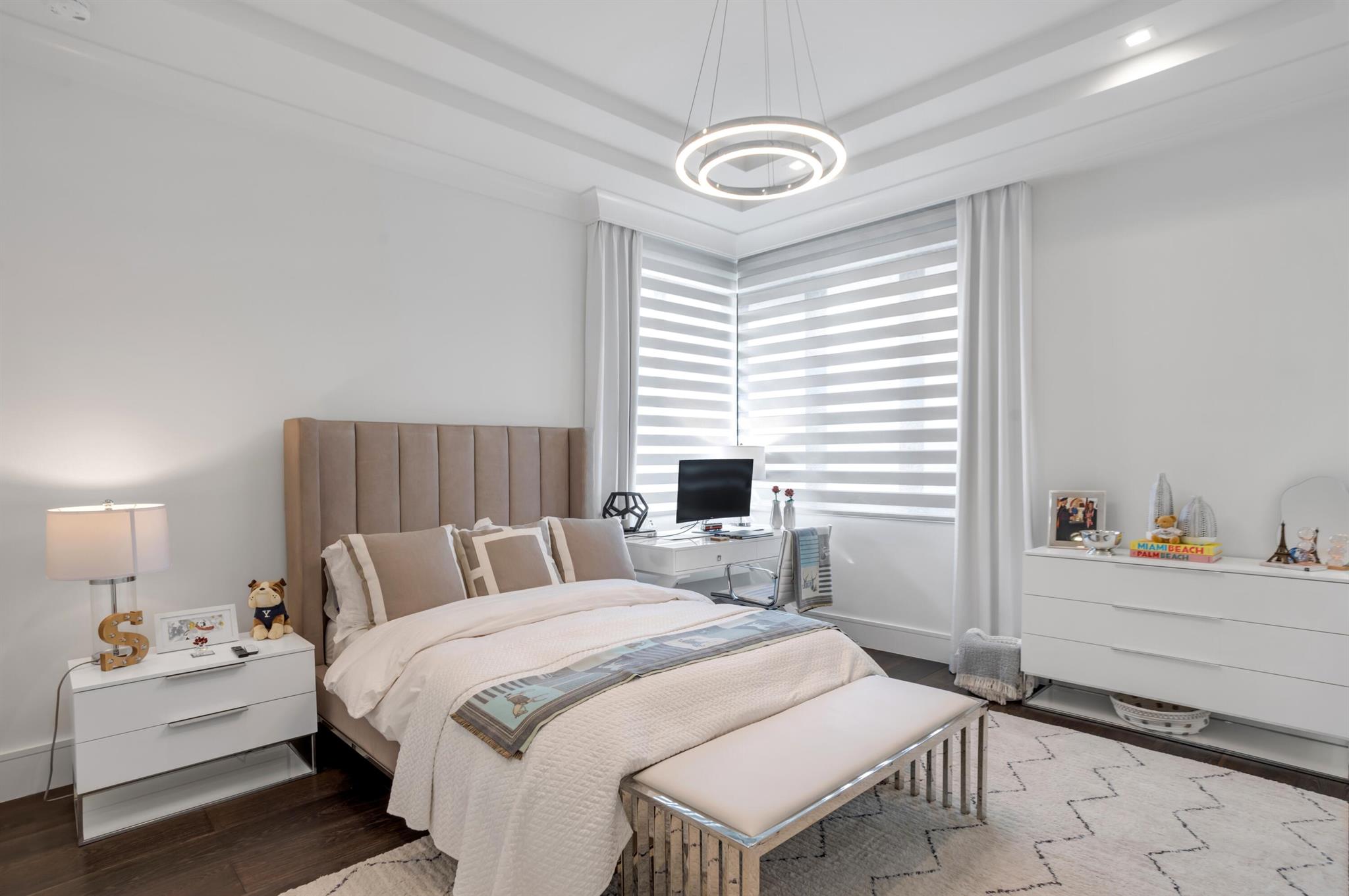 A masterwork of bespoke design, this incredible six-bedroom, 12,228 +/-total-square-foot estate, astutely conceived by Mitch Kunik of Affiniti Architects built in 2021, encapsulates the pinnacle for luxurious living. The spectacular two-story reception hall, with a glass-fronted facade and dramatic floating stairway, welcomes guests into a world of refined elegance. Just beyond the formal dining room, the elegant living room features a 14-foot-high wall of automated sliding glass doors that entirely pocket away, creating a seamless transition to the pool loggia, for an unparalleled indoor-outdoor tropical experience.