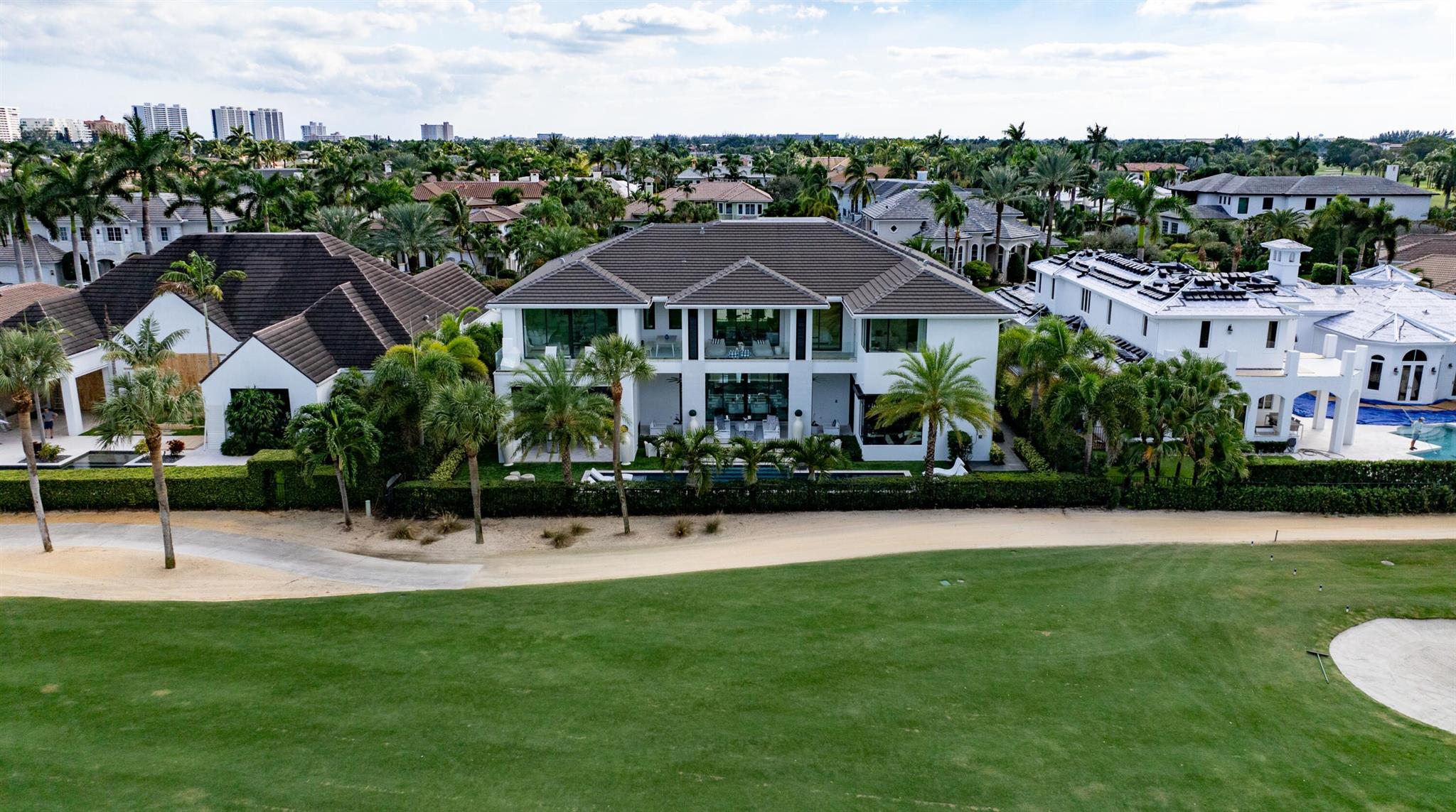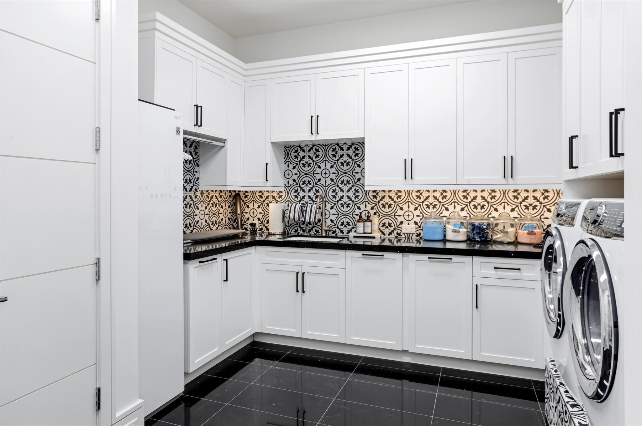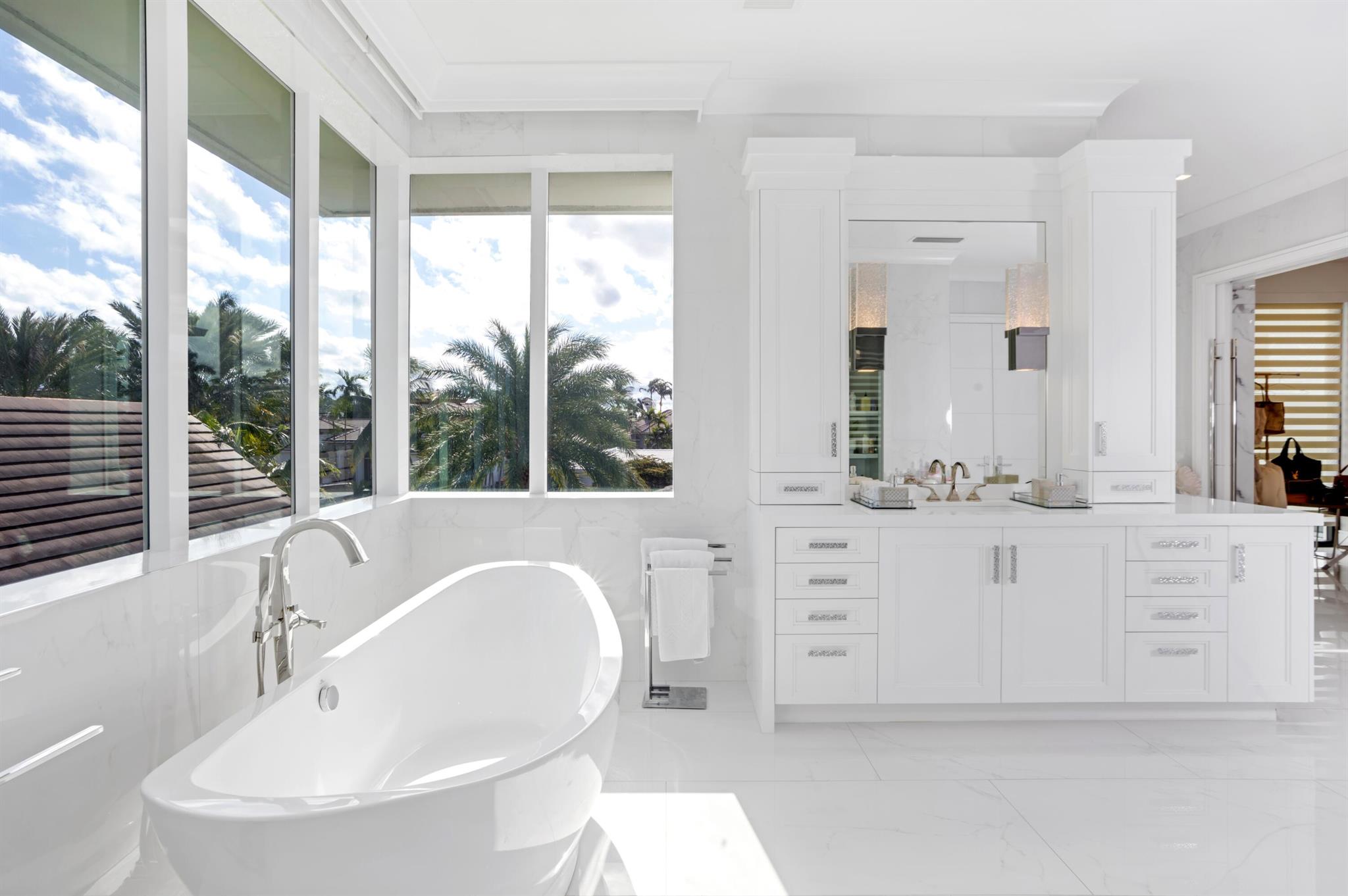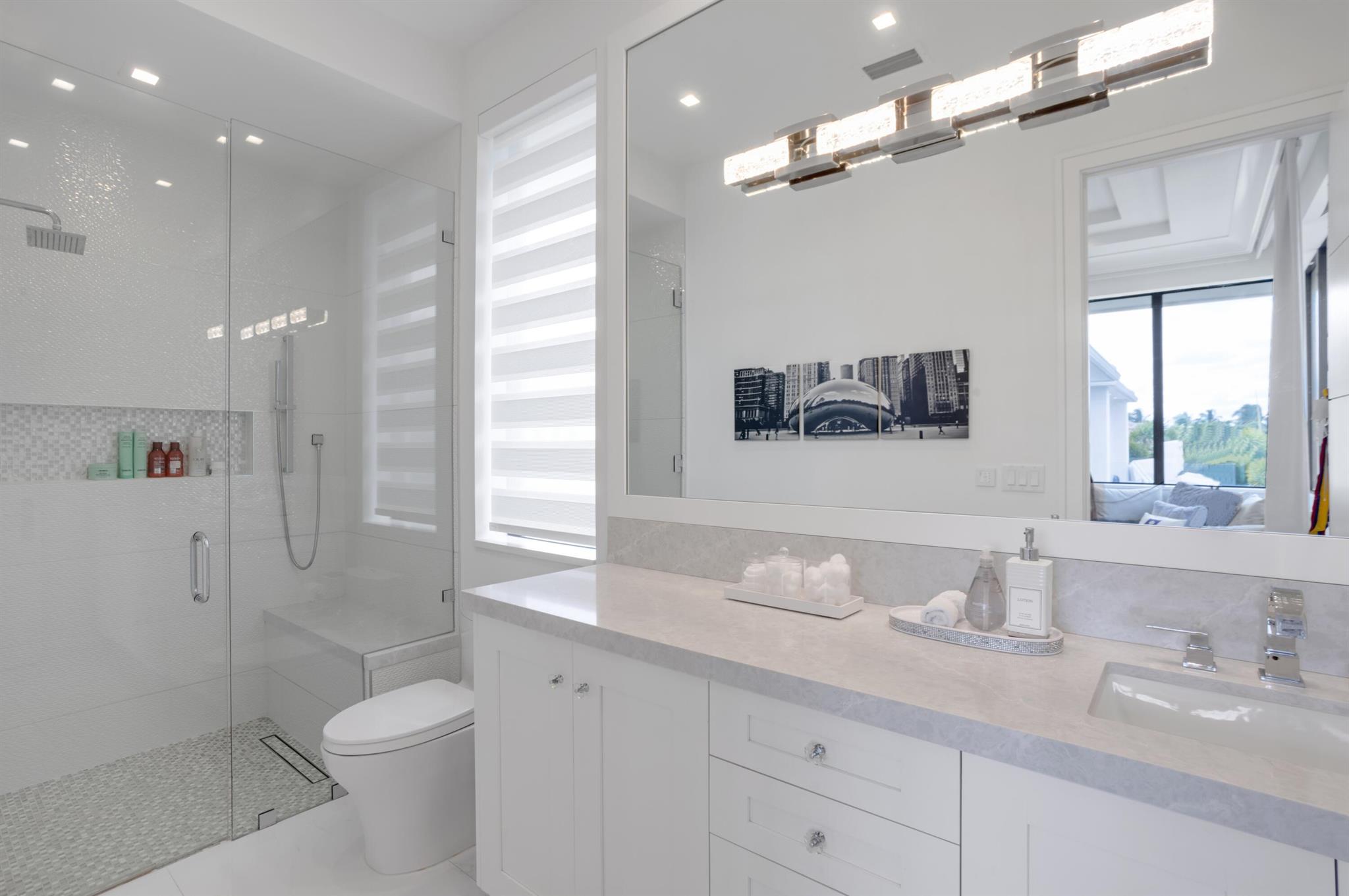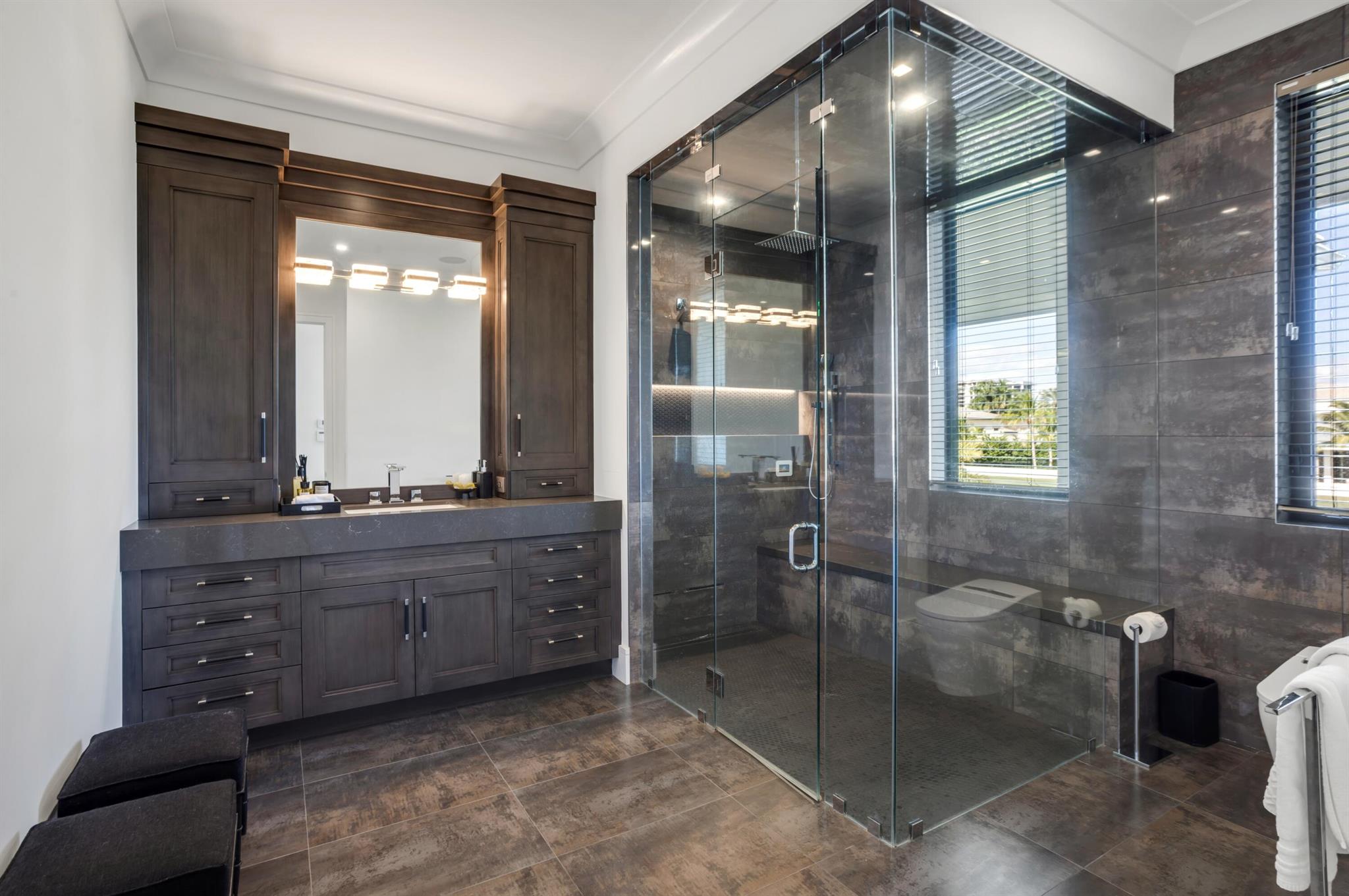 A masterwork of bespoke design, this incredible six-bedroom, 12,228 +/-total-square-foot estate, astutely conceived by Mitch Kunik of Affiniti Architects built in 2021, encapsulates the pinnacle for luxurious living. The spectacular two-story reception hall, with a glass-fronted facade and dramatic floating stairway, welcomes guests into a world of refined elegance. Just beyond the formal dining room, the elegant living room features a 14-foot-high wall of automated sliding glass doors that entirely pocket away, creating a seamless transition to the pool loggia, for an unparalleled indoor-outdoor tropical experience.