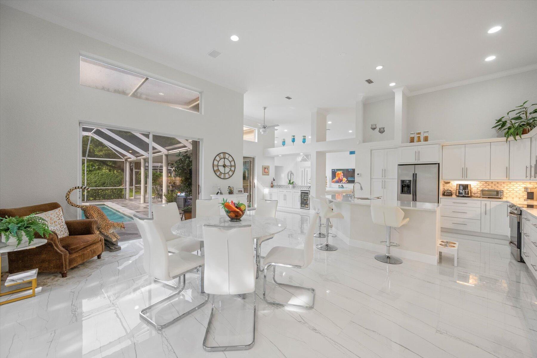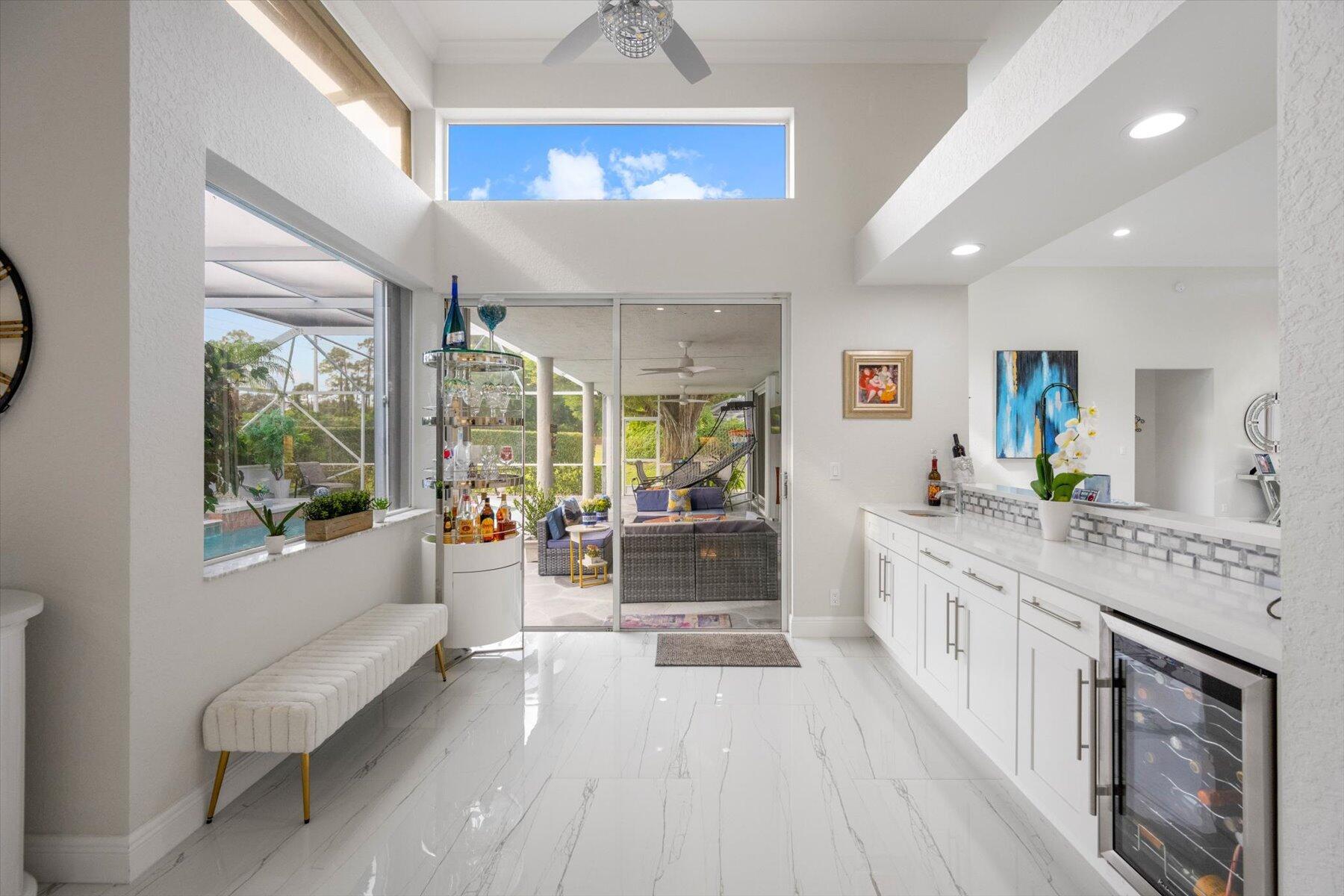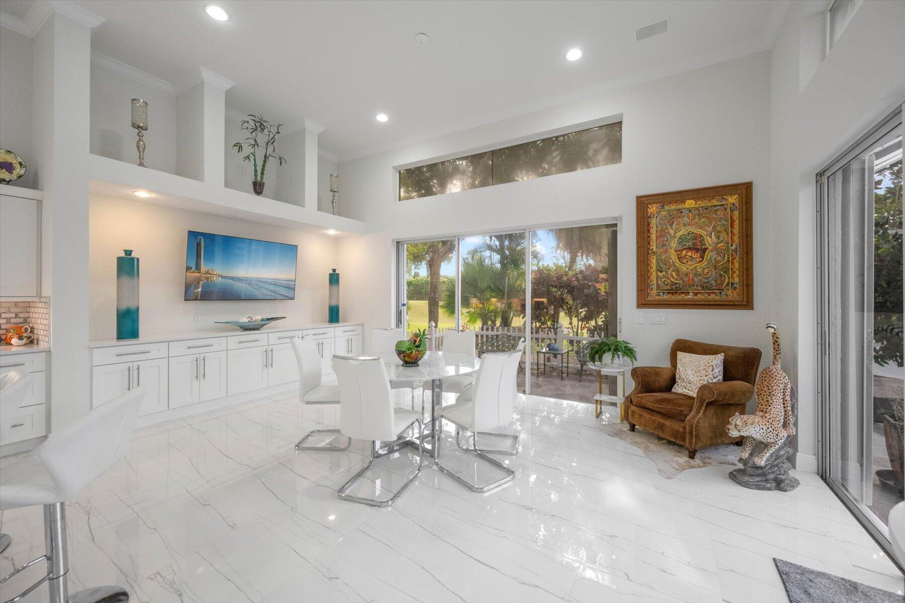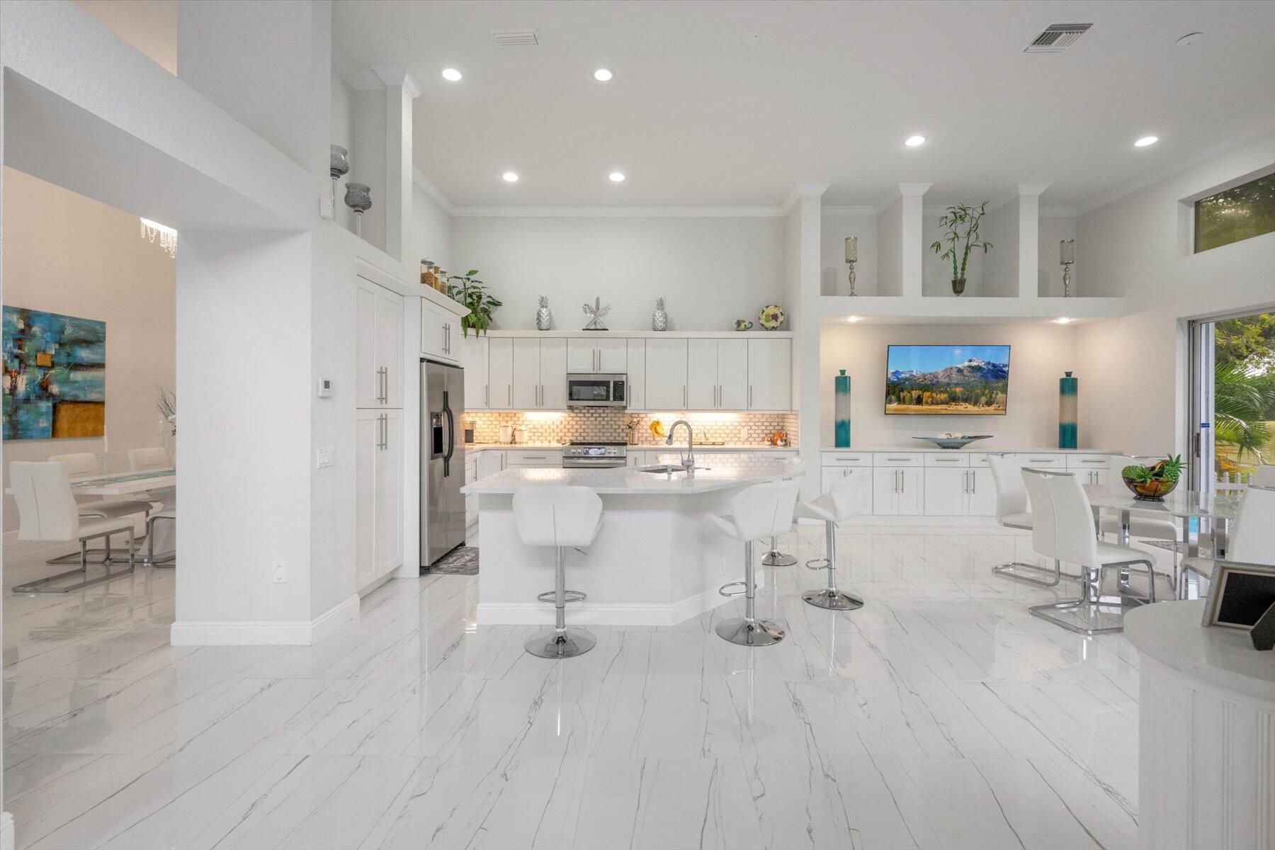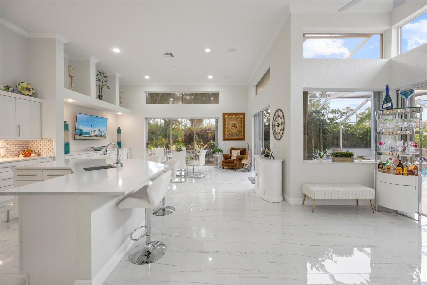Welcome to your dream home in the prestigious Exeter Estates at Wycliffe Golf and Country Club! Boasting a brand new 2024 roof and recently installed 2024 impact transom windows, this exceptional 3-bedroom, 3-bathroom estate residence with a private pool is a masterpiece of modern luxury. Set on the freshly redesigned 15th hole of the East Course, the home has been meticulously maintained with updated landscaping creating stunning curb appeal. Step inside and be captivated by the bright, all-white interior and spacious open floor plan, fully renovated with designer touches throughout. The modern kitchen features a center island with quartz countertops, perfect for casual dining or entertaining, and a sleek wet bar adds to the entertainment possibilities.