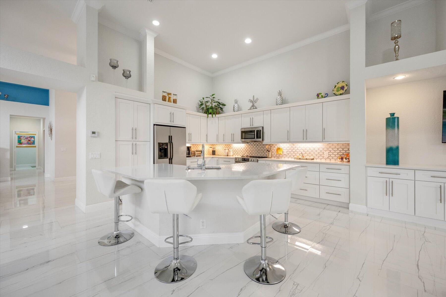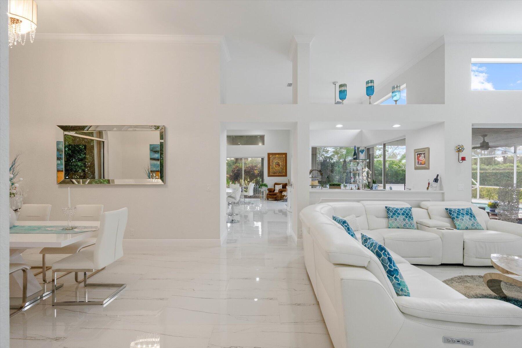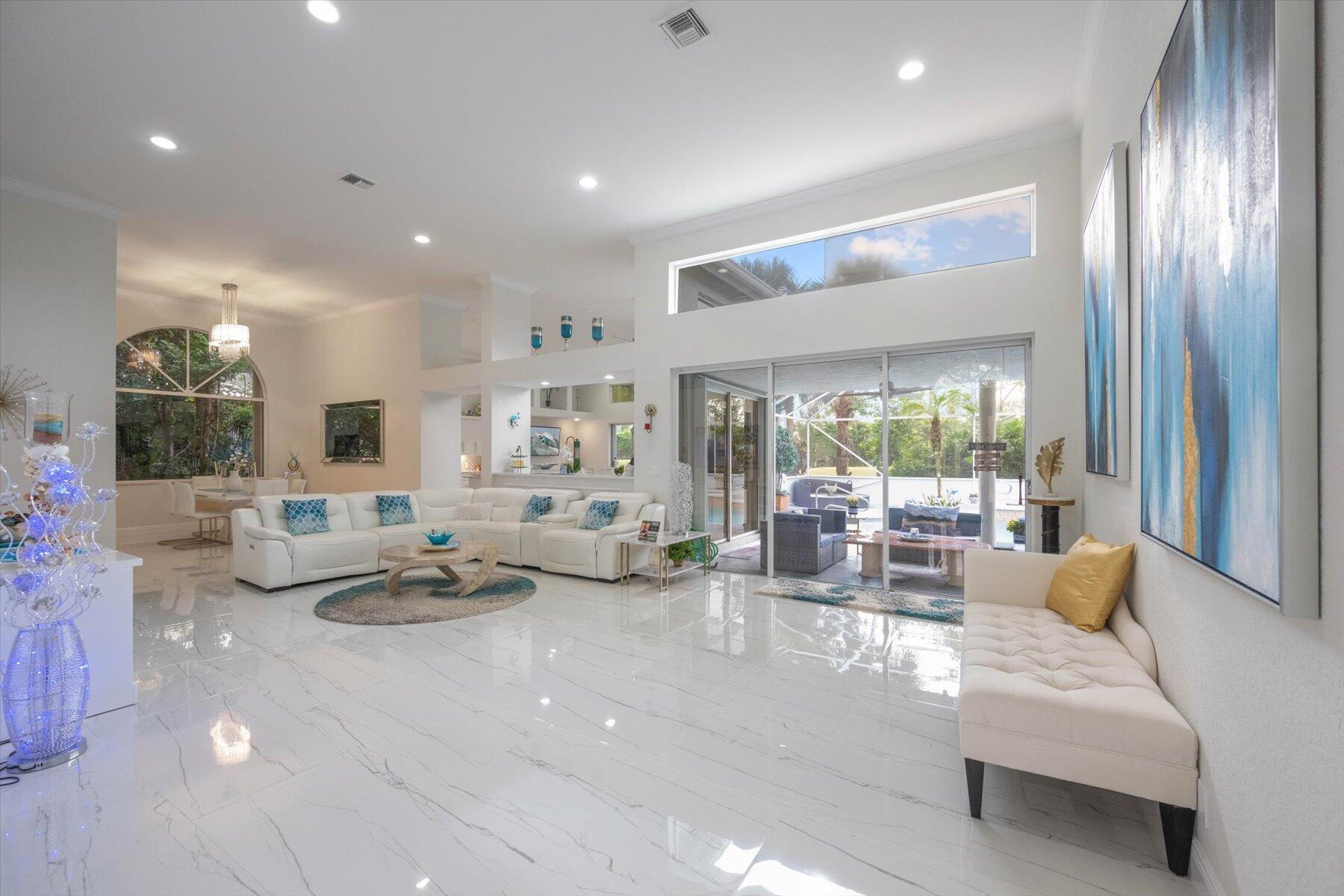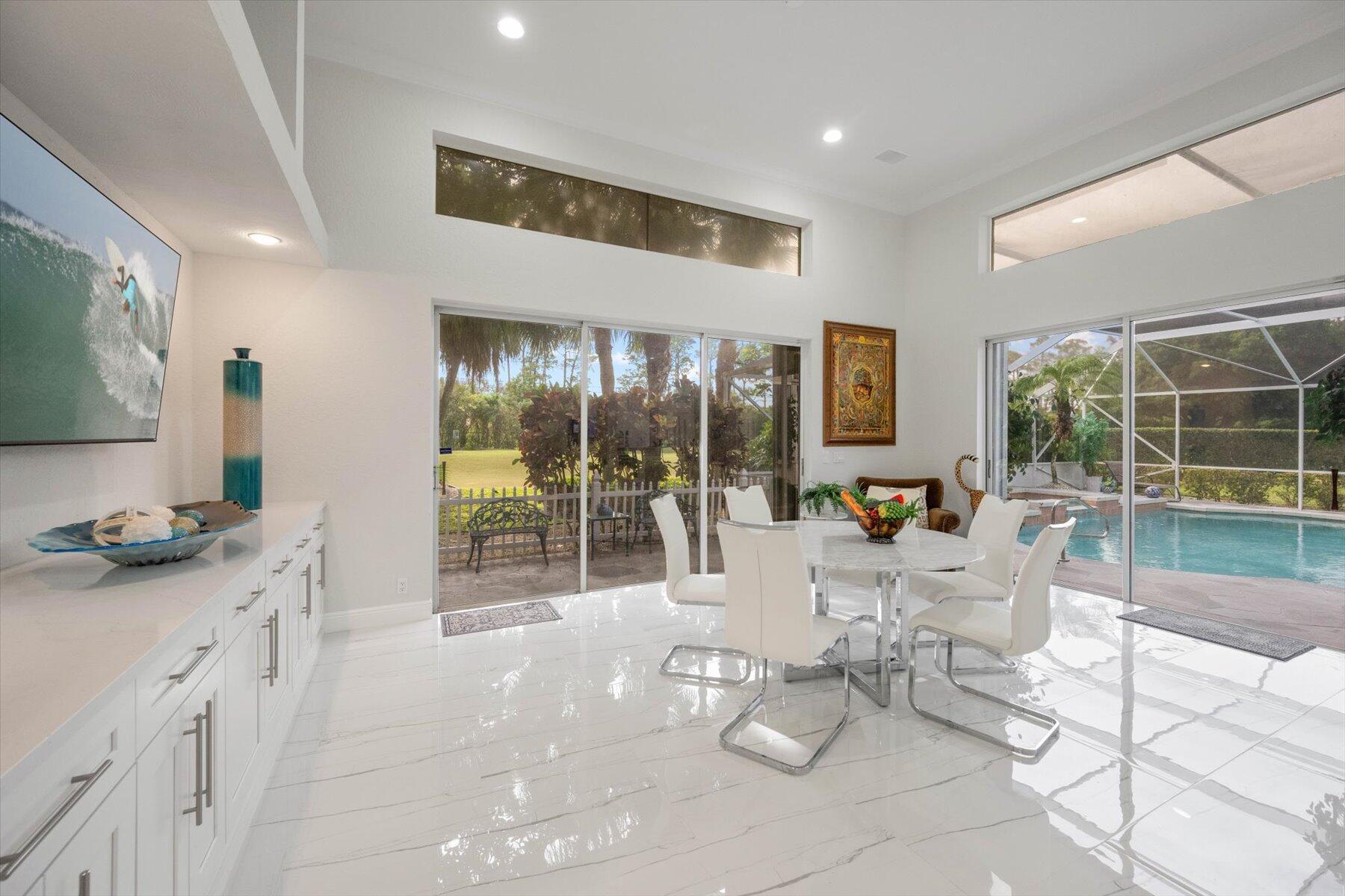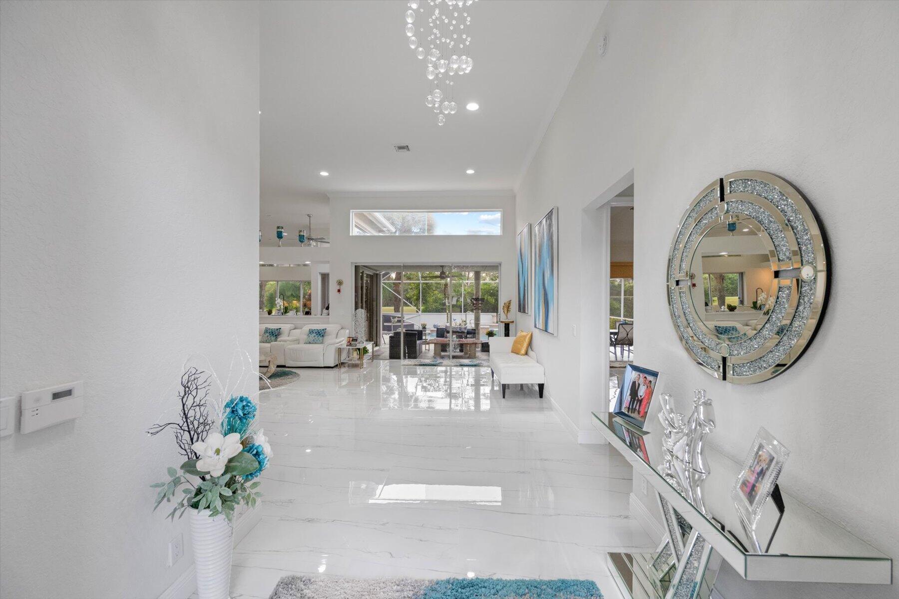 Welcome to your dream home in the prestigious Exeter Estates at Wycliffe Golf and Country Club! Boasting a brand new 2024 roof and recently installed 2024 impact transom windows, this exceptional 3-bedroom, 3-bathroom estate residence with a private pool is a masterpiece of modern luxury. Set on the freshly redesigned 15th hole of the East Course, the home has been meticulously maintained with updated landscaping creating stunning curb appeal. Step inside and be captivated by the bright, all-white interior and spacious open floor plan, fully renovated with designer touches throughout. The modern kitchen features a center island with quartz countertops, perfect for casual dining or entertaining, and a sleek wet bar adds to the entertainment possibilities.
