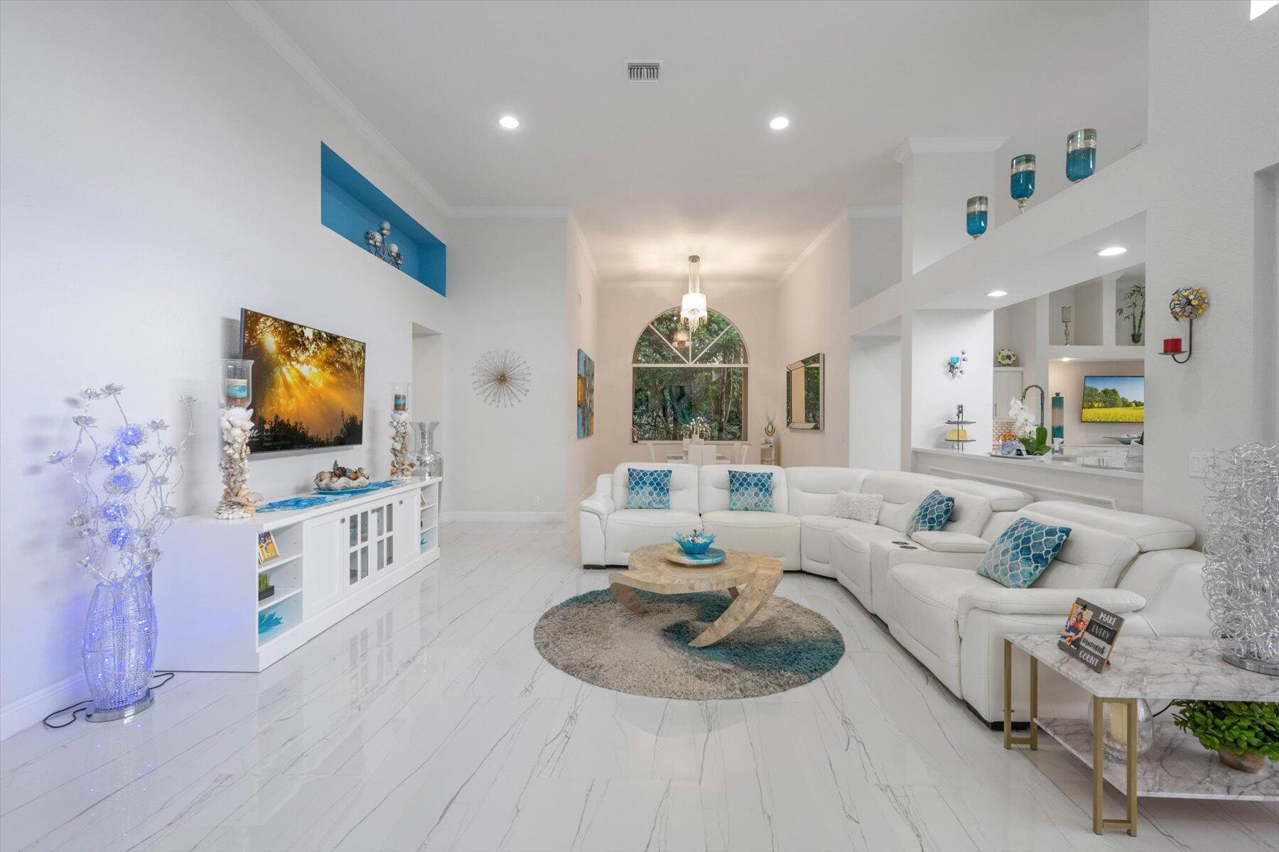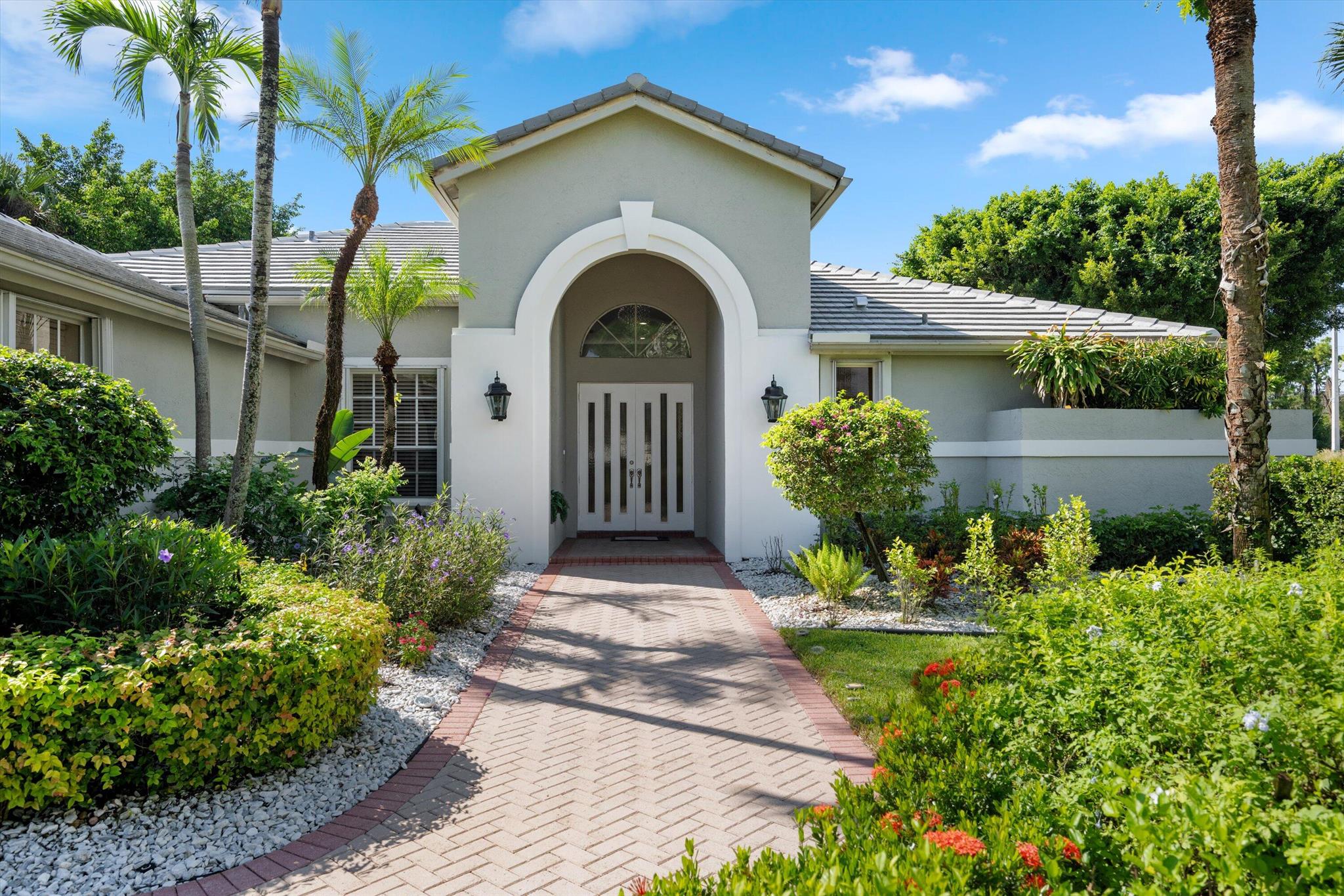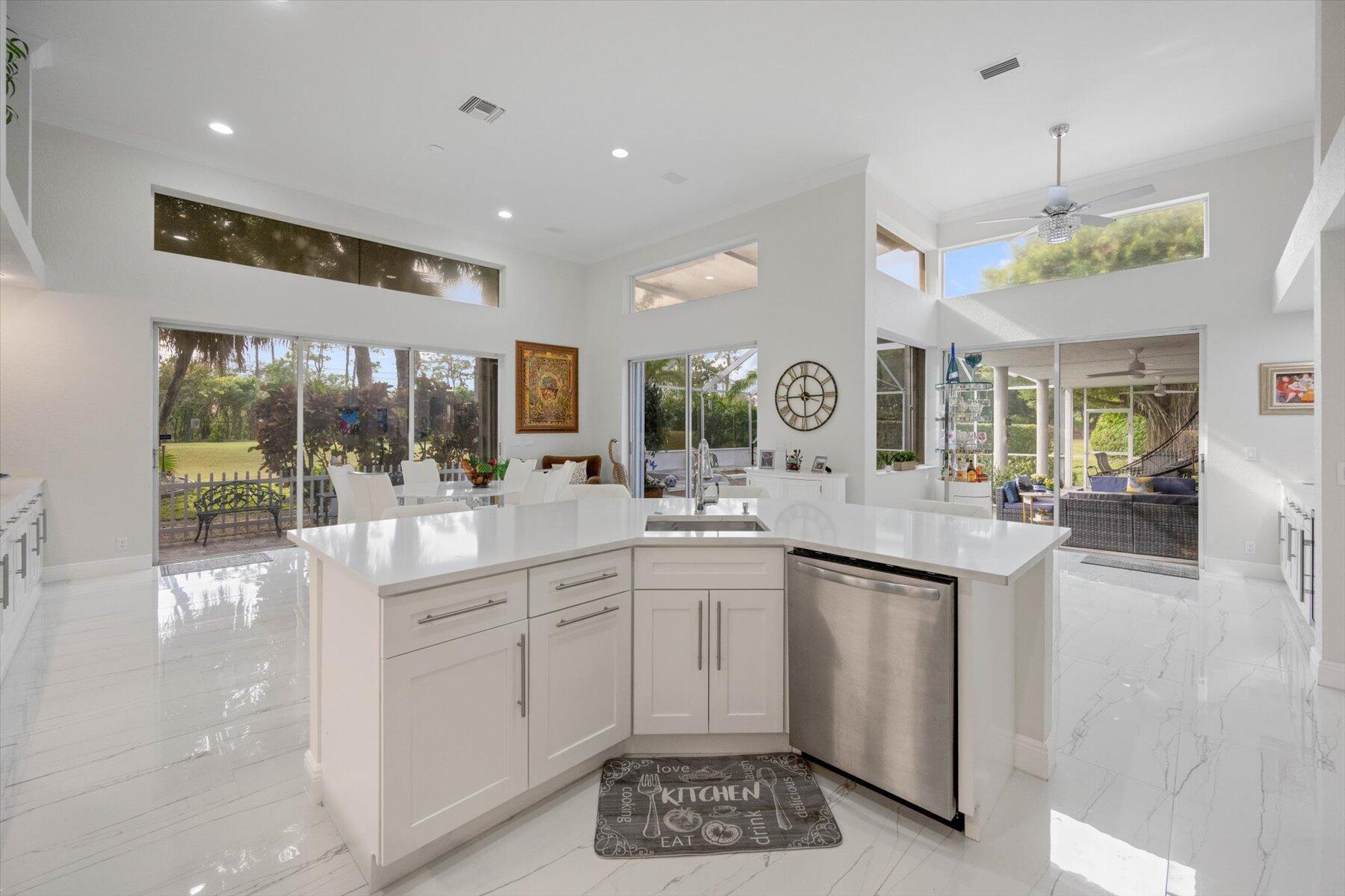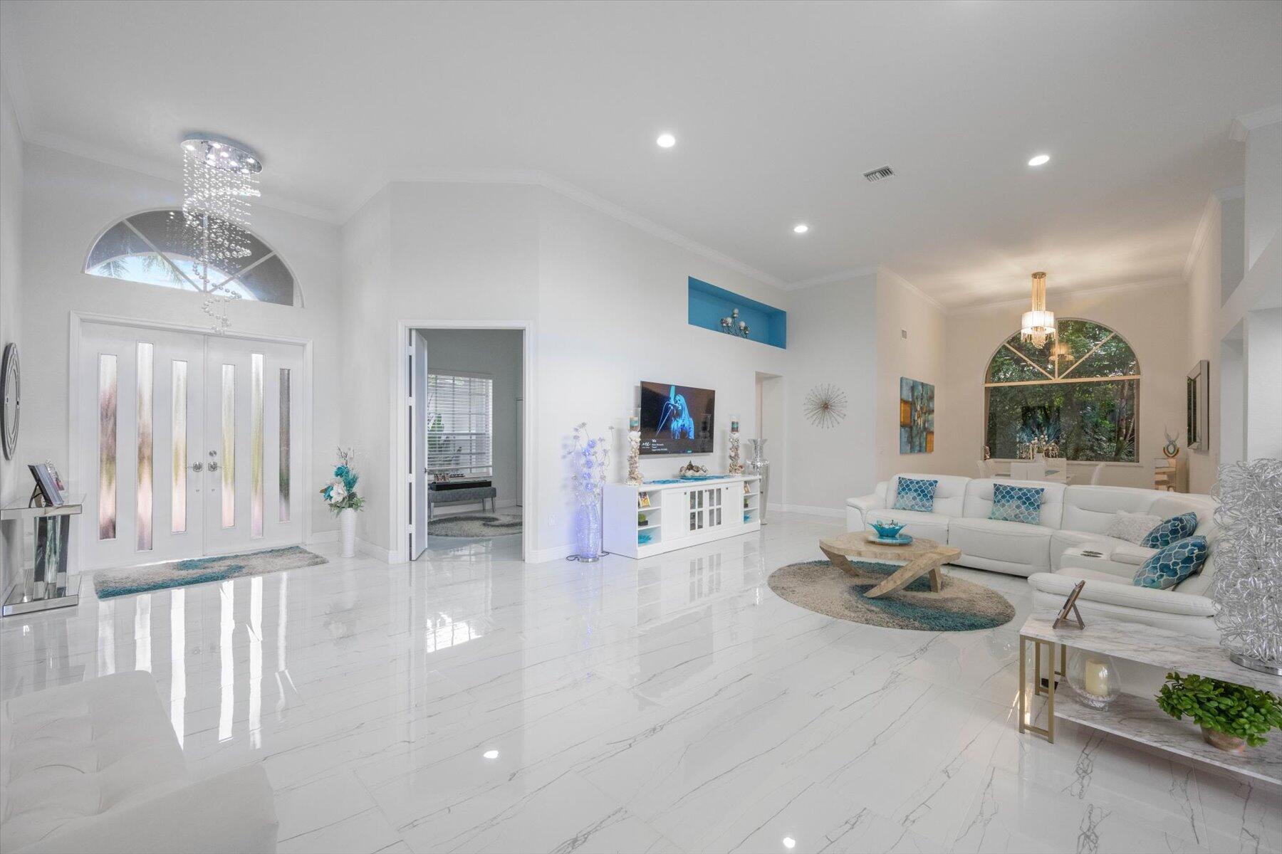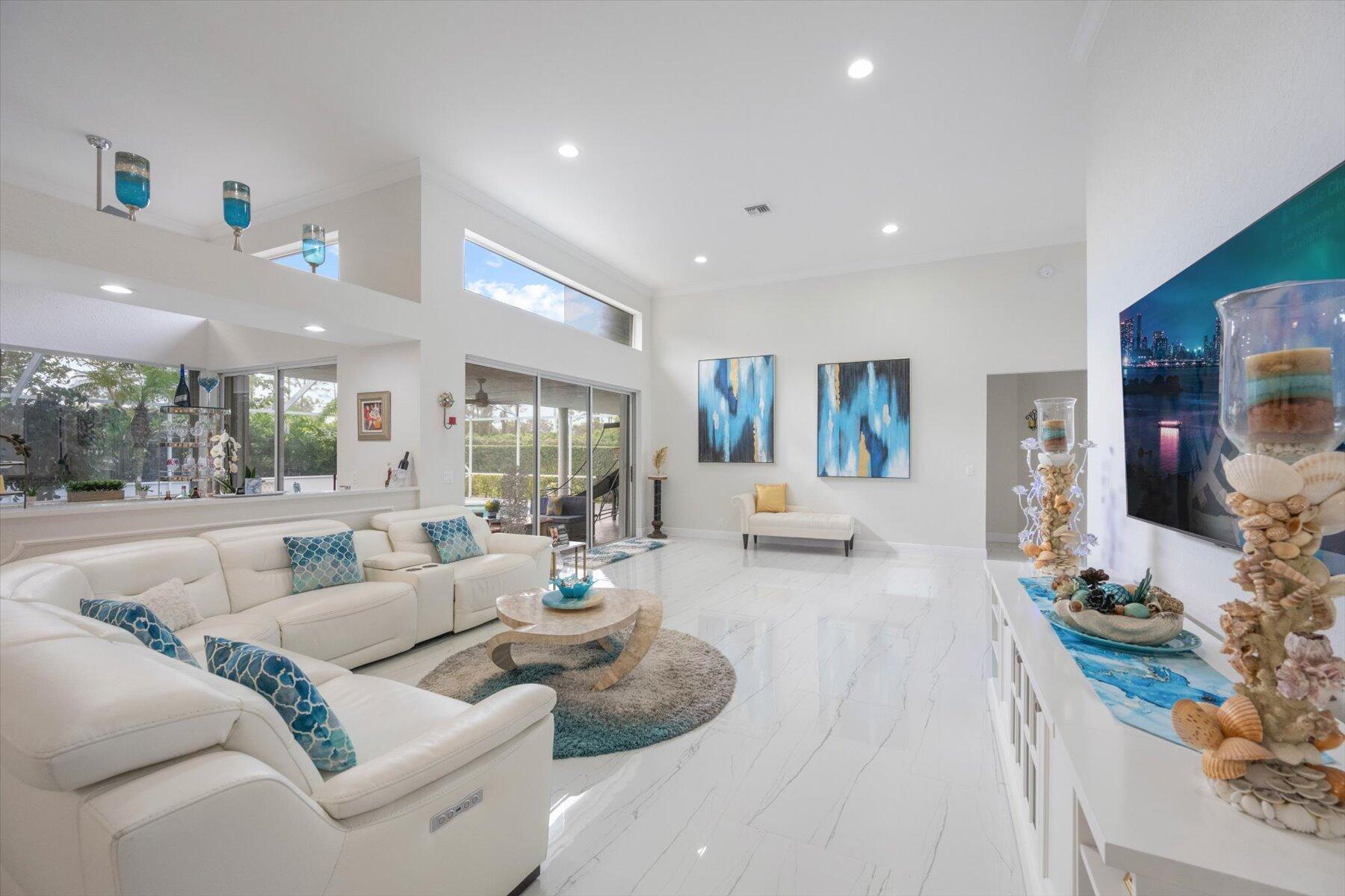Welcome to your dream home in the prestigious Exeter Estates at Wycliffe Golf and Country Club! Boasting a brand new 2024 roof and recently installed 2024 impact transom windows, this exceptional 3-bedroom, 3-bathroom estate residence with a private pool is a masterpiece of modern luxury. Set on the freshly redesigned 15th hole of the East Course, the home has been meticulously maintained with updated landscaping creating stunning curb appeal. Step inside and be captivated by the bright, all-white interior and spacious open floor plan, fully renovated with designer touches throughout. The modern kitchen features a center island with quartz countertops, perfect for casual dining or entertaining, and a sleek wet bar adds to the entertainment possibilities.