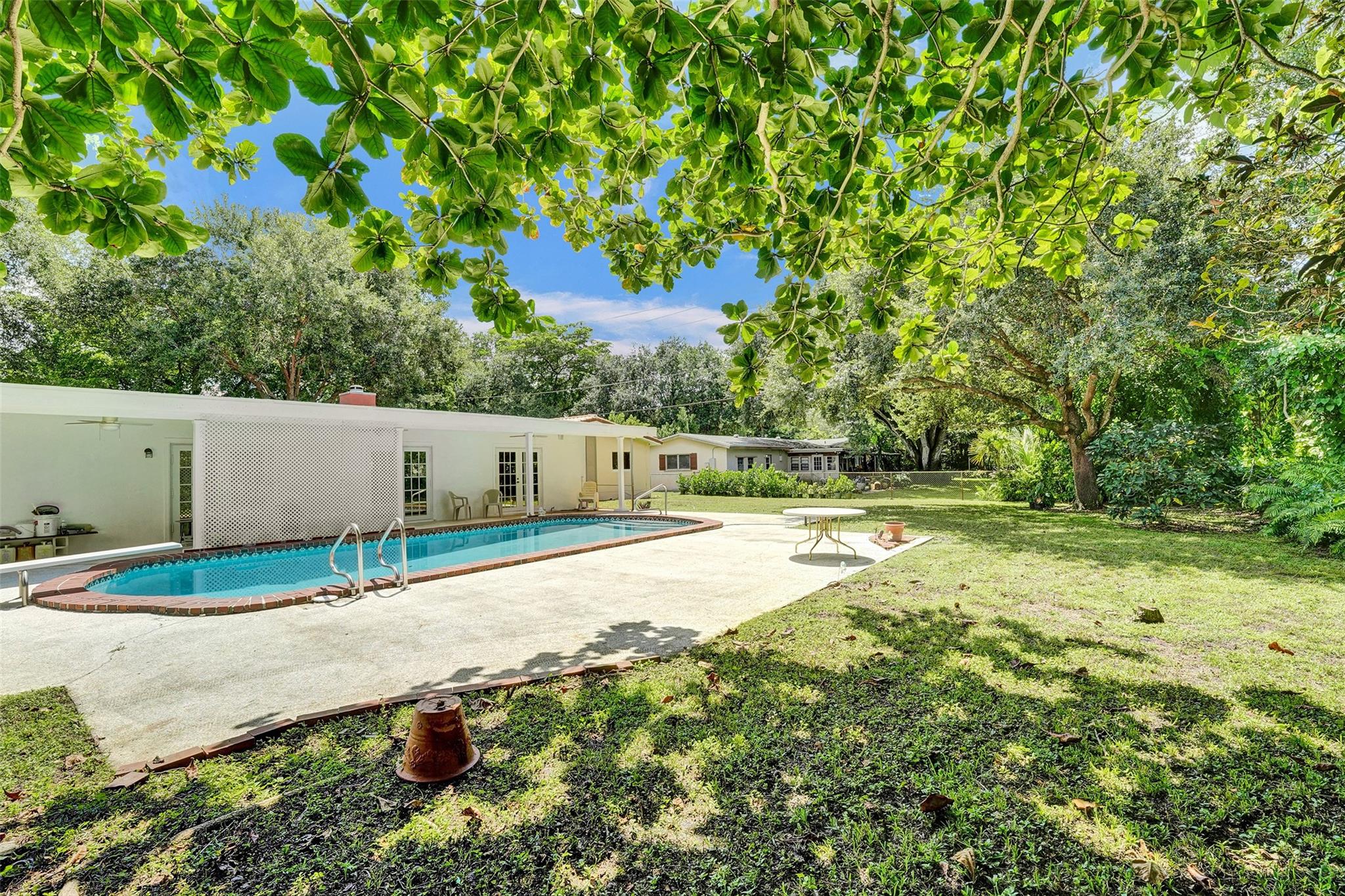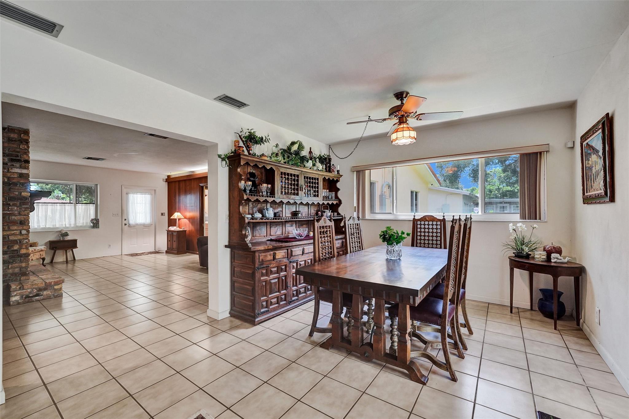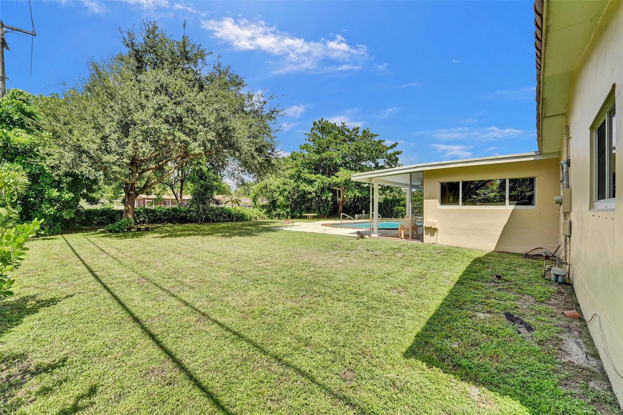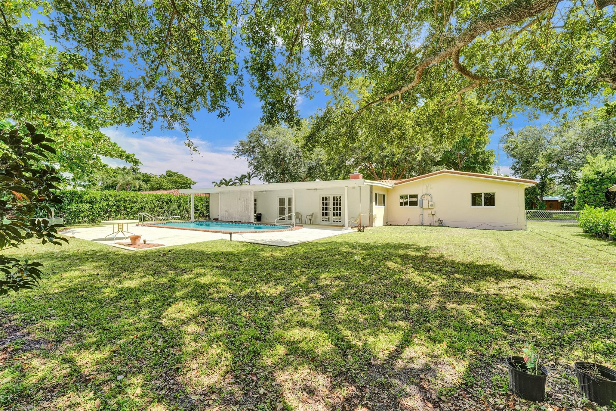 Welcome to this 3-bedroom, 2-bath home on a tree-lined street in Plantation! The updated kitchen boasts granite countertops, wood cabinets, and walk-in pantry. Partial cast iron replacement of sewer and full water line replacement. The dining room offers a view of the oversized 9″ deep pool & terrazo patio. Real pecky cedar family room. Termite warranty vaild until 3-2025. Tinted hurricane impact french doors, garage door and windows offer privacy and security. This home also features a cozy wood-burning fireplace with real chicago bricks in one of two flexible living spaces. The 2½-car garage (598 sq feet) provides plenty of storage, and NO HOA! Entrance to Plantation Woods Park, Hoffman Library and the Community Center from Gardenia Lane. Close to shops, restaurants, and major highways.