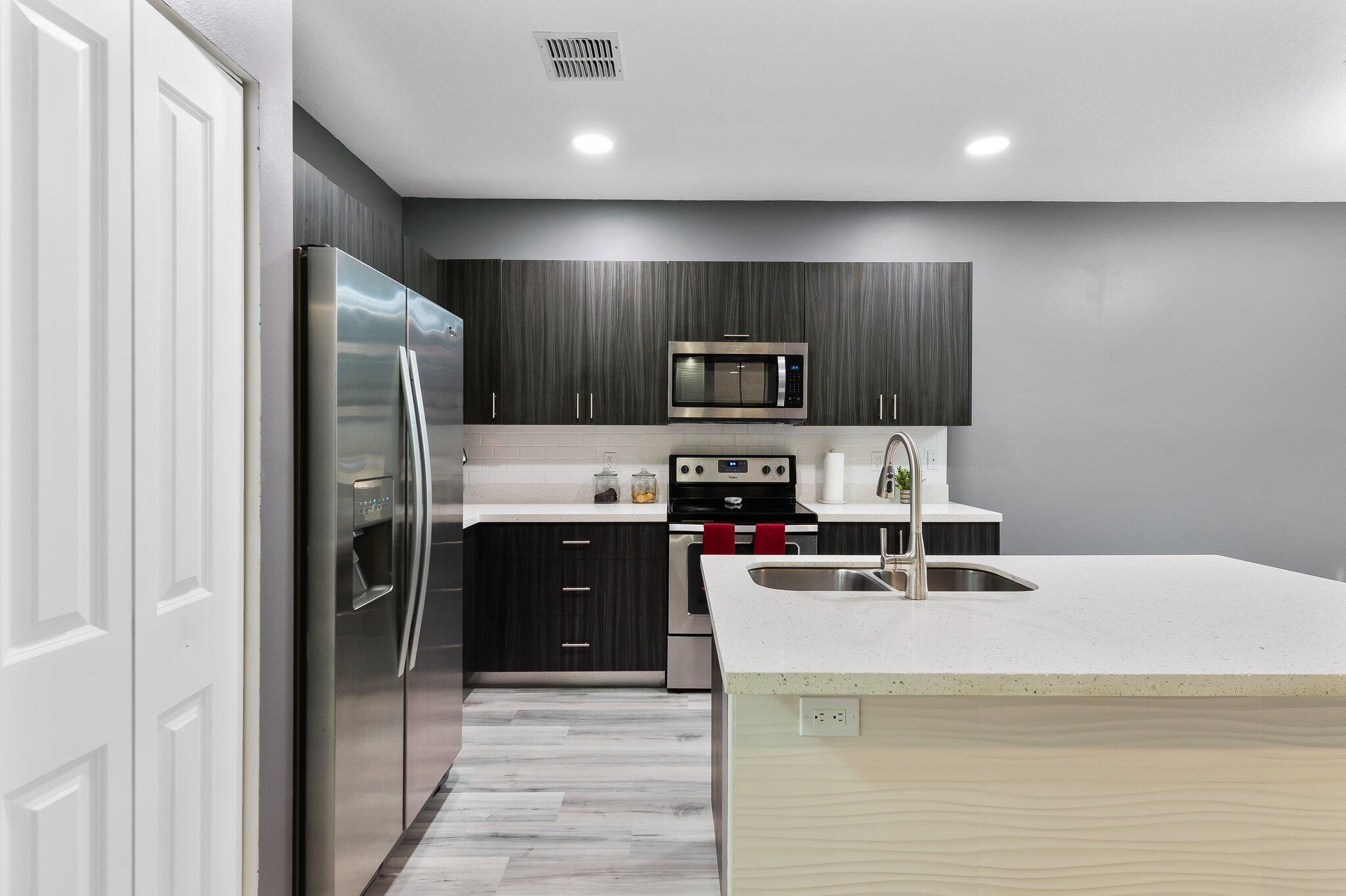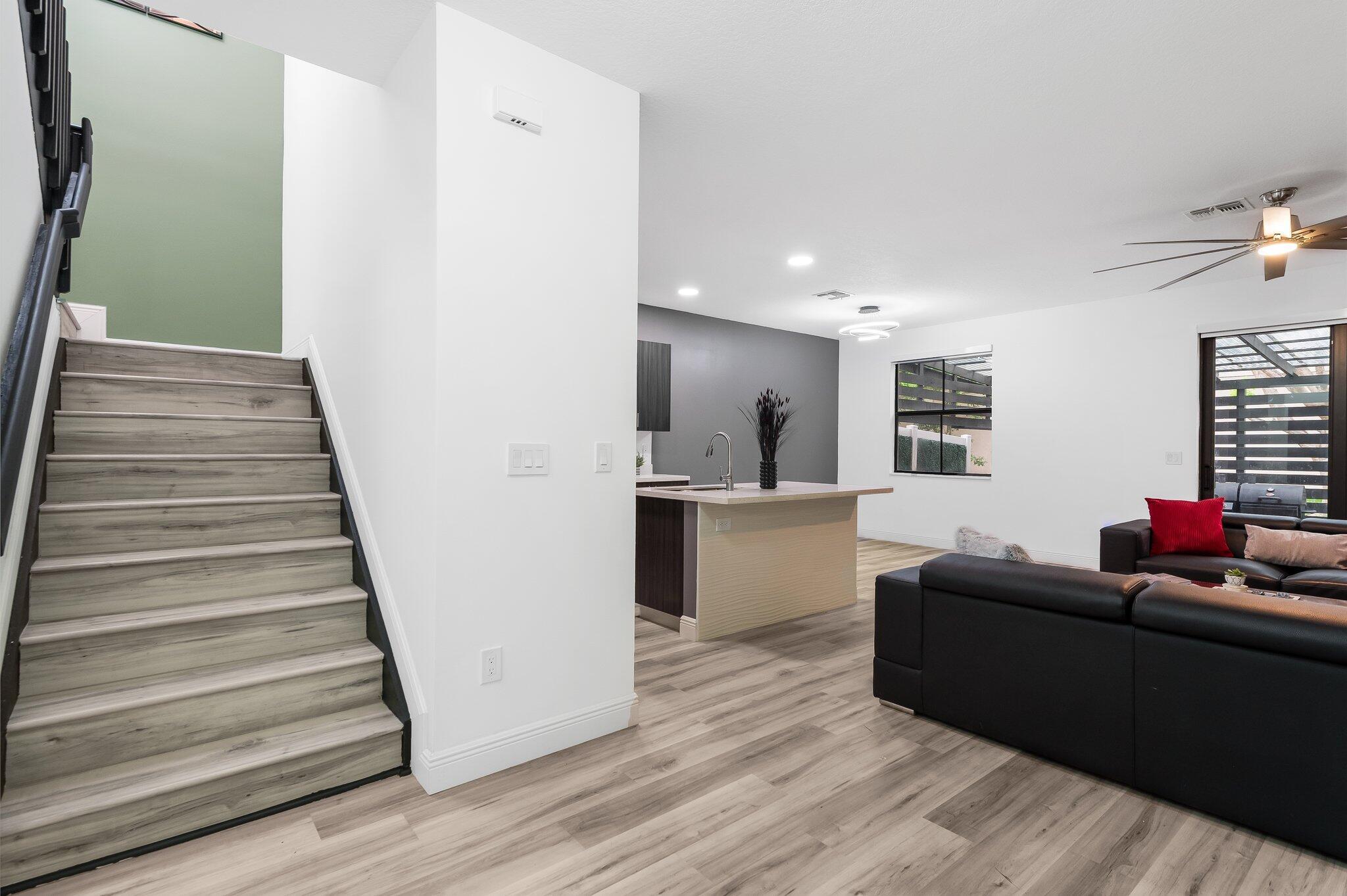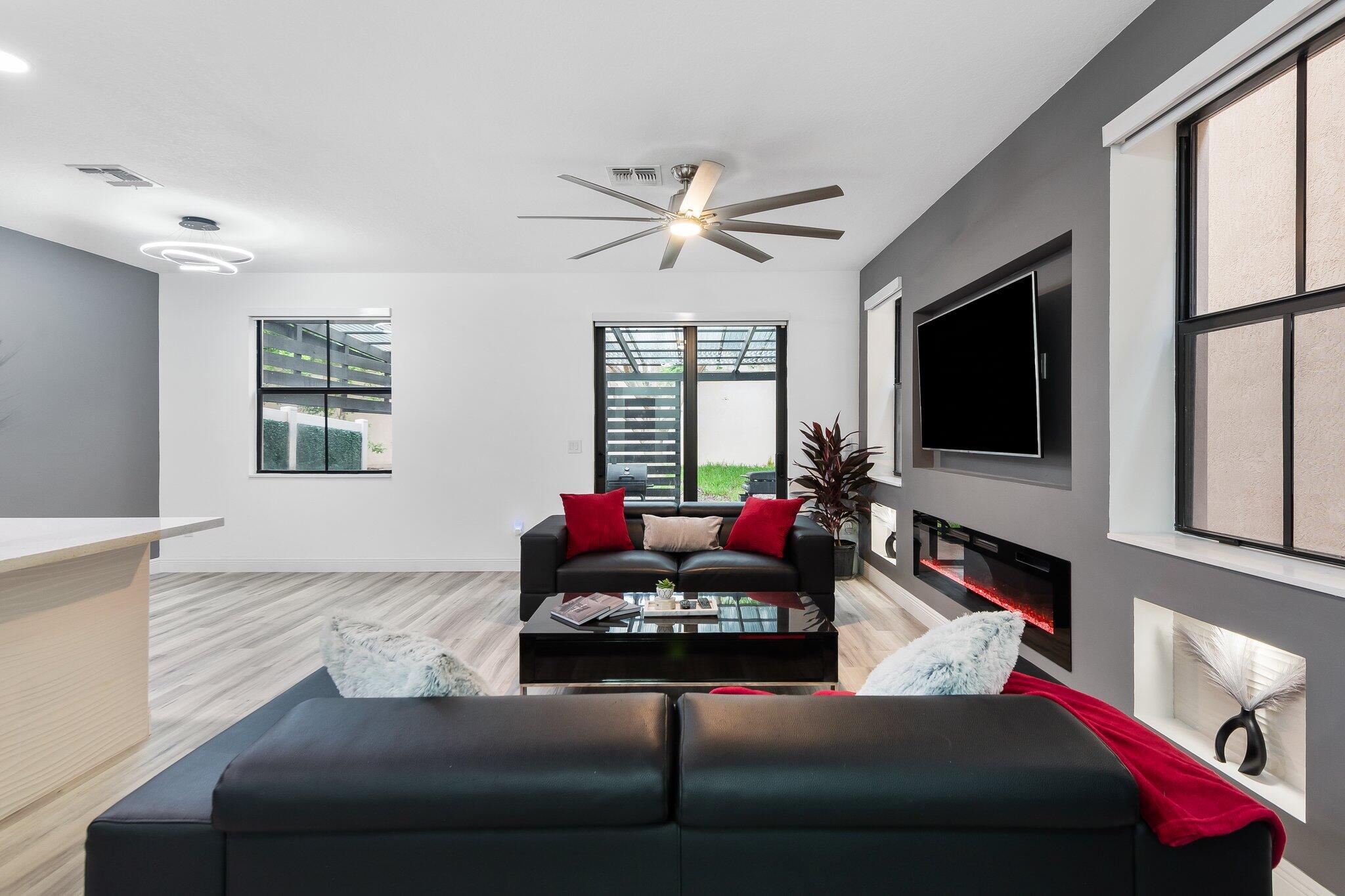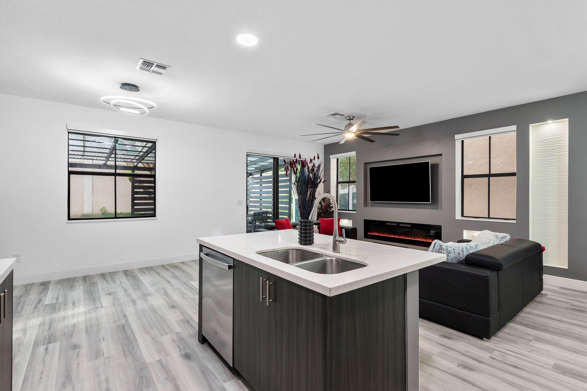 Exquisitely designed two-story home nestled in the prestigious Central Park community of Tamarac, Florida. This stunning single-family residence, built in 2016, offers the perfect blend of modern luxury and practicality. As you step inside, you are greeted by a bright and spacious open concept layout that flows seamlessly from room to room. Over $35,000 in renovations have been meticulously invested, showcasing newly installed luxury vinyl flooring and energy-efficient LED recessed lighting throughout. Elegant geometric LED chandeliers adorn the dining and stairway areas, adding a touch of sophistication. The gourmet kitchen has been thoughtfully updated with quartz countertops, stylish tile backsplash, and top-of-the-line stainless steel appliances, including a brand new dishwasher