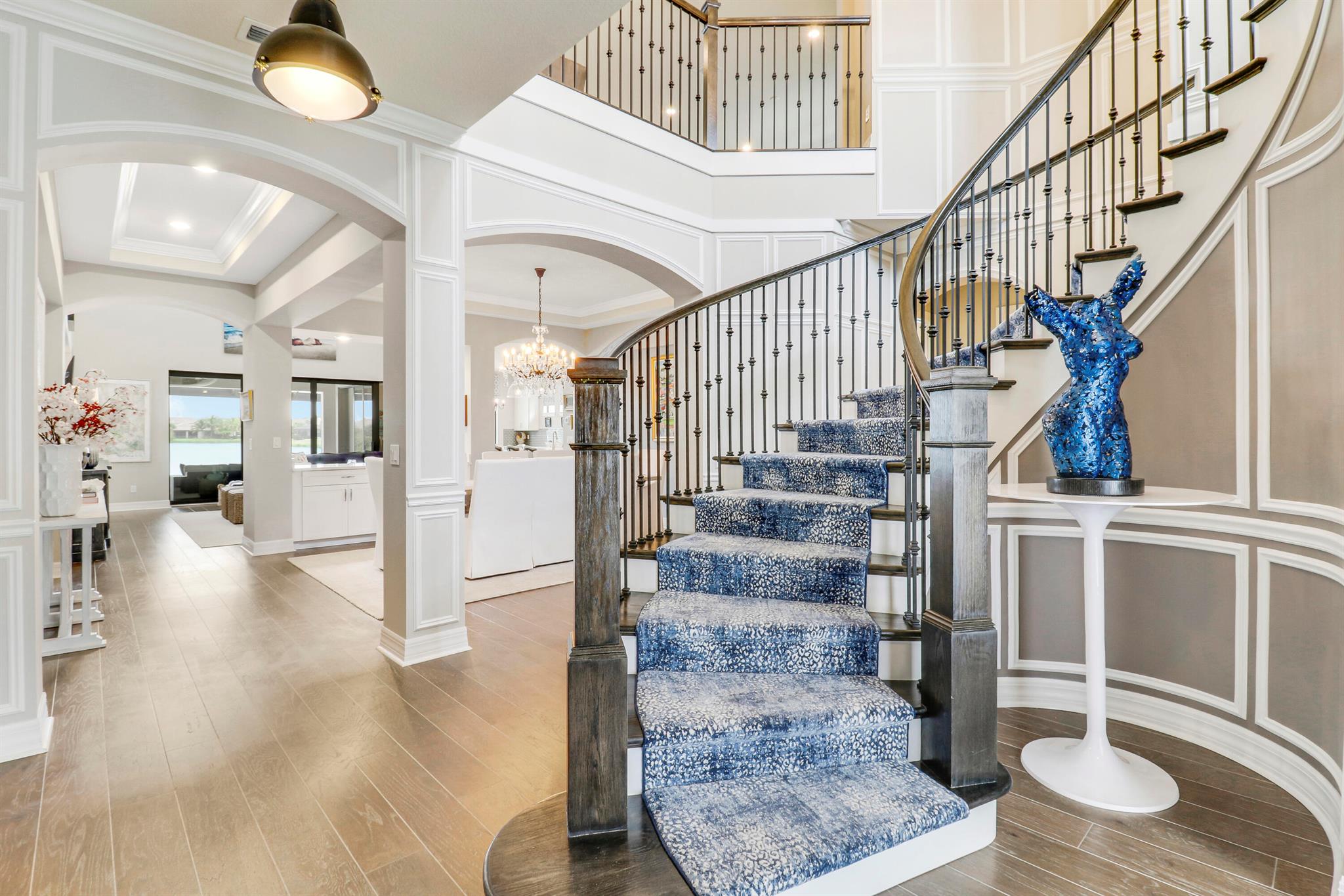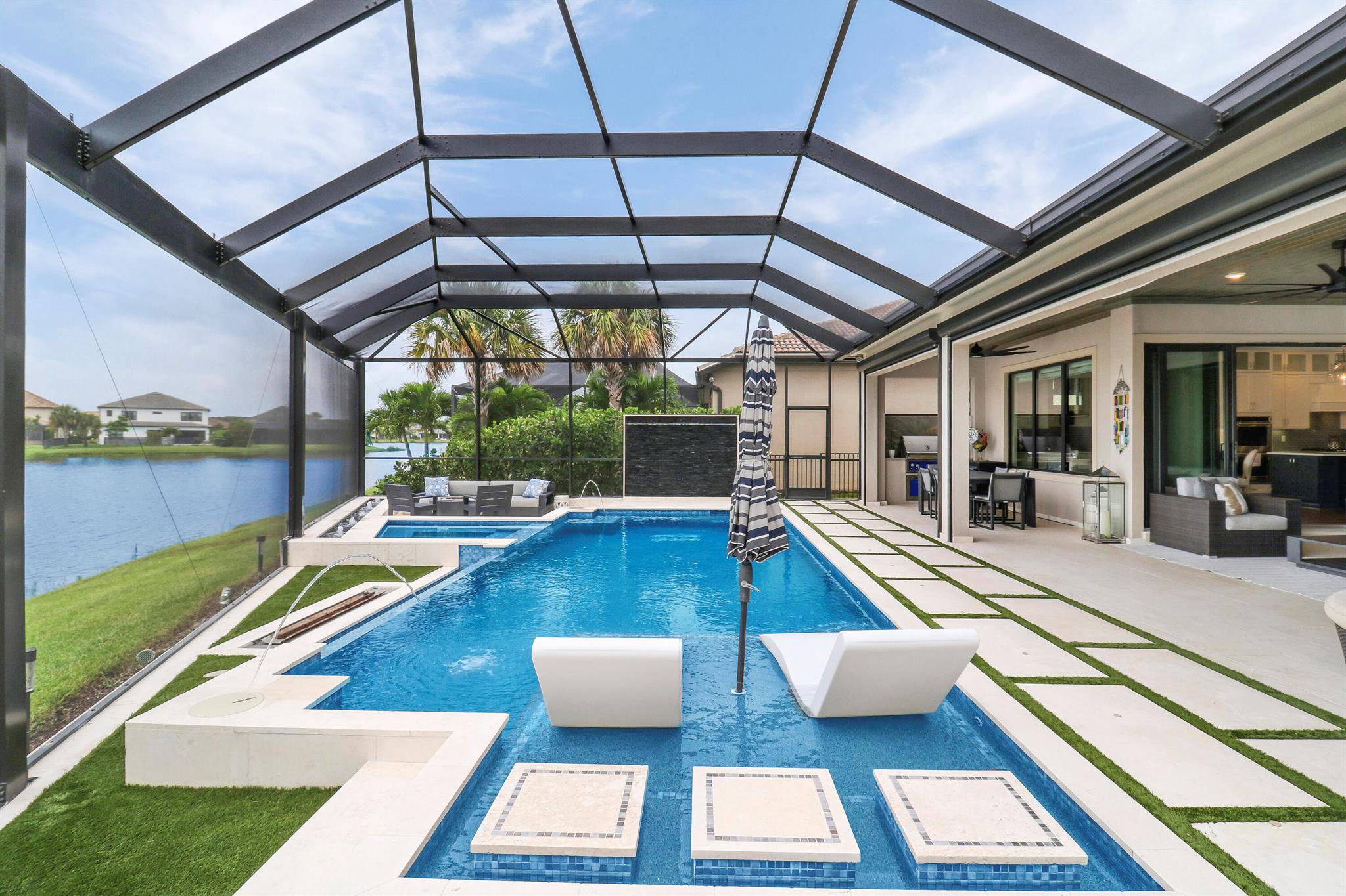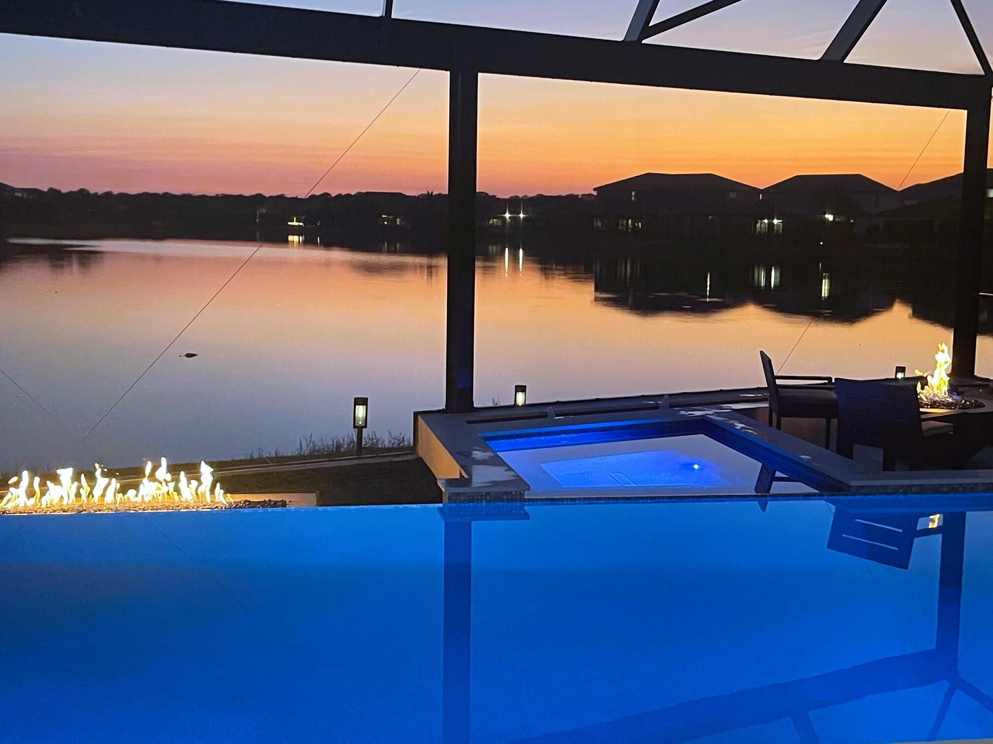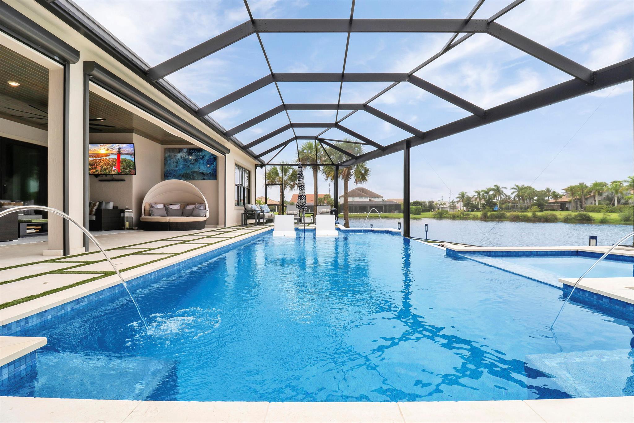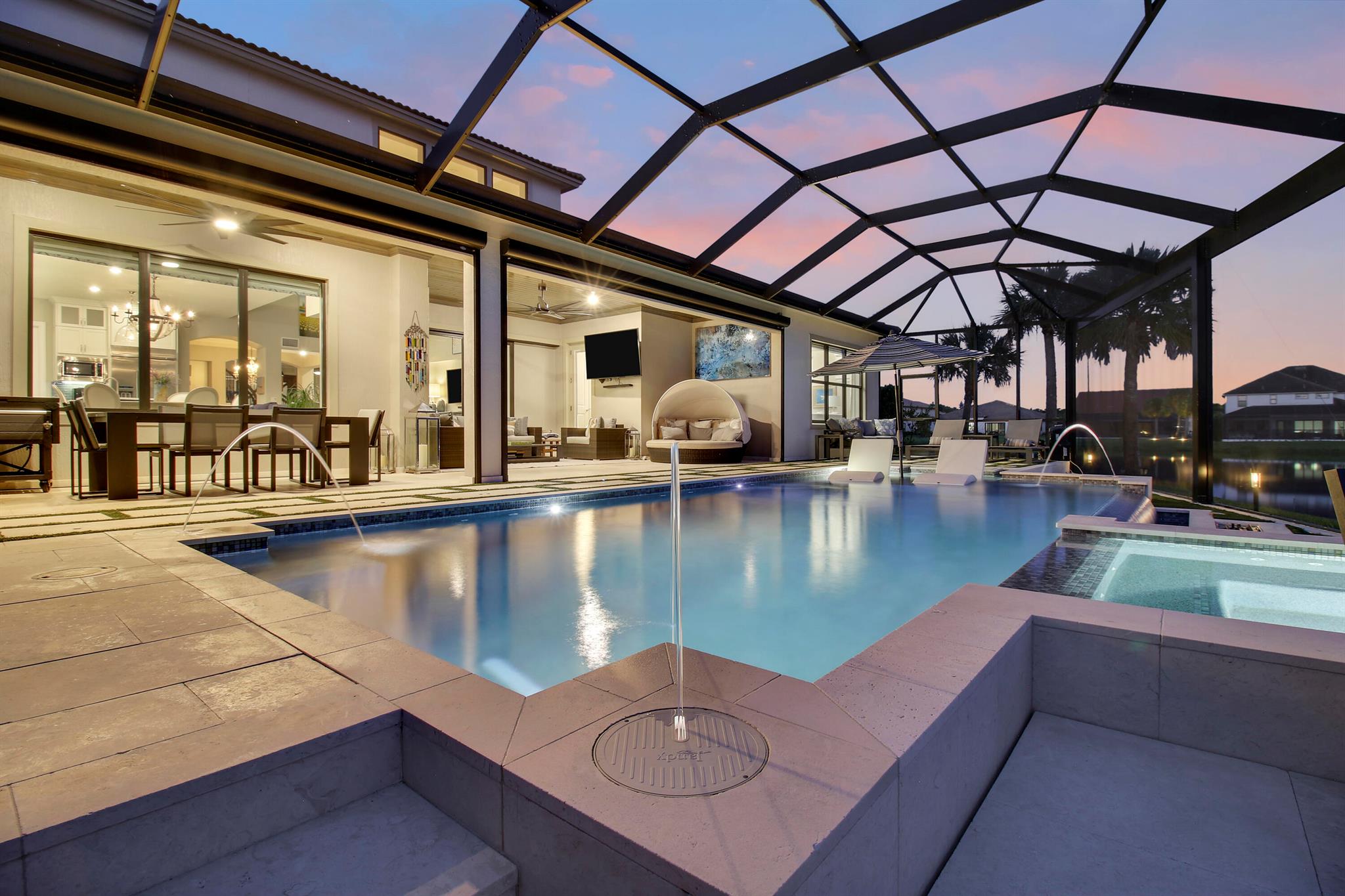 This stunning 6-bedroom, 7.5-bath home is a true entertainer’s dream, situated on a prime lakefront lot. With over 5,100/sf of living space, there is plenty of room for relaxation and hosting guests. The gourmet kitchen features extended cabinetry and designer lighting, while the elegant upgrades throughout the home include wallpaper, moldings and window treatments. The first floor includes an oversized primary bedroom with a large sitting area and spacious bath along with two additional bedrooms and 4 baths. Upstairs, you’ll find a home theatre, loft area, and 3 guest suites. The house is surrounded by water, creating a peaceful atmosphere with the infinity edge pool as the centerpiece. This home offers a luxurious lifestyle in a beautiful setting, perfect for those who love to entertain