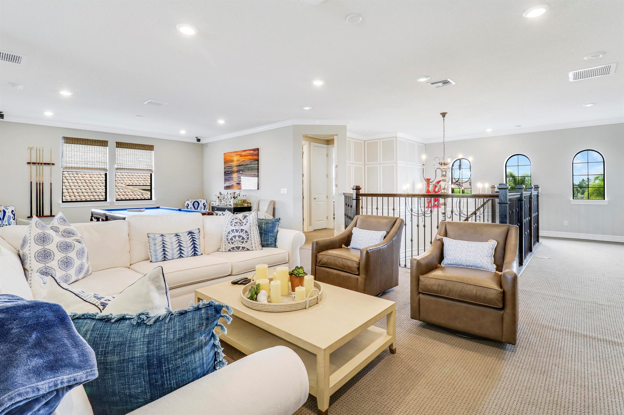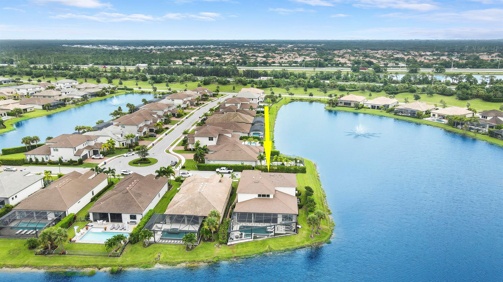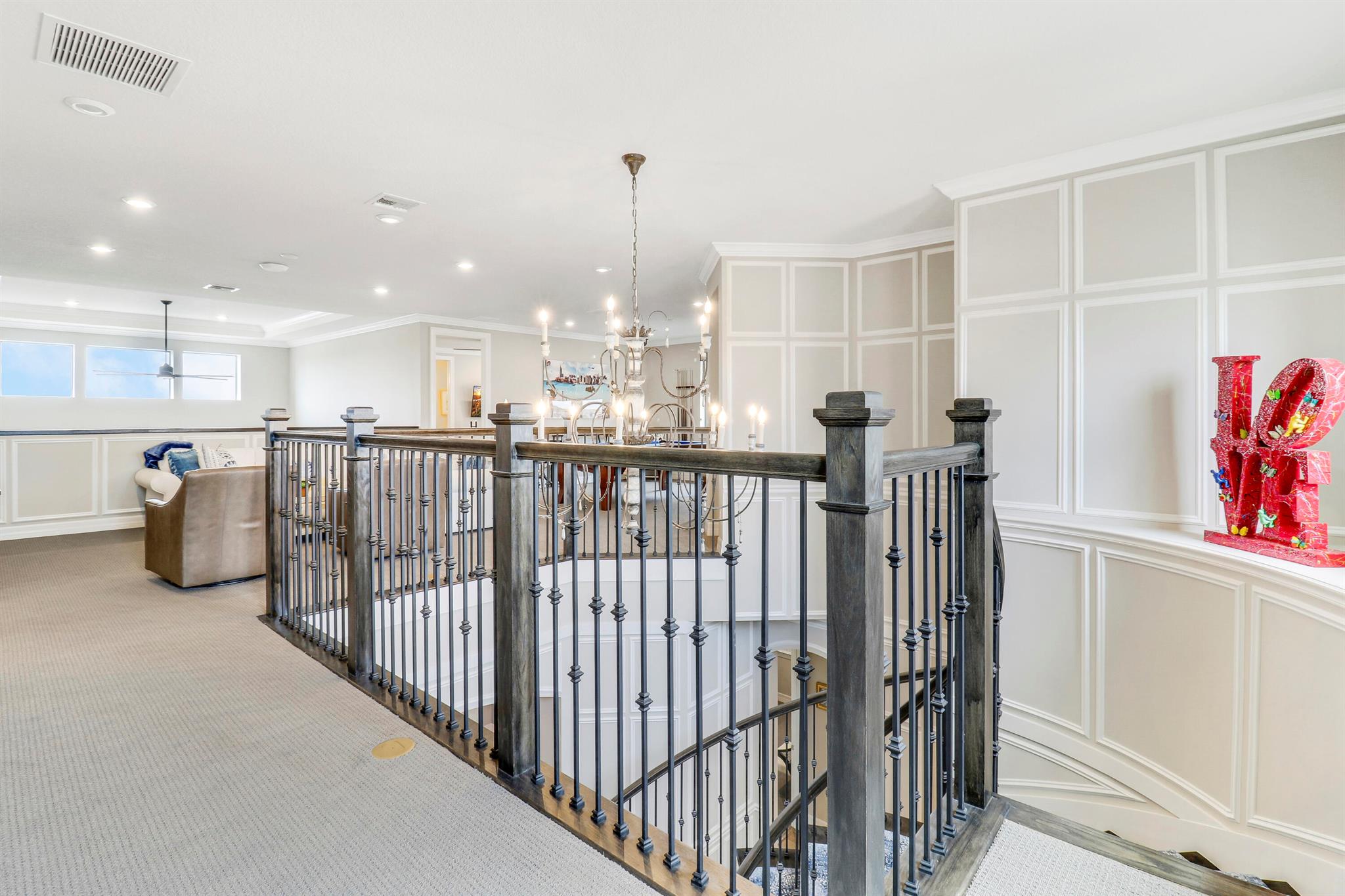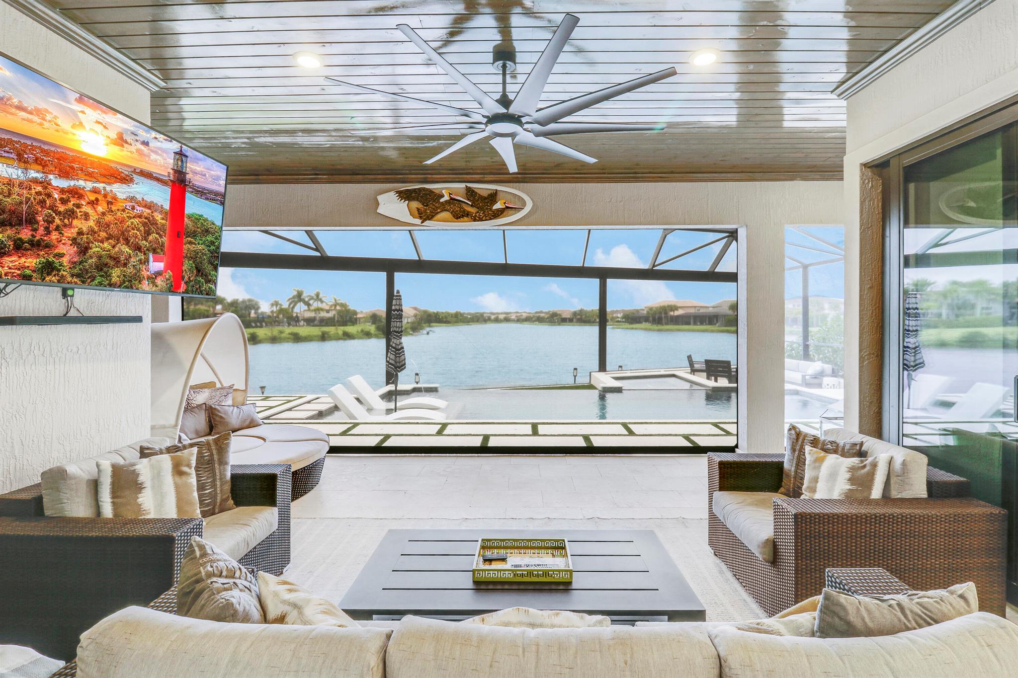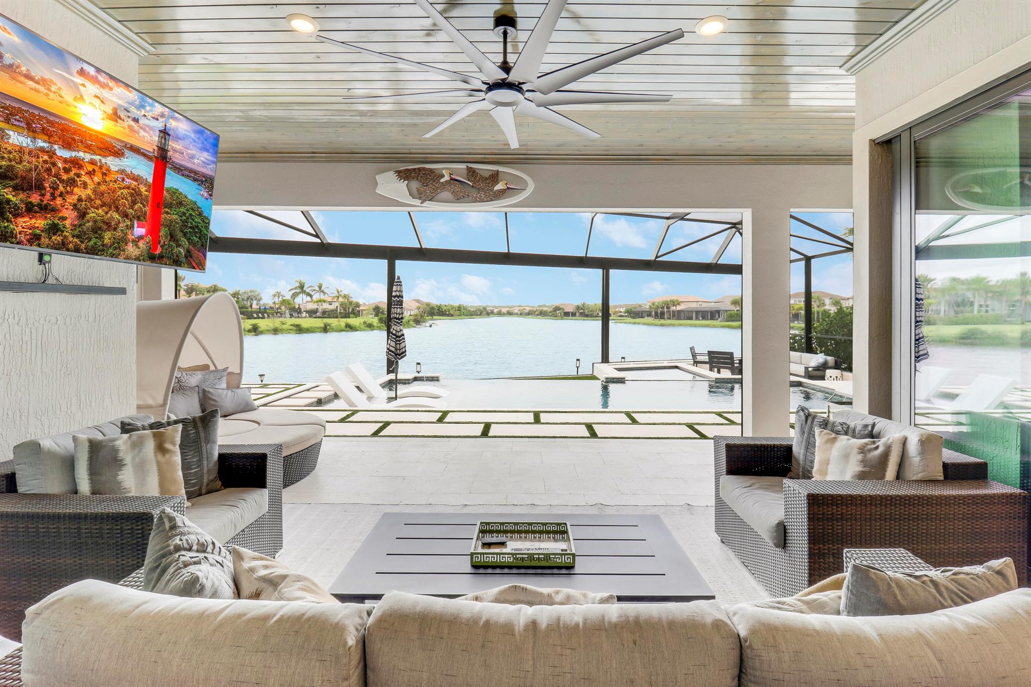 This stunning 6-bedroom, 7.5-bath home is a true entertainer’s dream, situated on a prime lakefront lot. With over 5,100/sf of living space, there is plenty of room for relaxation and hosting guests. The gourmet kitchen features extended cabinetry and designer lighting, while the elegant upgrades throughout the home include wallpaper, moldings and window treatments. The first floor includes an oversized primary bedroom with a large sitting area and spacious bath along with two additional bedrooms and 4 baths. Upstairs, you’ll find a home theatre, loft area, and 3 guest suites. The house is surrounded by water, creating a peaceful atmosphere with the infinity edge pool as the centerpiece. This home offers a luxurious lifestyle in a beautiful setting, perfect for those who love to entertain