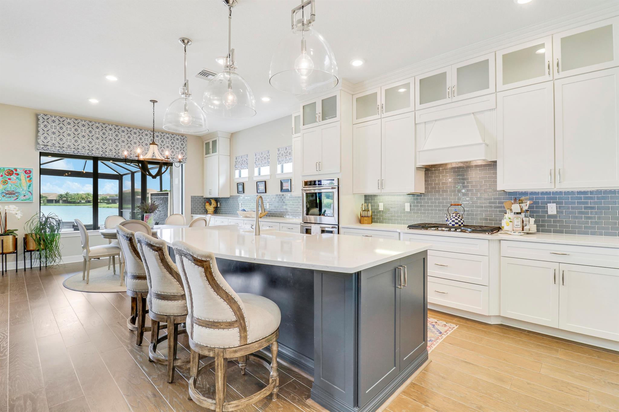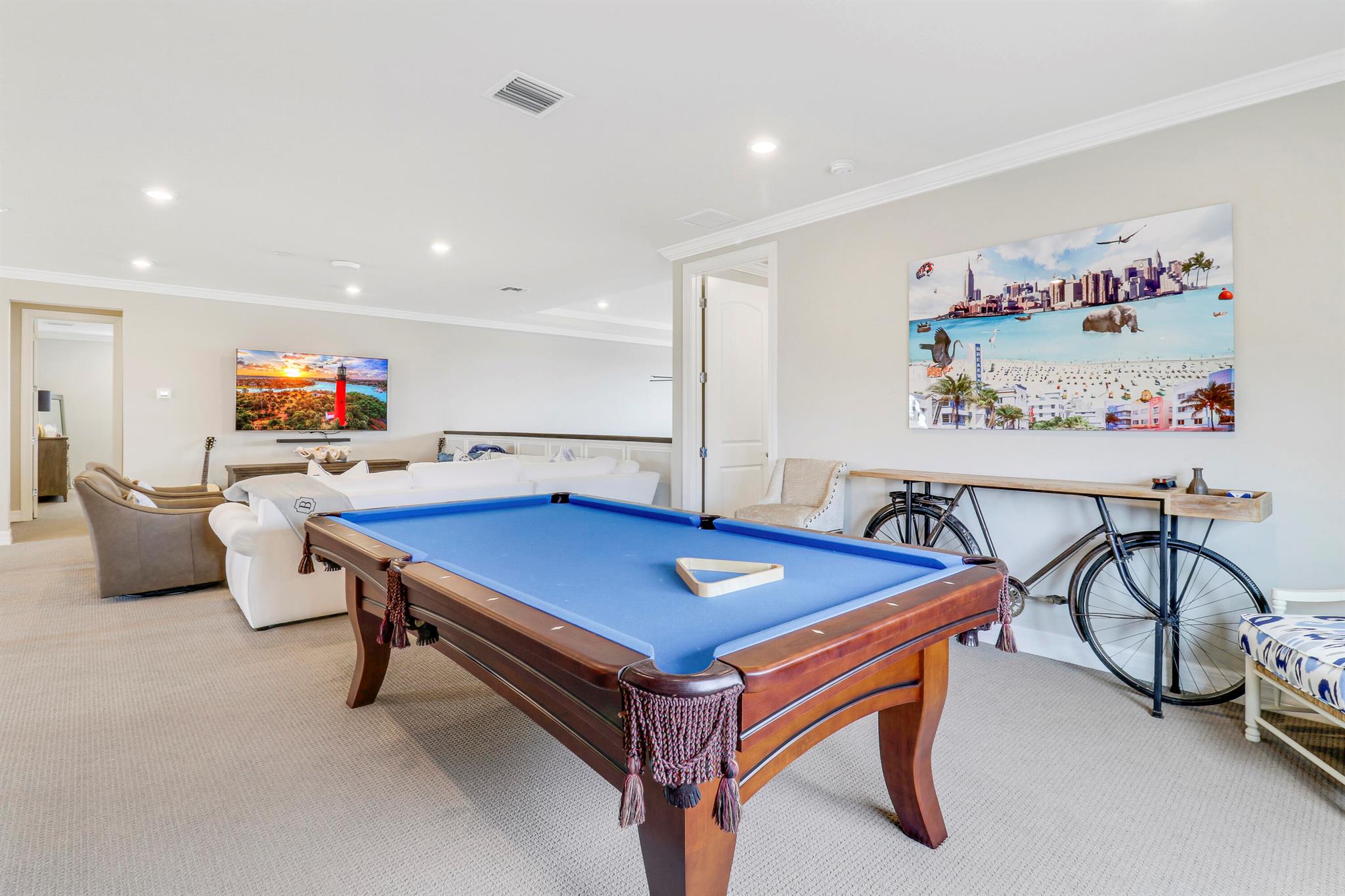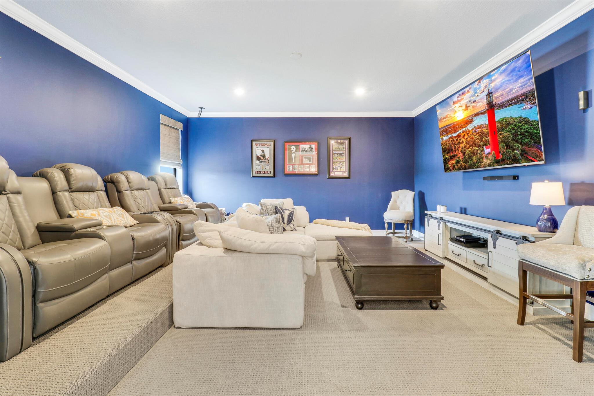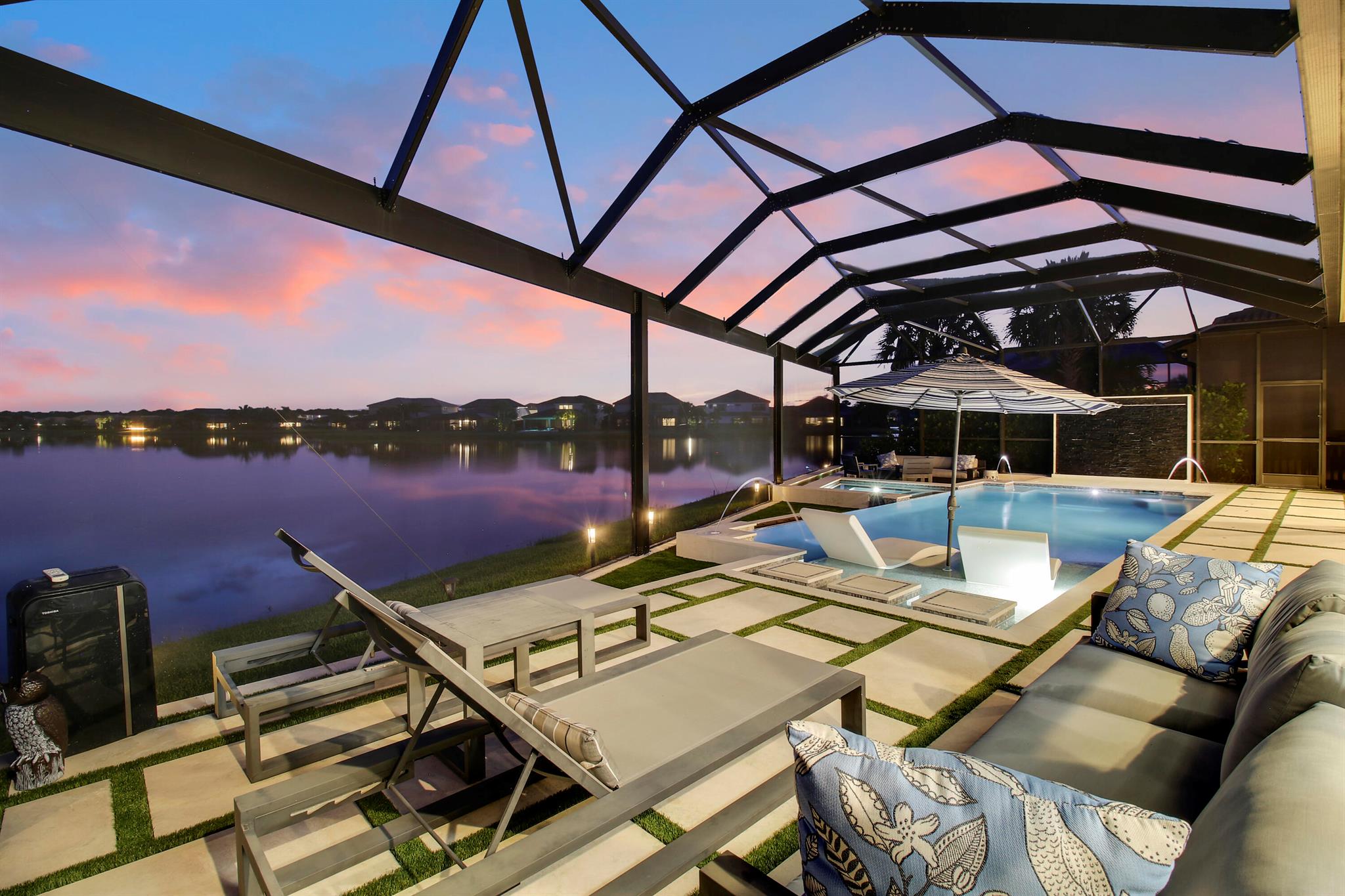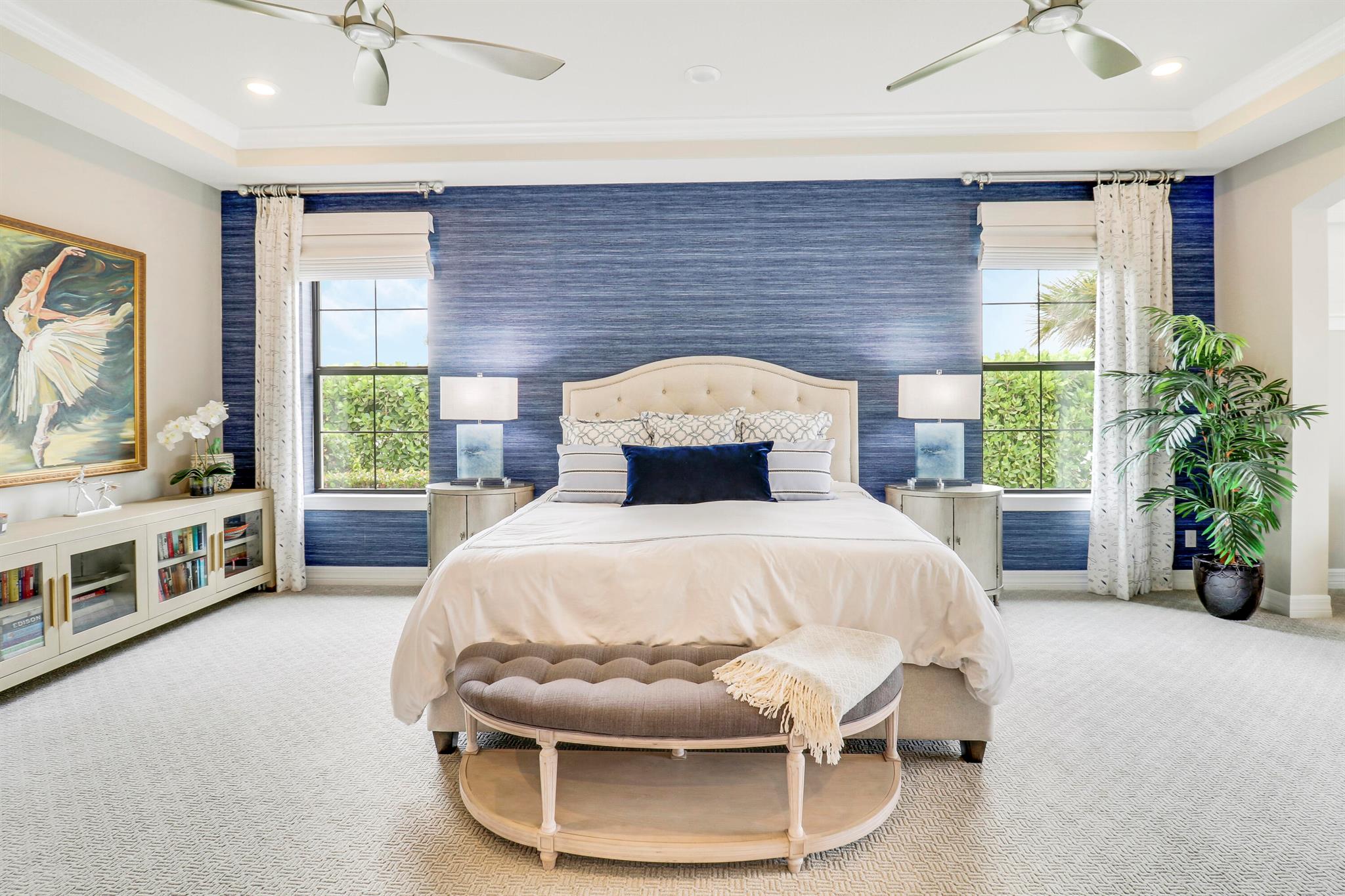 This stunning 6-bedroom, 7.5-bath home is a true entertainer’s dream, situated on a prime lakefront lot. With over 5,100/sf of living space, there is plenty of room for relaxation and hosting guests. The gourmet kitchen features extended cabinetry and designer lighting, while the elegant upgrades throughout the home include wallpaper, moldings and window treatments. The first floor includes an oversized primary bedroom with a large sitting area and spacious bath along with two additional bedrooms and 4 baths. Upstairs, you’ll find a home theatre, loft area, and 3 guest suites. The house is surrounded by water, creating a peaceful atmosphere with the infinity edge pool as the centerpiece. This home offers a luxurious lifestyle in a beautiful setting, perfect for those who love to entertain