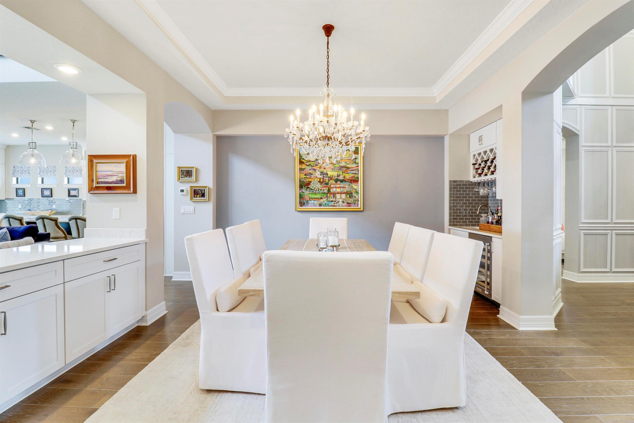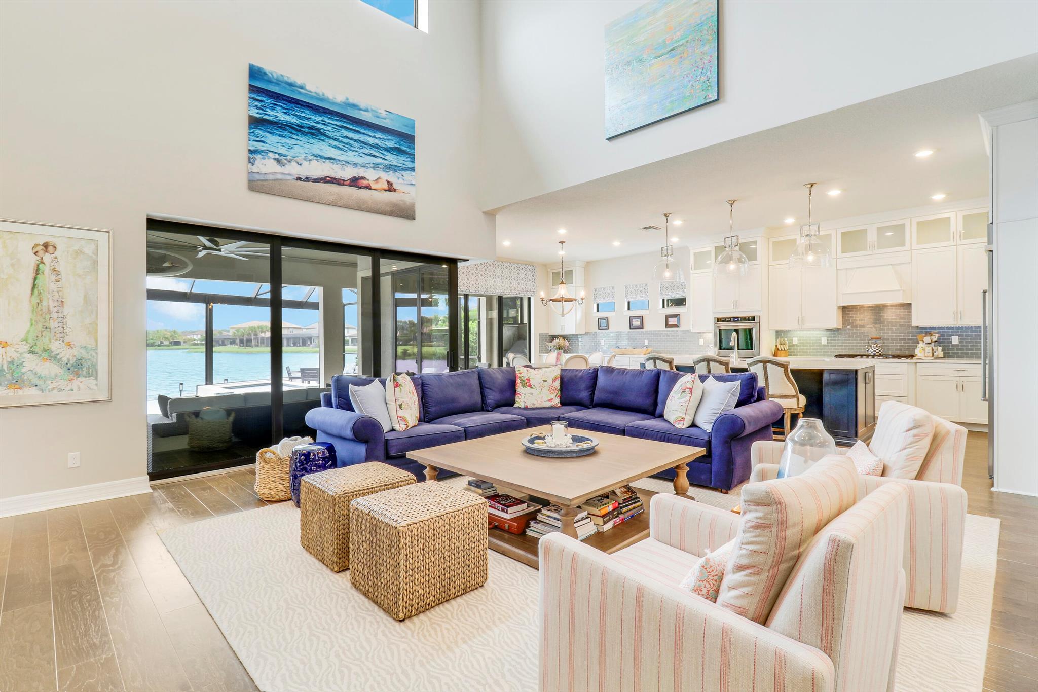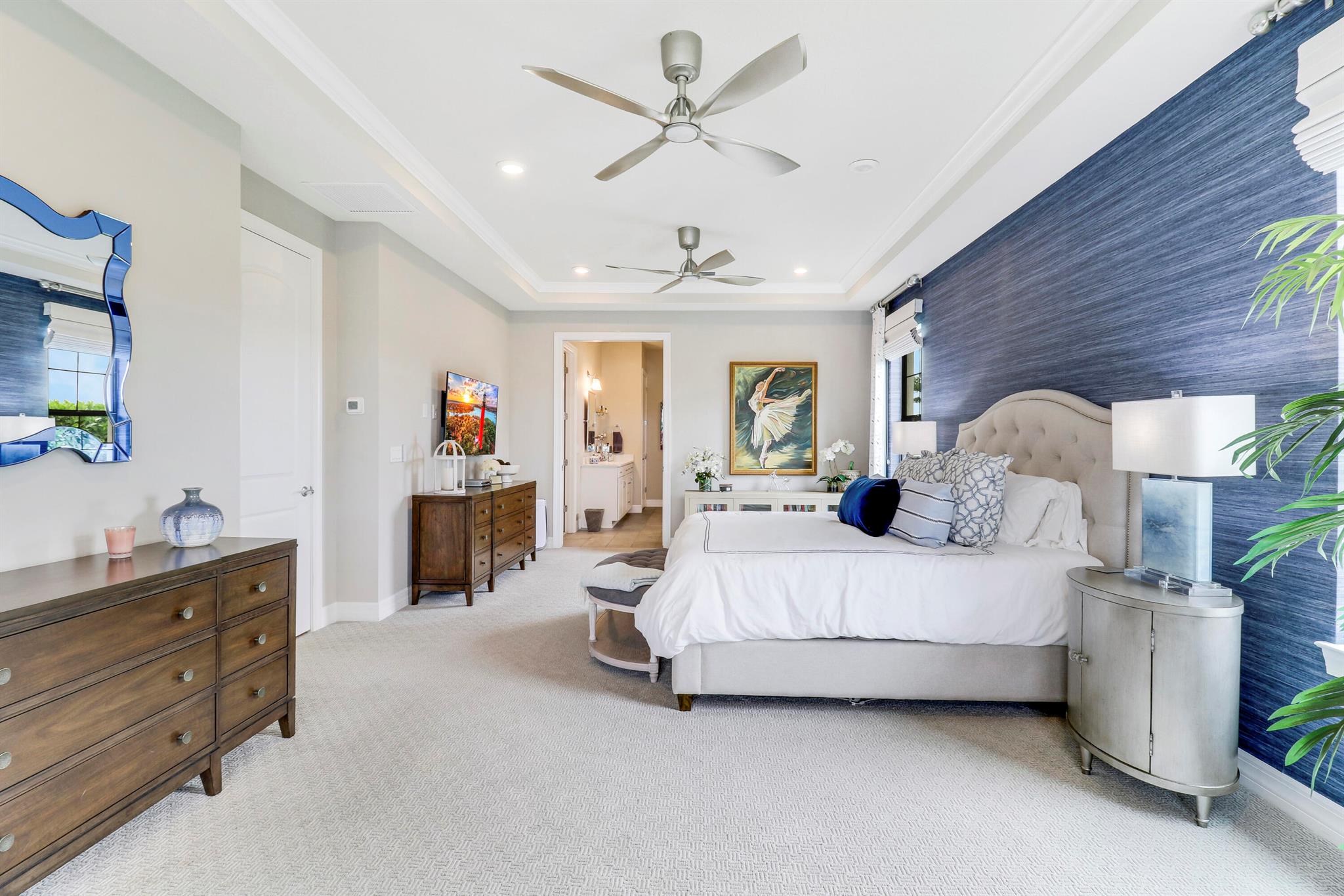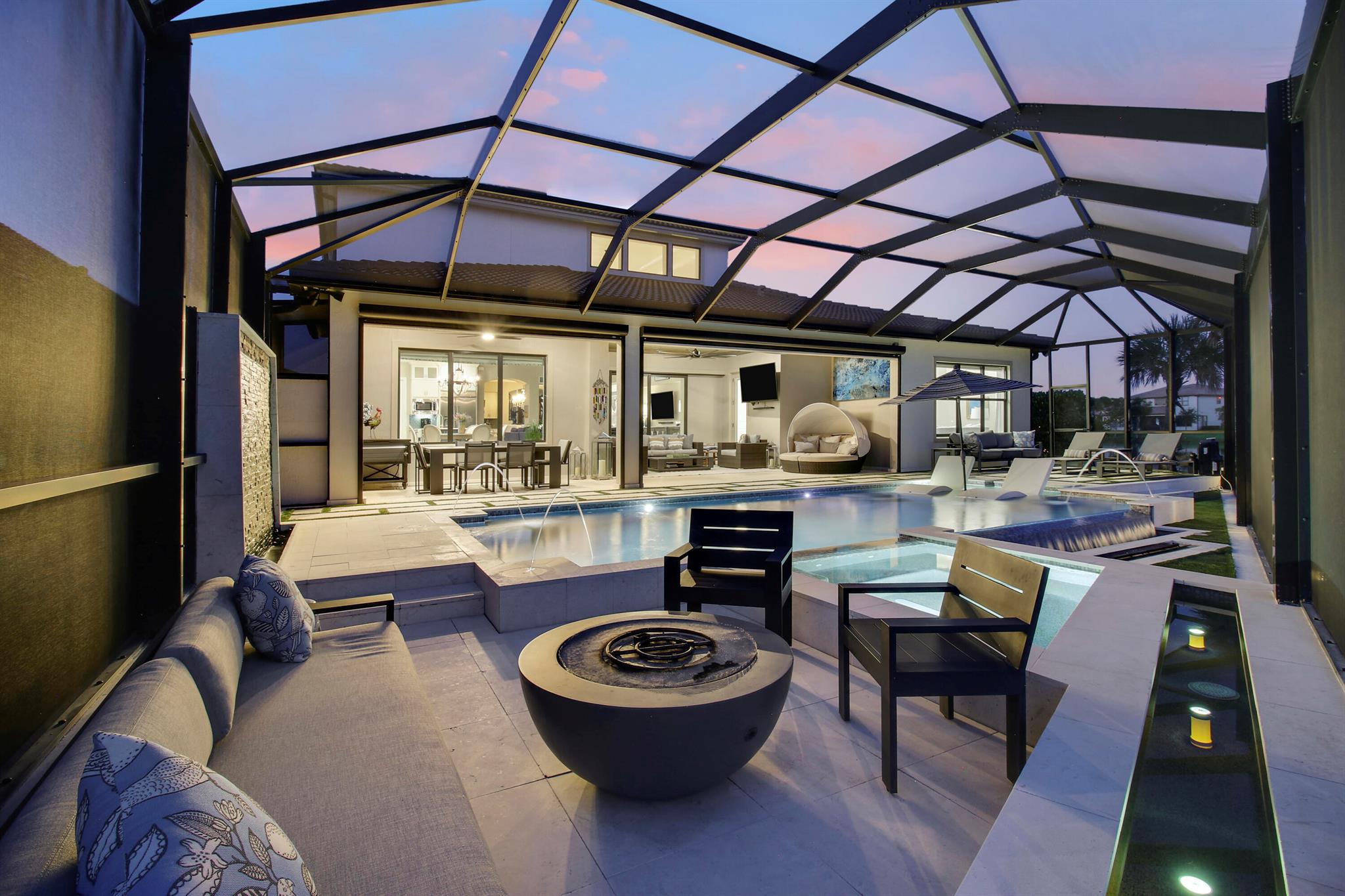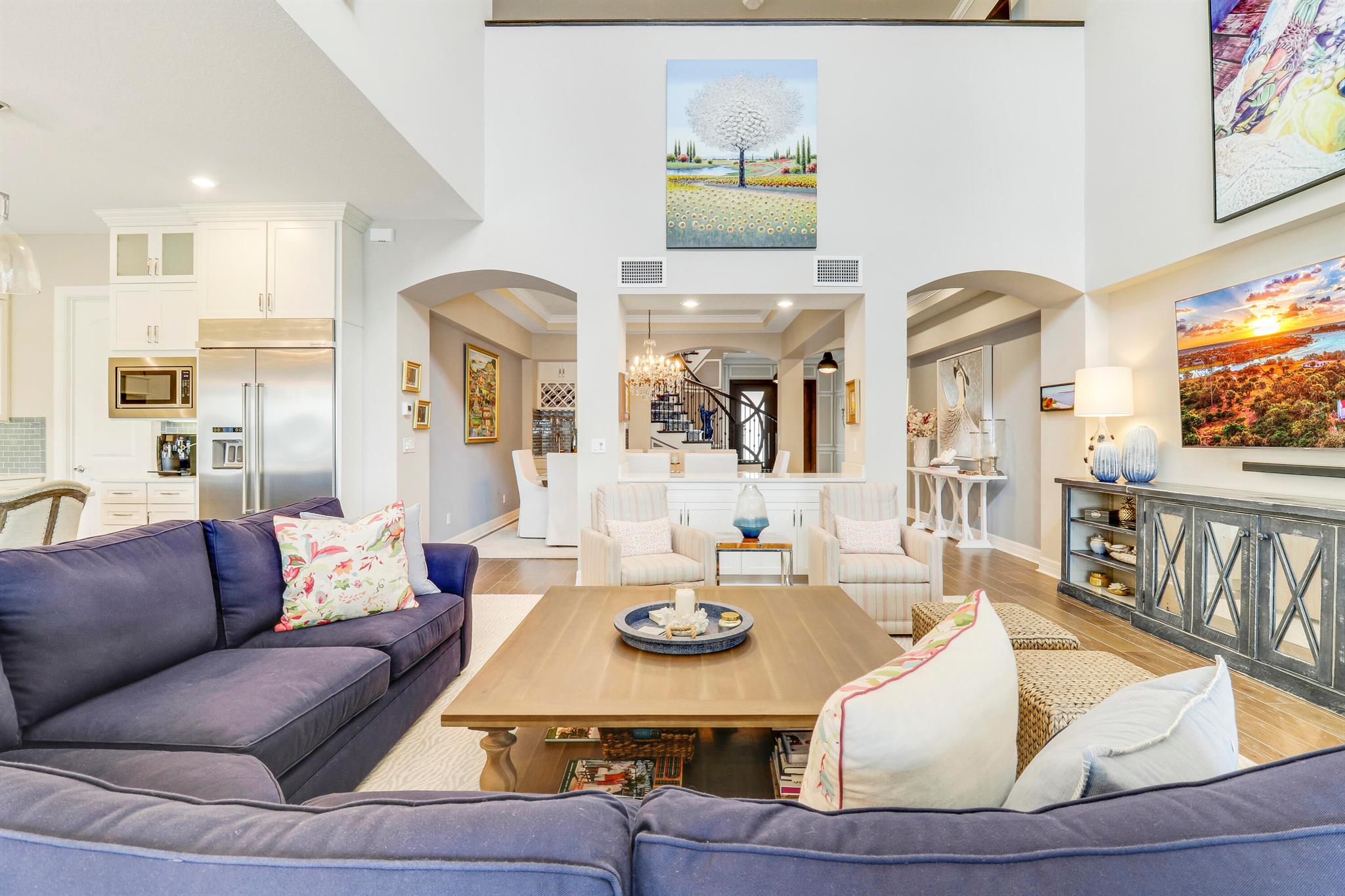 This stunning 6-bedroom, 7.5-bath home is a true entertainer’s dream, situated on a prime lakefront lot. With over 5,100/sf of living space, there is plenty of room for relaxation and hosting guests. The gourmet kitchen features extended cabinetry and designer lighting, while the elegant upgrades throughout the home include wallpaper, moldings and window treatments. The first floor includes an oversized primary bedroom with a large sitting area and spacious bath along with two additional bedrooms and 4 baths. Upstairs, you’ll find a home theatre, loft area, and 3 guest suites. The house is surrounded by water, creating a peaceful atmosphere with the infinity edge pool as the centerpiece. This home offers a luxurious lifestyle in a beautiful setting, perfect for those who love to entertain