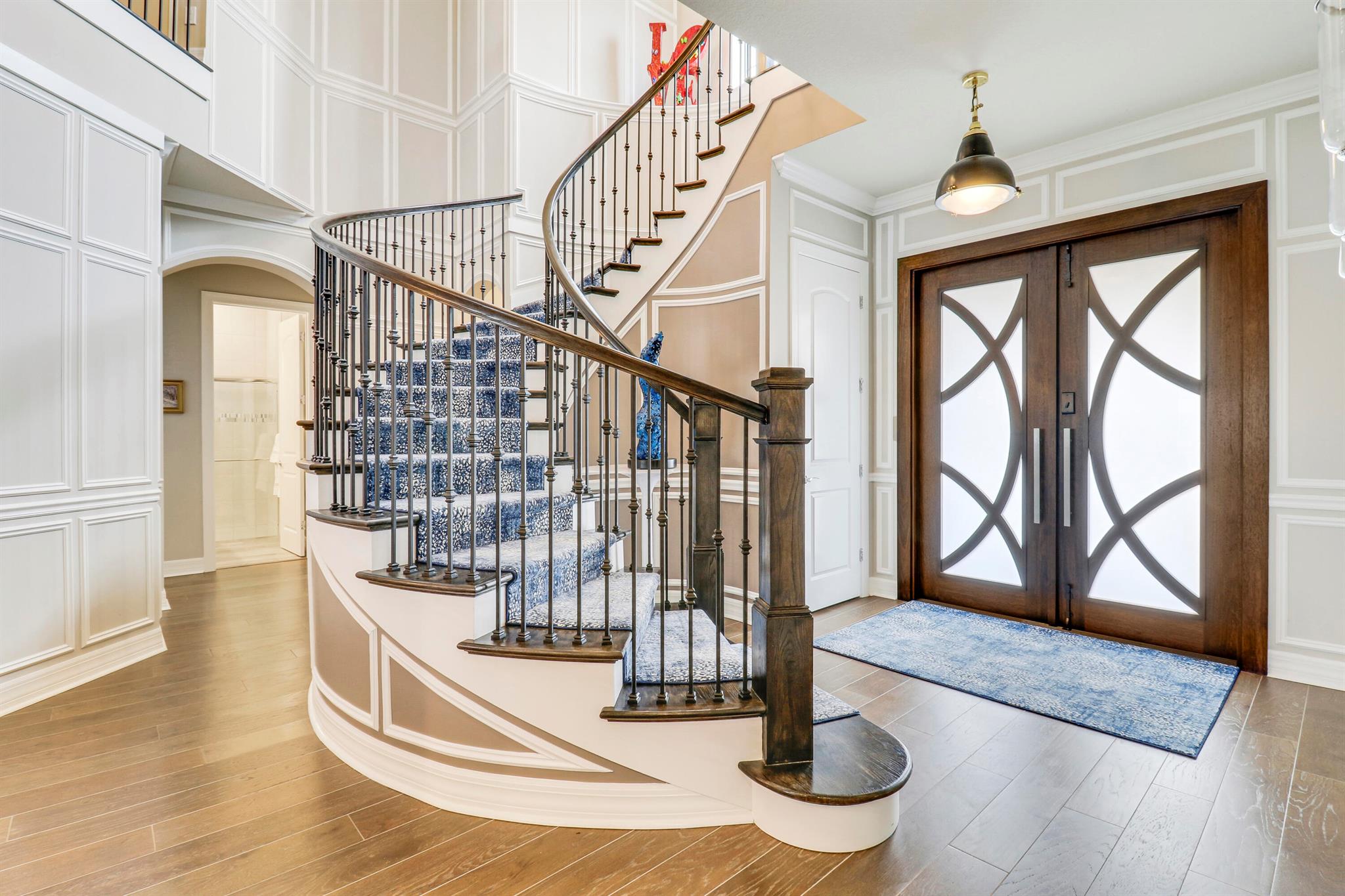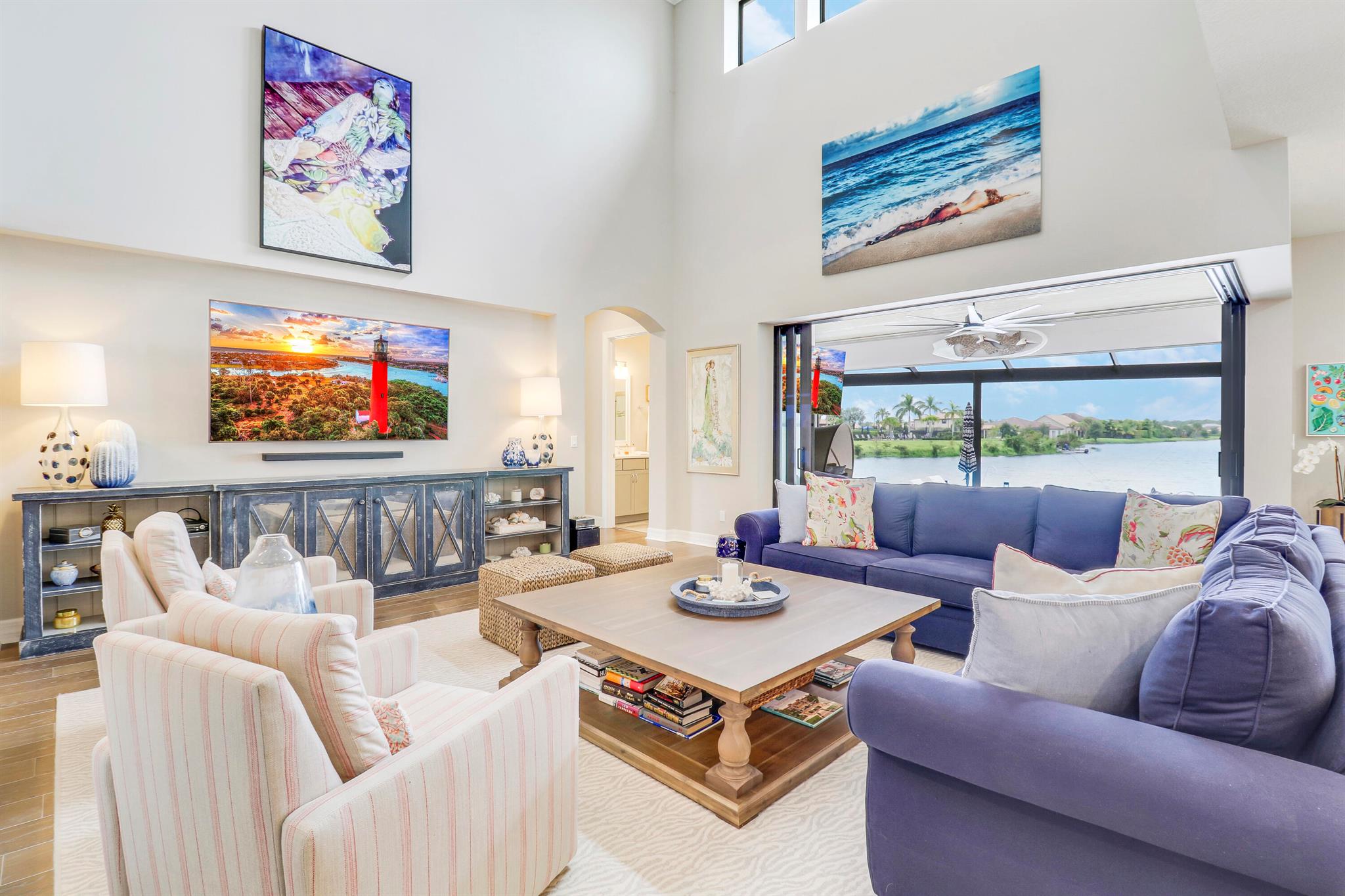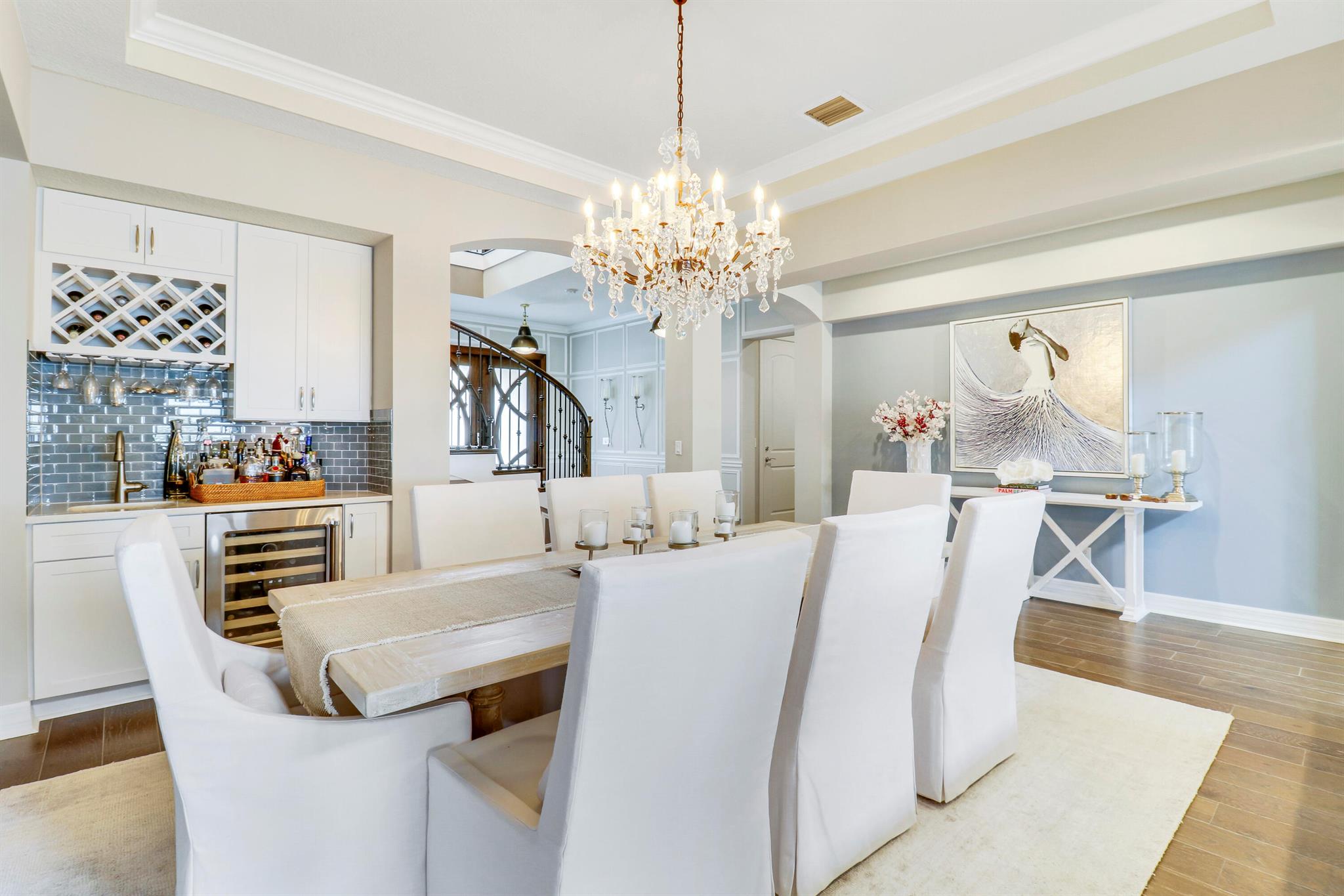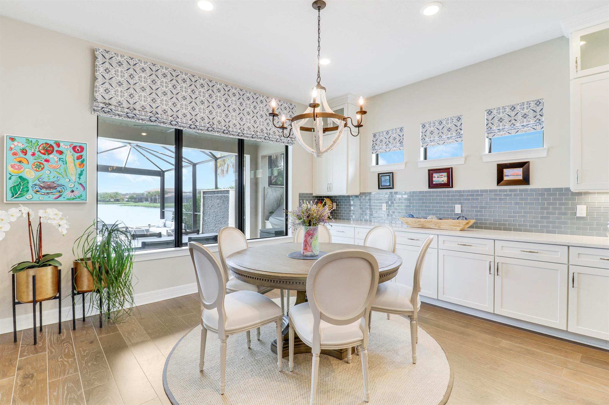 This stunning 6-bedroom, 7.5-bath home is a true entertainer’s dream, situated on a prime lakefront lot. With over 5,100/sf of living space, there is plenty of room for relaxation and hosting guests. The gourmet kitchen features extended cabinetry and designer lighting, while the elegant upgrades throughout the home include wallpaper, moldings and window treatments. The first floor includes an oversized primary bedroom with a large sitting area and spacious bath along with two additional bedrooms and 4 baths. Upstairs, you’ll find a home theatre, loft area, and 3 guest suites. The house is surrounded by water, creating a peaceful atmosphere with the infinity edge pool as the centerpiece. This home offers a luxurious lifestyle in a beautiful setting, perfect for those who love to entertain