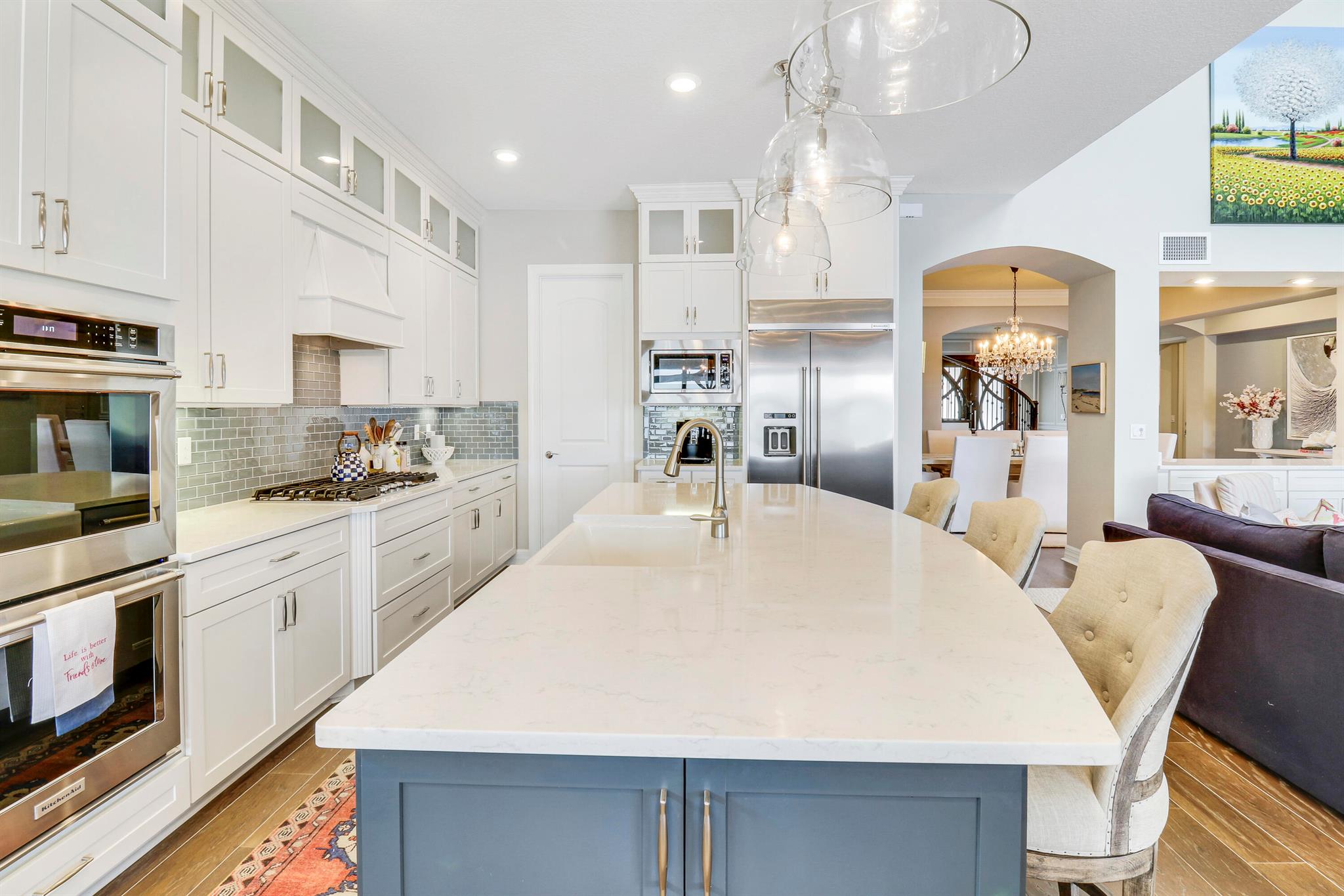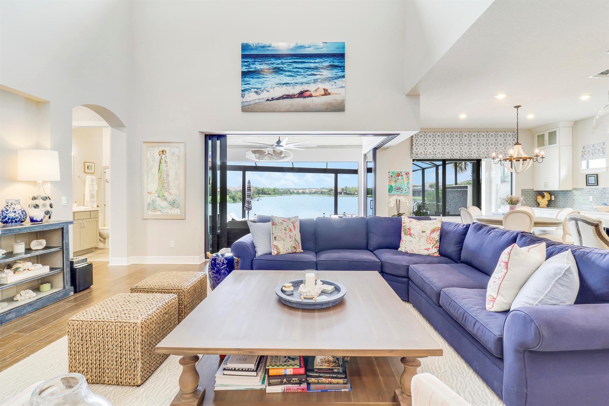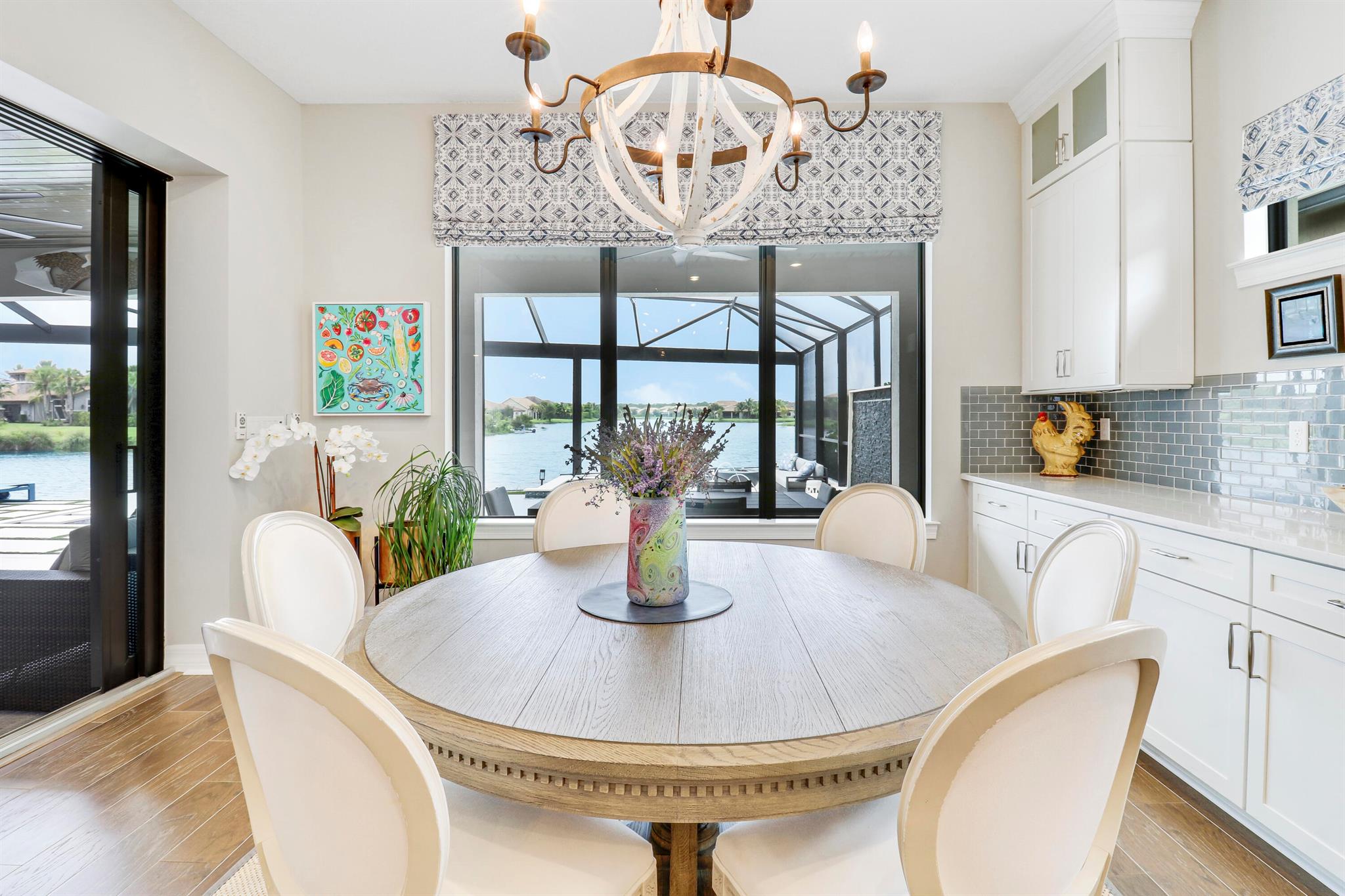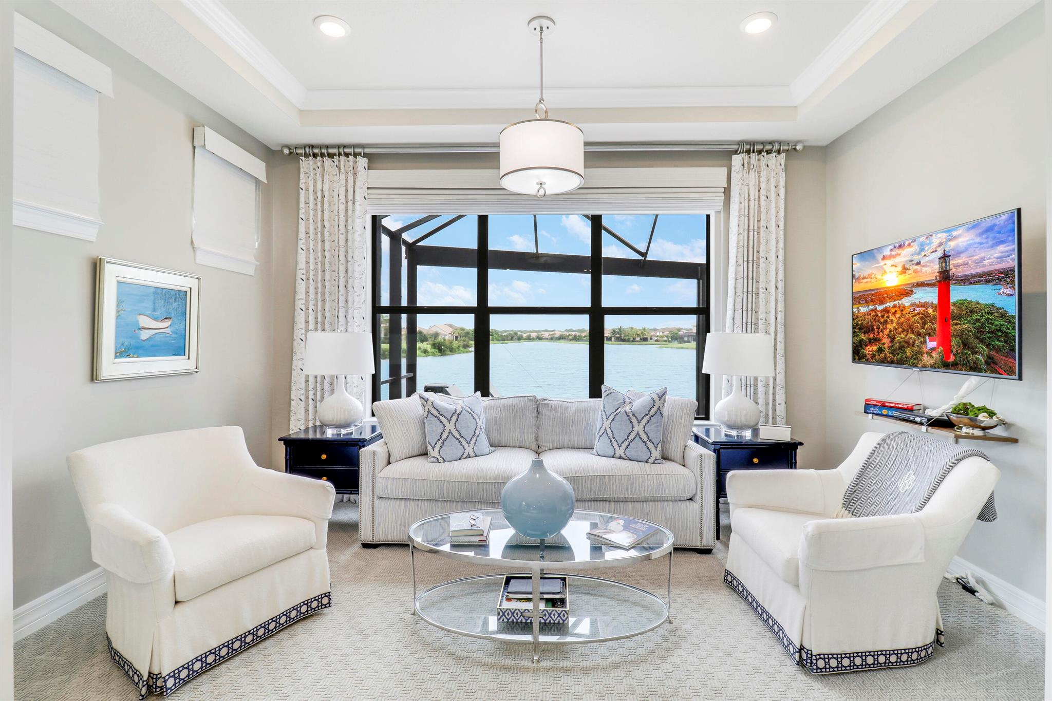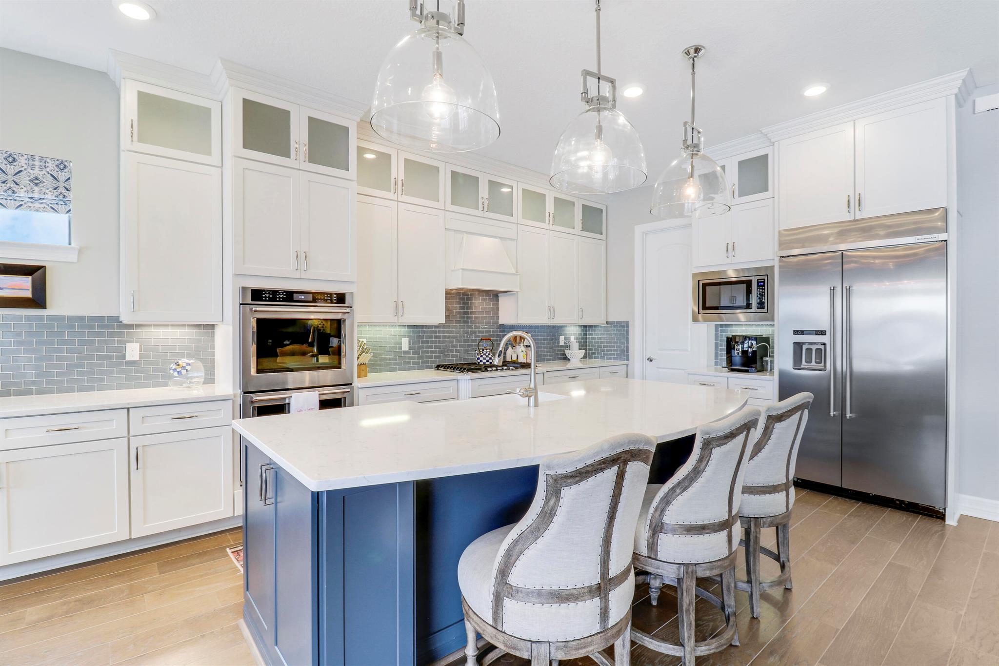 This stunning 6-bedroom, 7.5-bath home is a true entertainer’s dream, situated on a prime lakefront lot. With over 5,100/sf of living space, there is plenty of room for relaxation and hosting guests. The gourmet kitchen features extended cabinetry and designer lighting, while the elegant upgrades throughout the home include wallpaper, moldings and window treatments. The first floor includes an oversized primary bedroom with a large sitting area and spacious bath along with two additional bedrooms and 4 baths. Upstairs, you’ll find a home theatre, loft area, and 3 guest suites. The house is surrounded by water, creating a peaceful atmosphere with the infinity edge pool as the centerpiece. This home offers a luxurious lifestyle in a beautiful setting, perfect for those who love to entertain