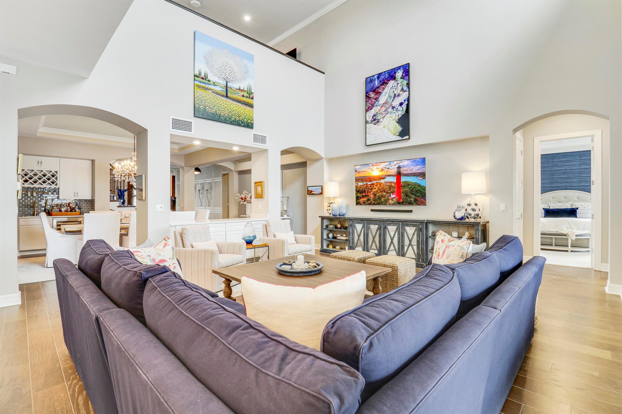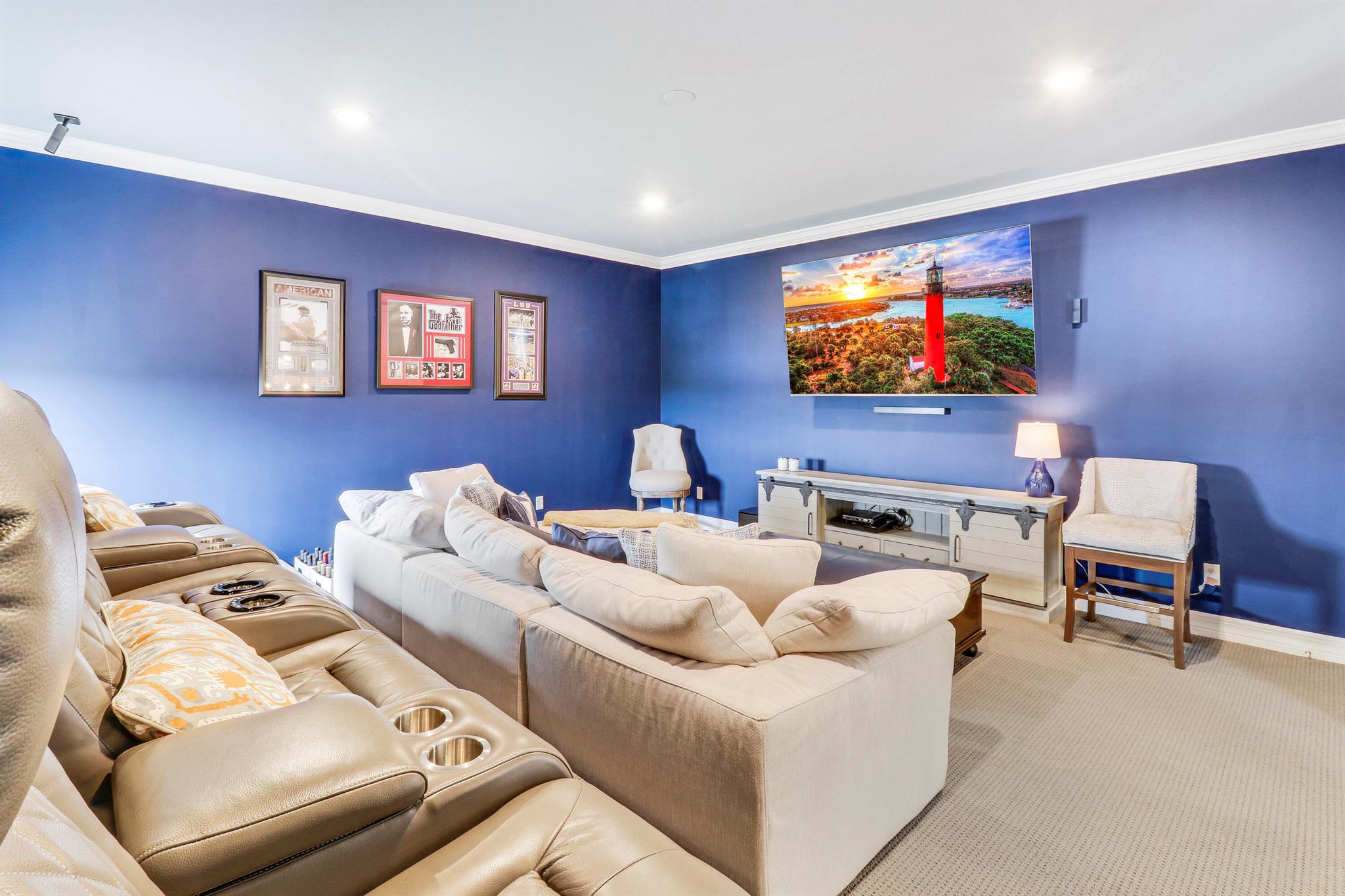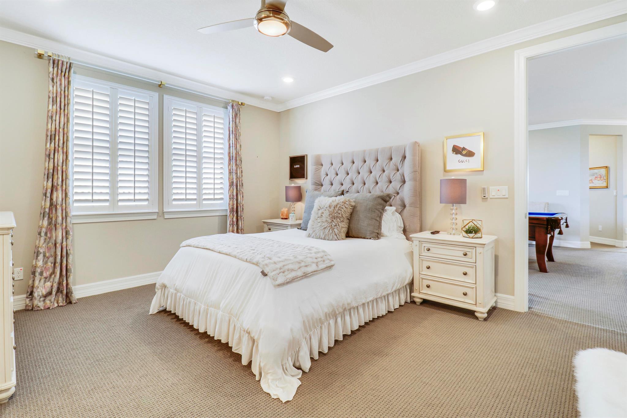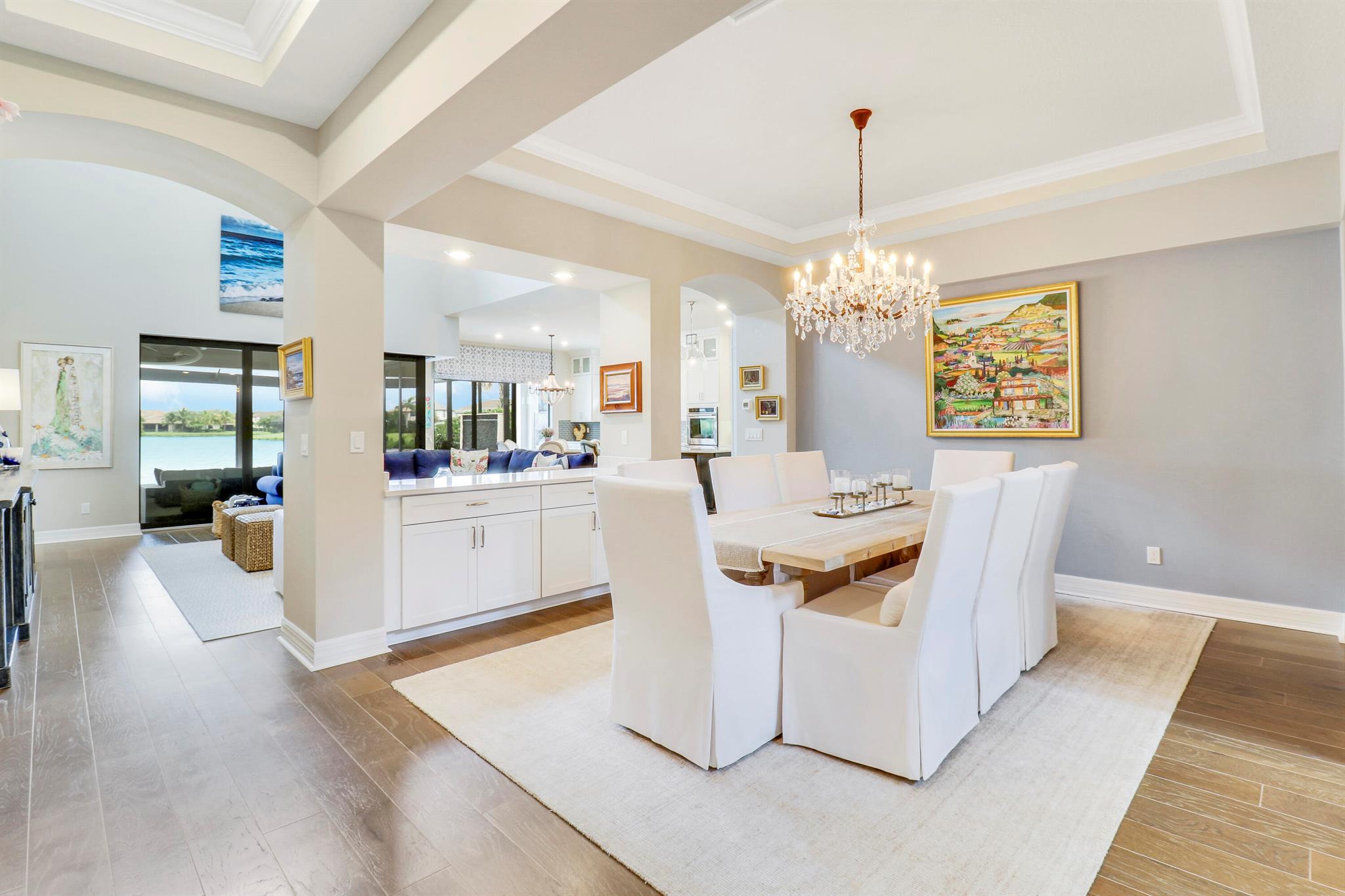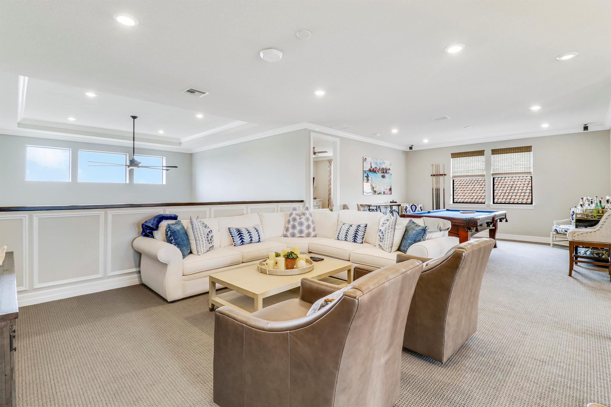 This stunning 6-bedroom, 7.5-bath home is a true entertainer’s dream, situated on a prime lakefront lot. With over 5,100/sf of living space, there is plenty of room for relaxation and hosting guests. The gourmet kitchen features extended cabinetry and designer lighting, while the elegant upgrades throughout the home include wallpaper, moldings and window treatments. The first floor includes an oversized primary bedroom with a large sitting area and spacious bath along with two additional bedrooms and 4 baths. Upstairs, you’ll find a home theatre, loft area, and 3 guest suites. The house is surrounded by water, creating a peaceful atmosphere with the infinity edge pool as the centerpiece. This home offers a luxurious lifestyle in a beautiful setting, perfect for those who love to entertain
