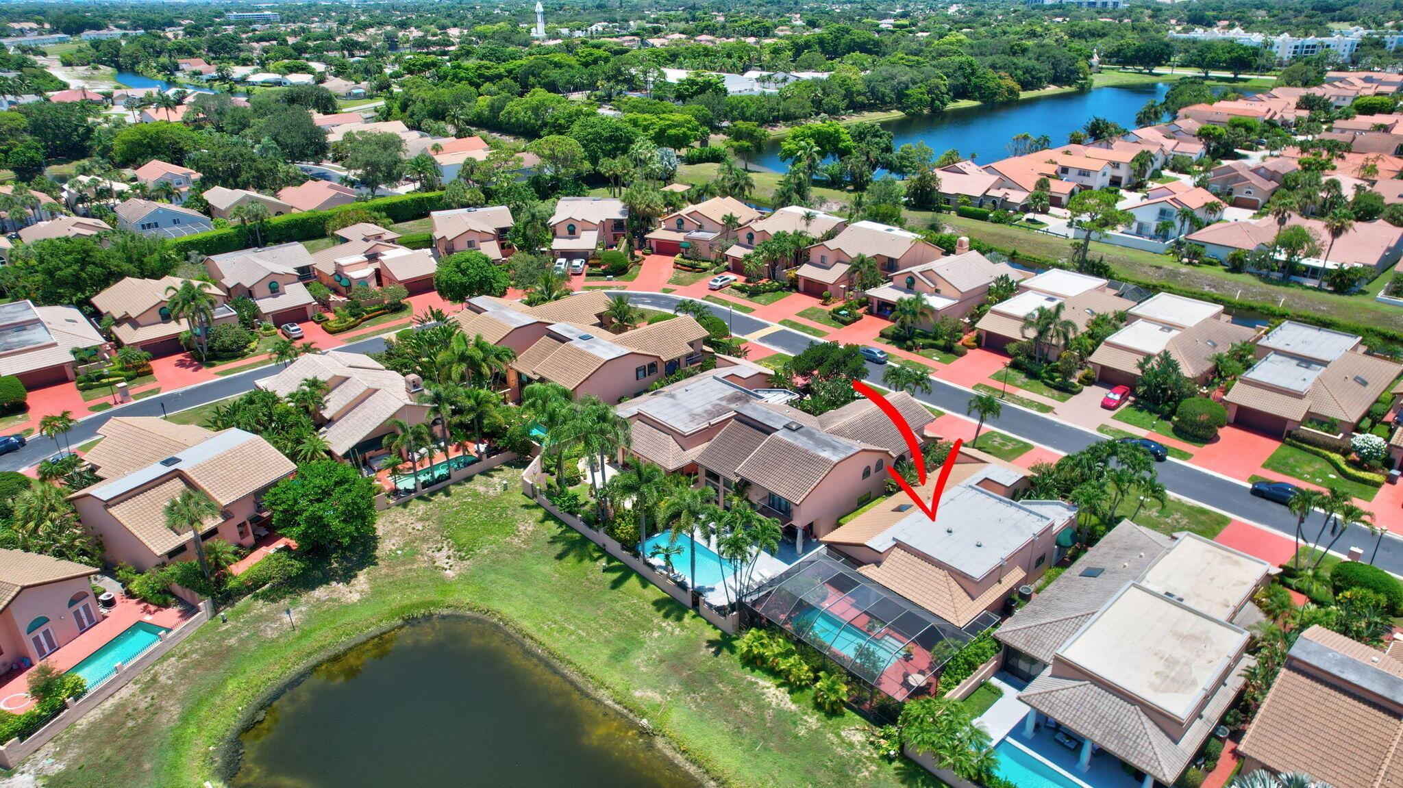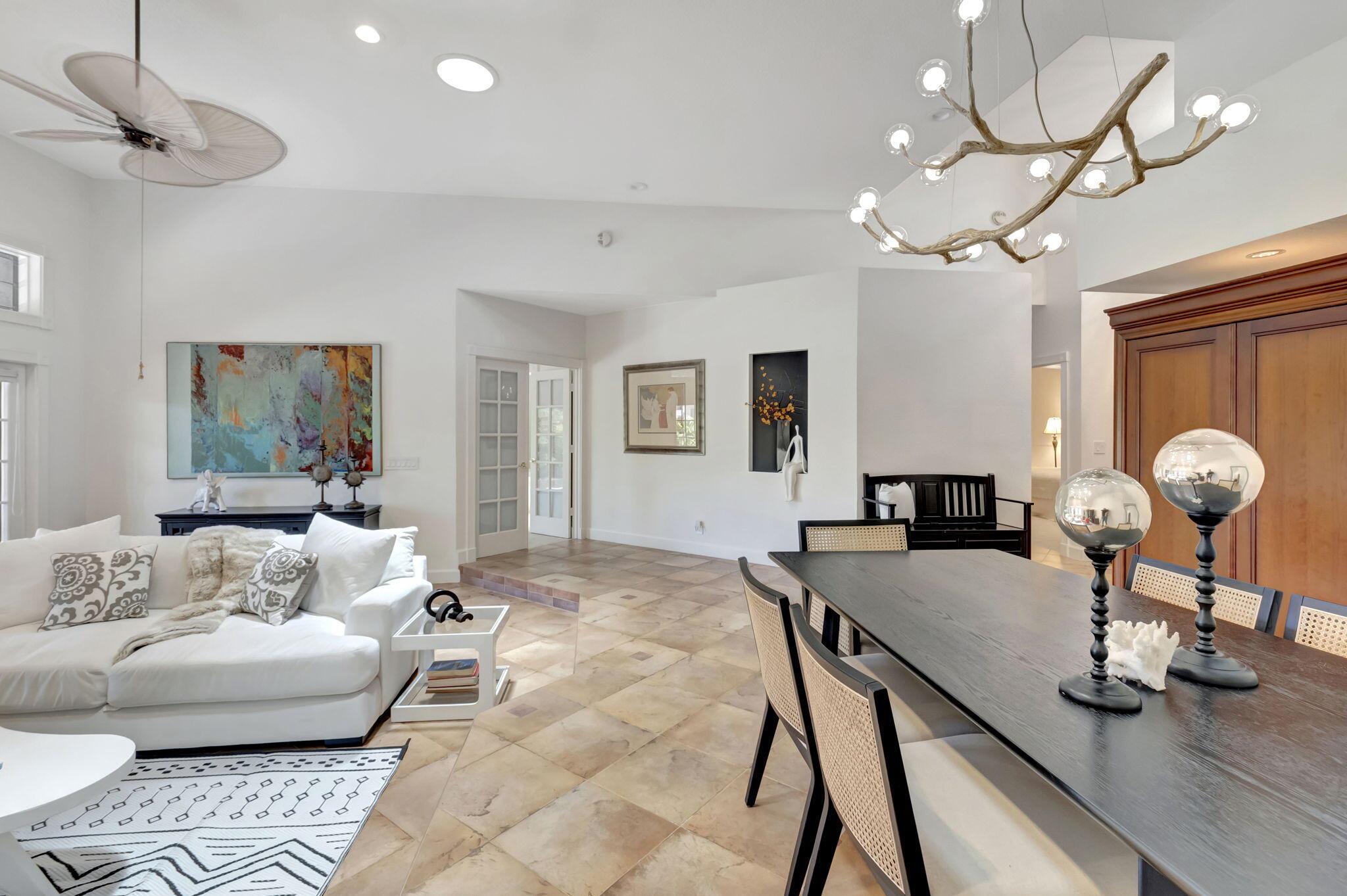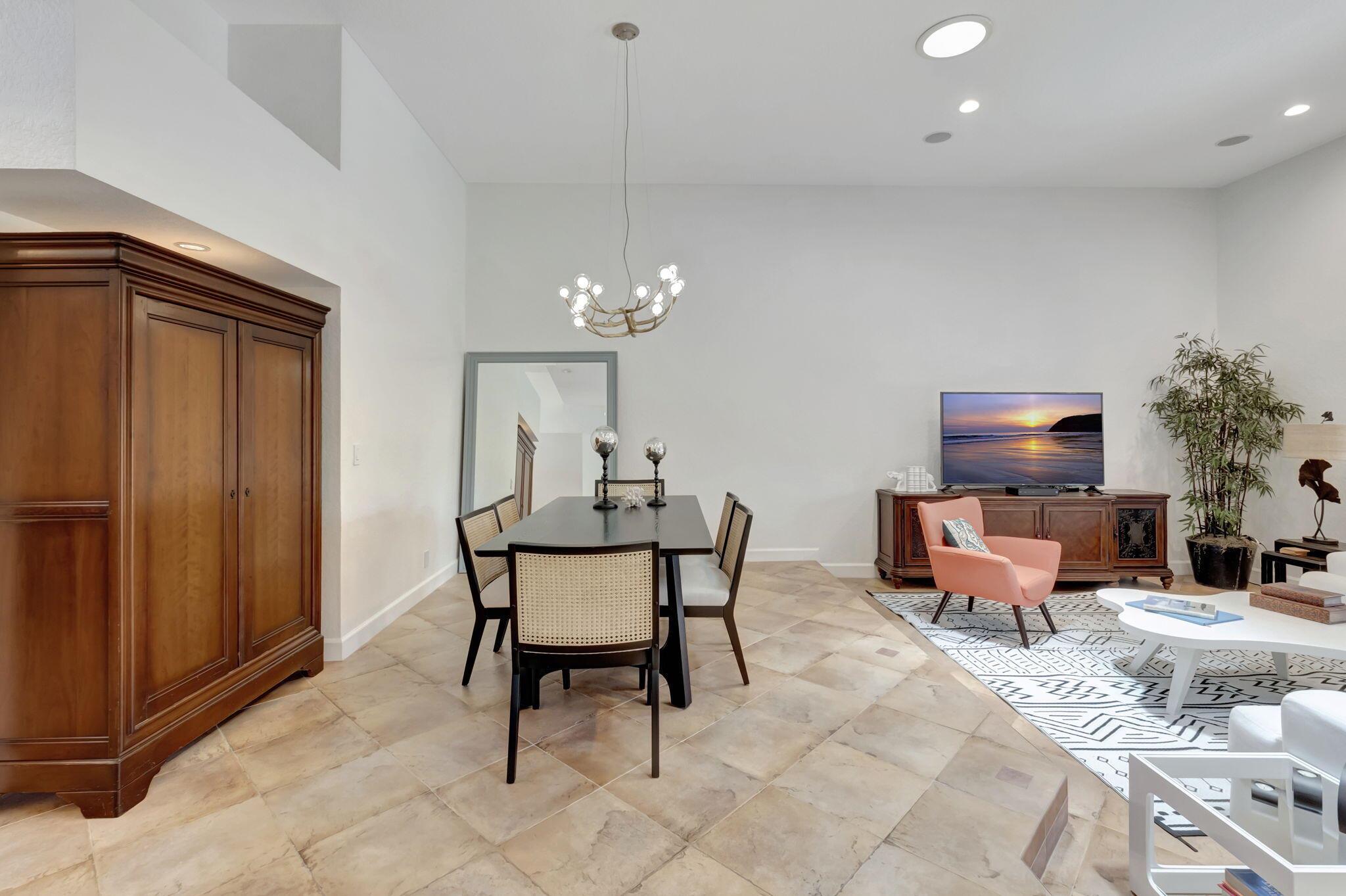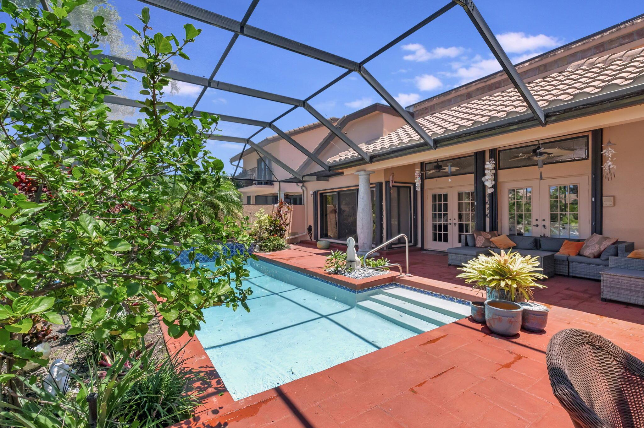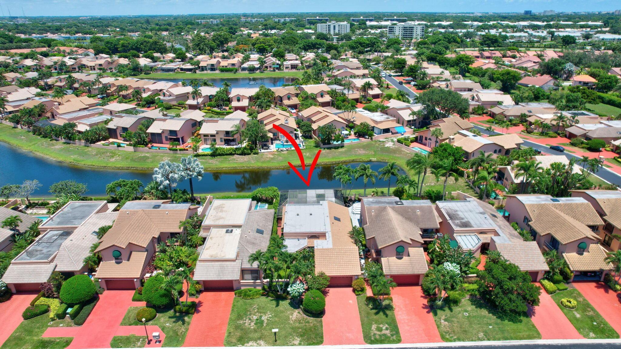 Rarely available, this stunning upgraded 2-bedroom, 2-bathroom single-family home (1 story) with a 2-car garage is located in the prestigious gated community of Boca Pointe Country Club. Boca Pointe CC is one of the only clubs in Boca Raton in which membership is optional! Move right in – This home is turn-key ready for you (all furnishings at the property are negotiable) This residence offers breathtaking views of the expansive community lake. This home was designed for effortless entertaining with an open floor plan featuring soaring volume ceilings that seamlessly connect the indoor and outdoor living spaces. Enjoy panoramic vistas of the new heated private pool and beautifully landscaped backyard, adorned with jasmine, hibiscus, and gardenias.