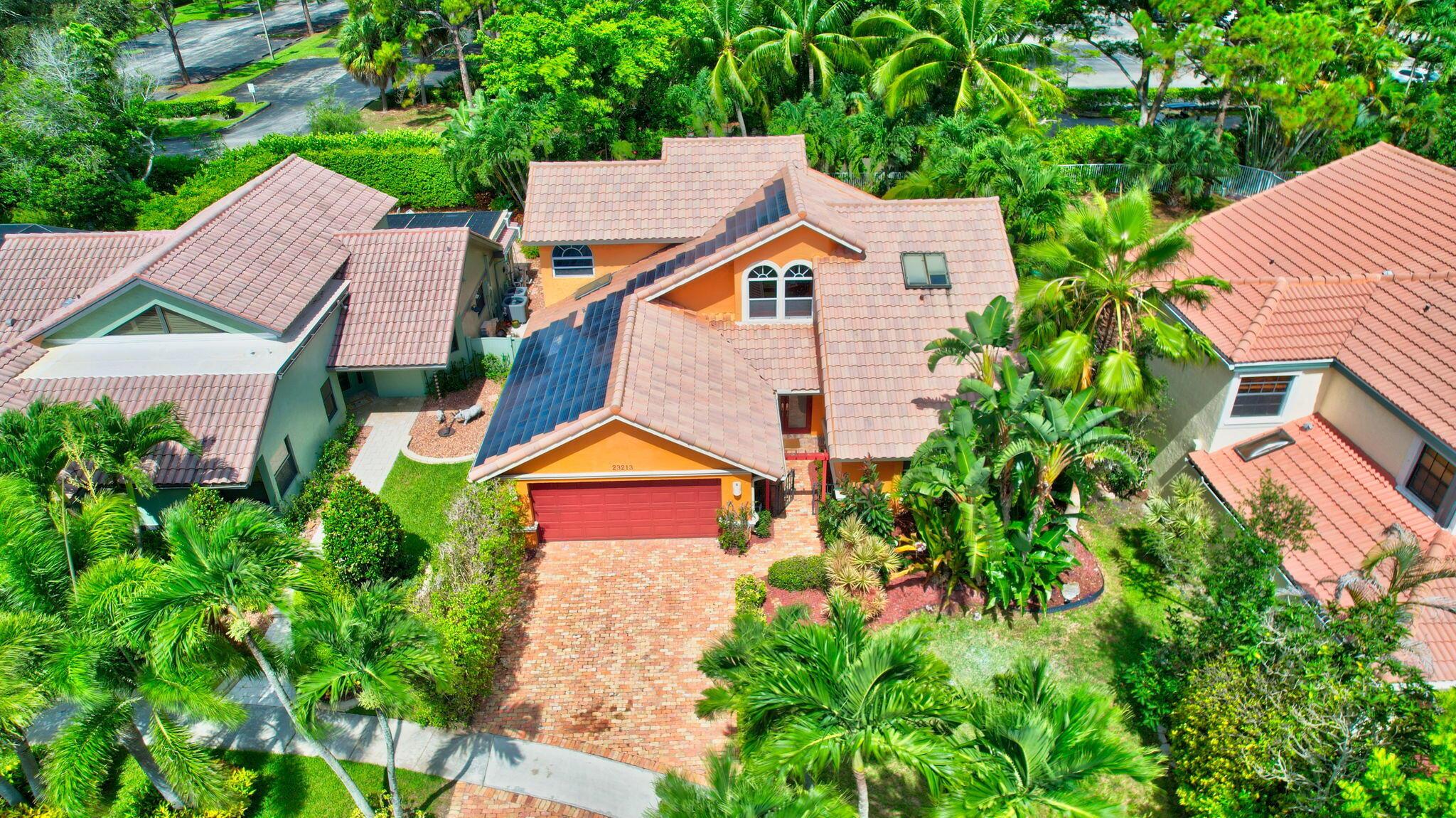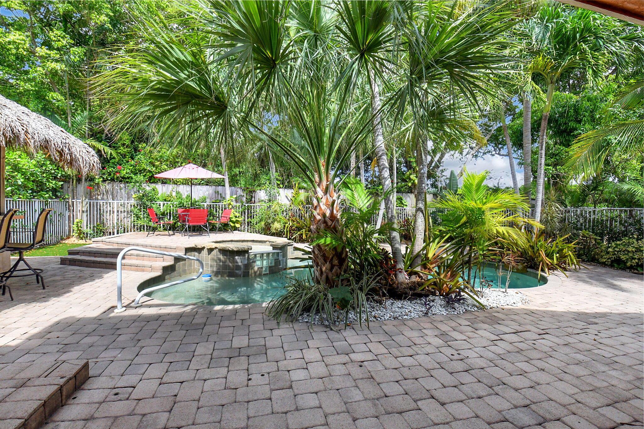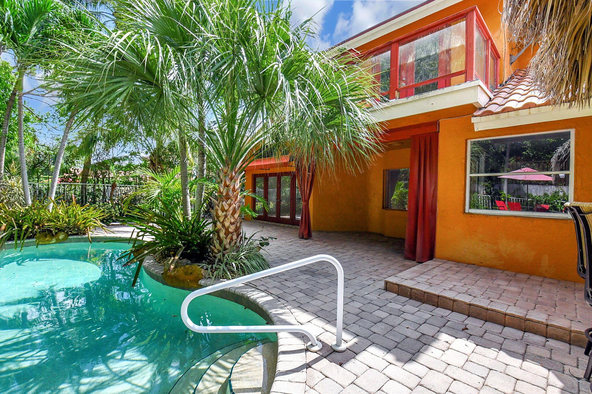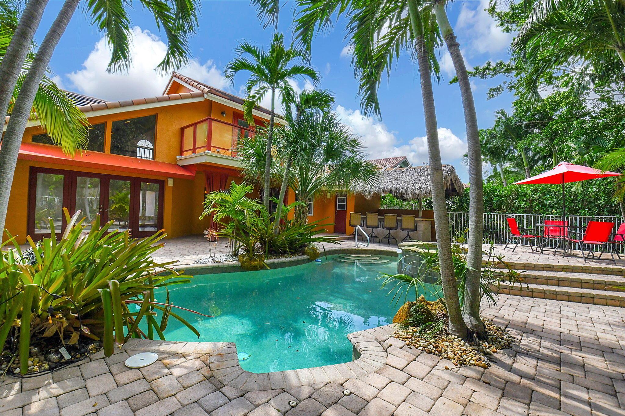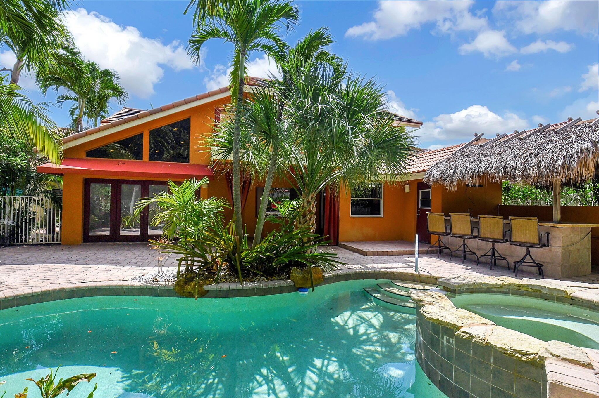 Fantastic home in a prime location! Features include Chicago brick driveway, tropical landscape, S Tile roof (2015), 2 A/C units (2016/17) Certainteed Residential Solar Tiles, large front yard, vaulted ceilings, tile and bamboo floors, fresh paint, stone fireplace with electric insert, kitchen cabinets were professionally painted, GE monogram refrigerator, Jenn Air double ovens, built in wine fridge, decorative glass cabinets, open floorplan with a ton of space, great for entertaining, Good size primary bedroom with large bathroom, walk in closet, and a balcony. The back yard is a tropical paradise with a kidney shaped pool with tropical landscape, pavers, tiki bar, pool and spa are heated. All of this within walking distance to shops, restaurants, and place of worship.