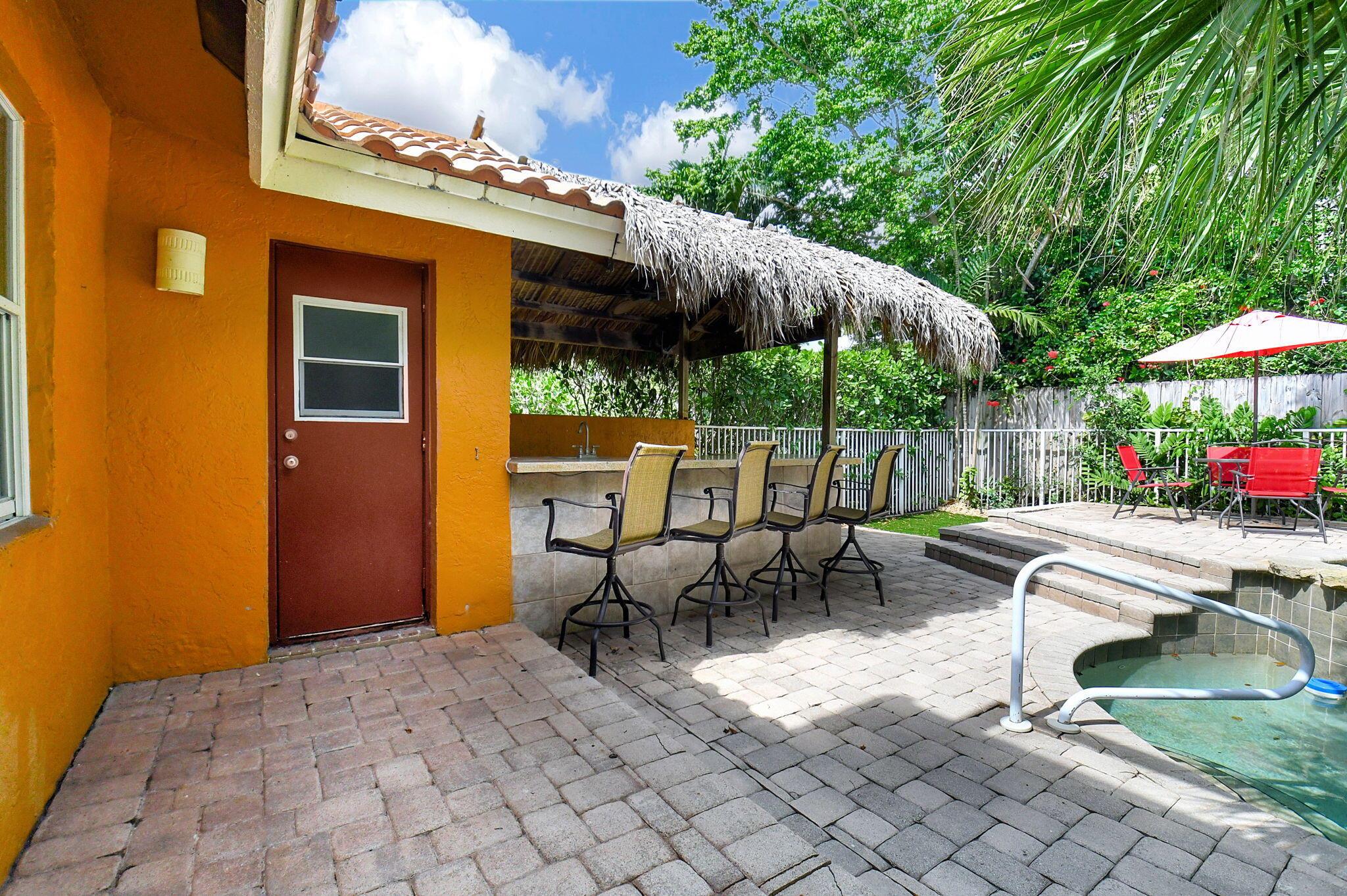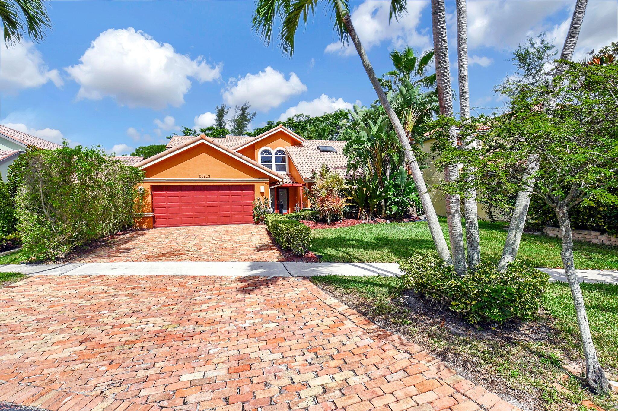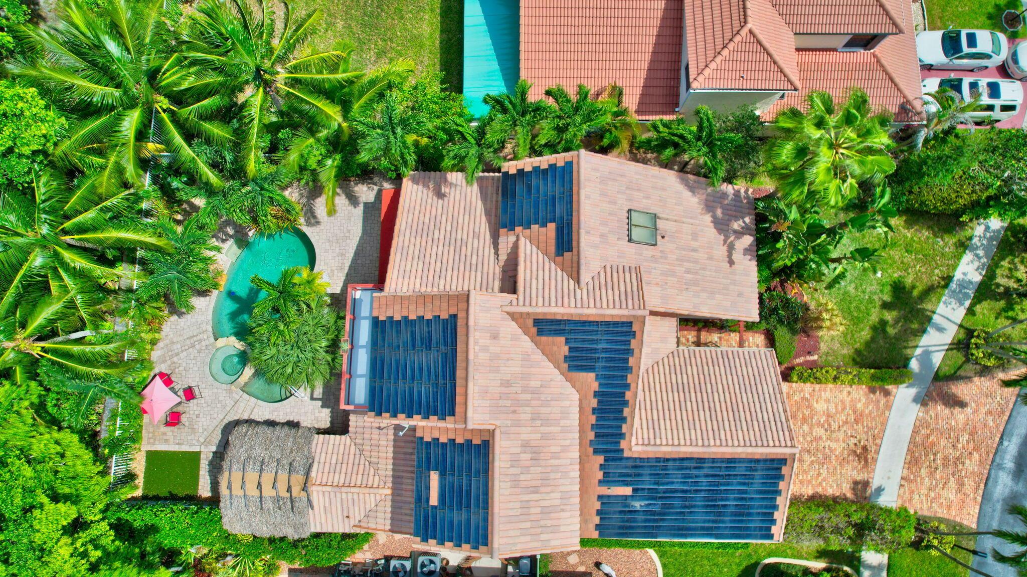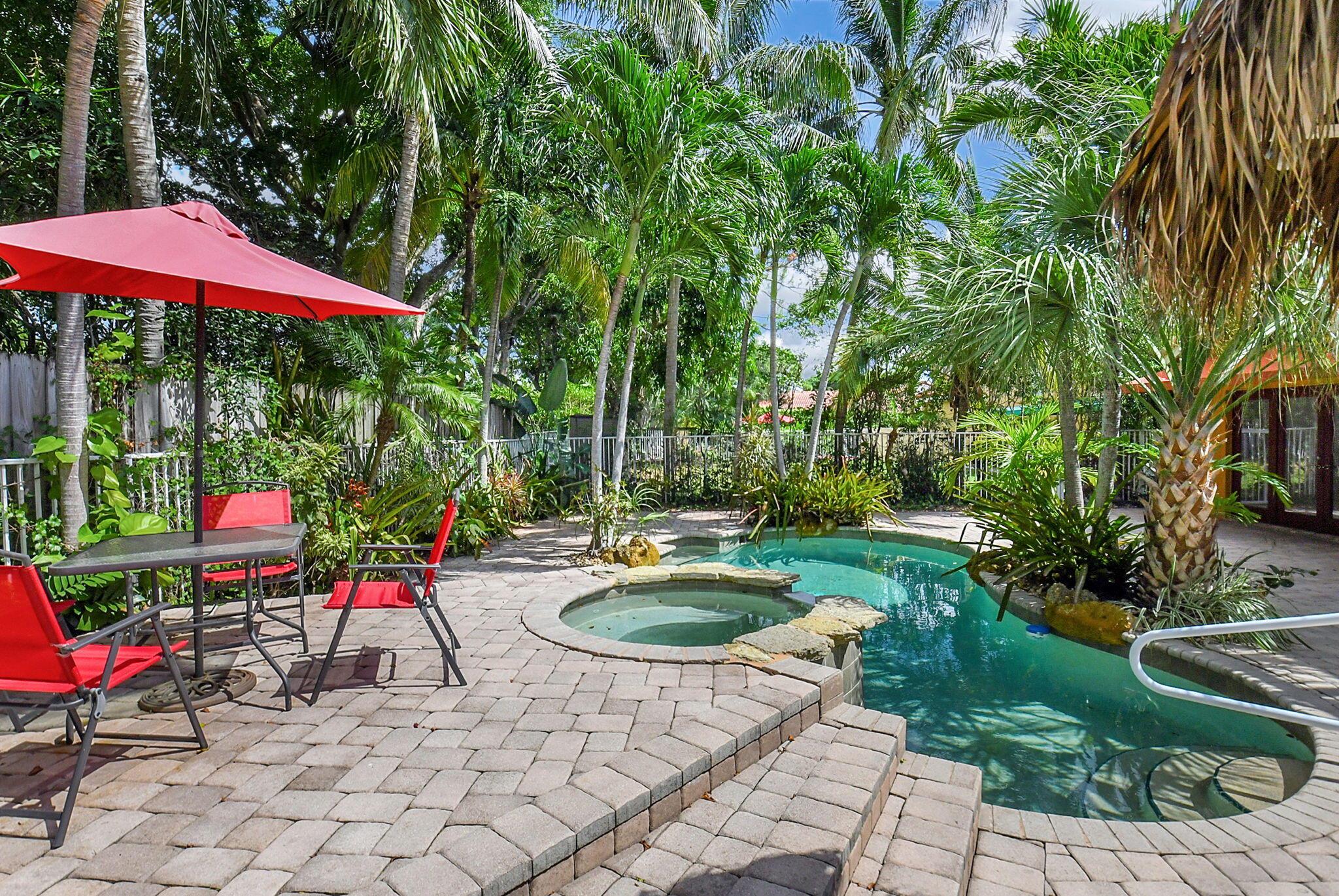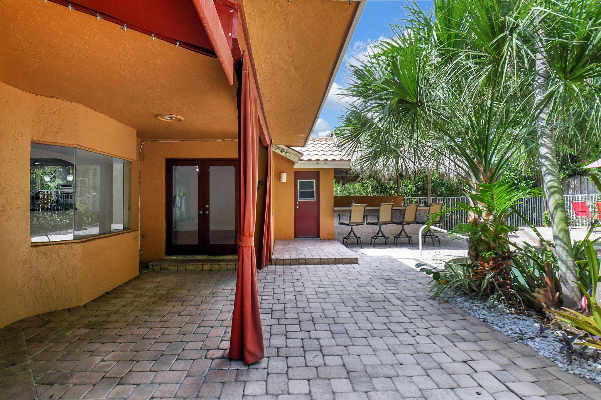 Fantastic home in a prime location! Features include Chicago brick driveway, tropical landscape, S Tile roof (2015), 2 A/C units (2016/17) Certainteed Residential Solar Tiles, large front yard, vaulted ceilings, tile and bamboo floors, fresh paint, stone fireplace with electric insert, kitchen cabinets were professionally painted, GE monogram refrigerator, Jenn Air double ovens, built in wine fridge, decorative glass cabinets, open floorplan with a ton of space, great for entertaining, Good size primary bedroom with large bathroom, walk in closet, and a balcony. The back yard is a tropical paradise with a kidney shaped pool with tropical landscape, pavers, tiki bar, pool and spa are heated. All of this within walking distance to shops, restaurants, and place of worship.
