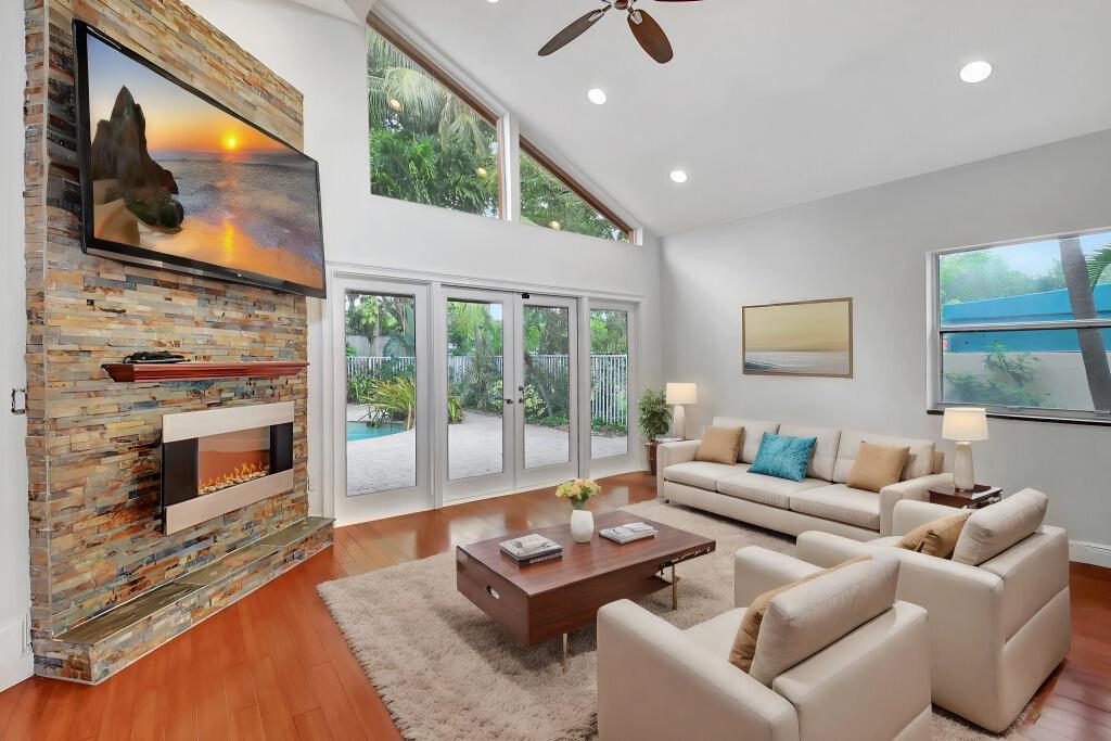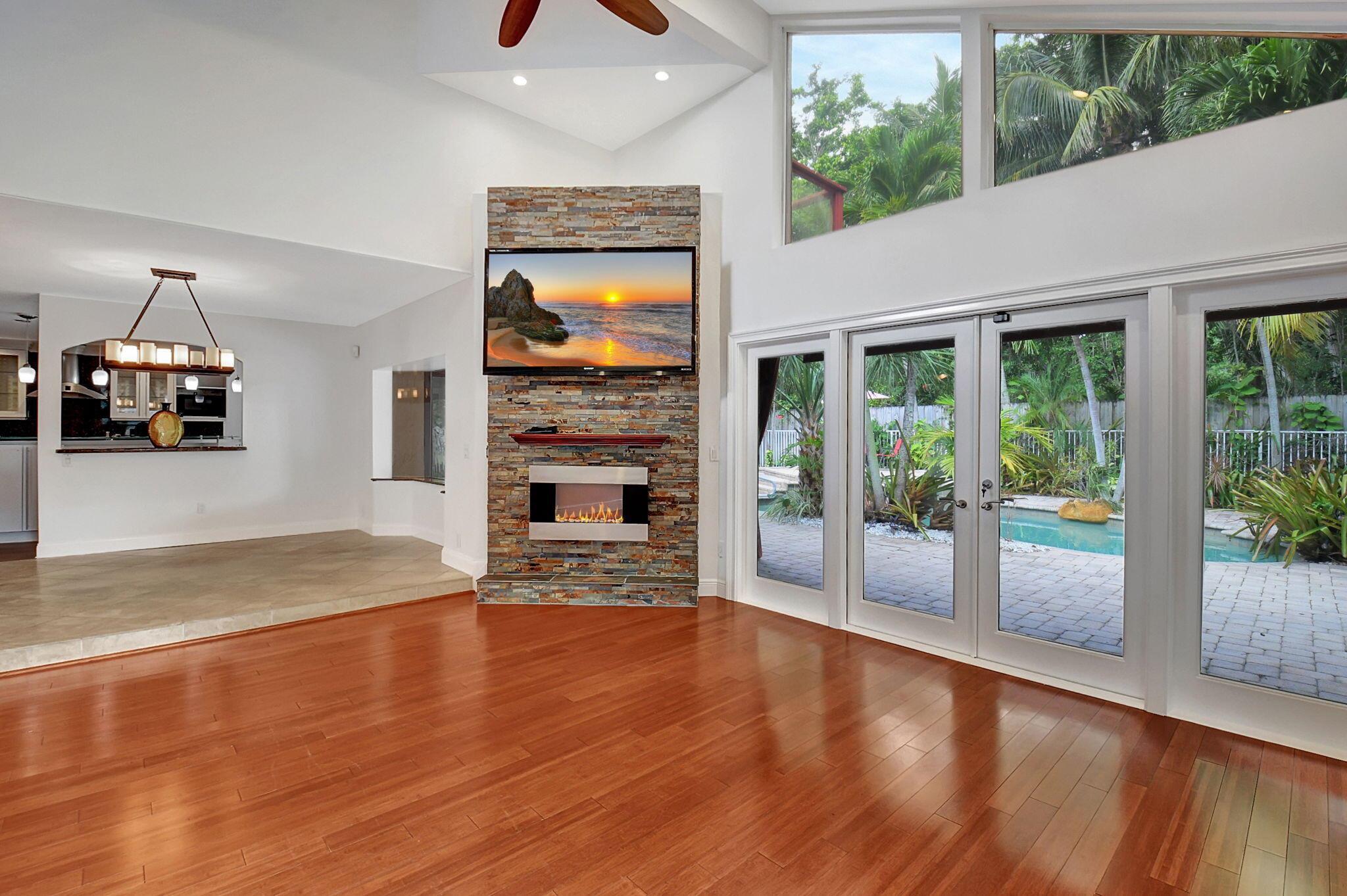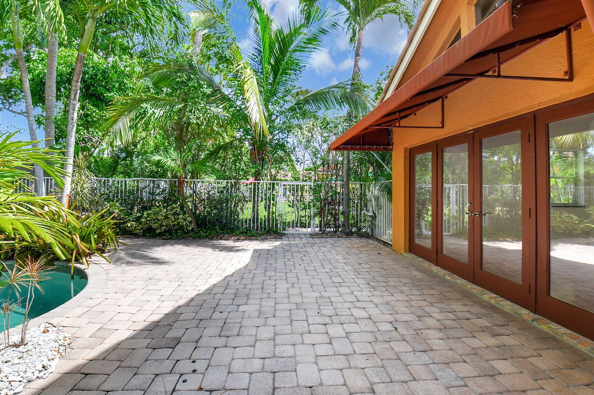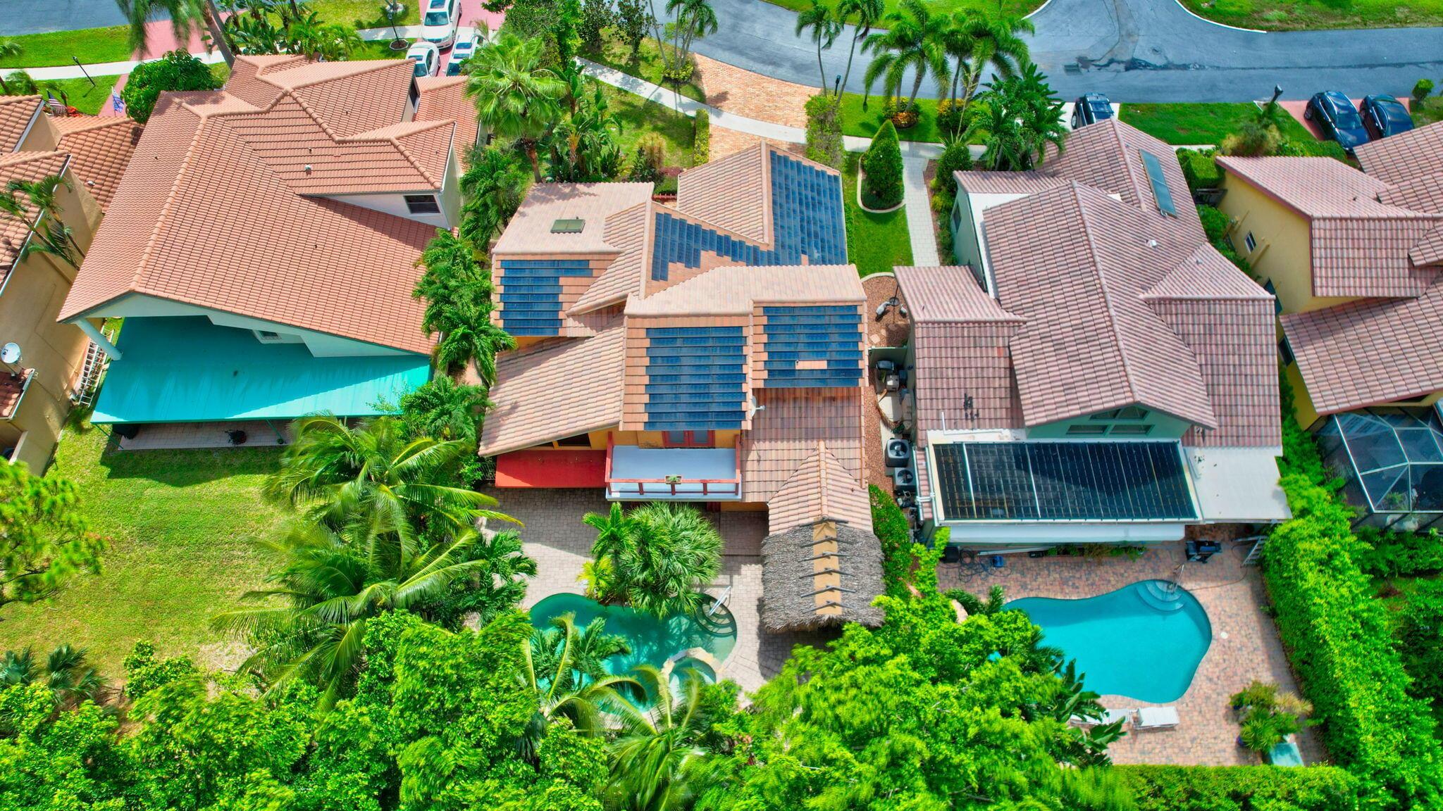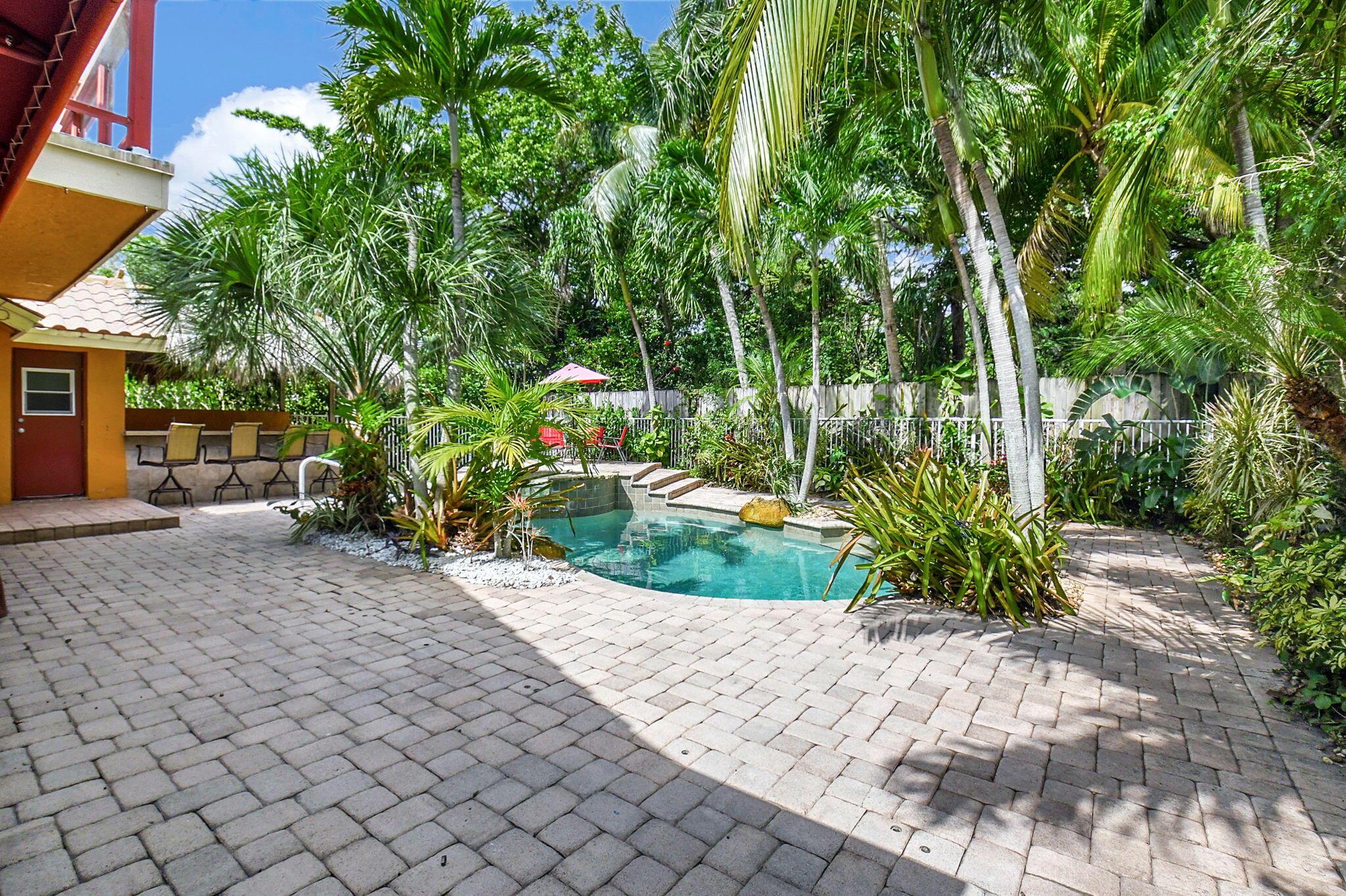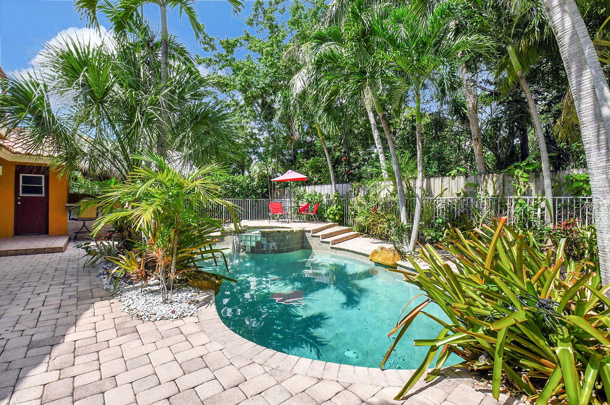 Fantastic home in a prime location! Features include Chicago brick driveway, tropical landscape, S Tile roof (2015), 2 A/C units (2016/17) Certainteed Residential Solar Tiles, large front yard, vaulted ceilings, tile and bamboo floors, fresh paint, stone fireplace with electric insert, kitchen cabinets were professionally painted, GE monogram refrigerator, Jenn Air double ovens, built in wine fridge, decorative glass cabinets, open floorplan with a ton of space, great for entertaining, Good size primary bedroom with large bathroom, walk in closet, and a balcony. The back yard is a tropical paradise with a kidney shaped pool with tropical landscape, pavers, tiki bar, pool and spa are heated. All of this within walking distance to shops, restaurants, and place of worship.